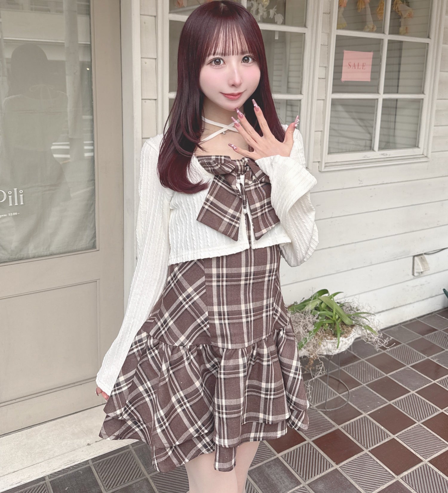チェック×ボレロ風トップス