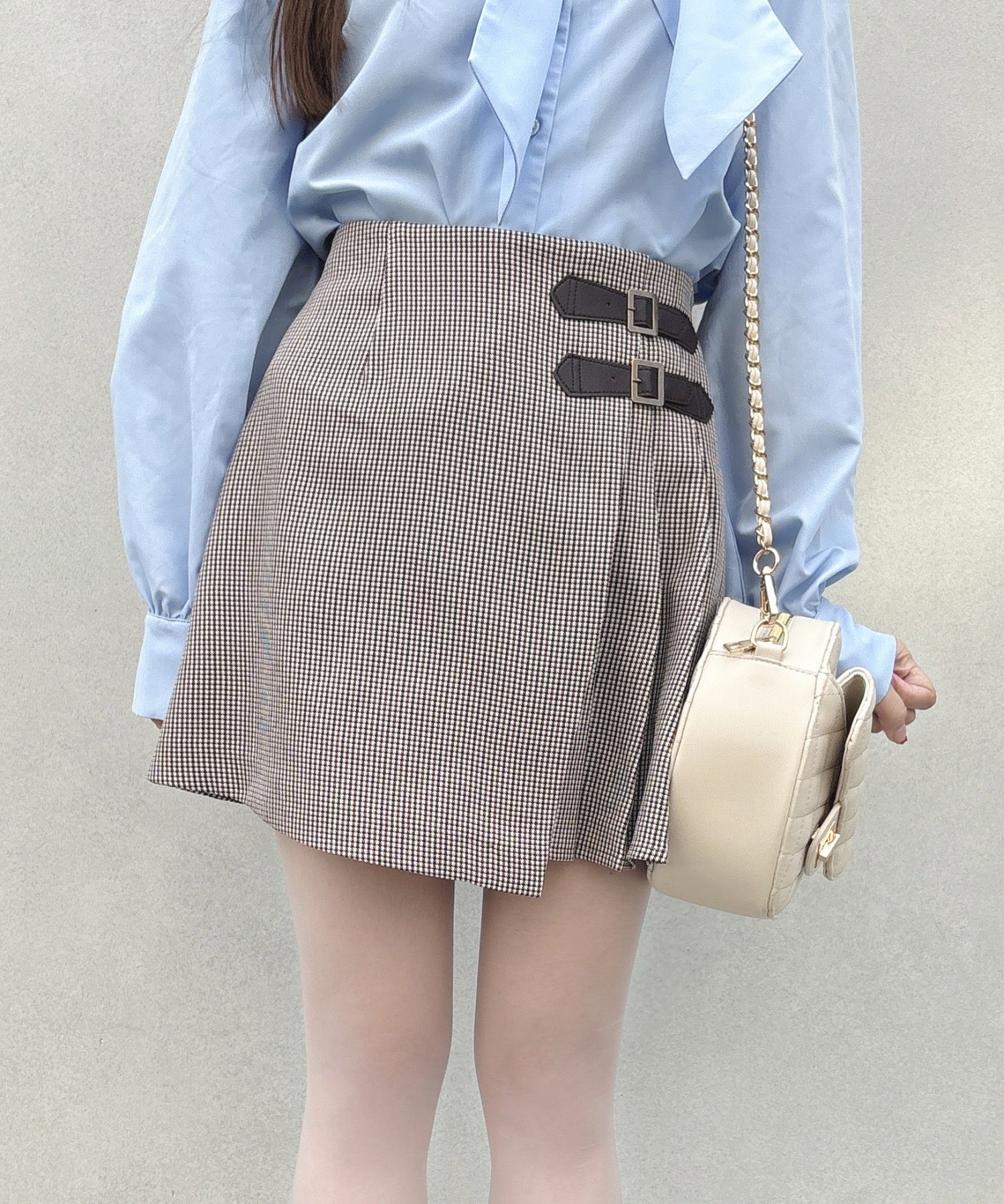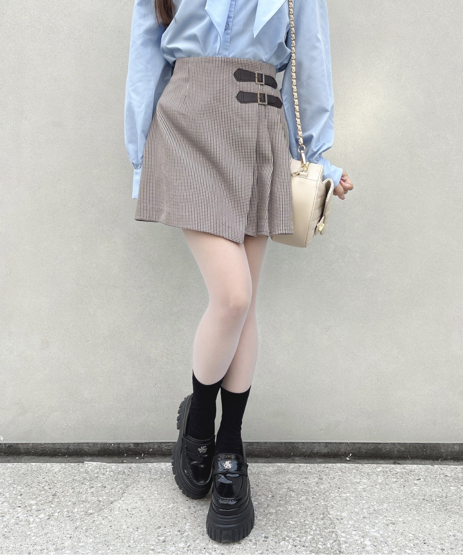 ・トップスにボウタイブラウスをインして着ると綺麗めな韓国ガーリースタイルに◎