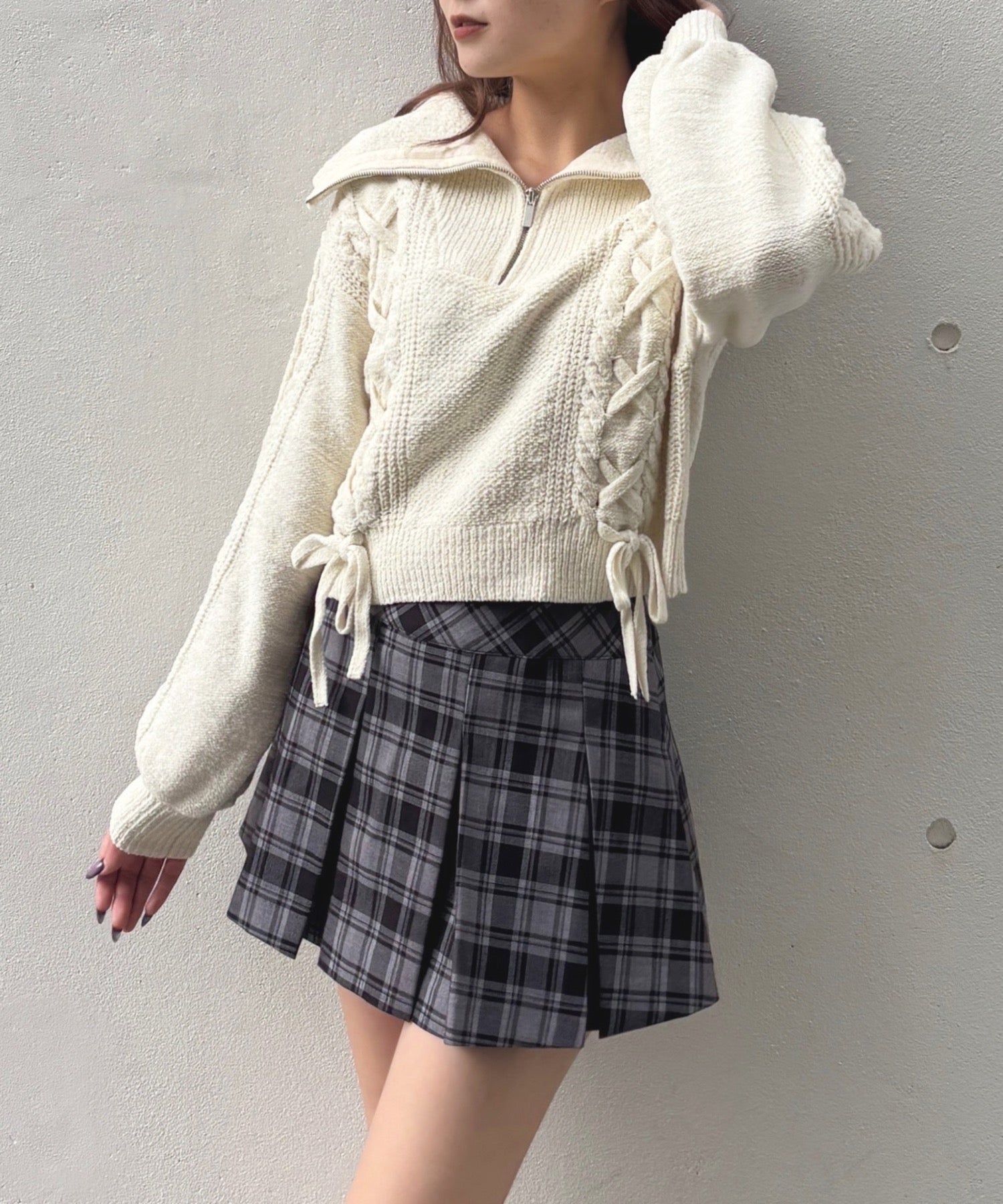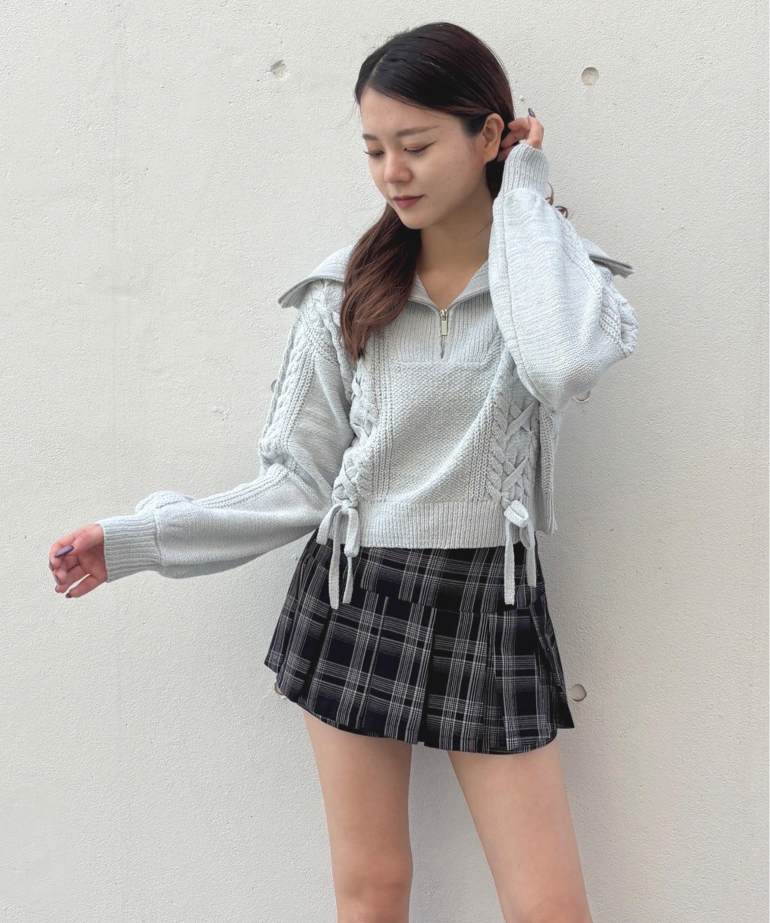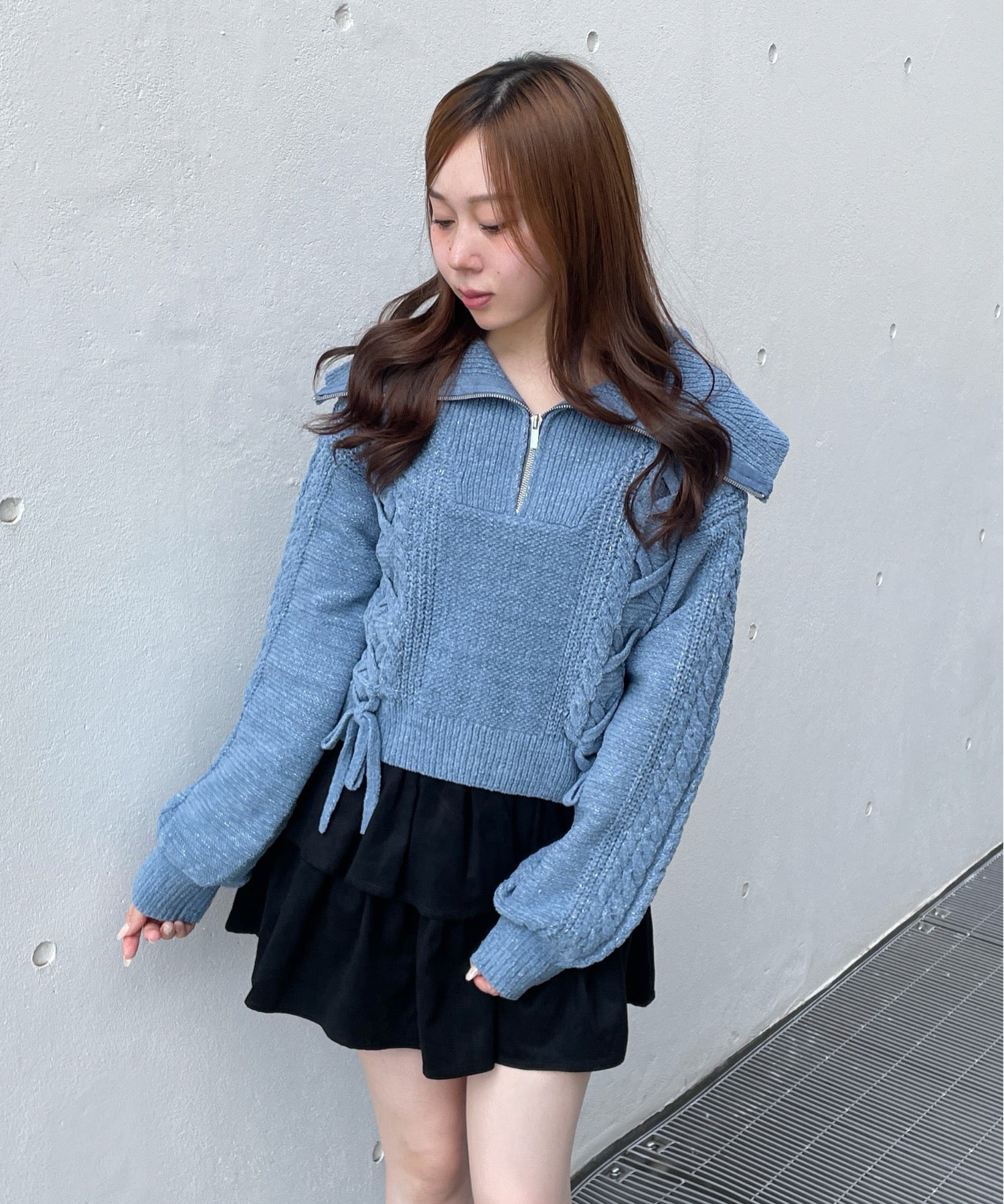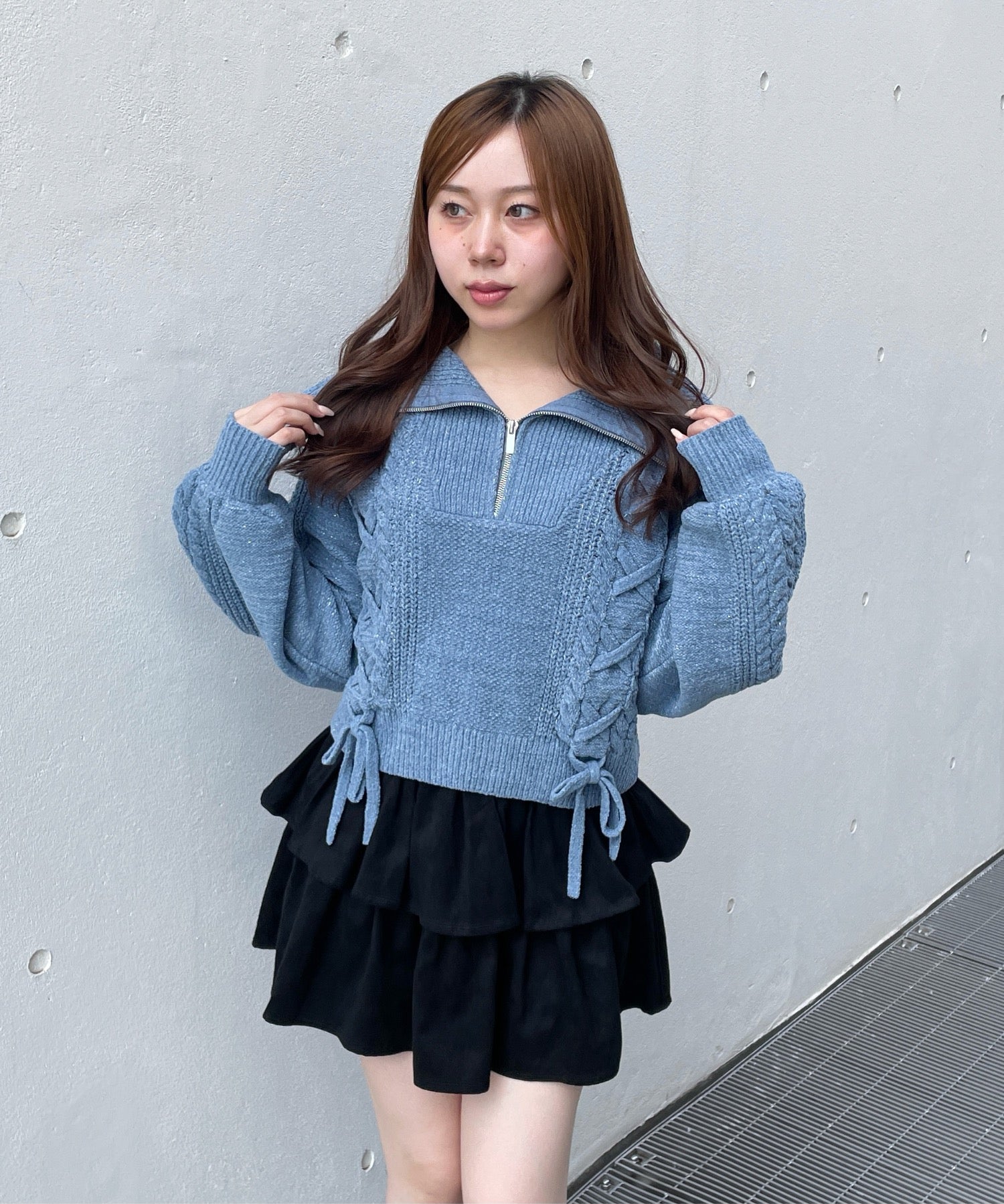 ・ガーリーなレーシングと、カジュアルな印象のハーフジップが合わさったデザインで、何にでも合わせやすい万能ニットに!