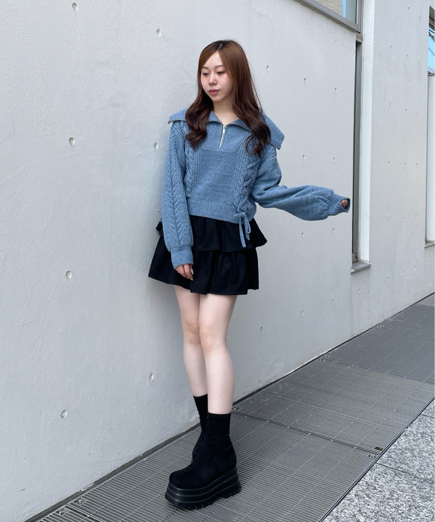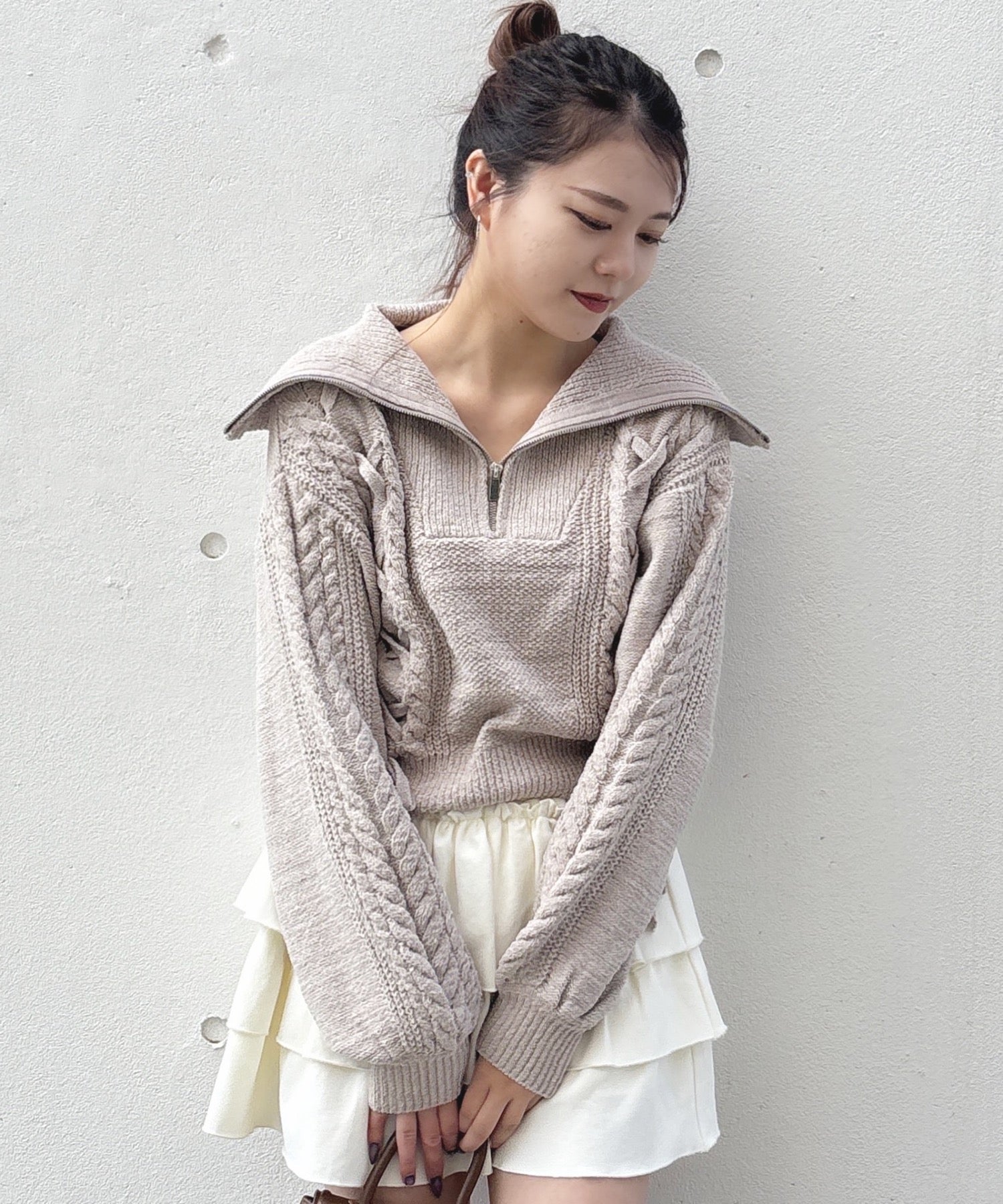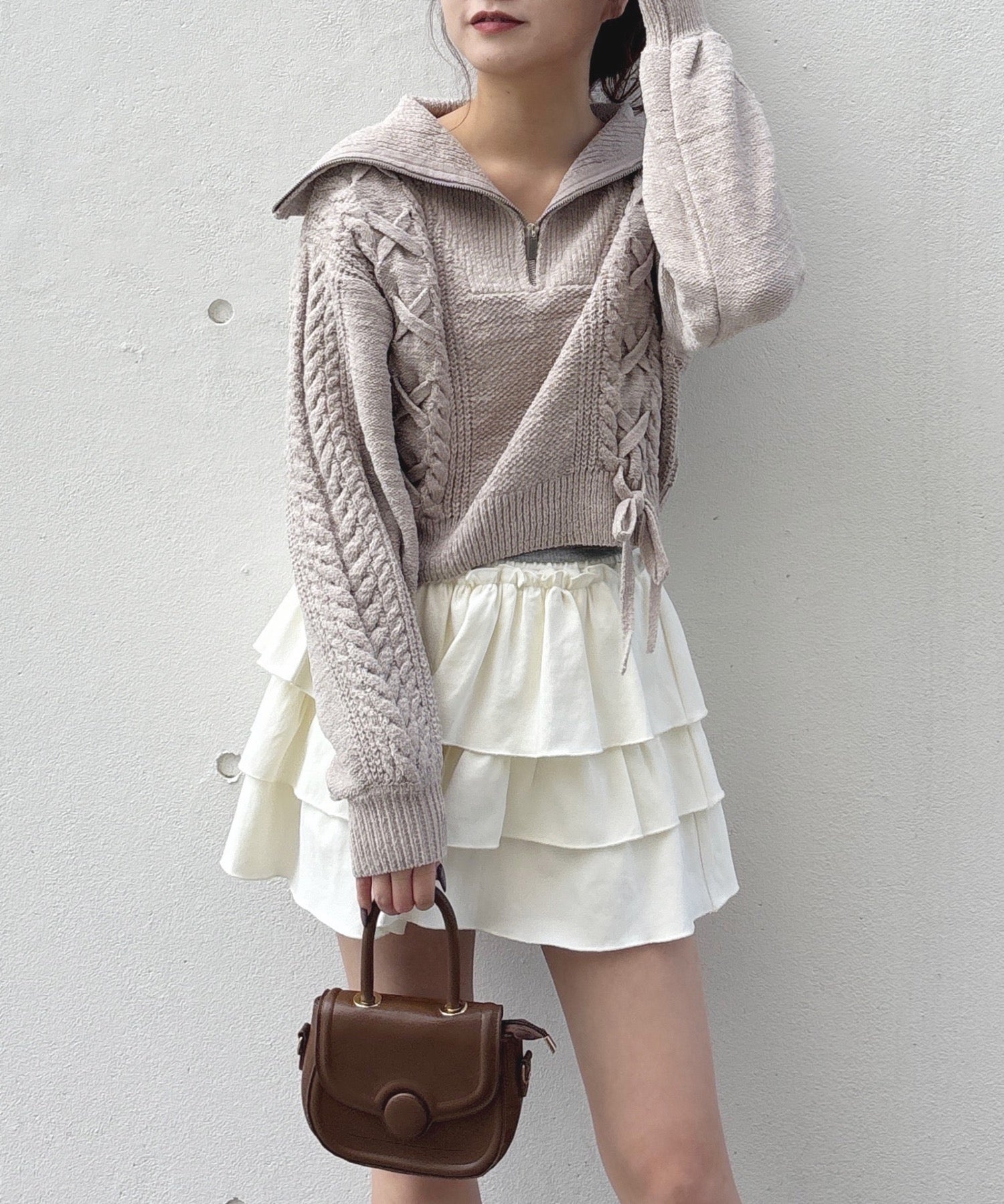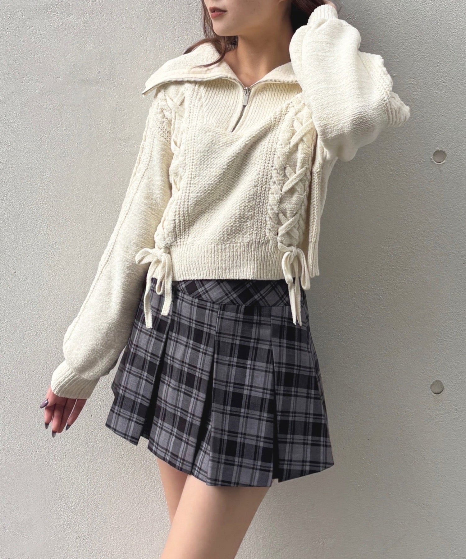 ・ガーリーなレーシングと、カジュアルな印象のハーフジップが合わさったデザインで、何にでも合わせやすい万能ニットに!