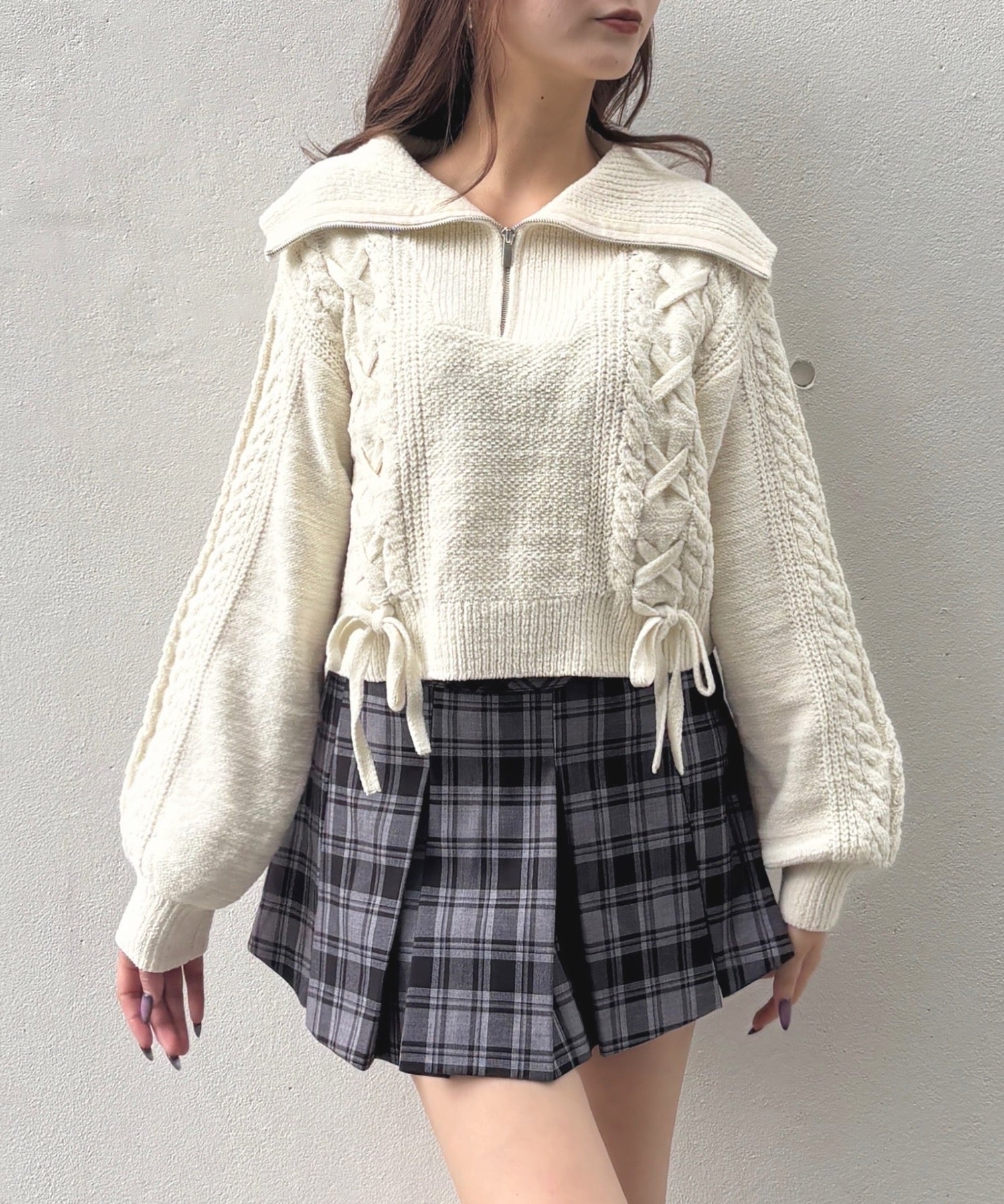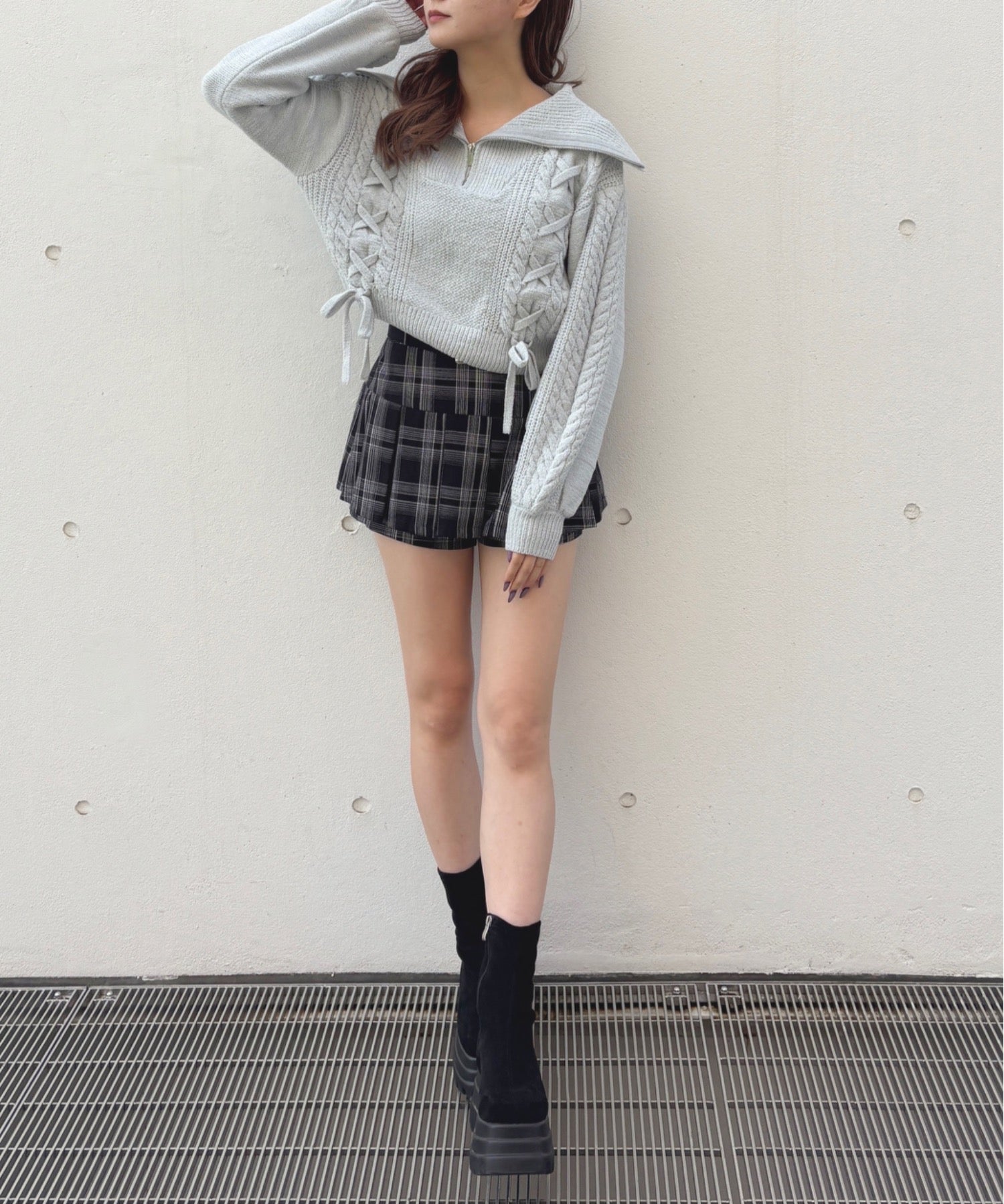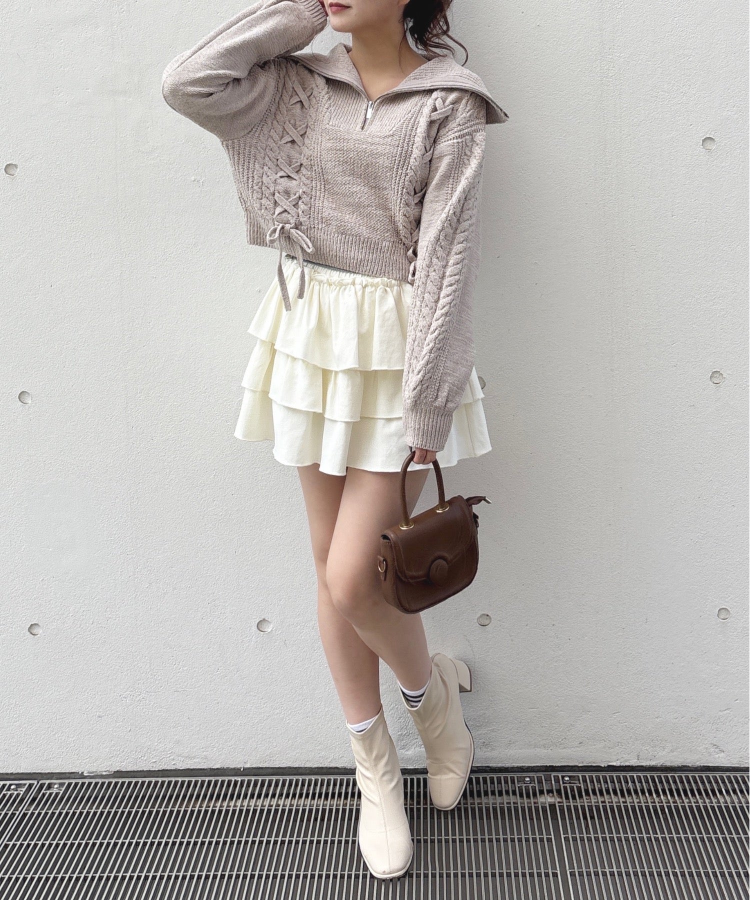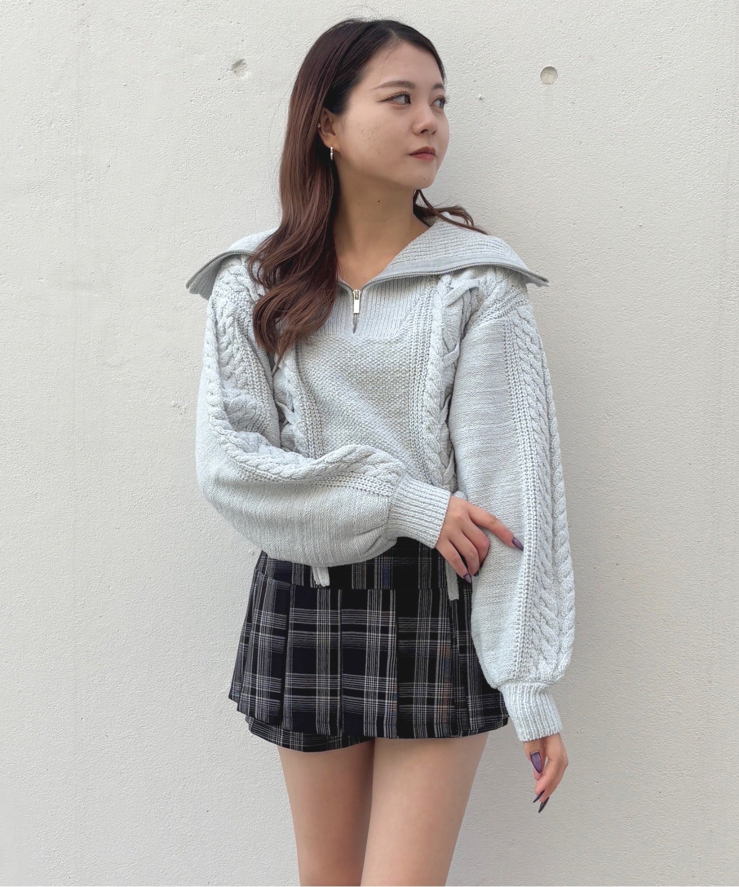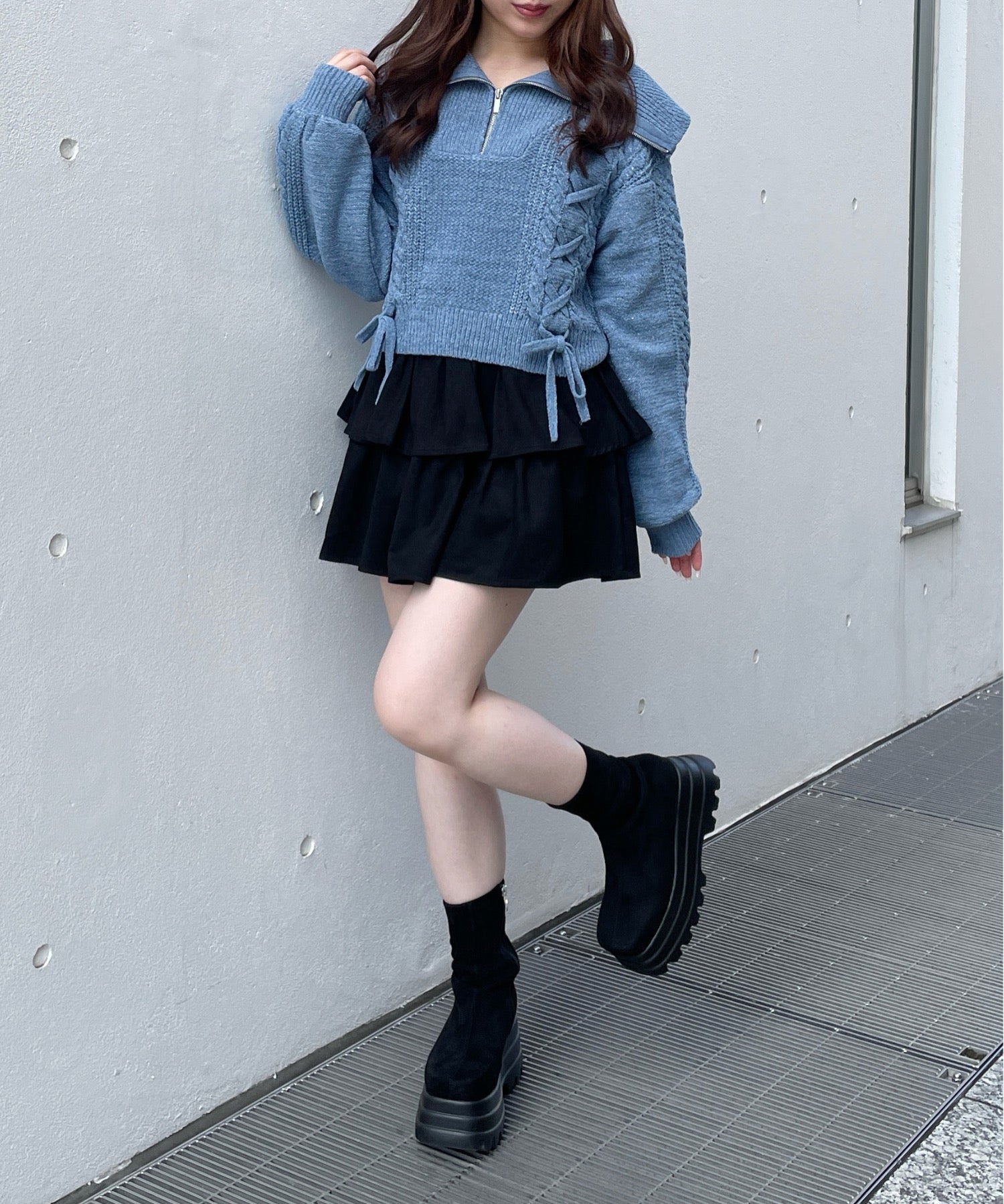 ・ガーリーなレーシングと、カジュアルな印象のハーフジップが合わさったデザインで、何にでも合わせやすい万能ニットに!