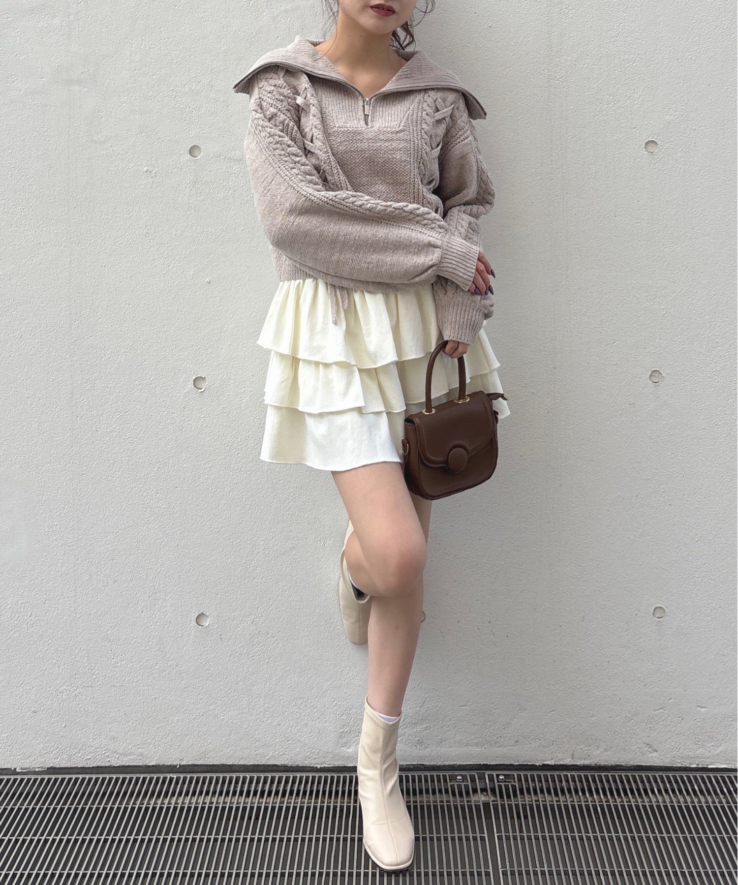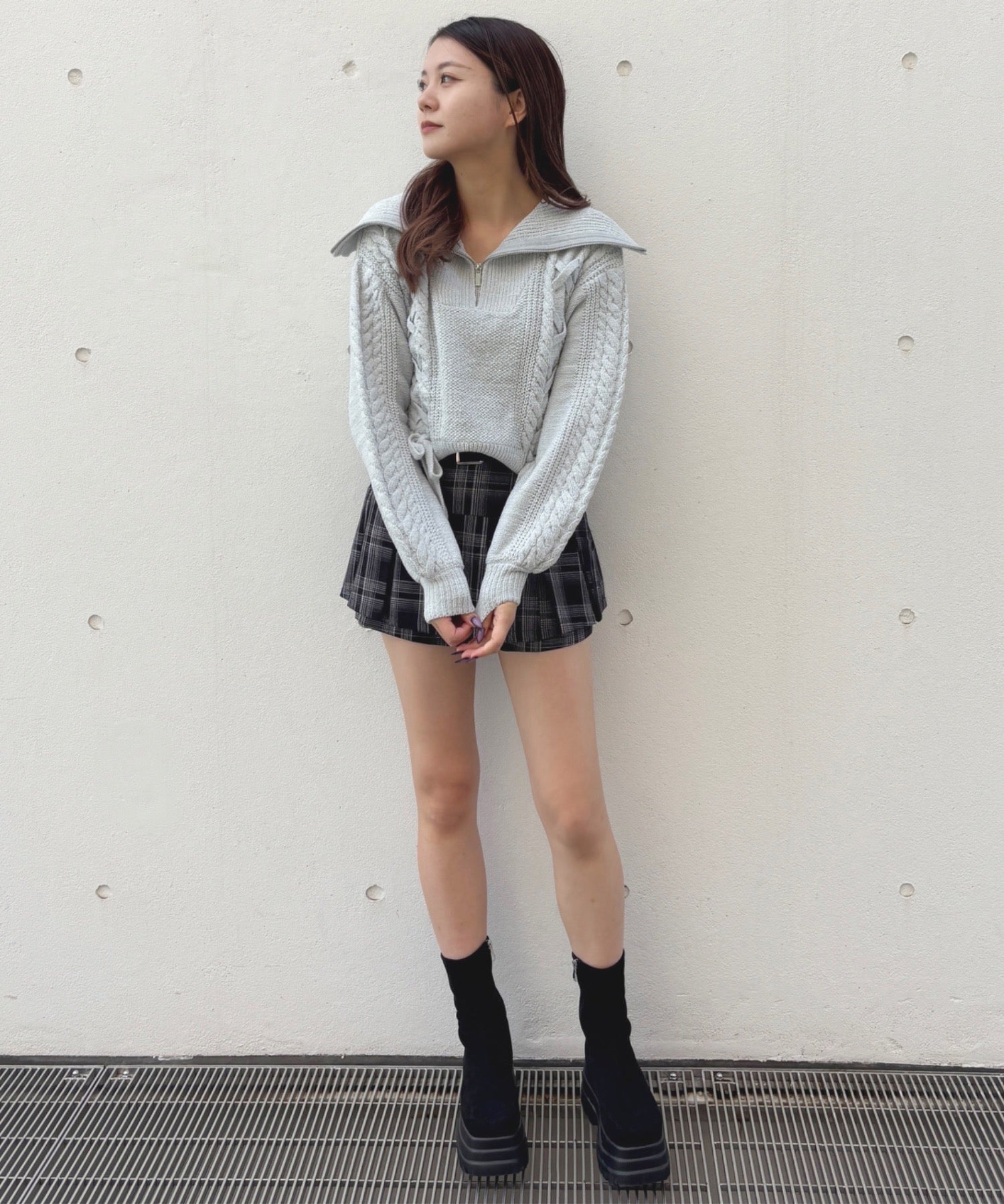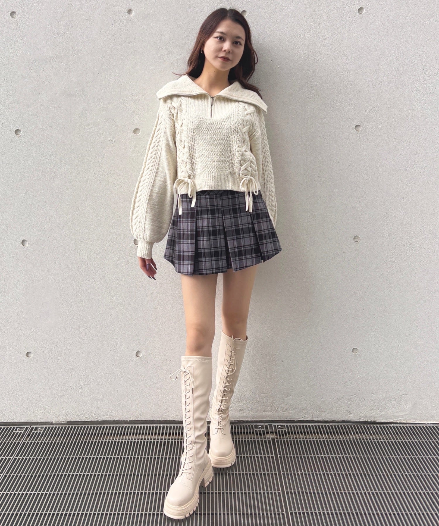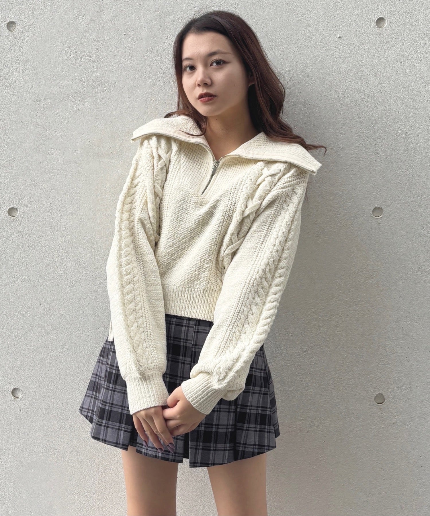 ・ガーリーなレーシングと、カジュアルな印象のハーフジップが合わさったデザインで、何にでも合わせやすい万能ニットに!