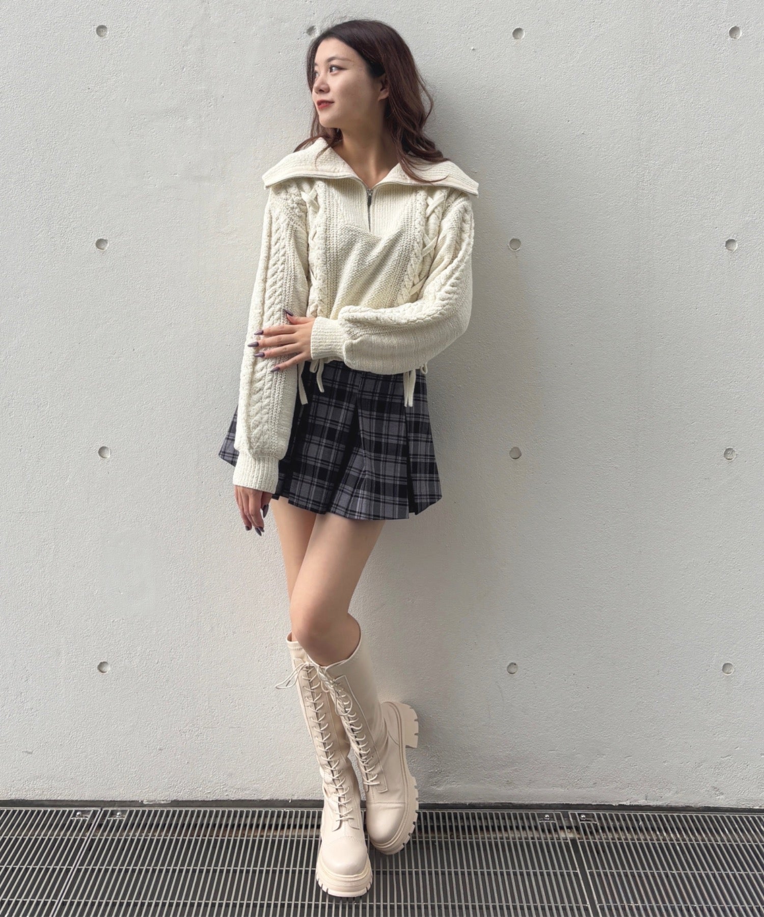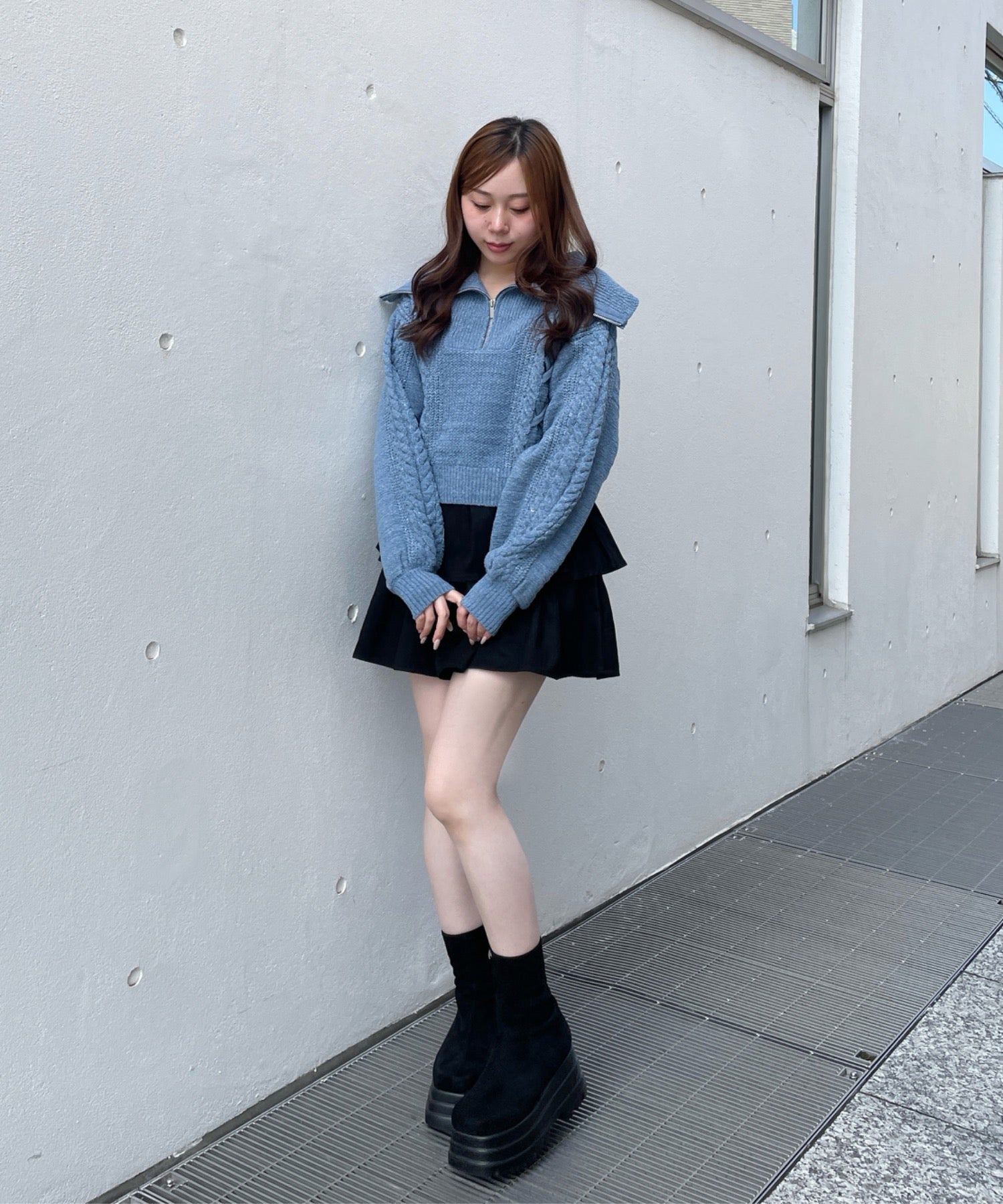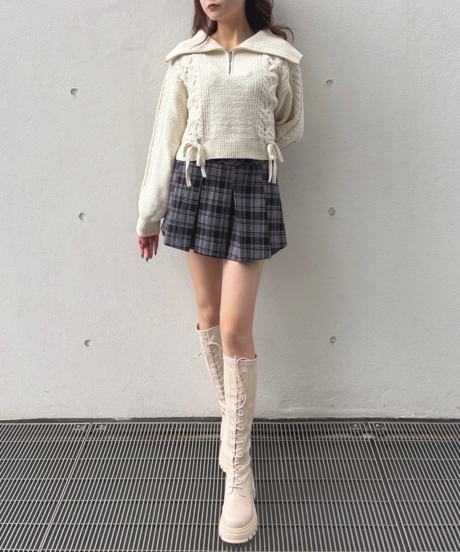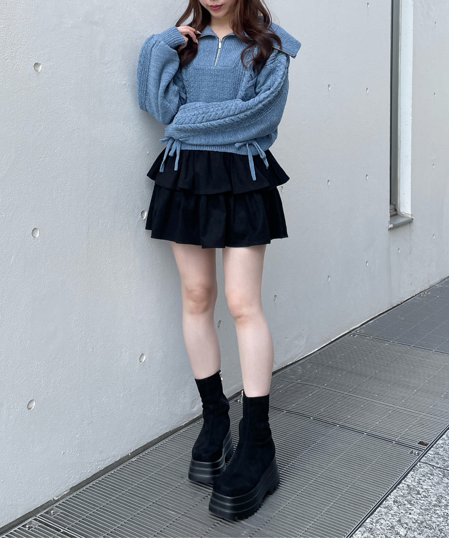 ・ガーリーなレーシングと、カジュアルな印象のハーフジップが合わさったデザインで、何にでも合わせやすい万能ニットに!