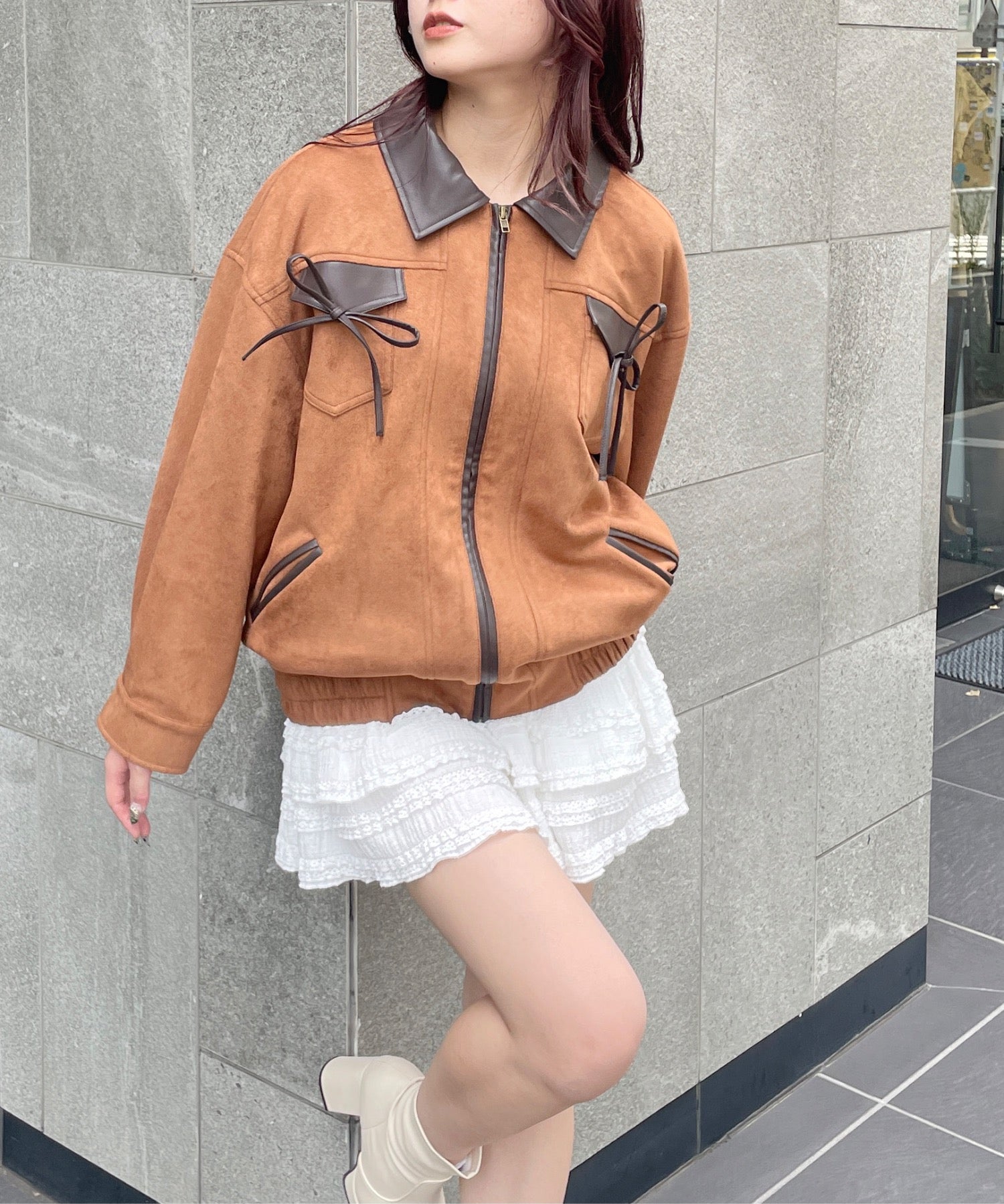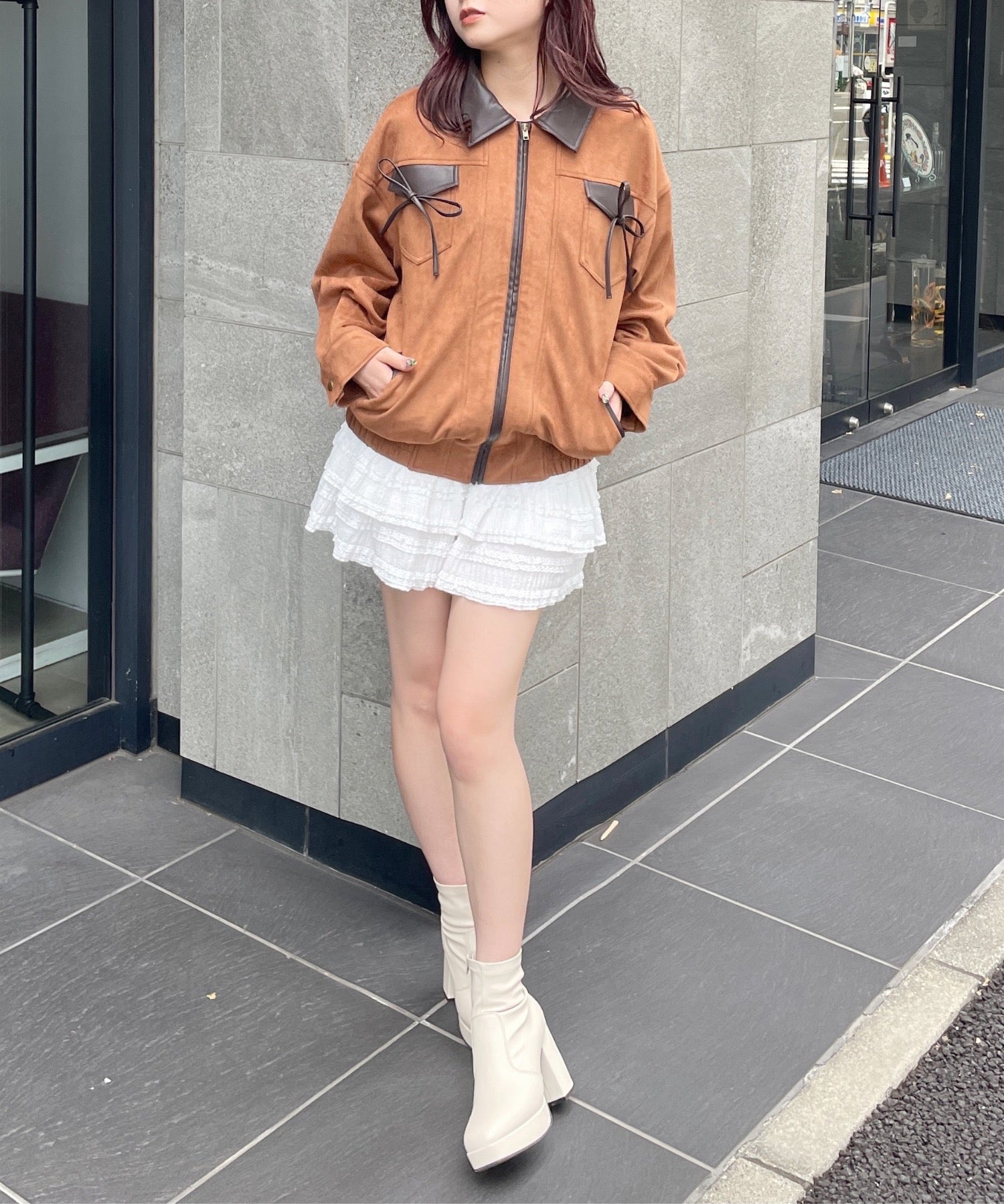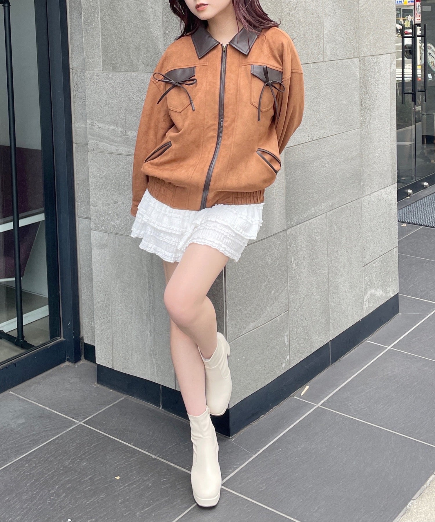 ・ジャケットと似た雰囲気のボトムスと合わせてセットアップ風に着るのもおすすめ♪