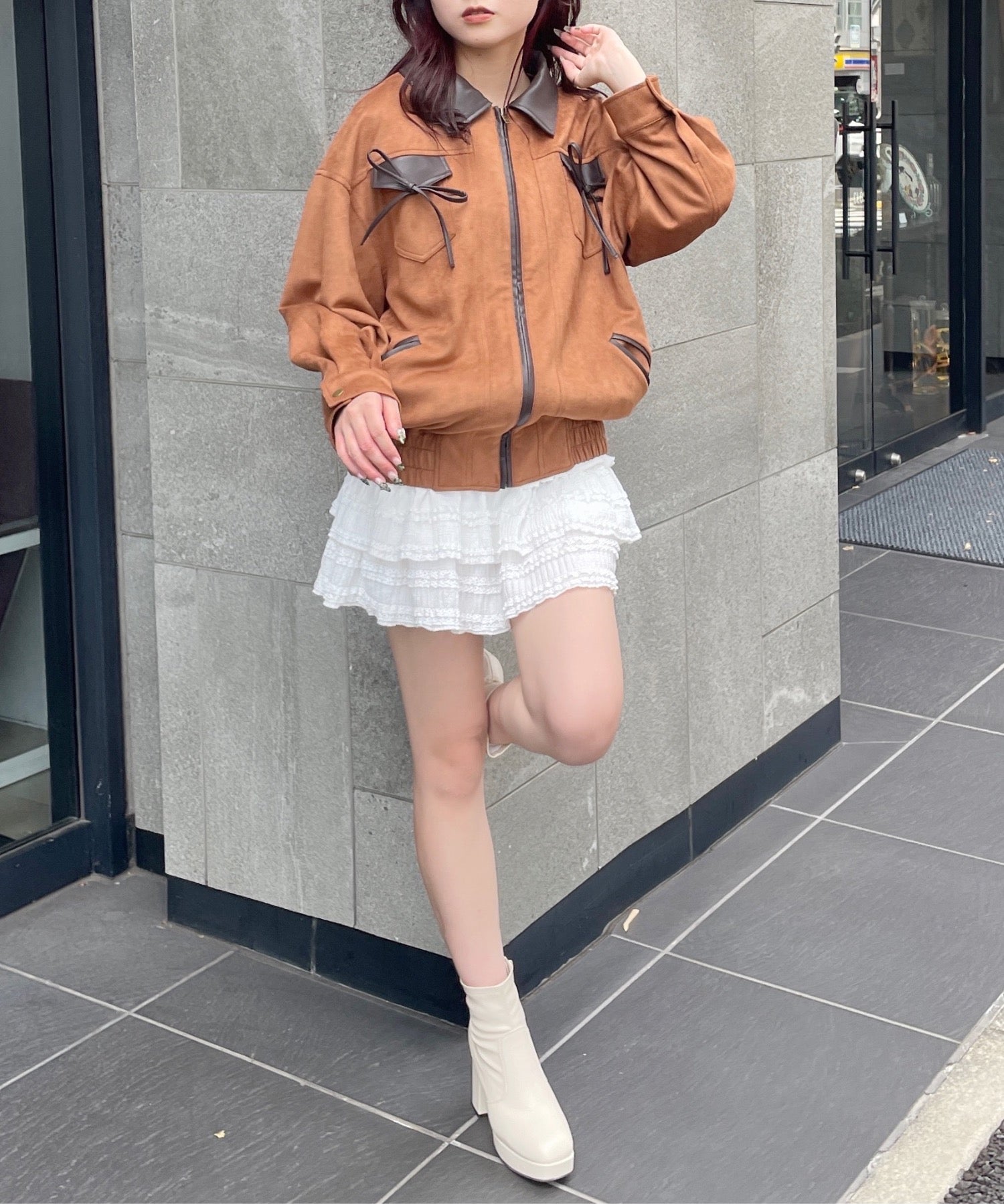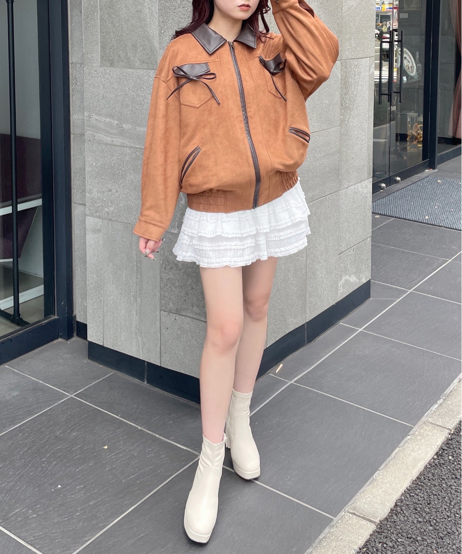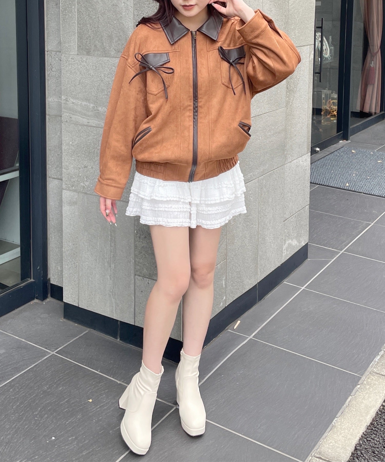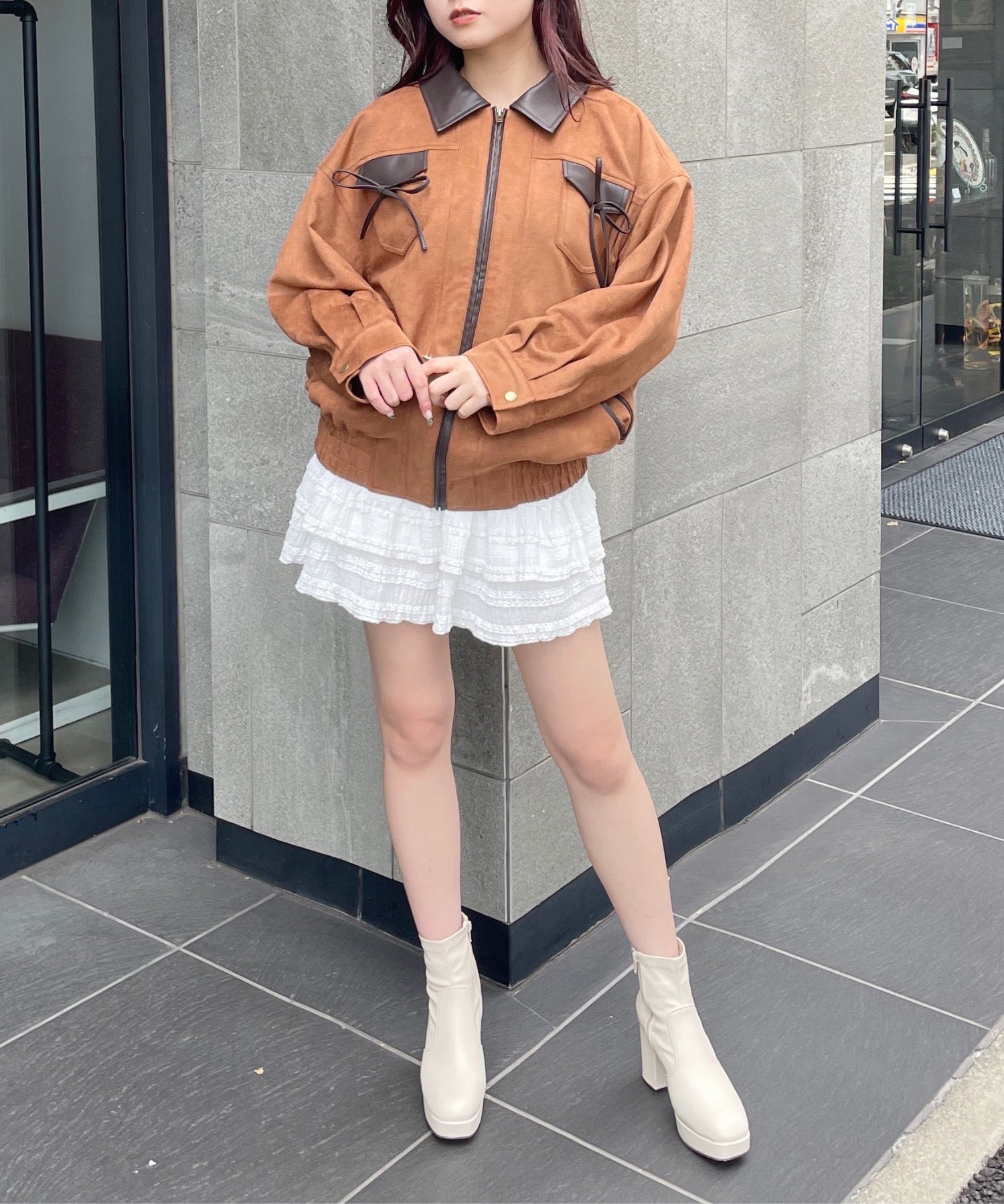 ・ジャケットと似た雰囲気のボトムスと合わせてセットアップ風に着るのもおすすめ♪