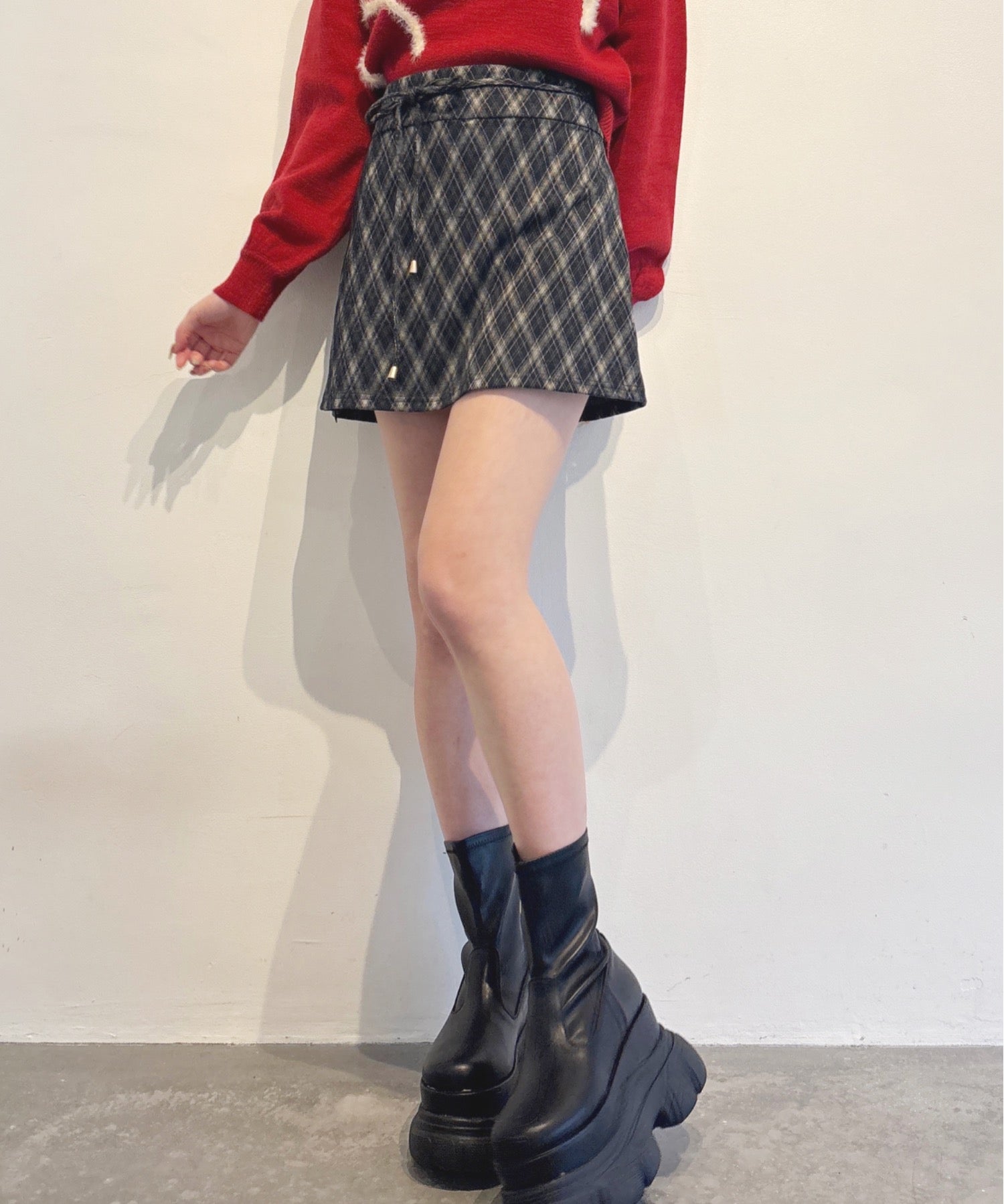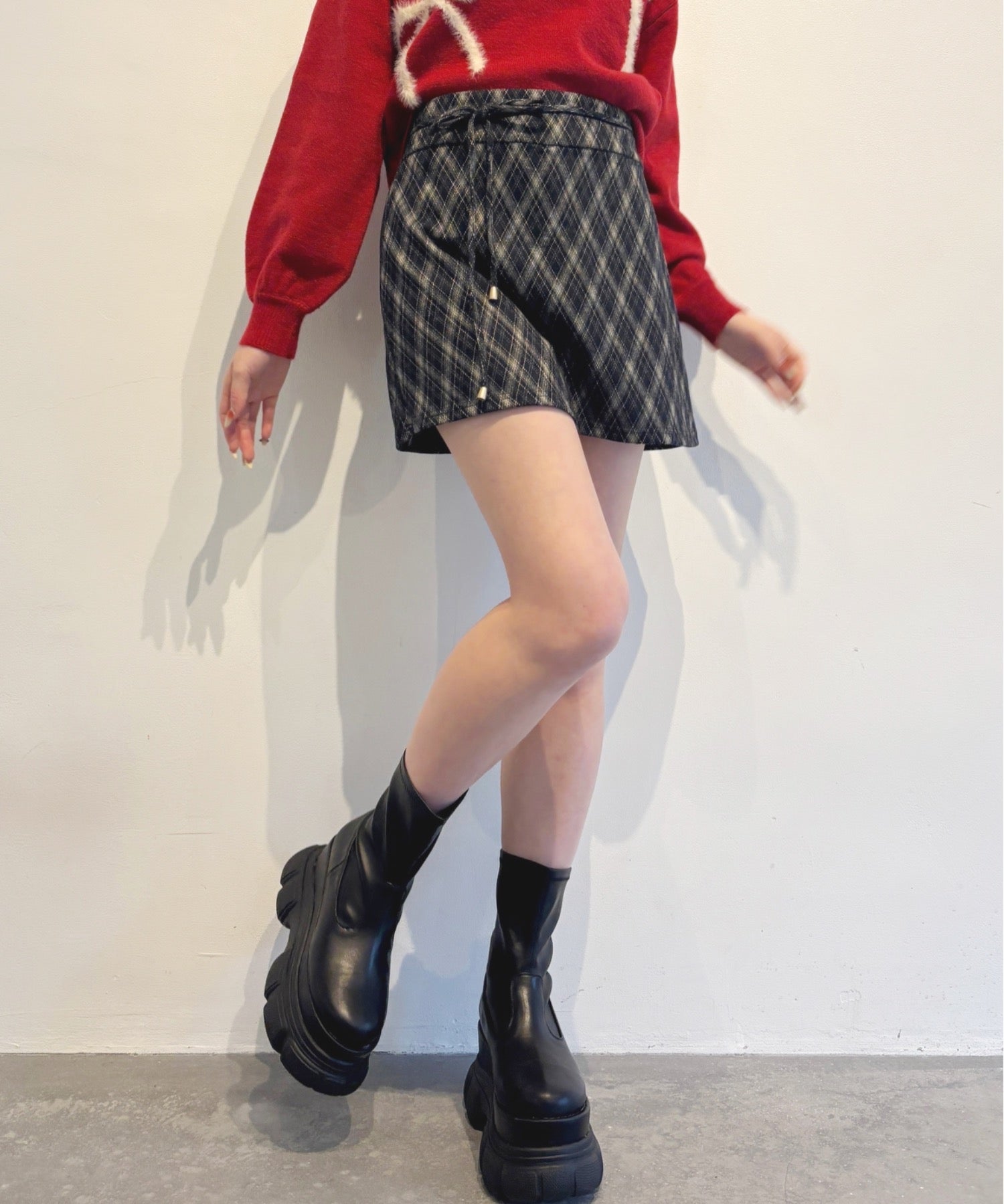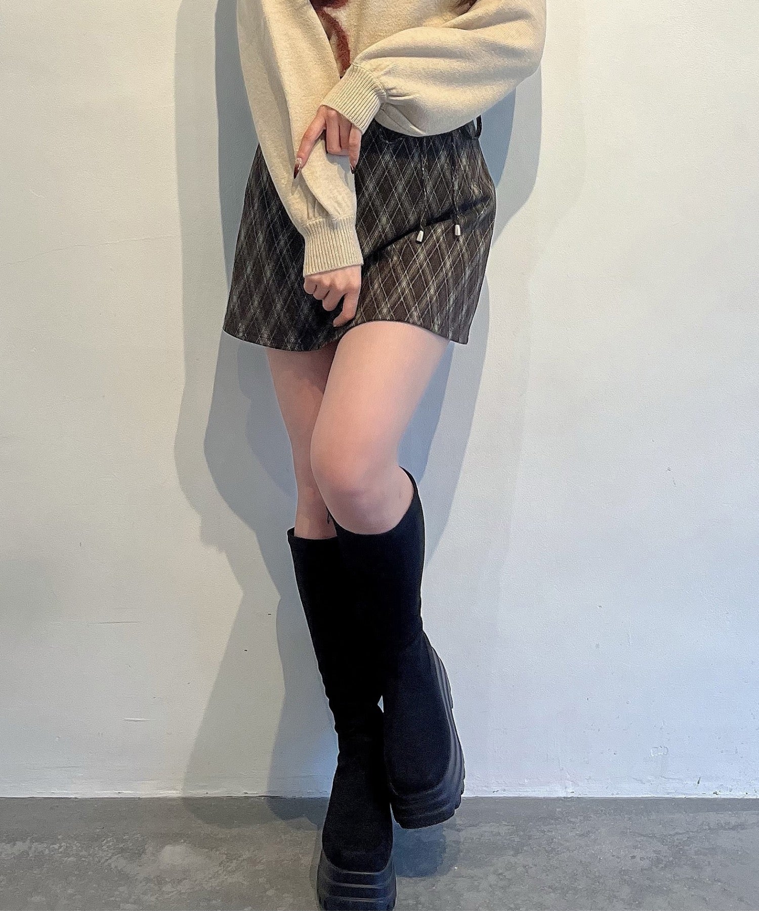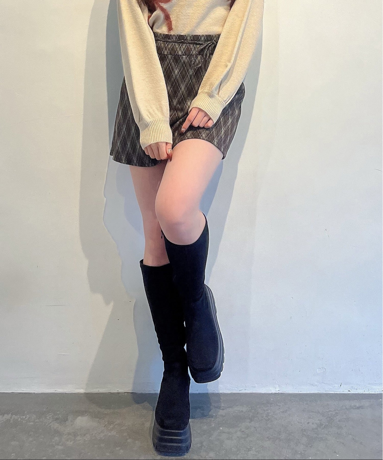 ・スカートのチェック柄が冬らしく、足元にタイツやブーツを合わせるのがおすすめ◎