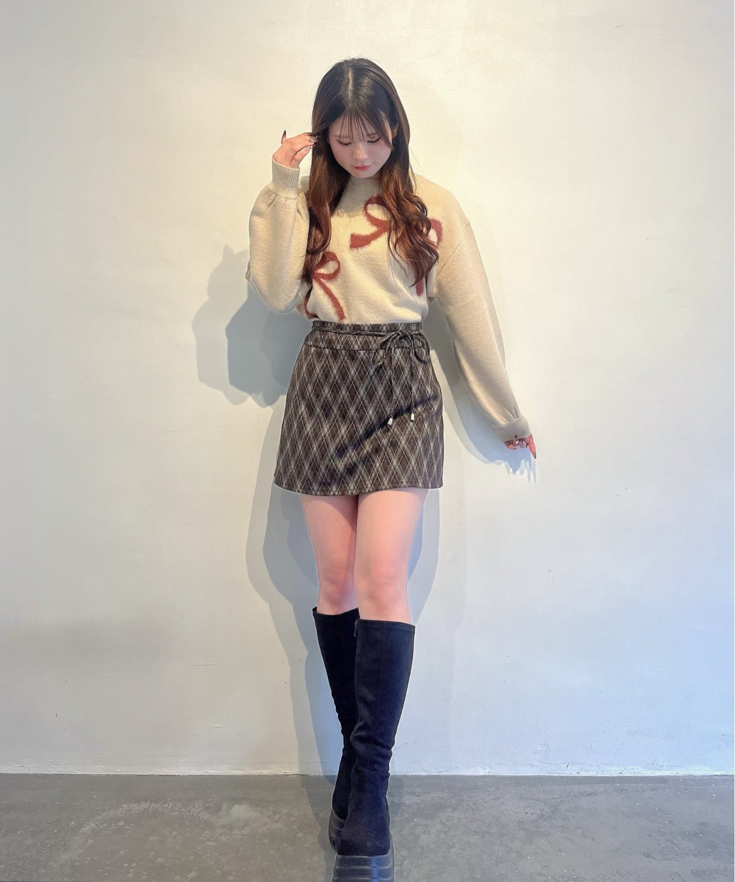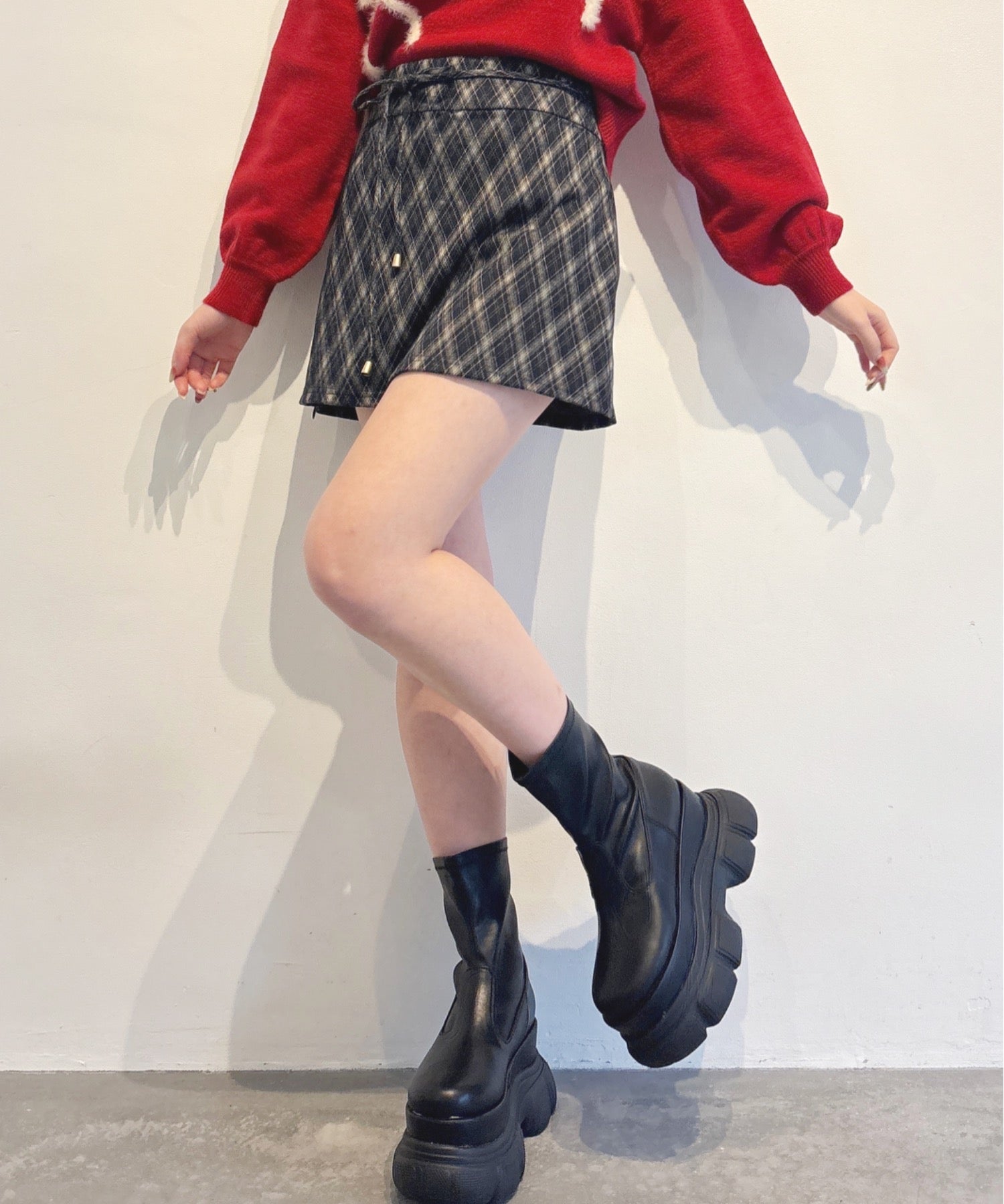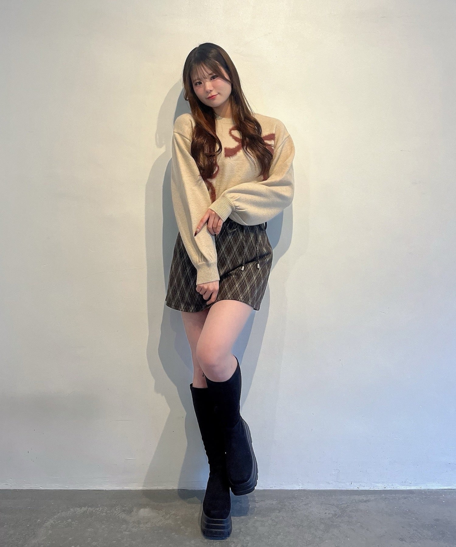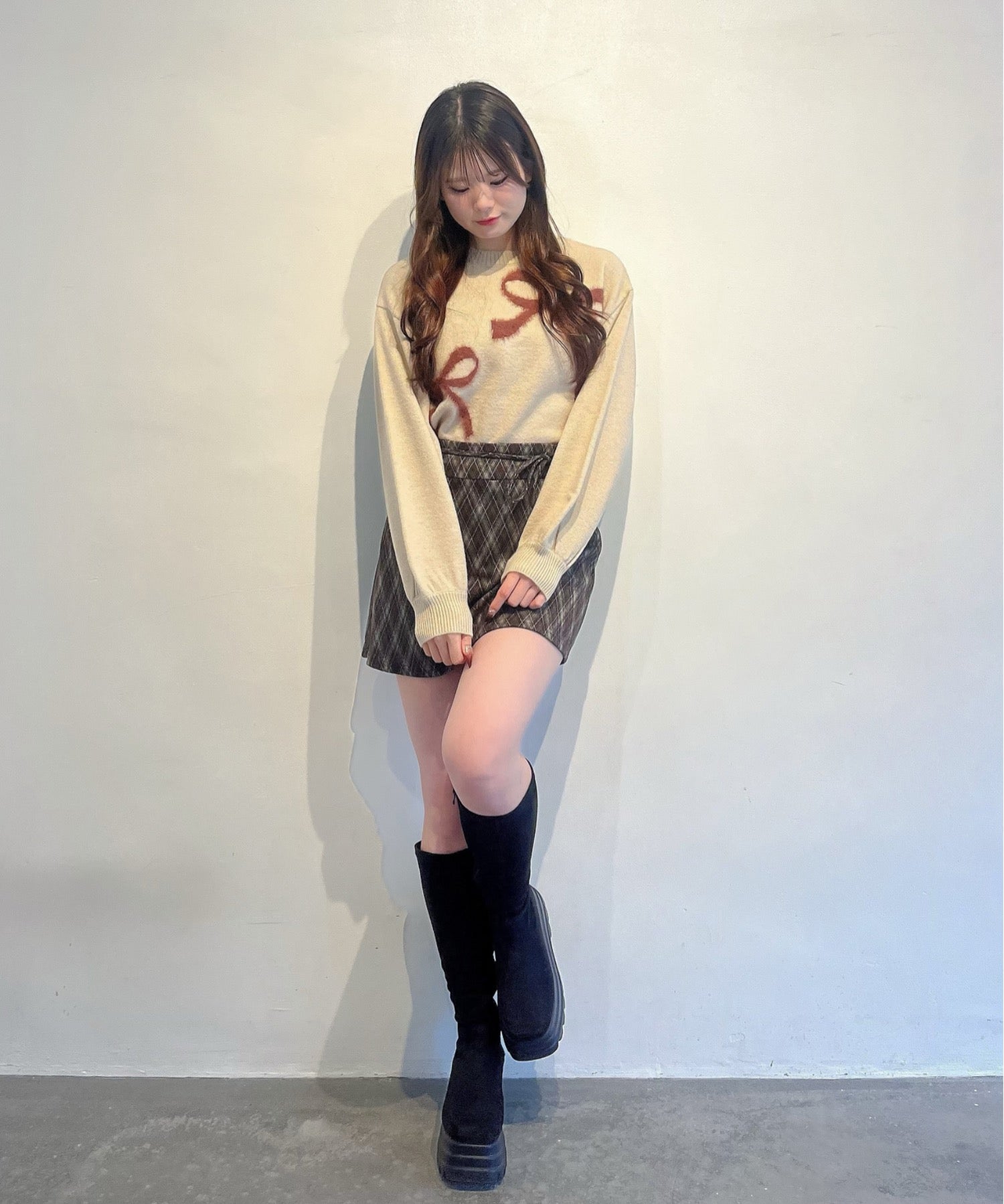 ・スカートのチェック柄が冬らしく、足元にタイツやブーツを合わせるのがおすすめ◎