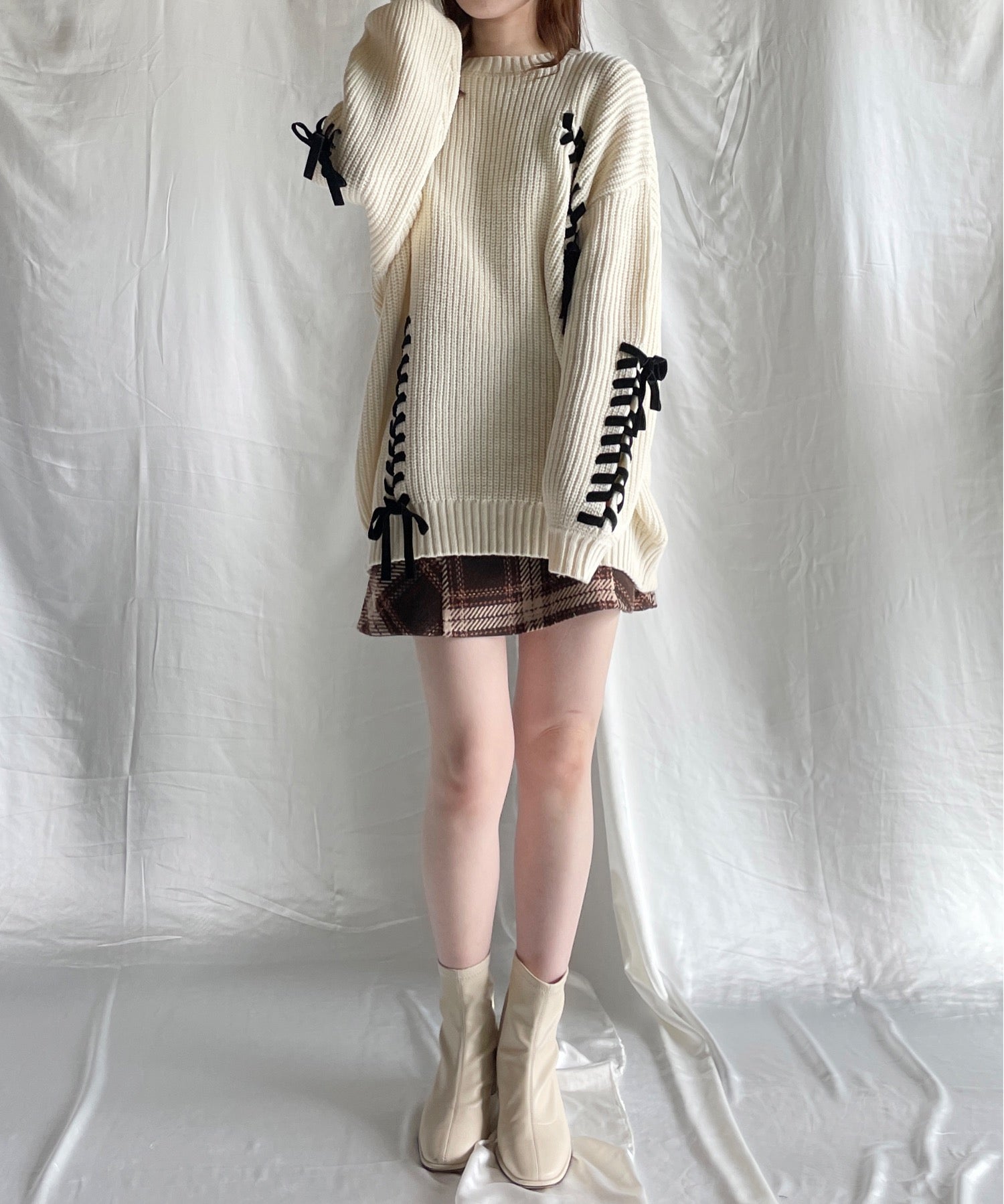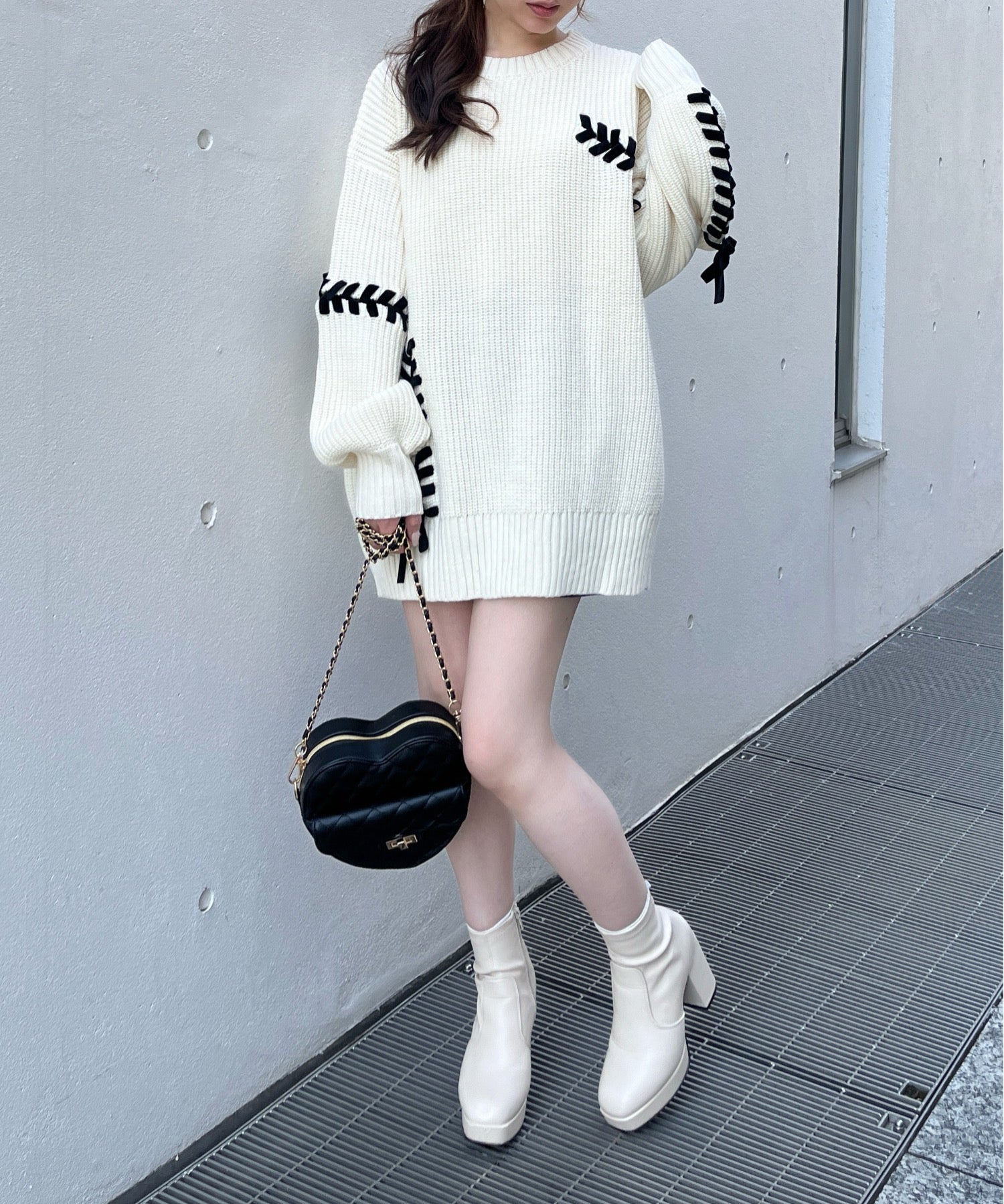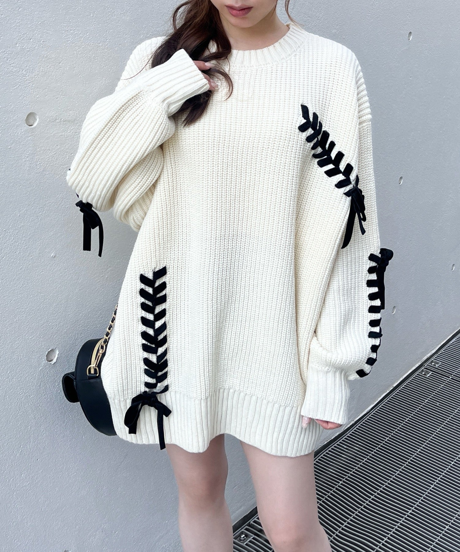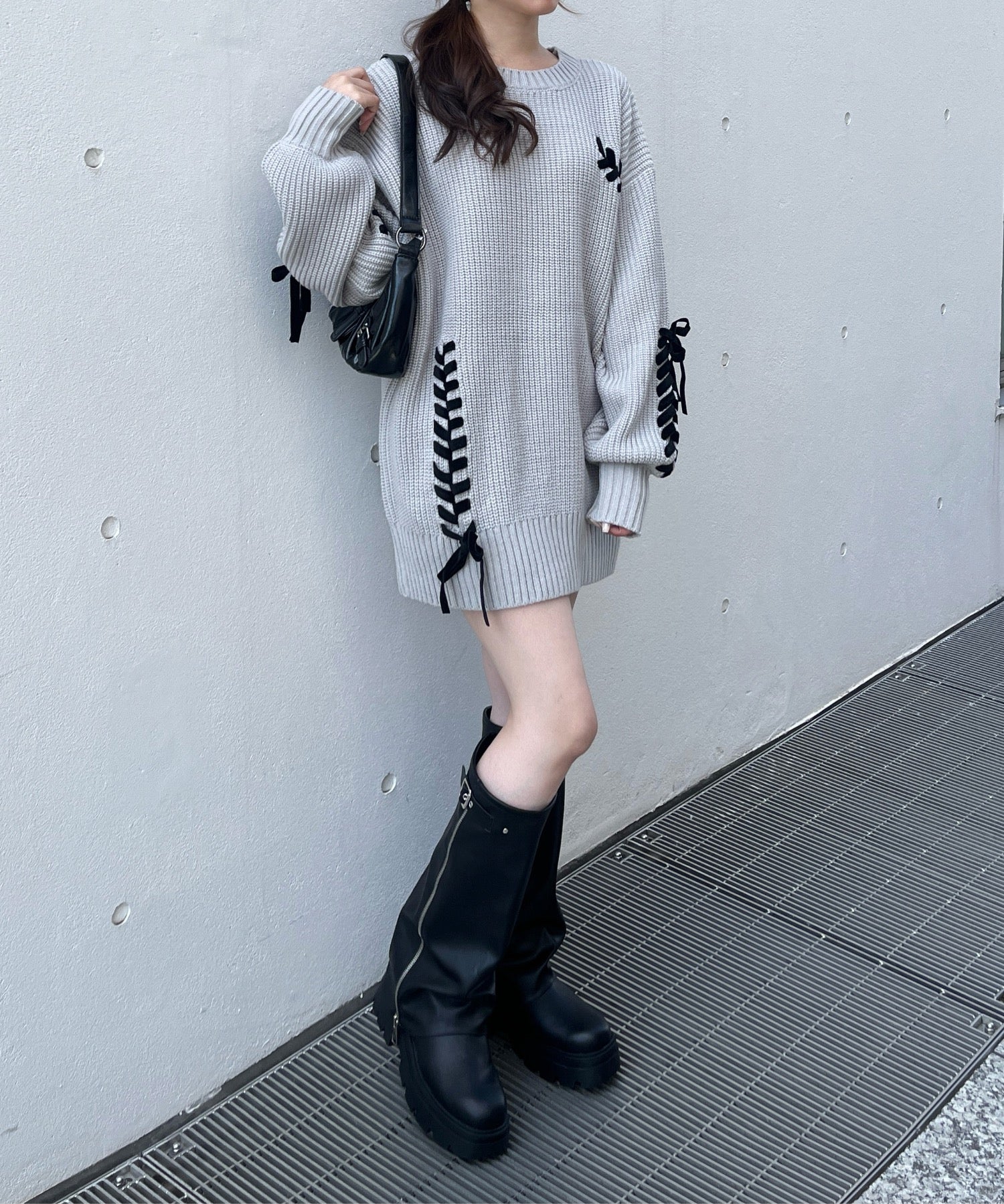 ・レーシングのリボンがフェミニンな印象を与えてくれるニットワンピース♡
