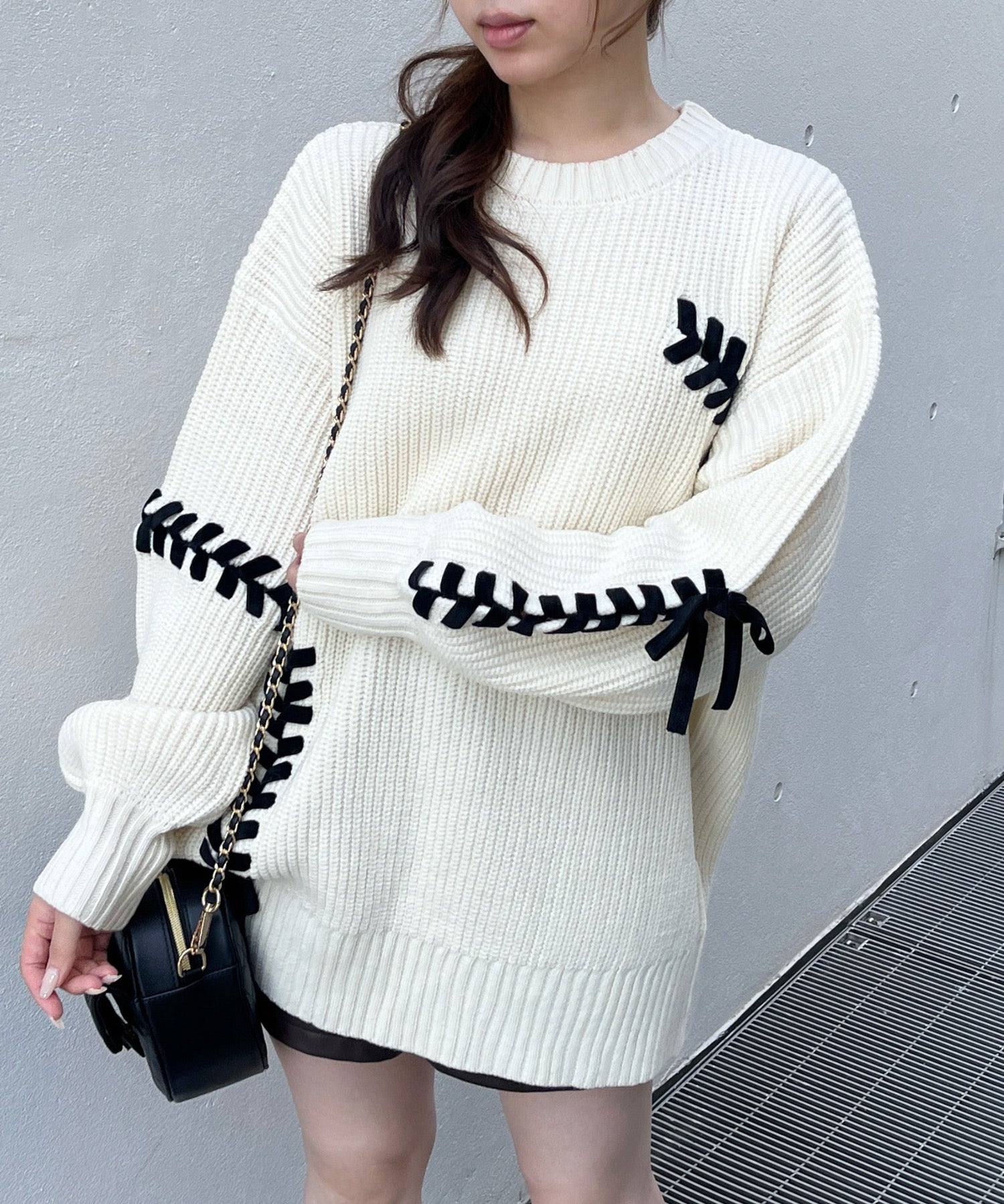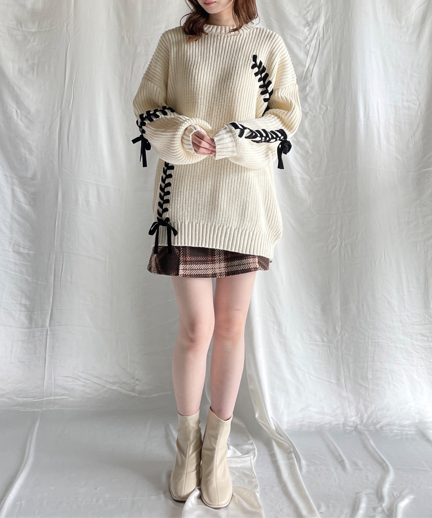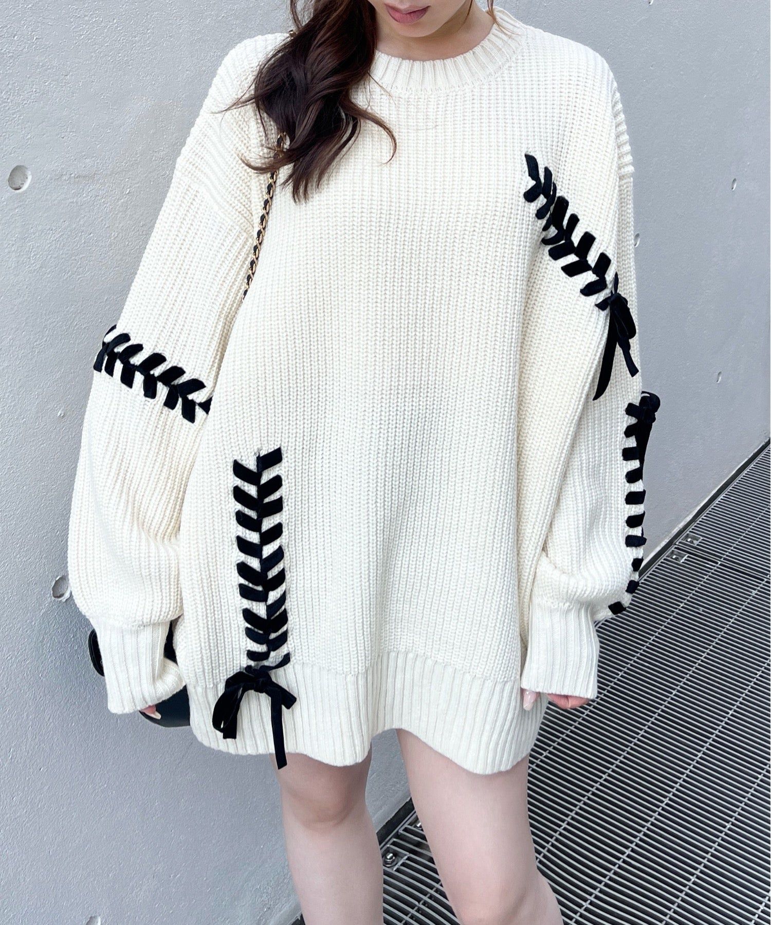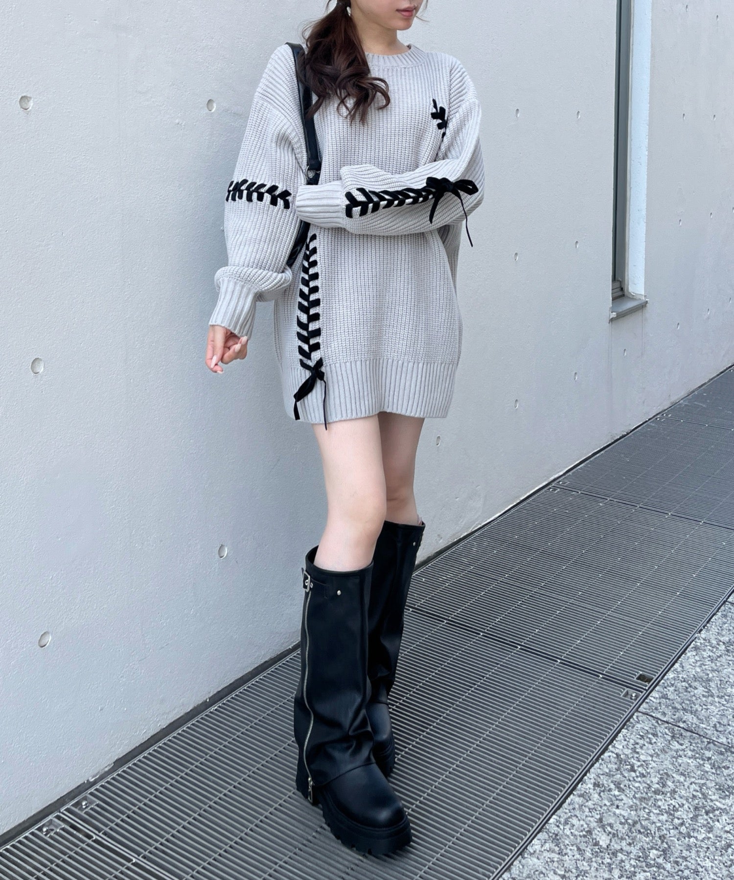 ・レーシングのリボンがフェミニンな印象を与えてくれるニットワンピース♡