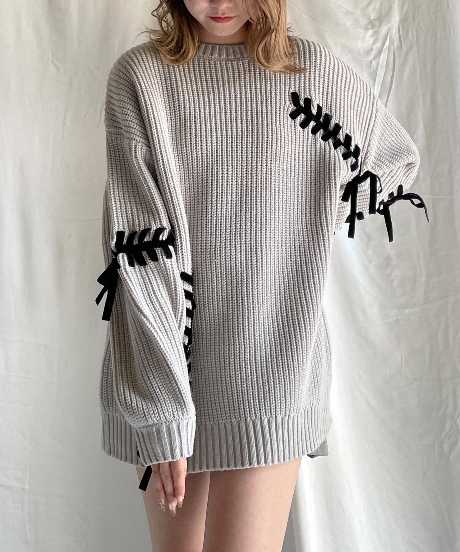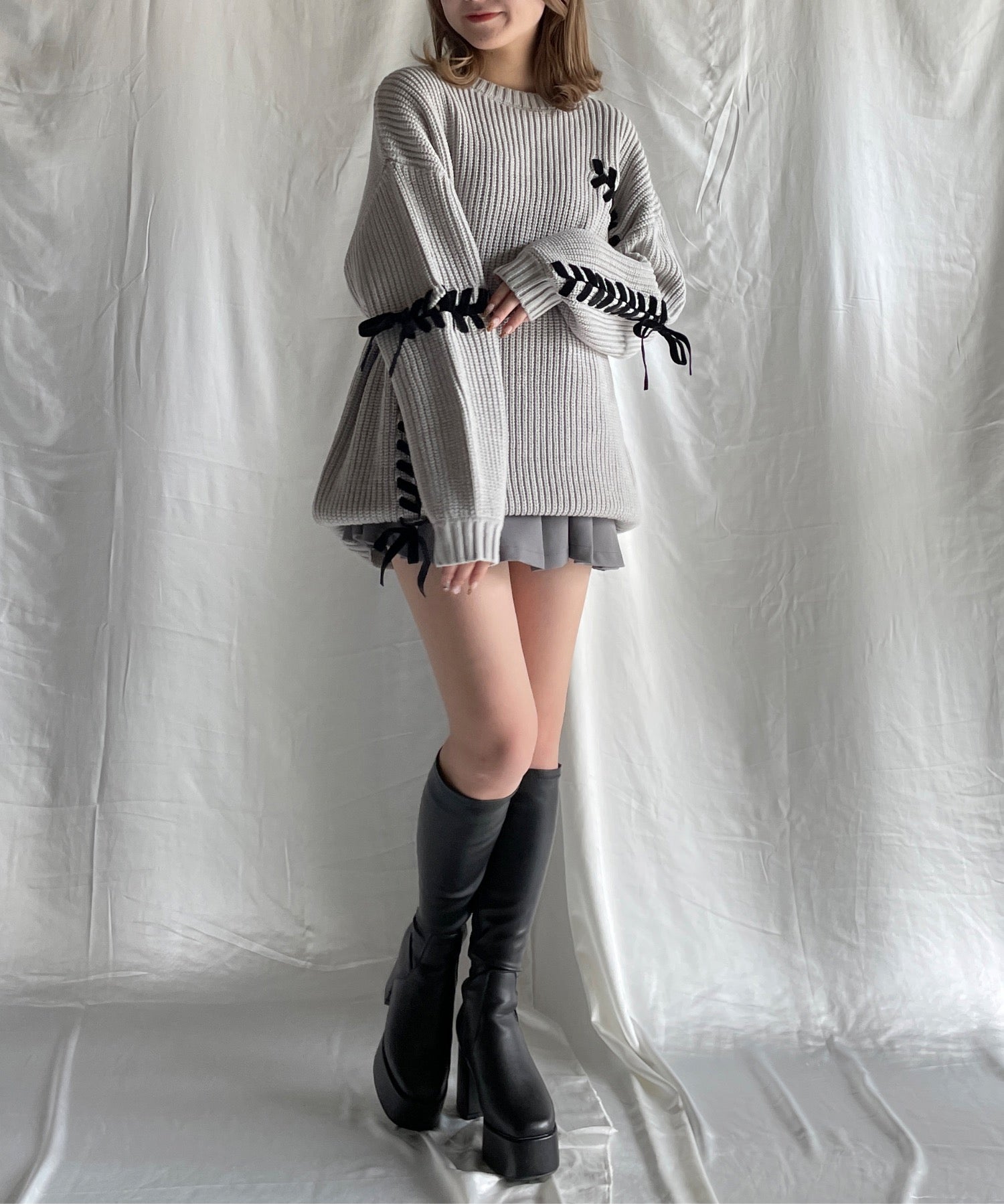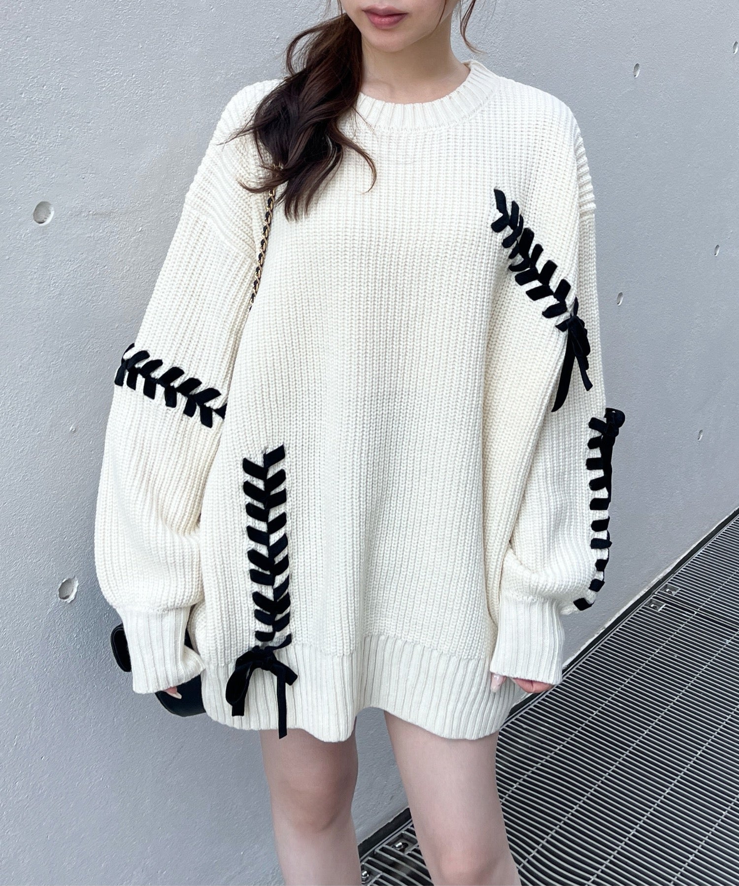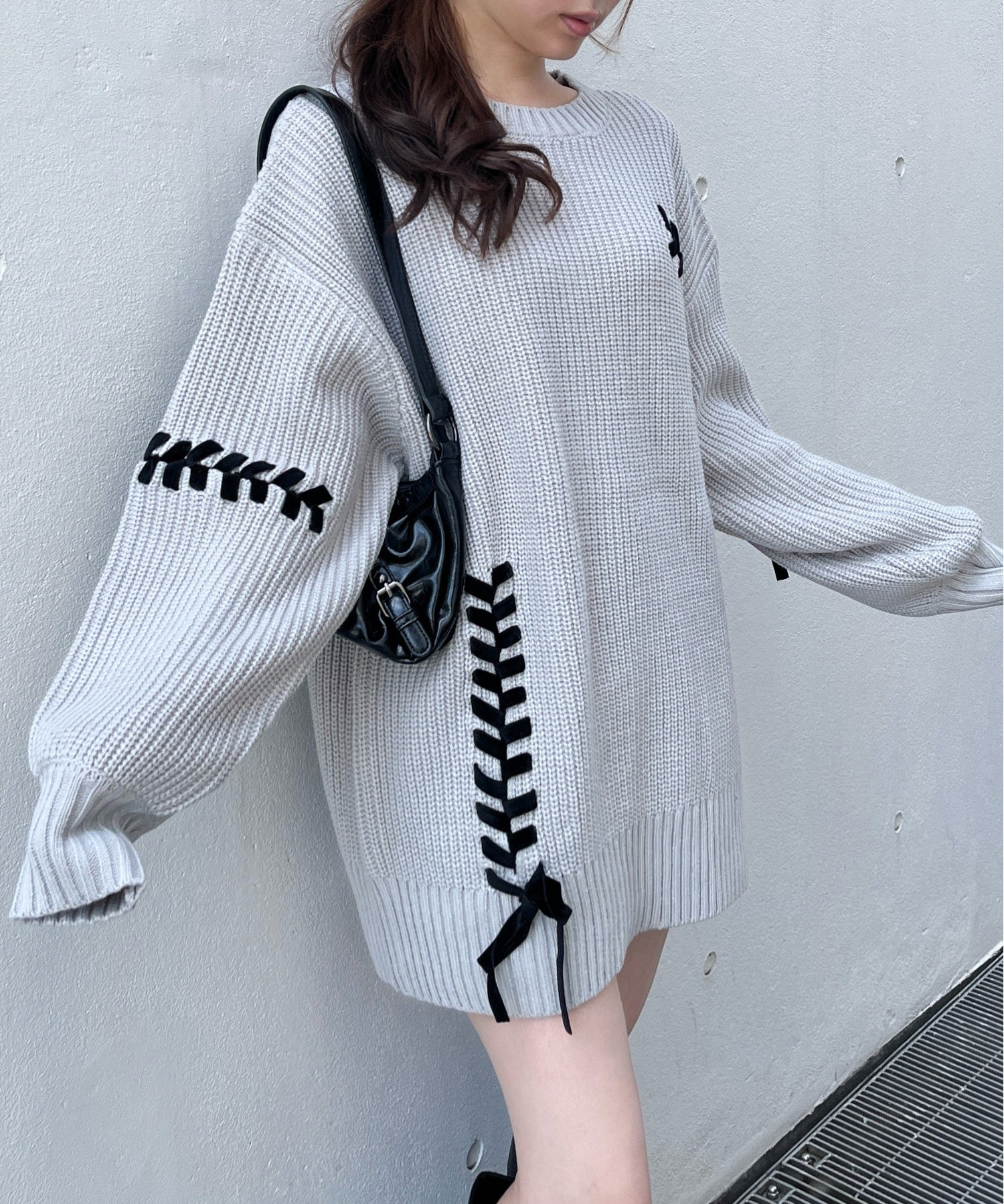 ・レーシングのリボンがフェミニンな印象を与えてくれるニットワンピース♡