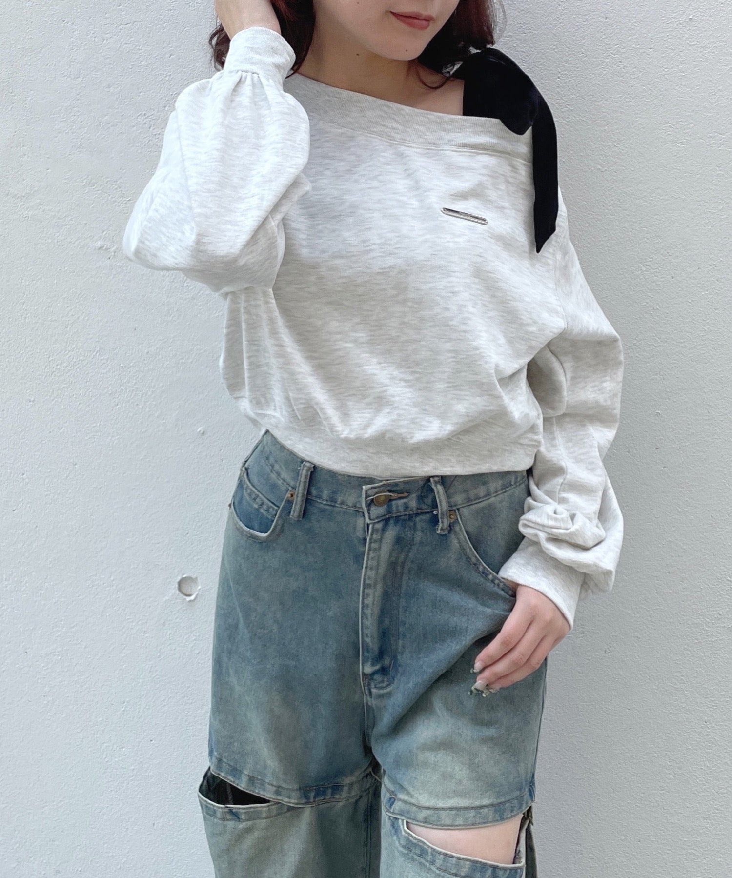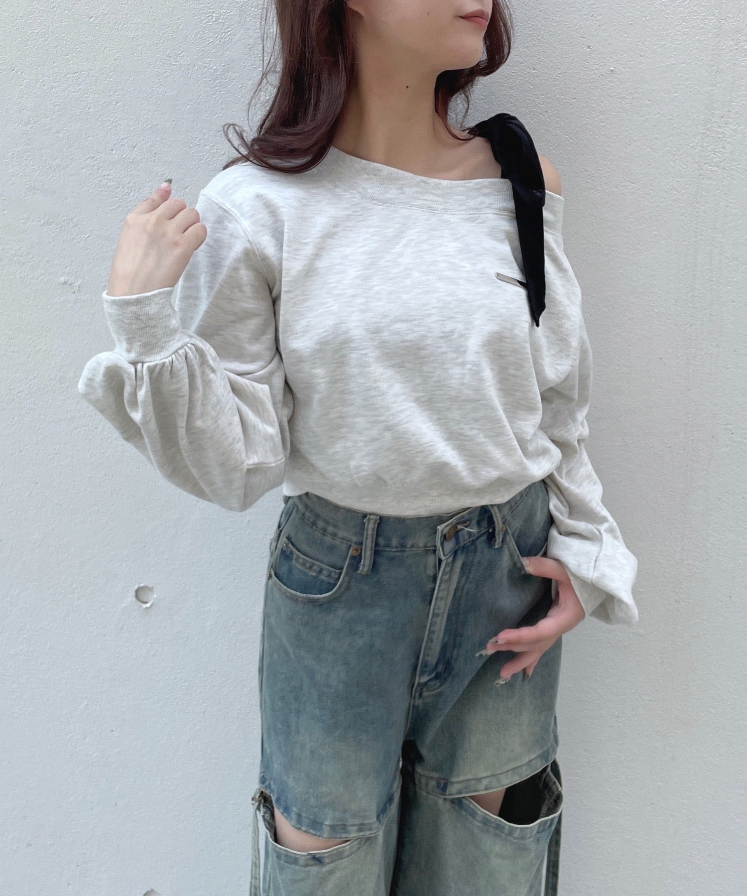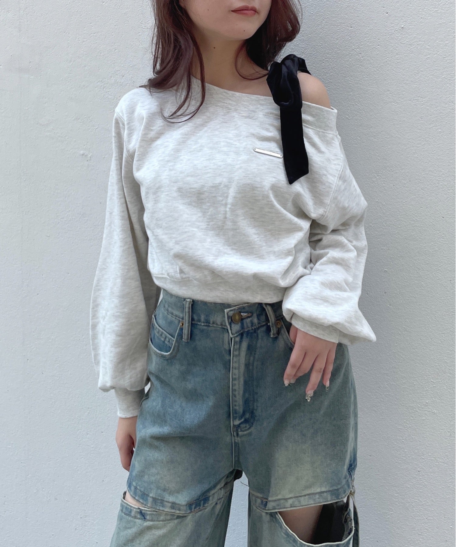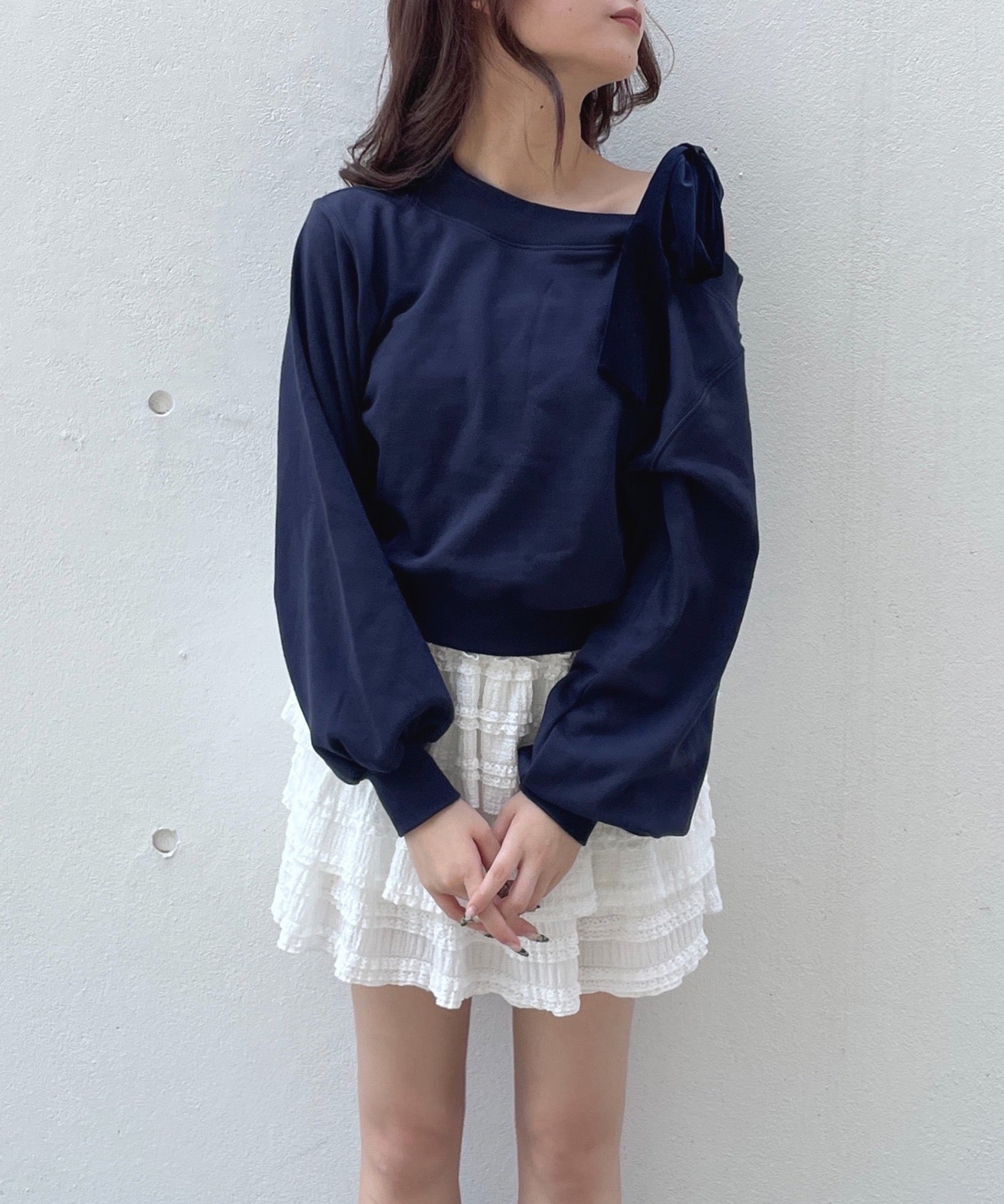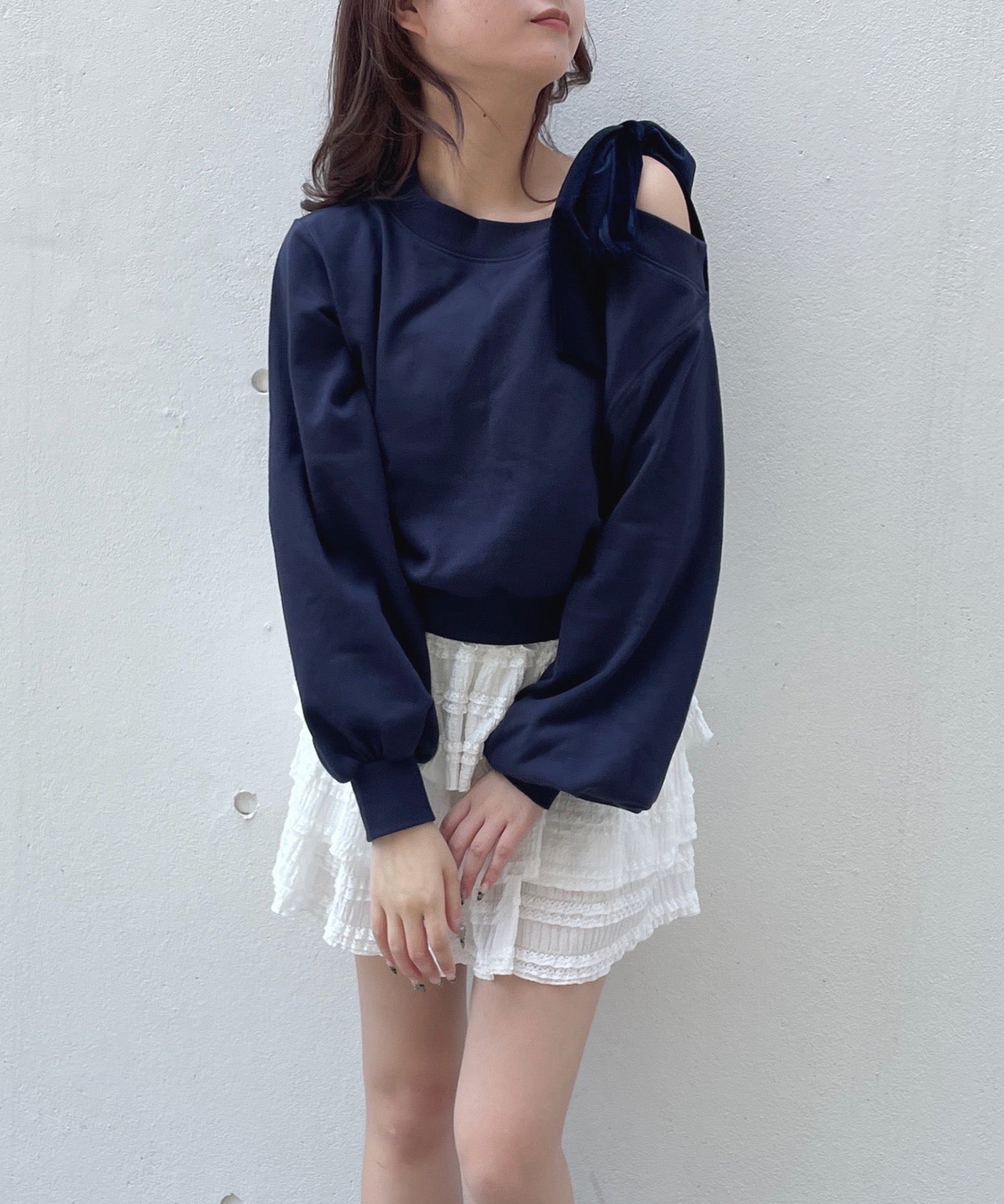 ・カジュアルなトレーナーもワンショルとリボンで一気に女性らしい印象に♡