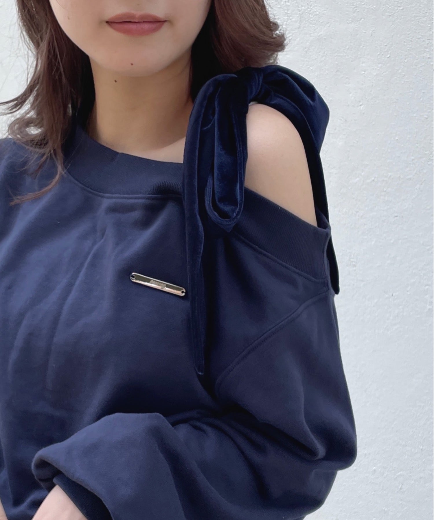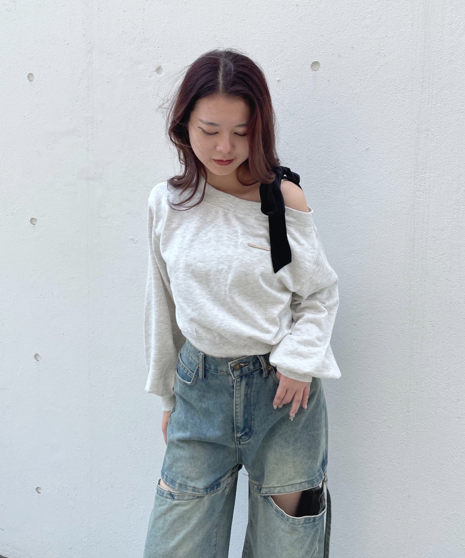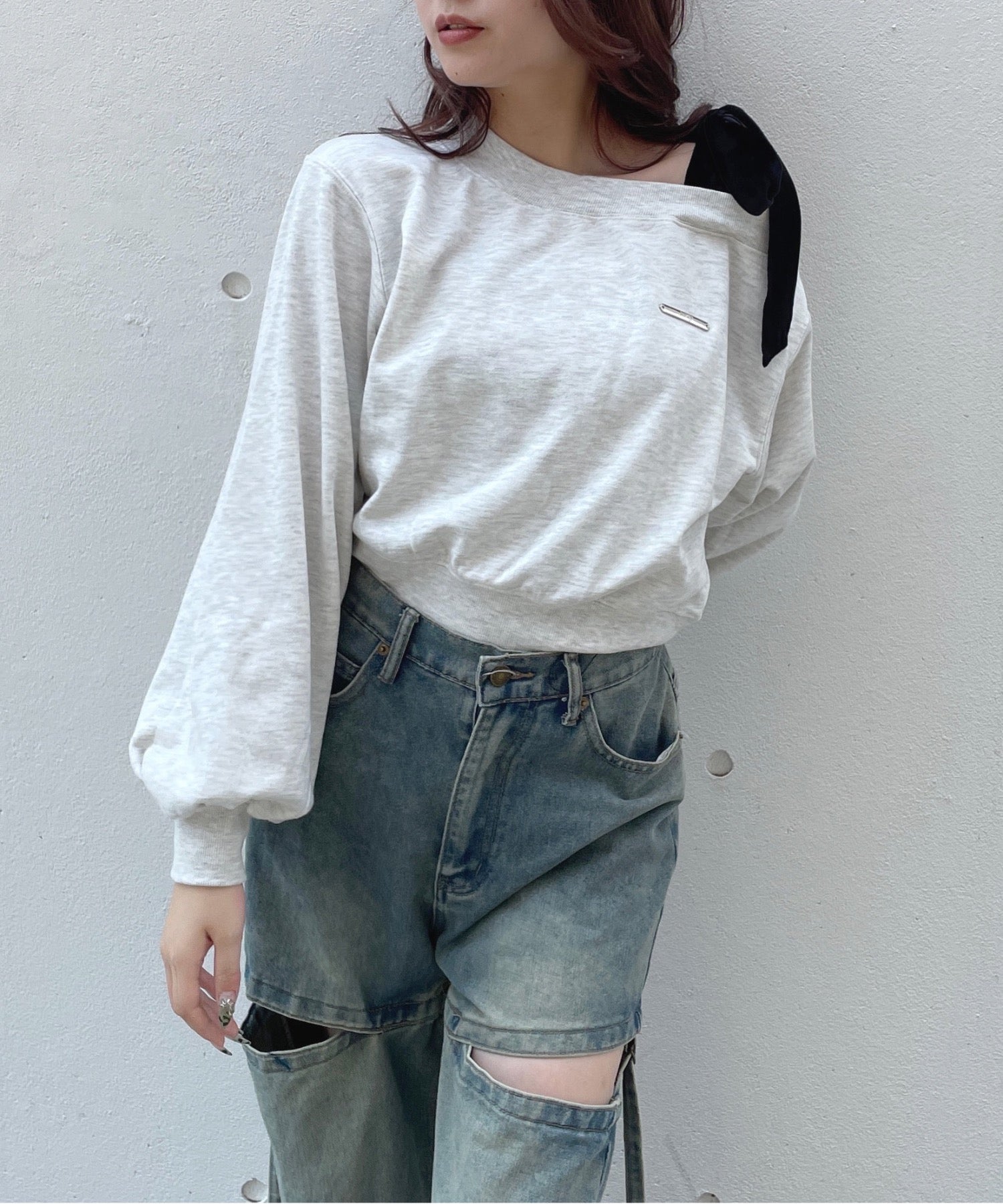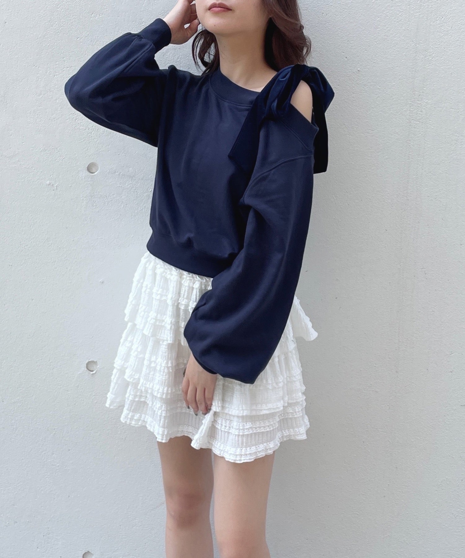 ・カジュアルなトレーナーもワンショルとリボンで一気に女性らしい印象に♡