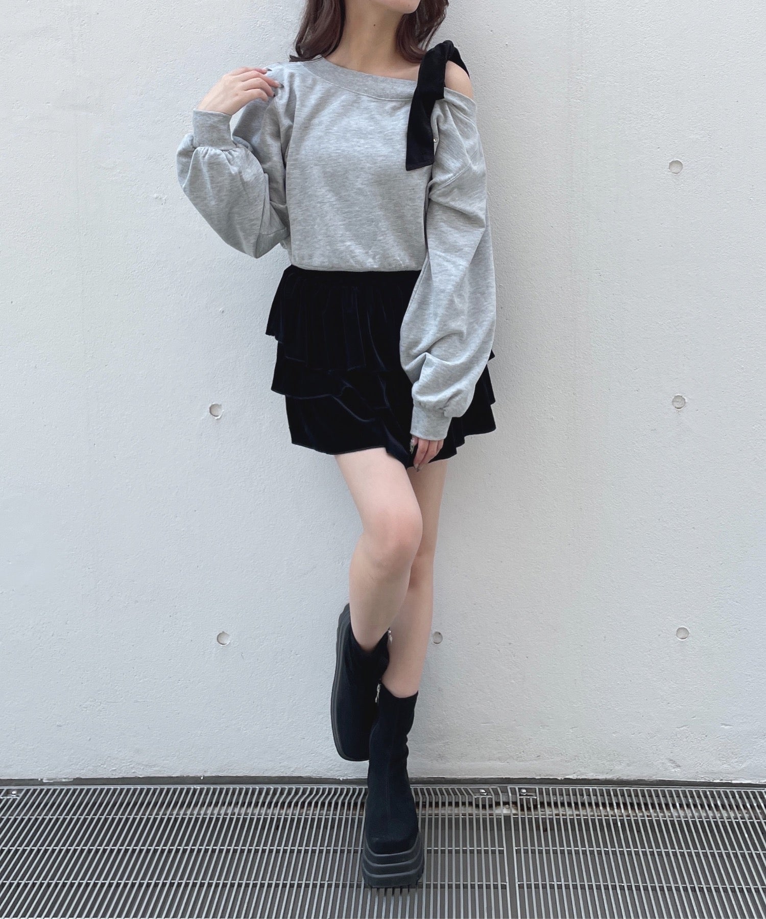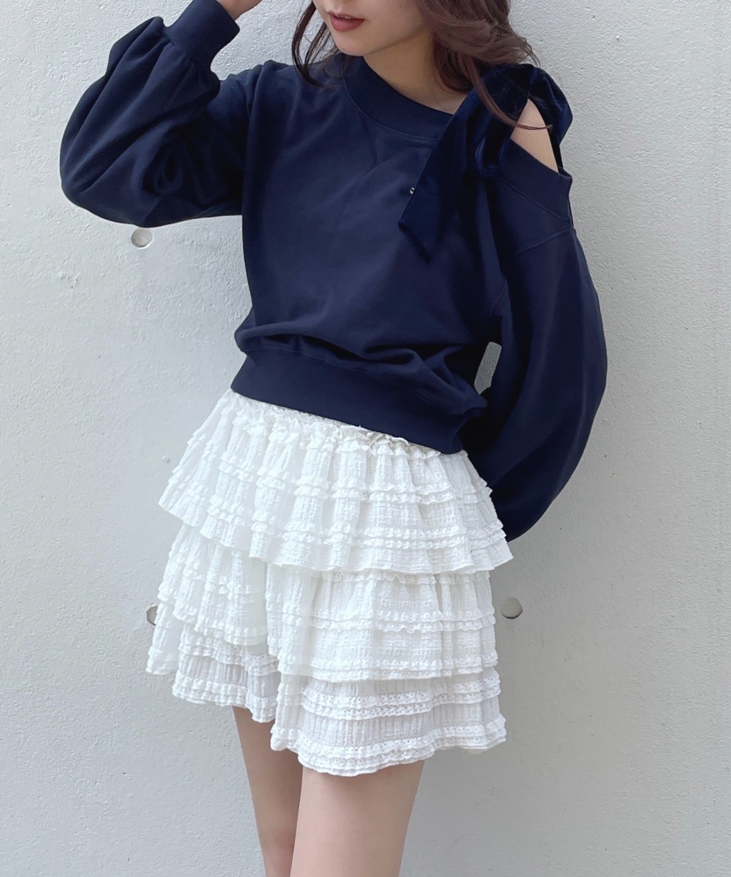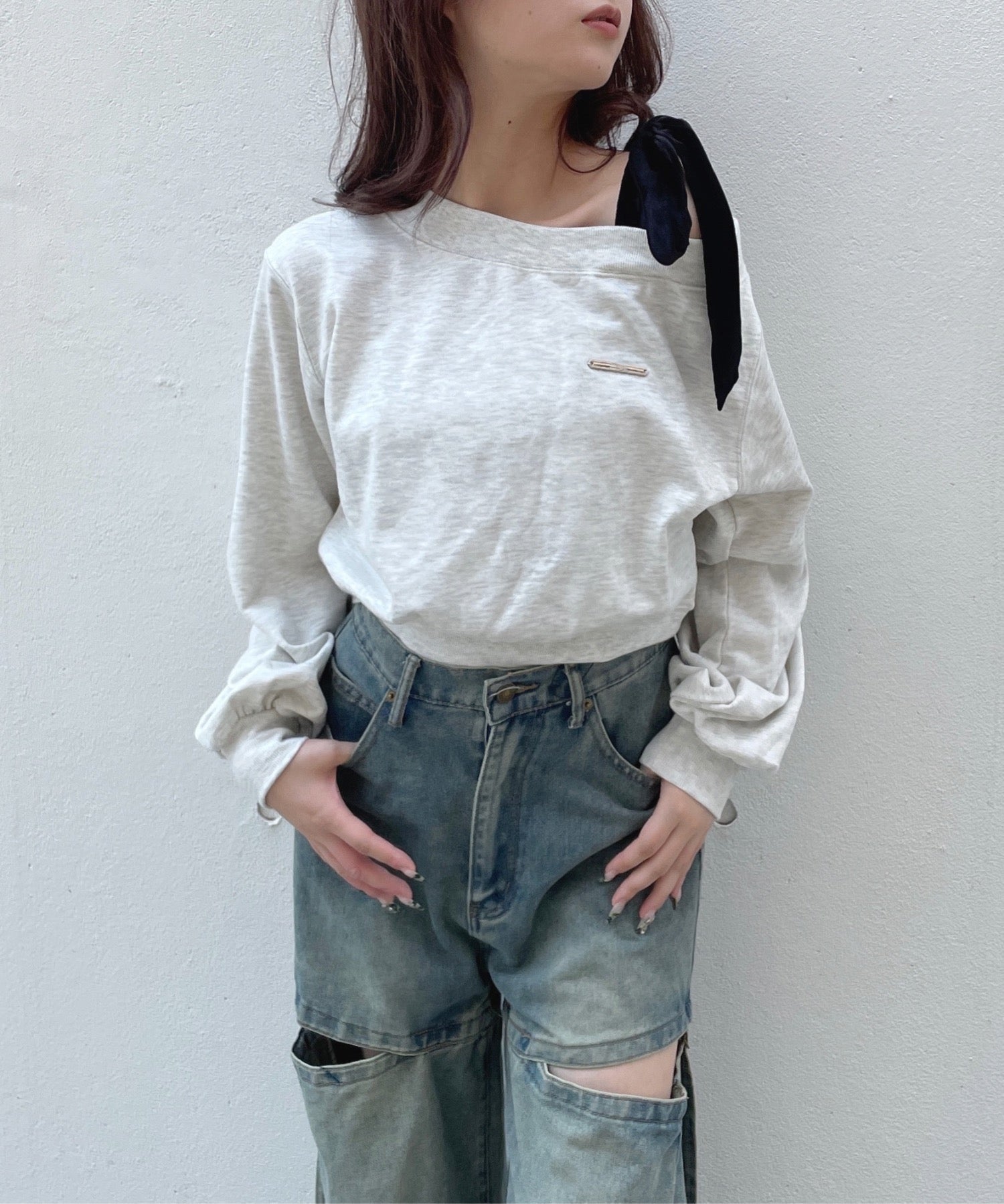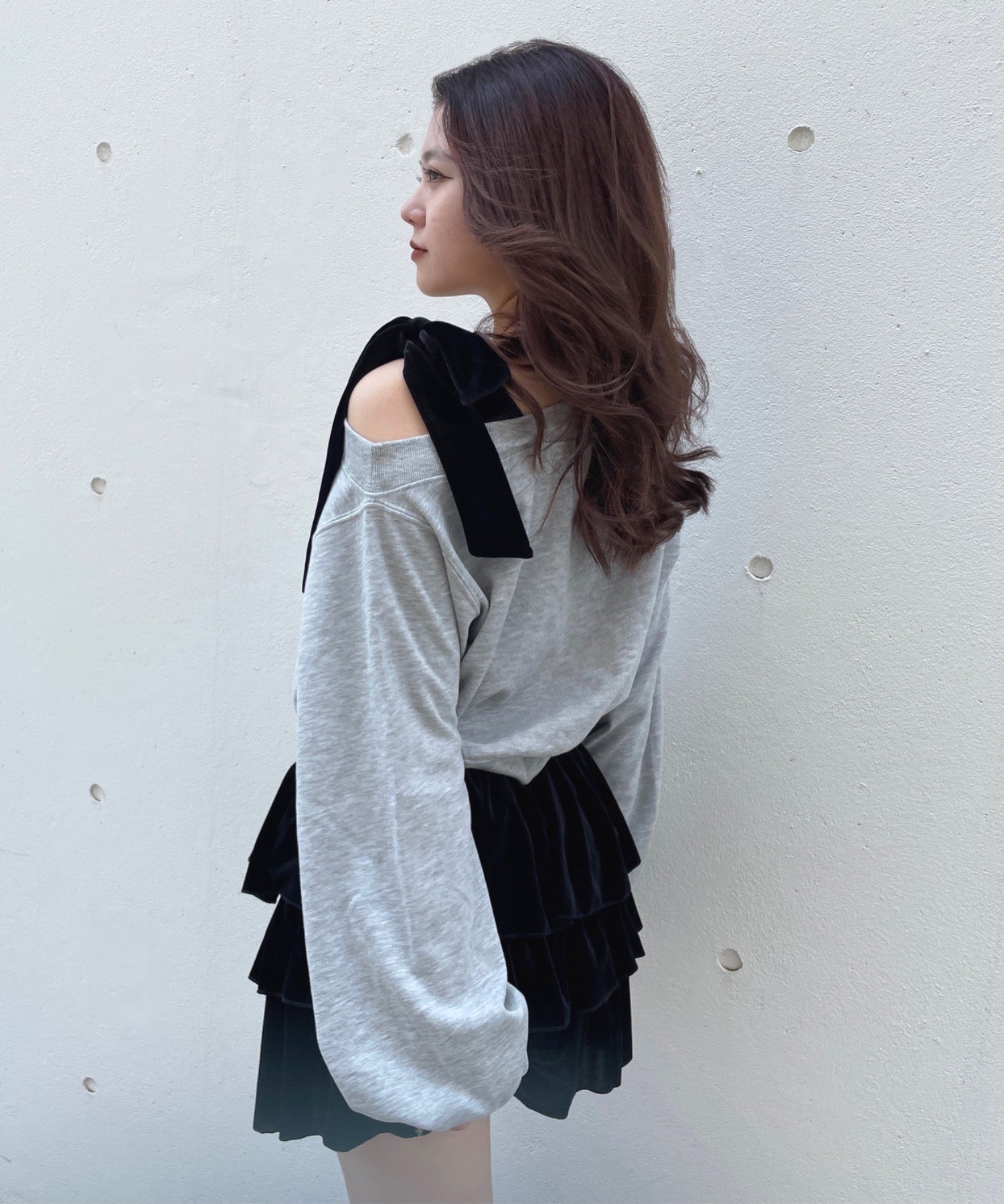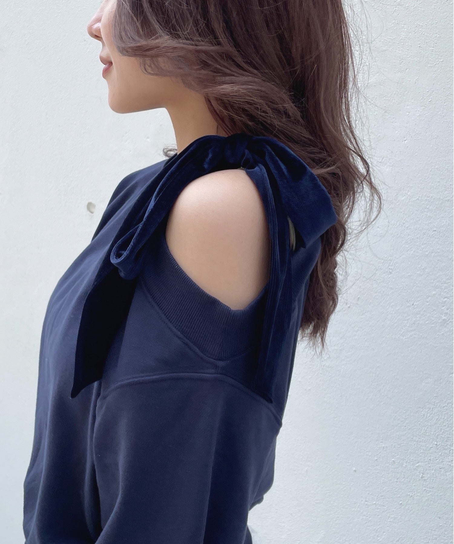 ・カジュアルなトレーナーもワンショルとリボンで一気に女性らしい印象に♡