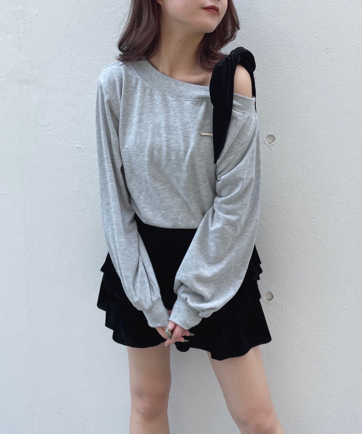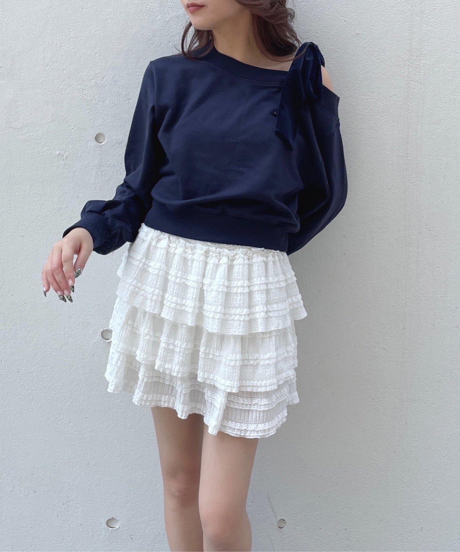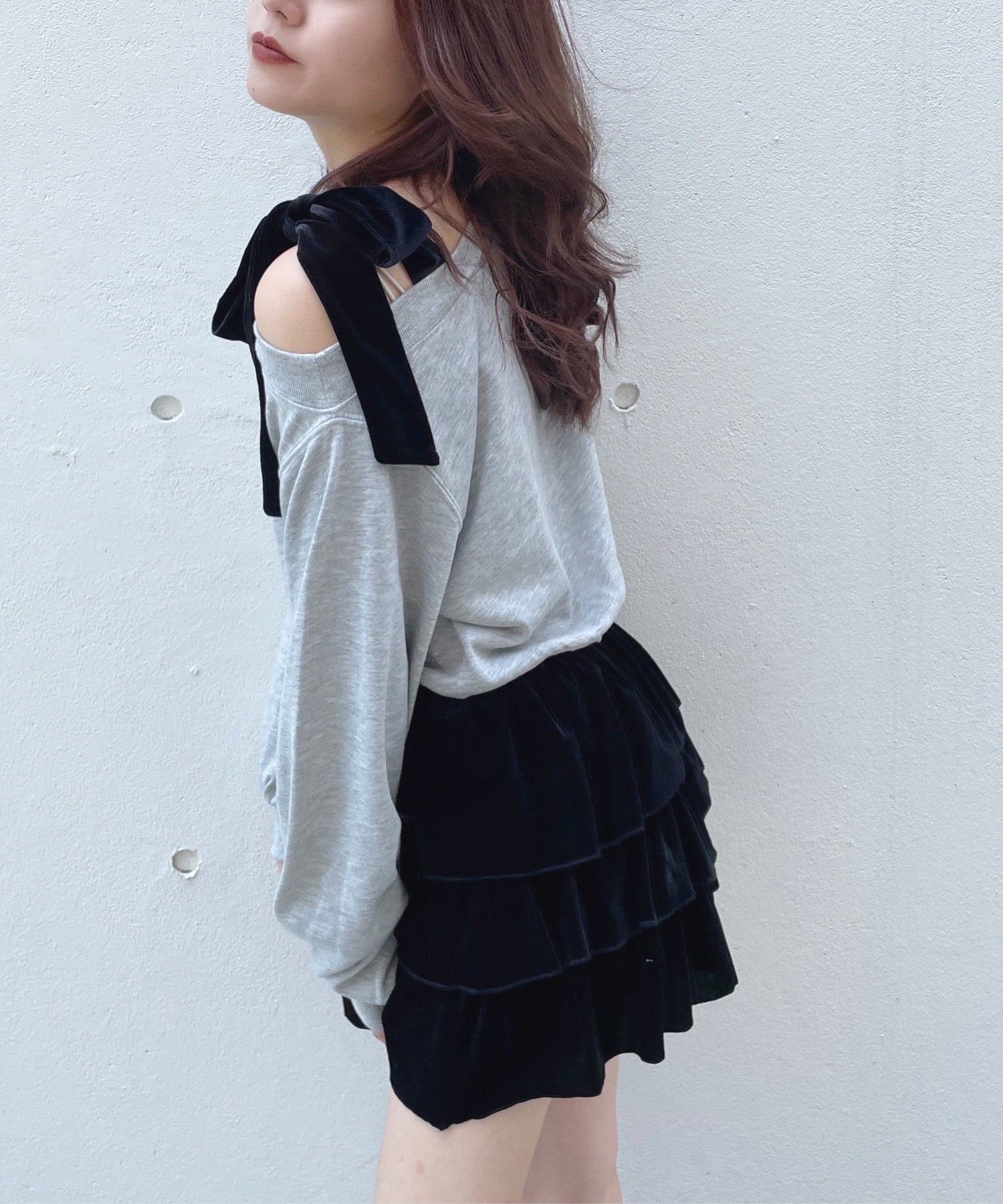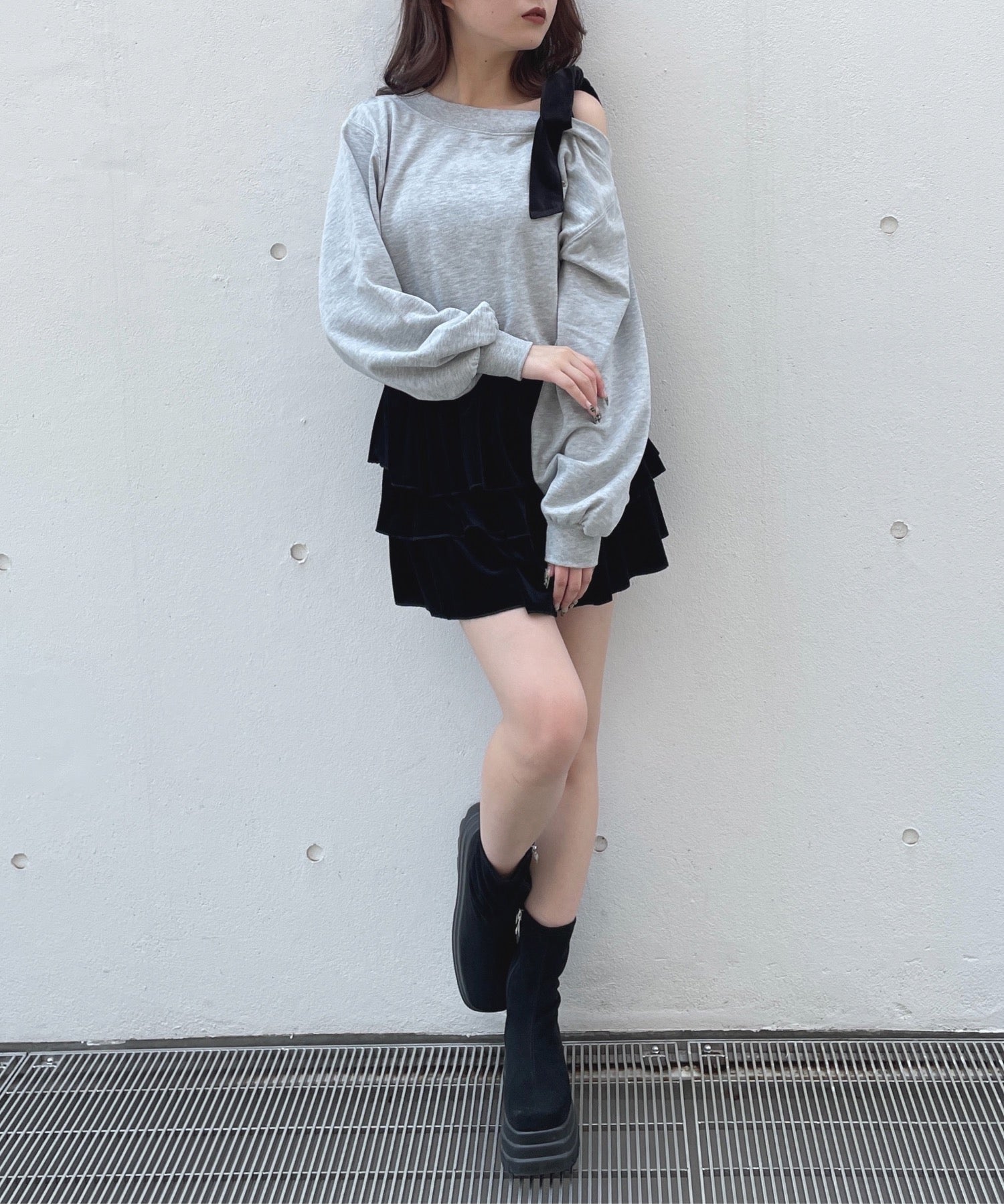 ・カジュアルなトレーナーもワンショルとリボンで一気に女性らしい印象に♡