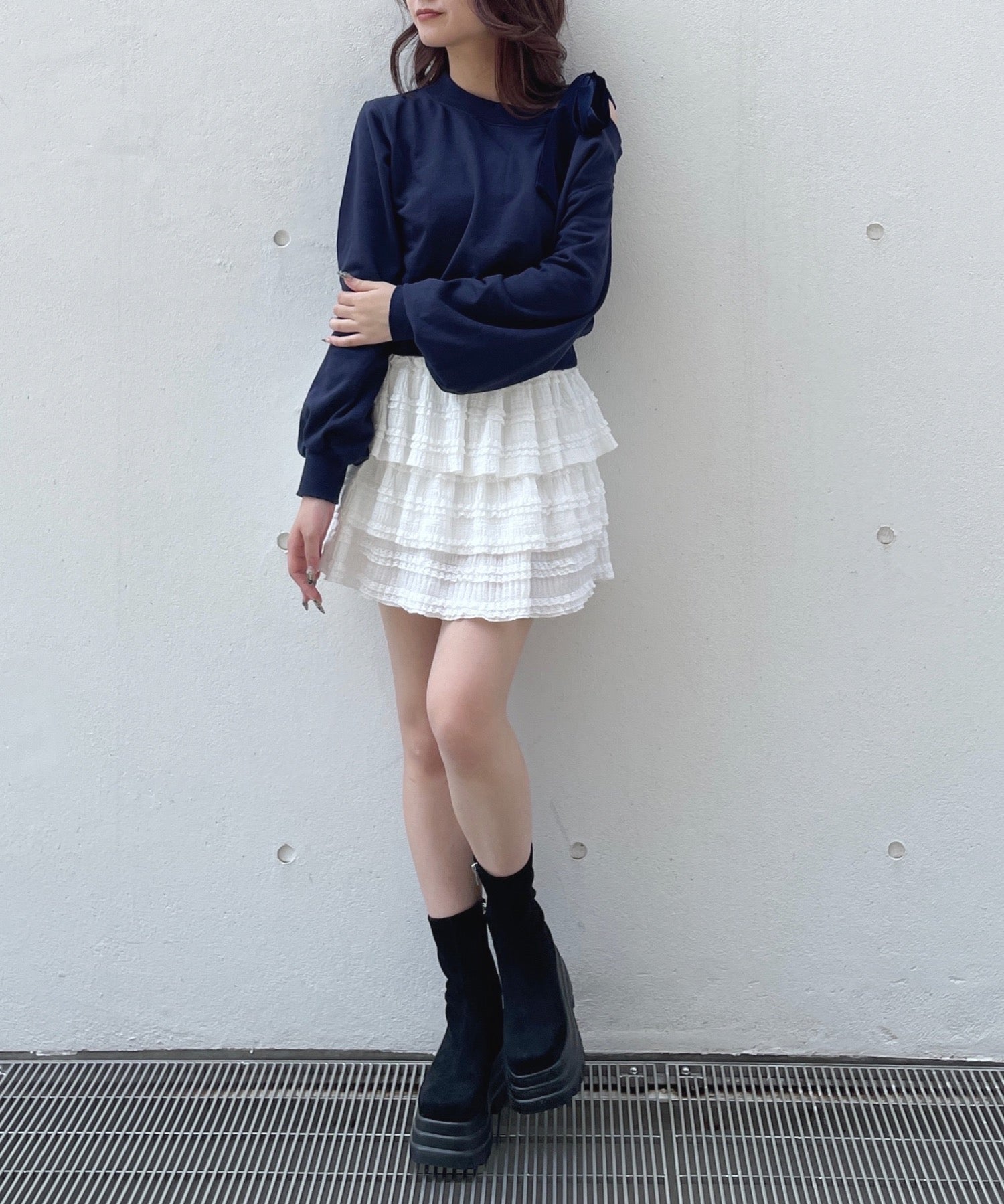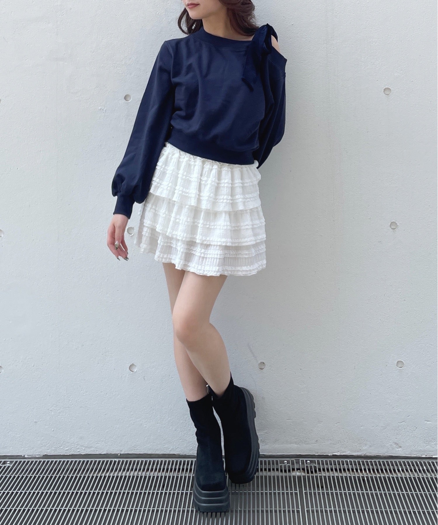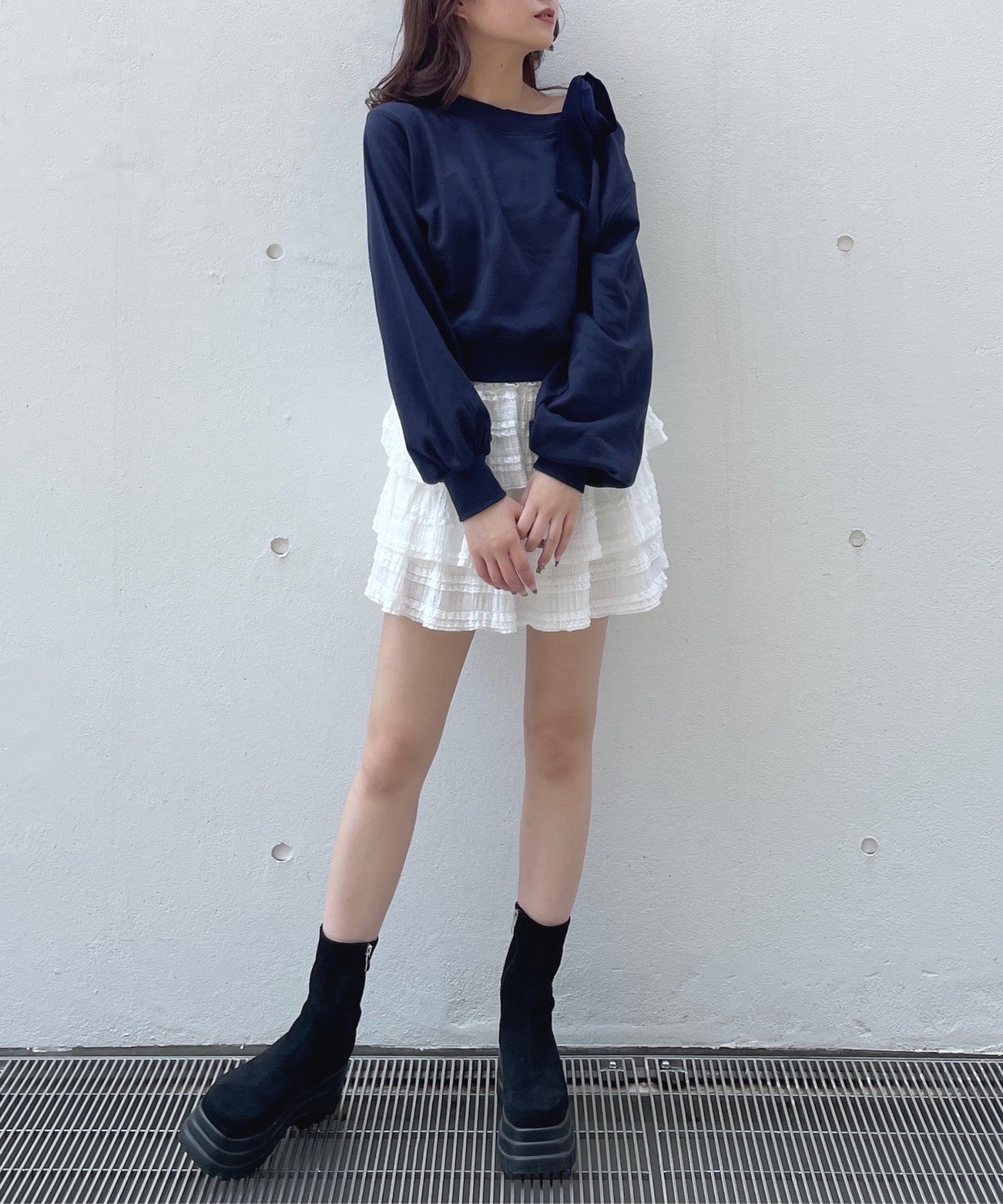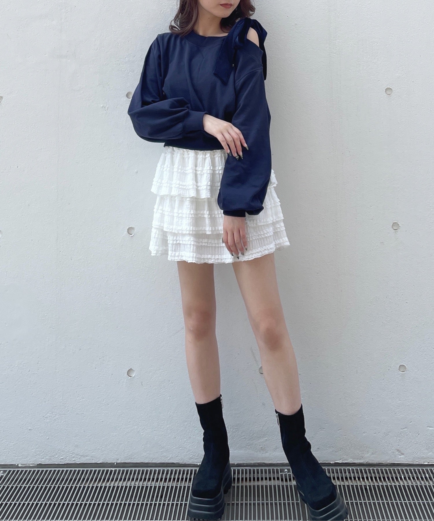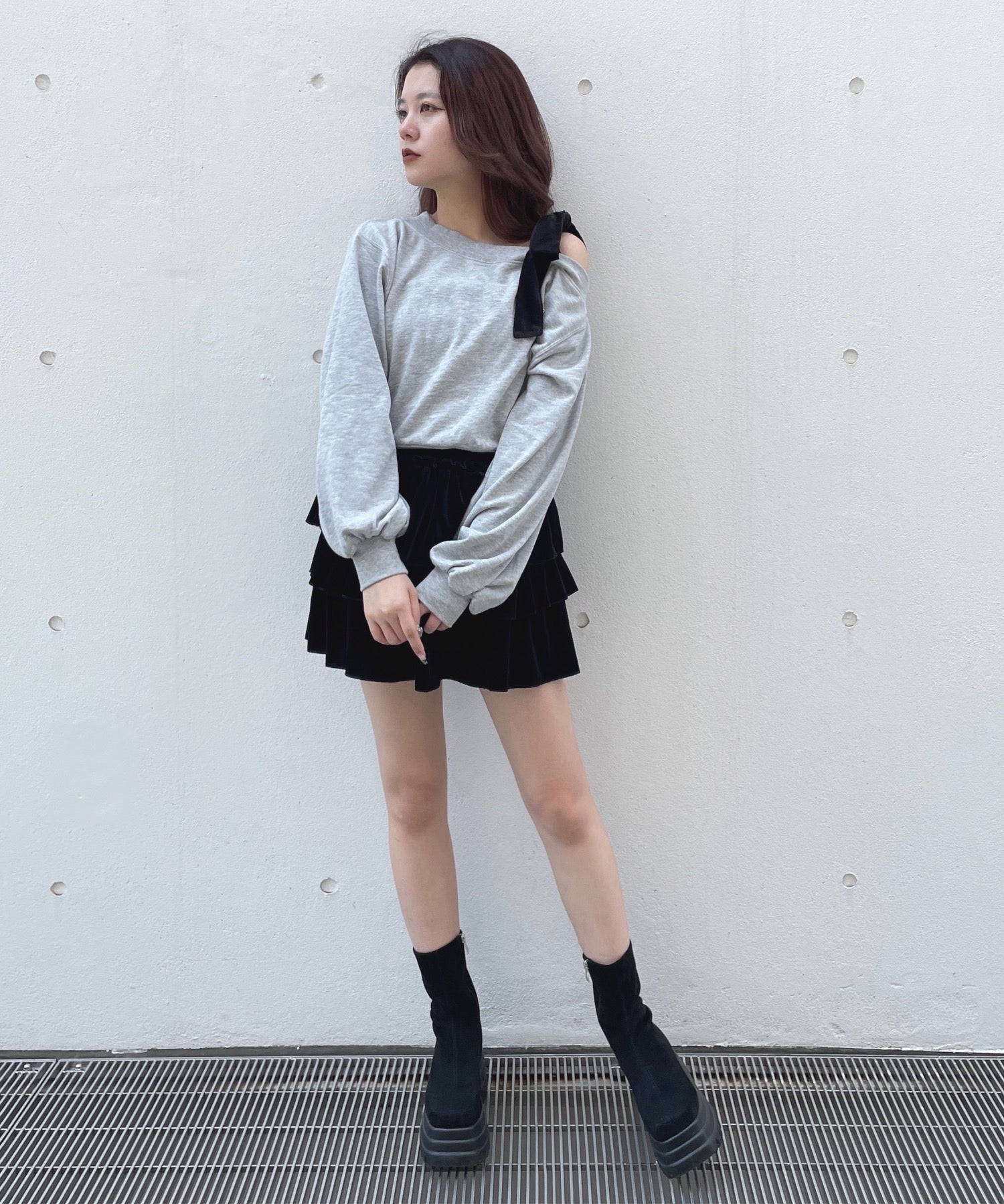 ・カジュアルなトレーナーもワンショルとリボンで一気に女性らしい印象に♡