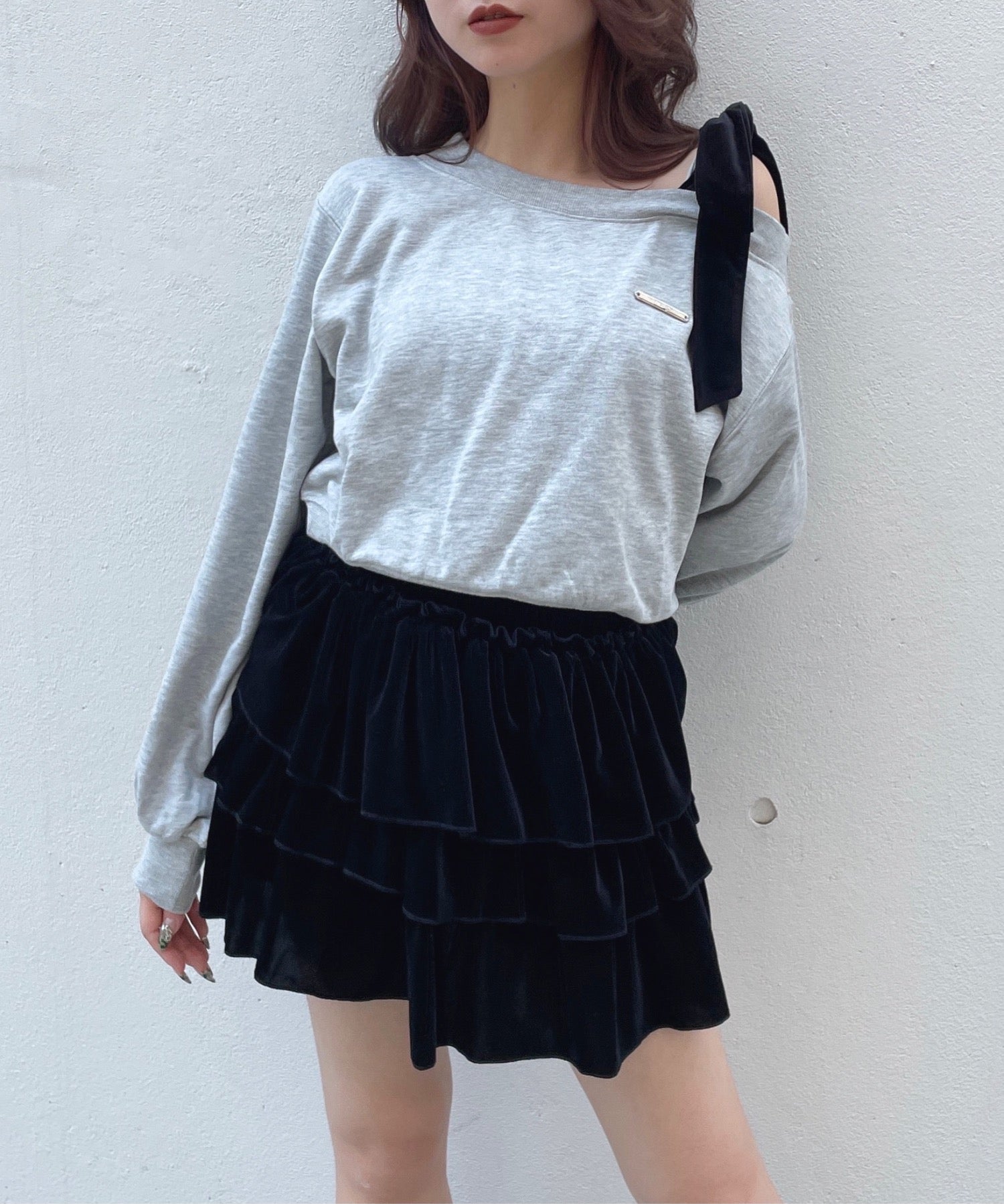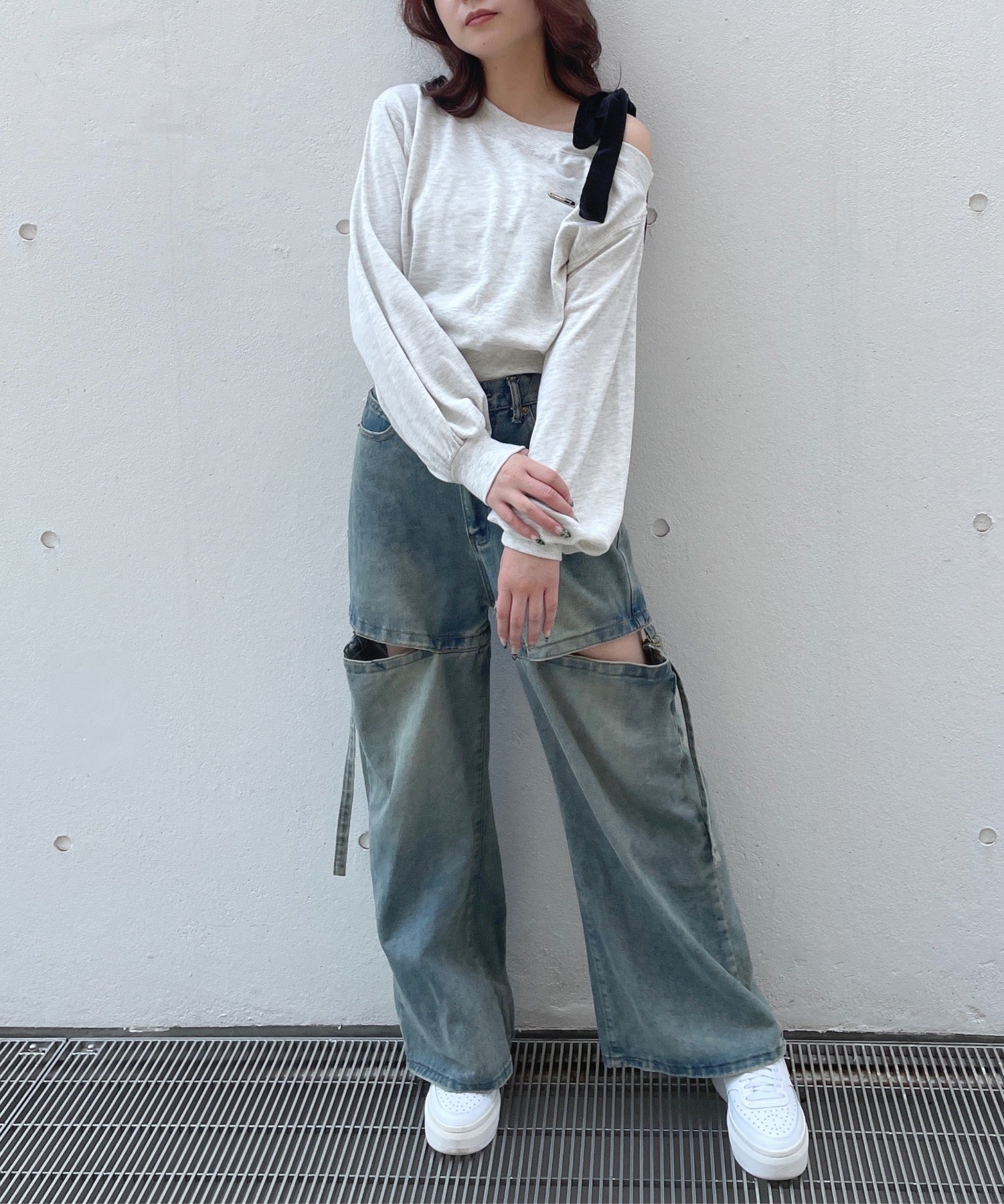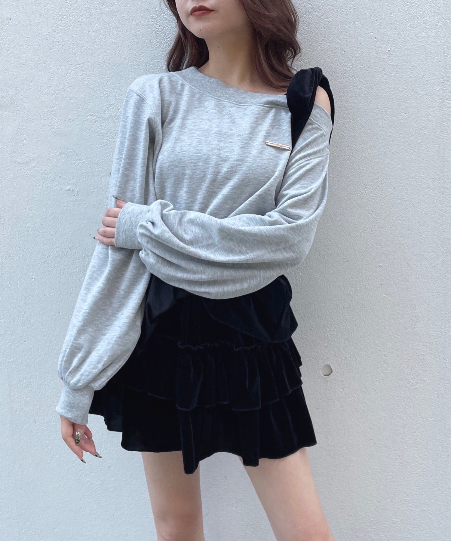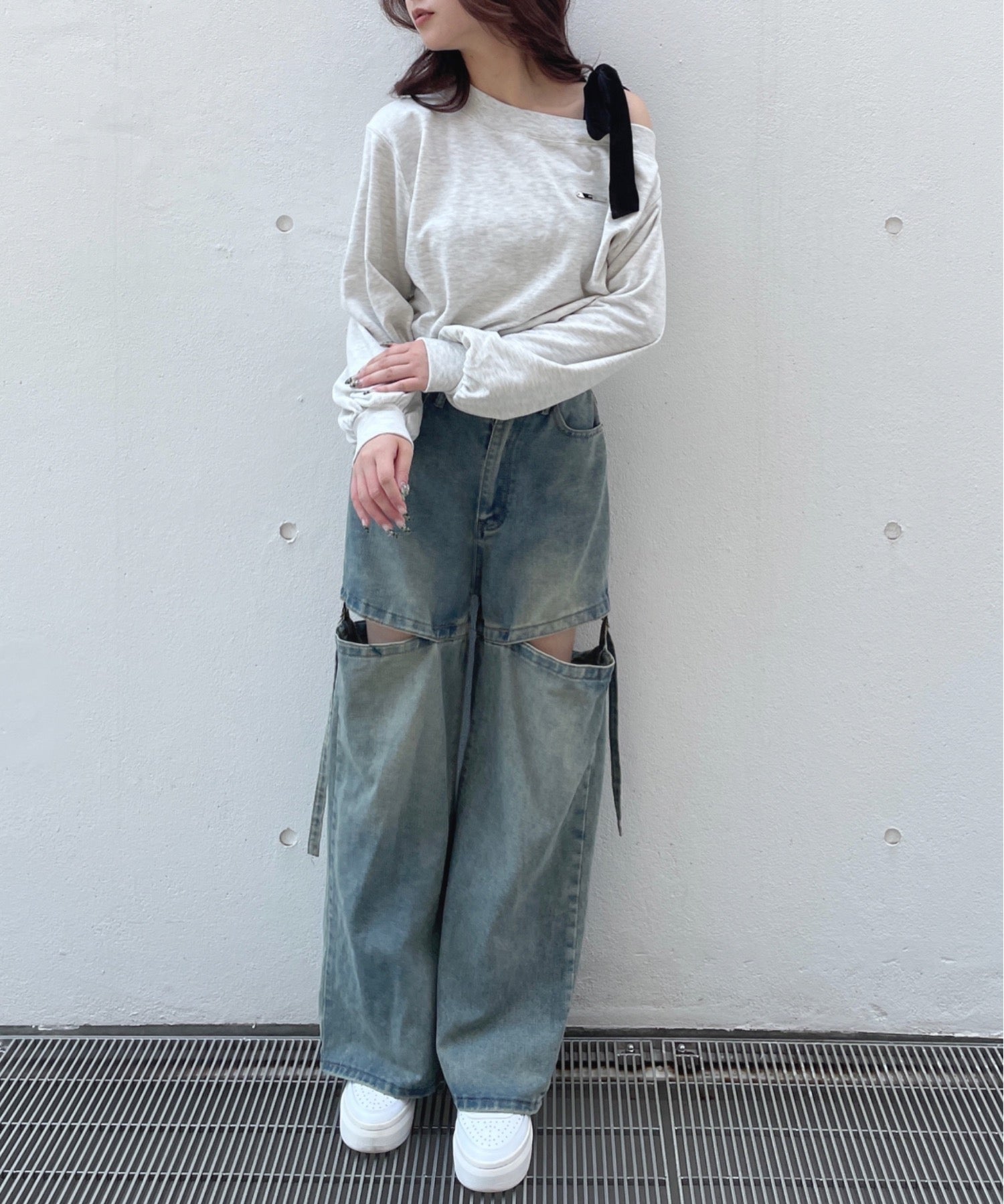 ・カジュアルなトレーナーもワンショルとリボンで一気に女性らしい印象に♡