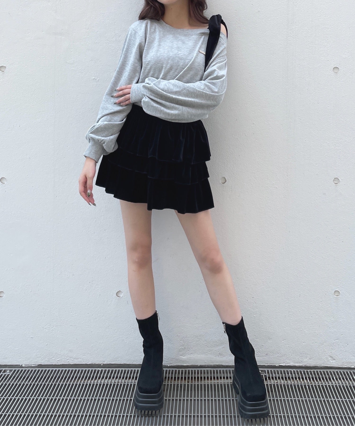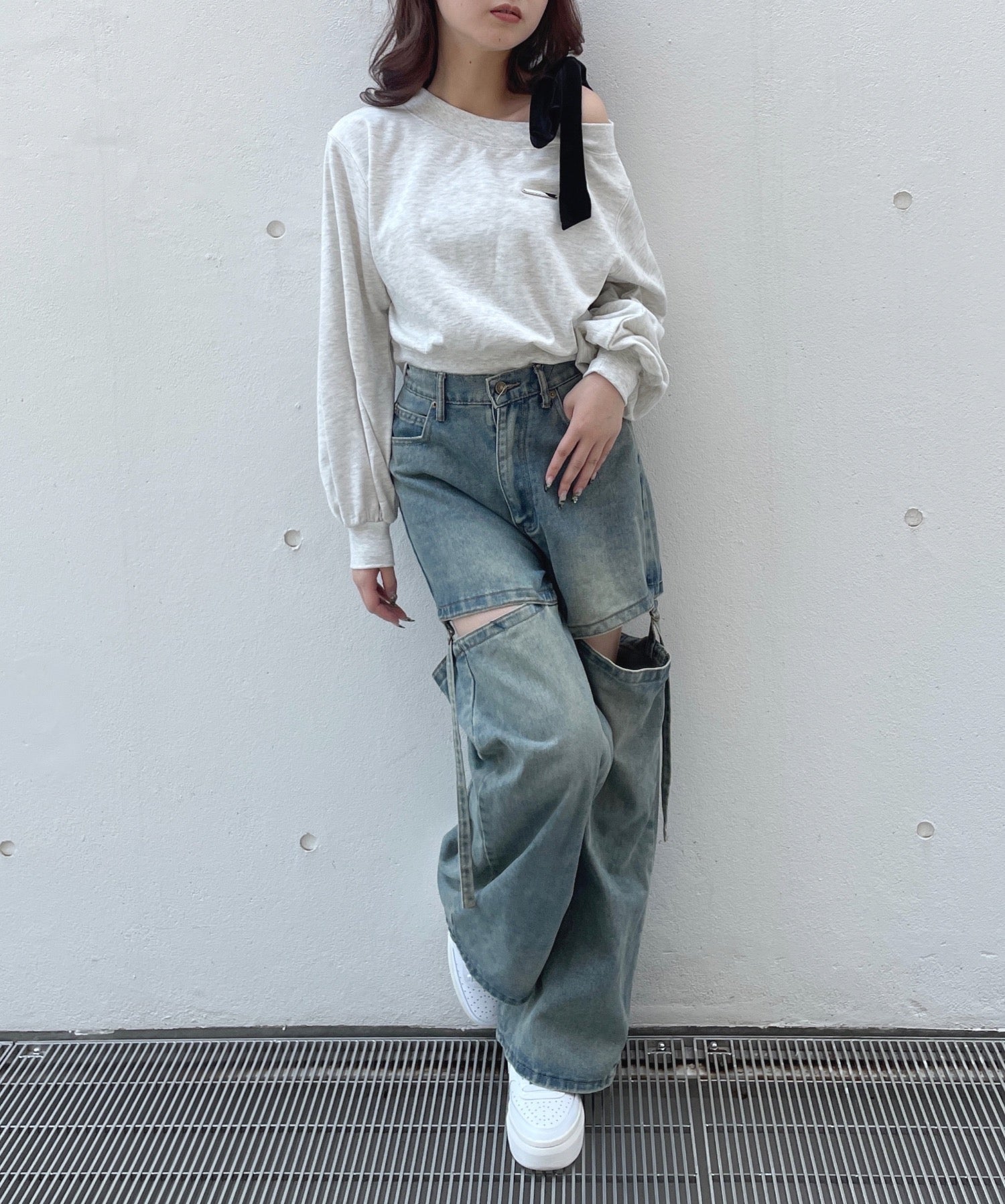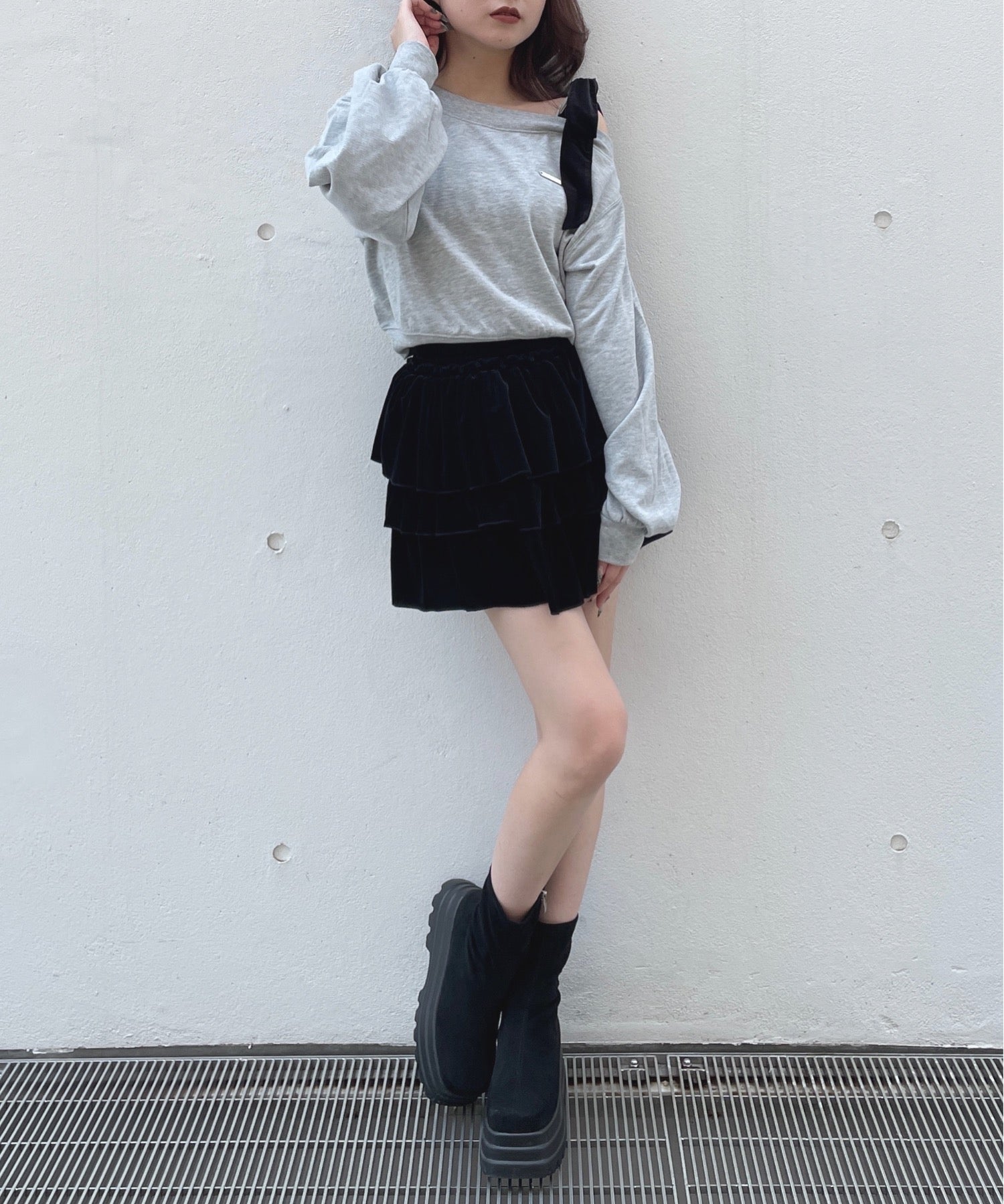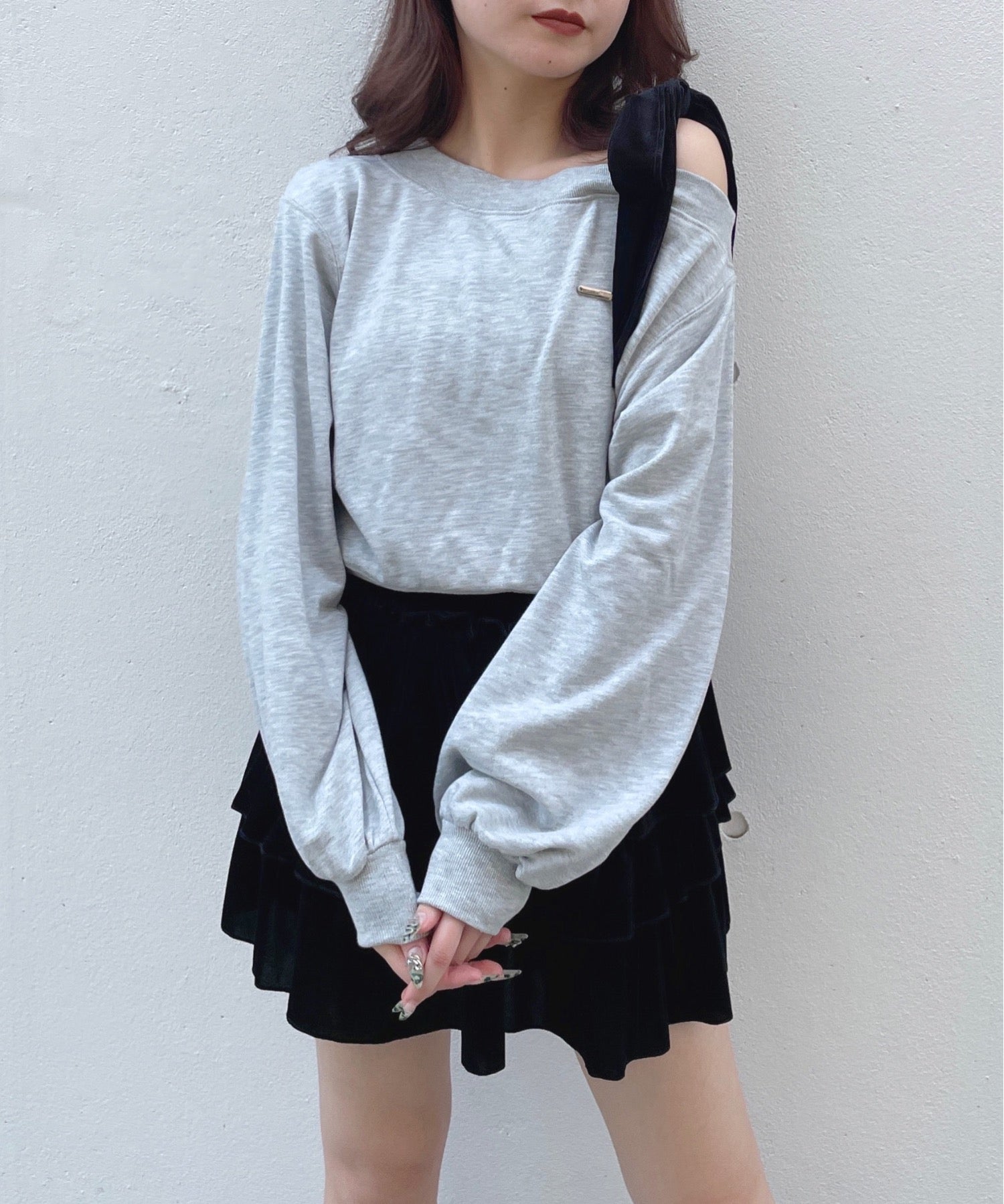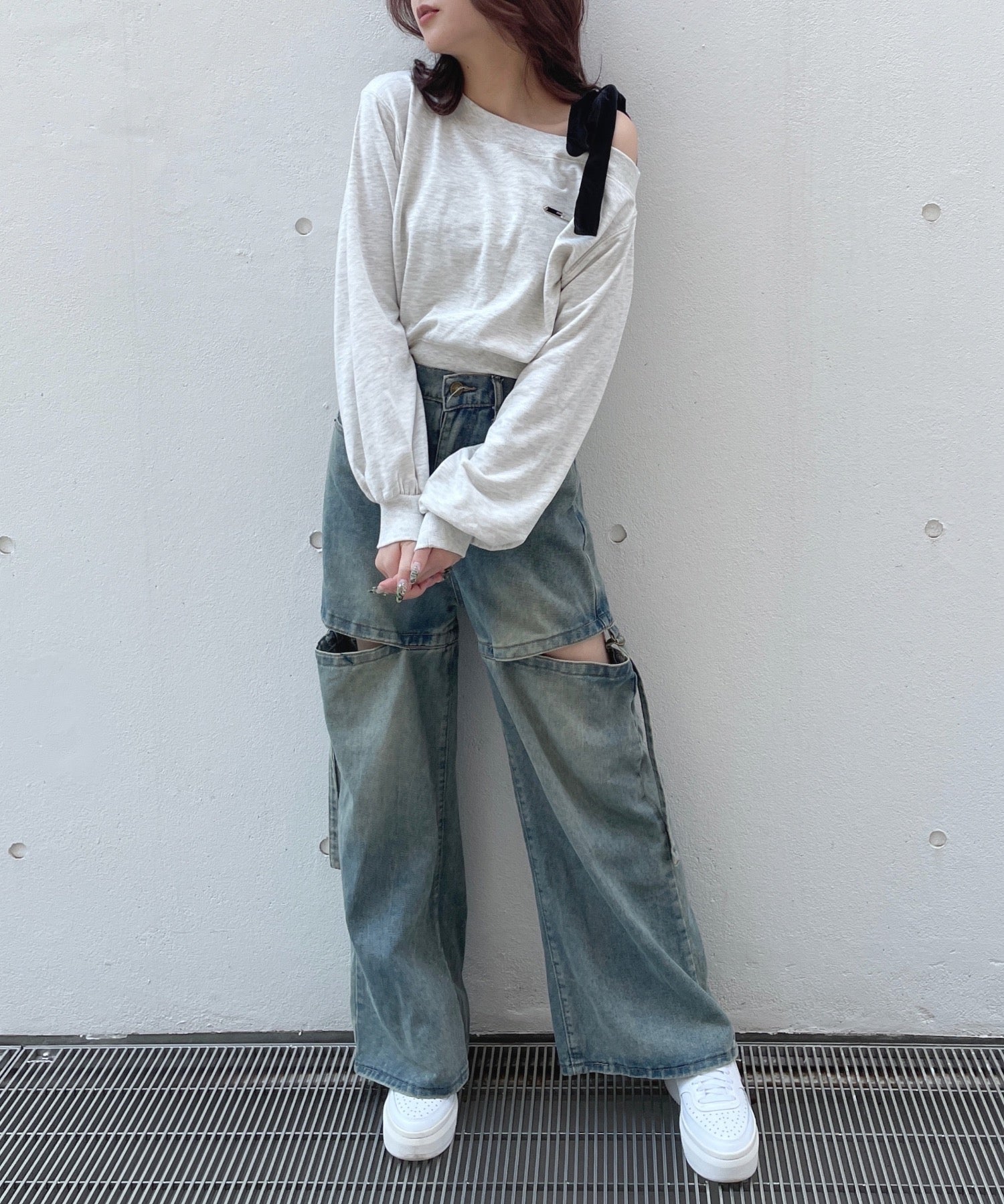 ・カジュアルなトレーナーもワンショルとリボンで一気に女性らしい印象に♡