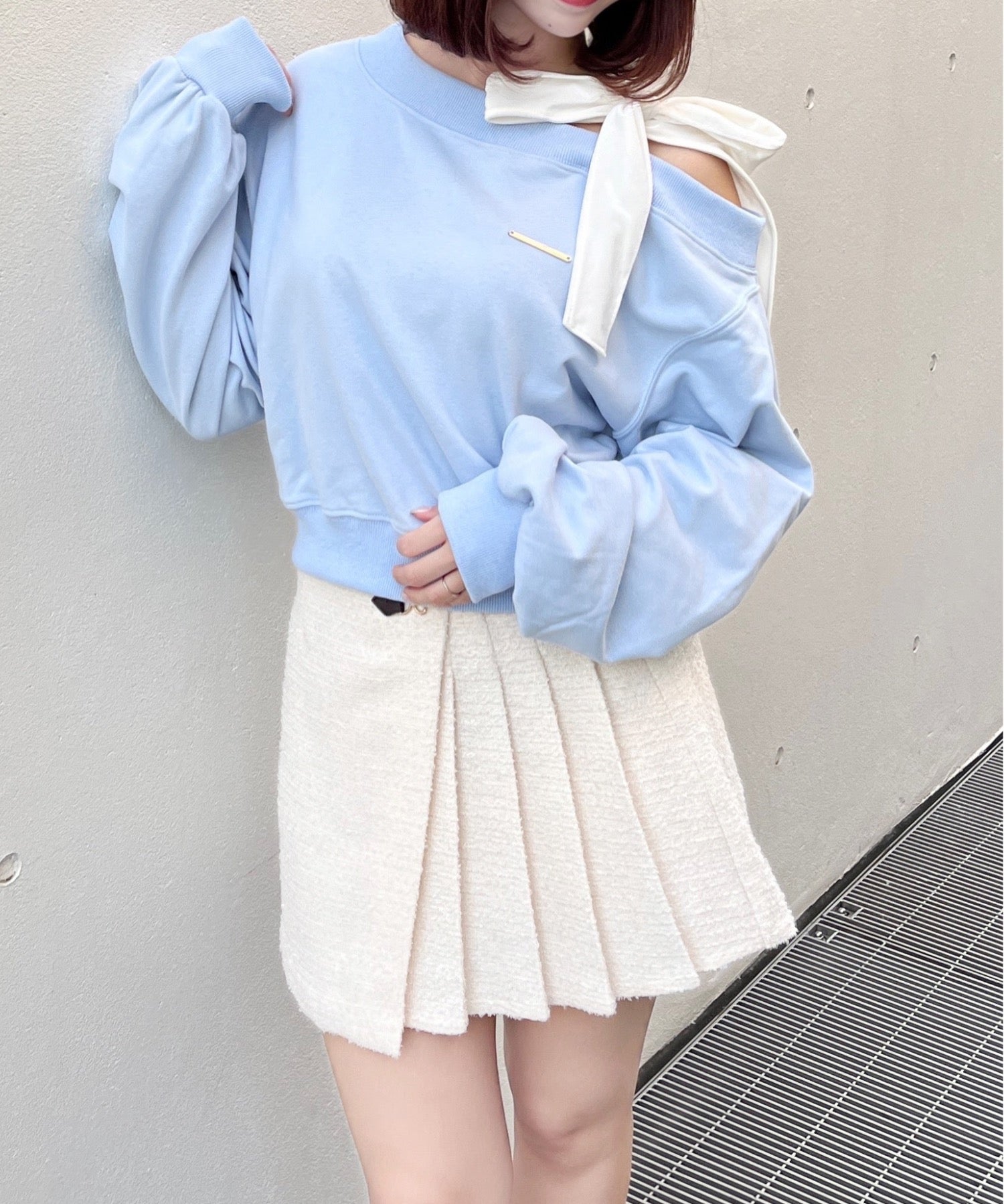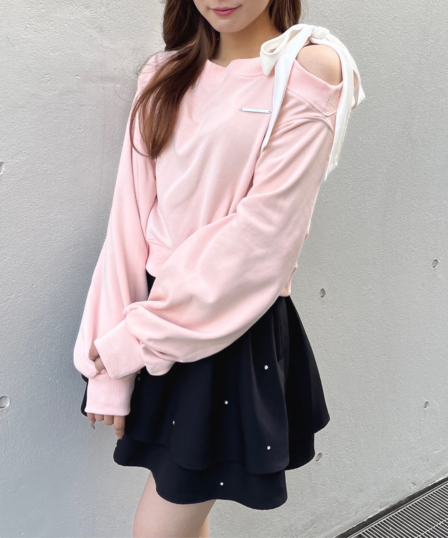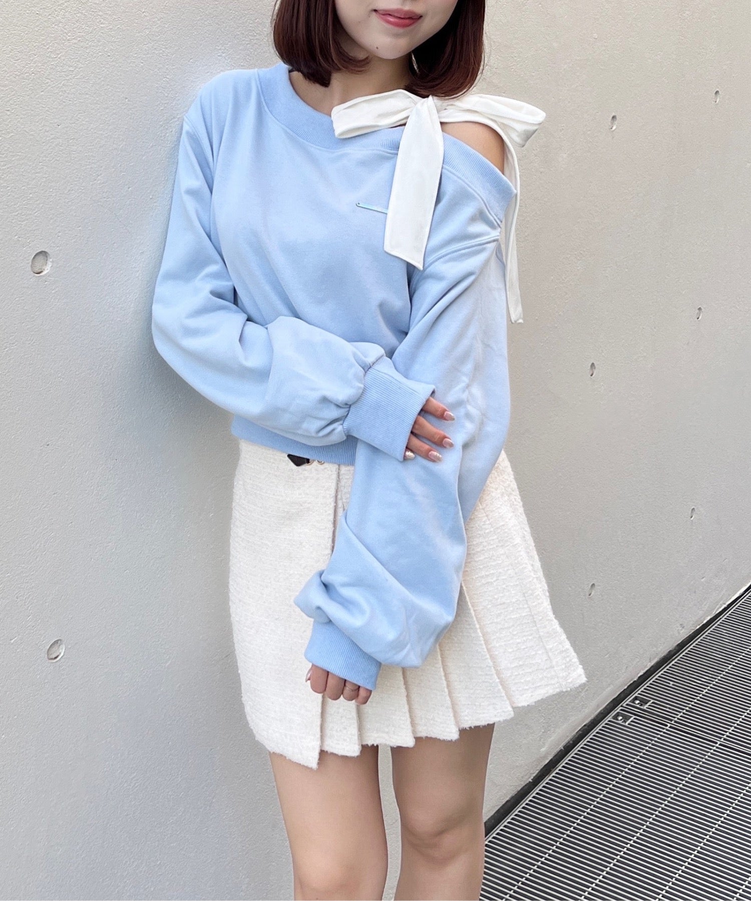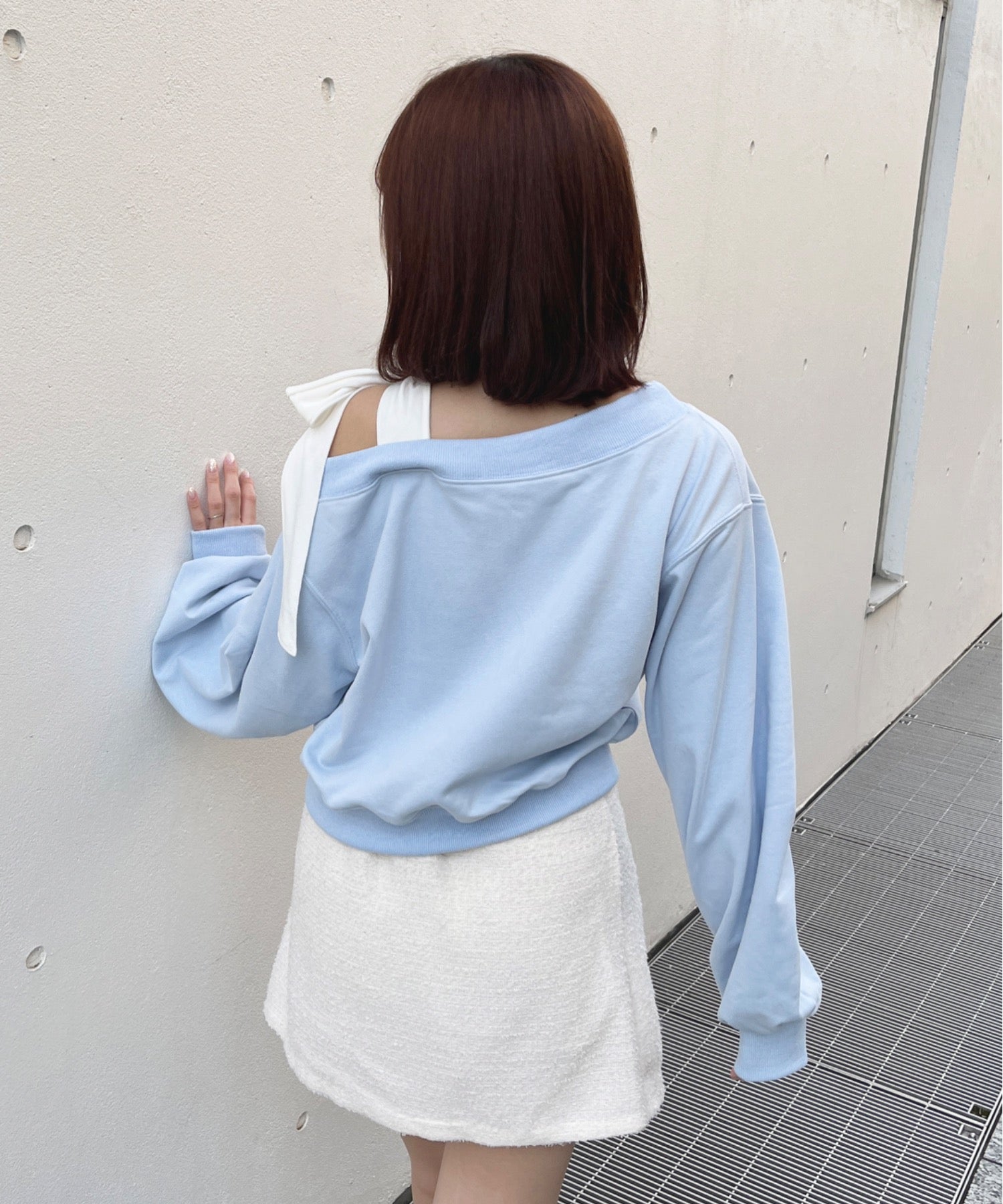 ・カジュアルなトレーナーもワンショルとリボンで一気に女性らしい印象に♡