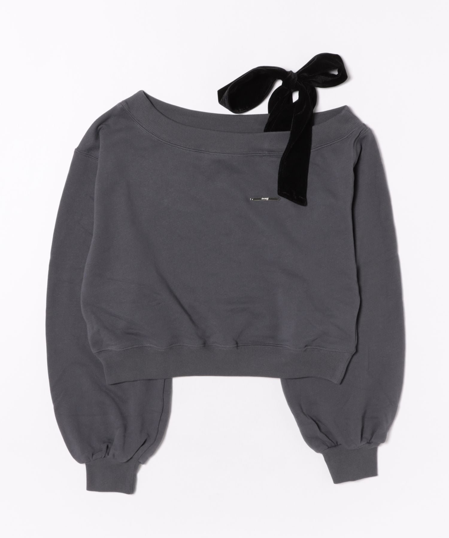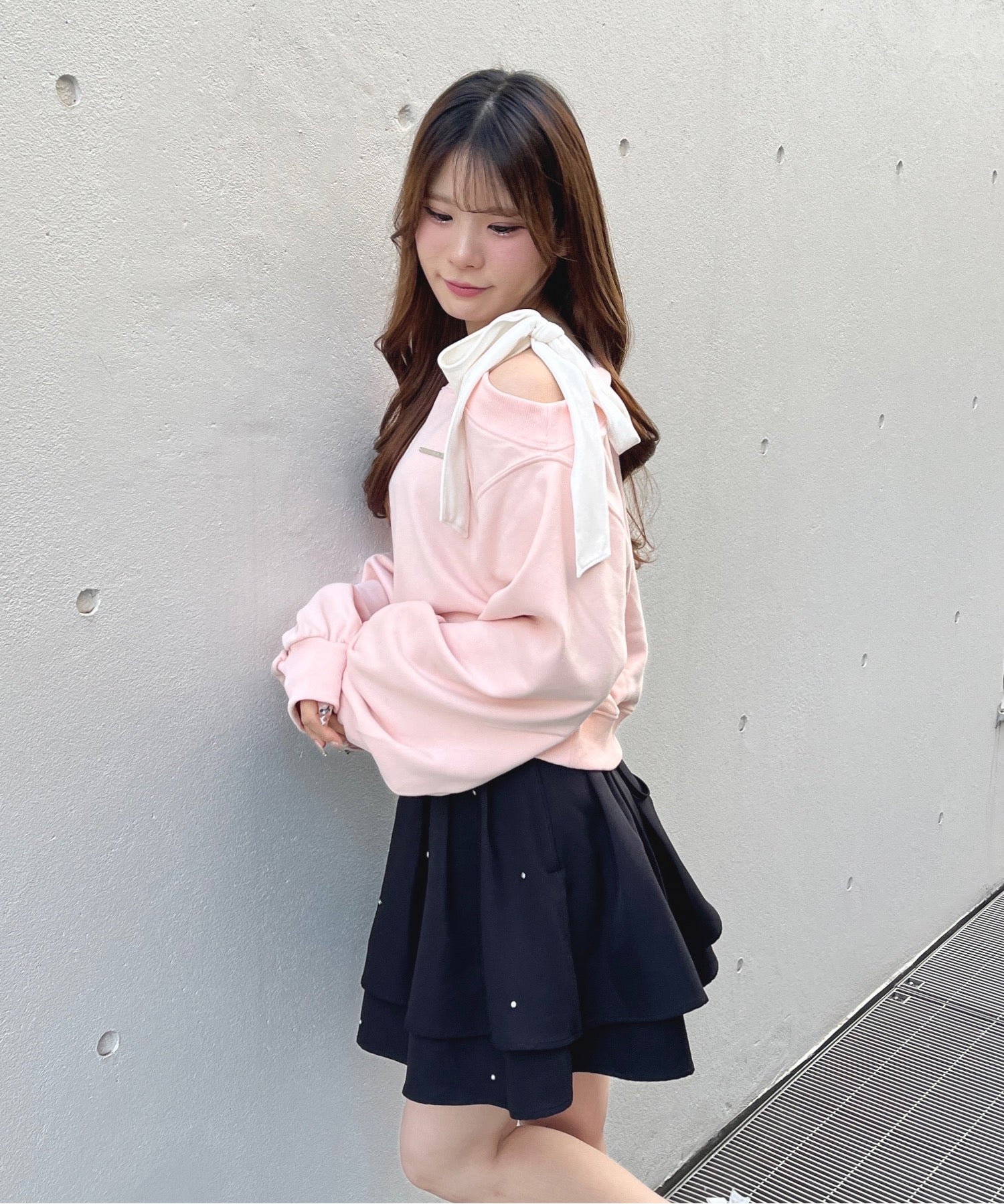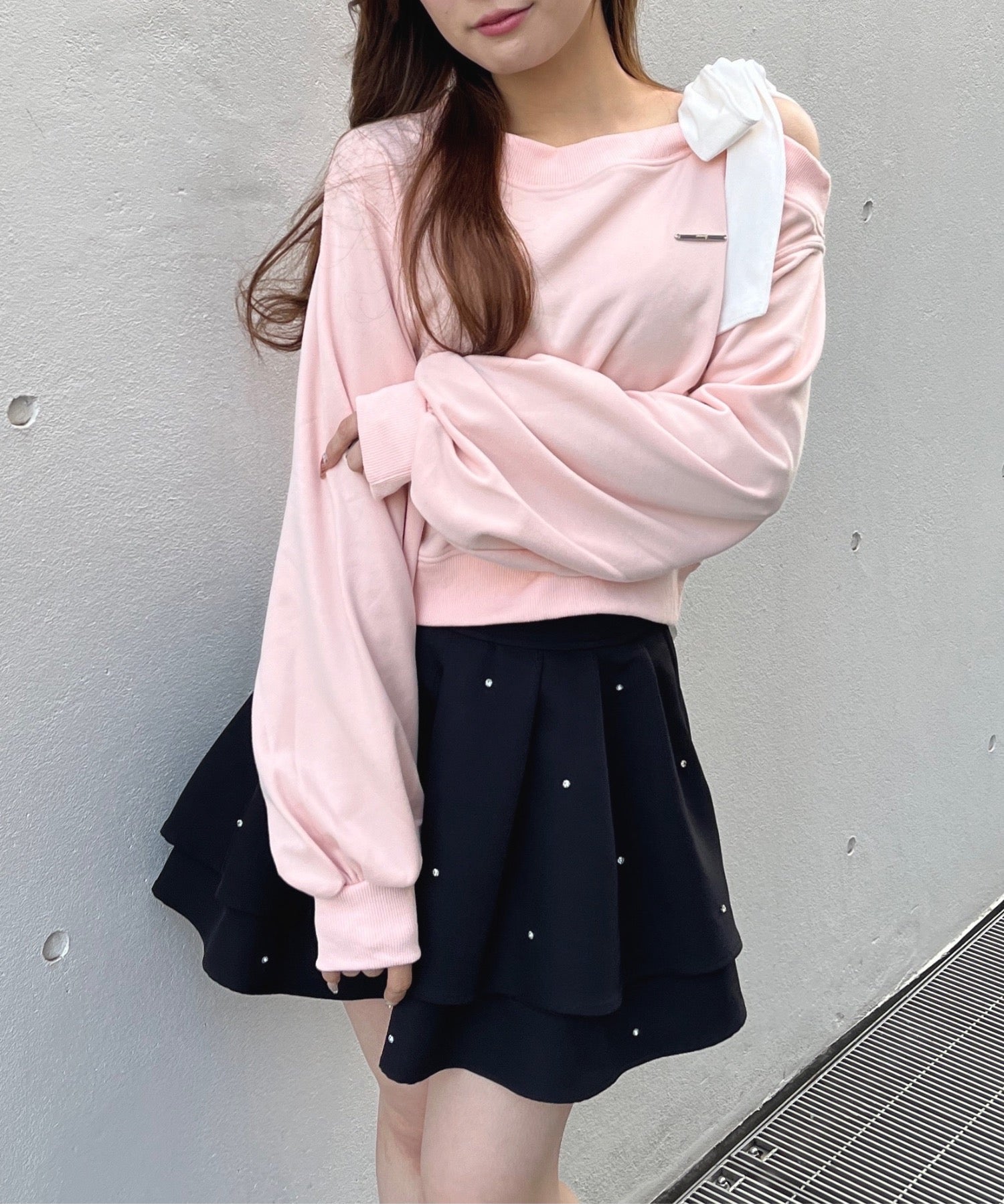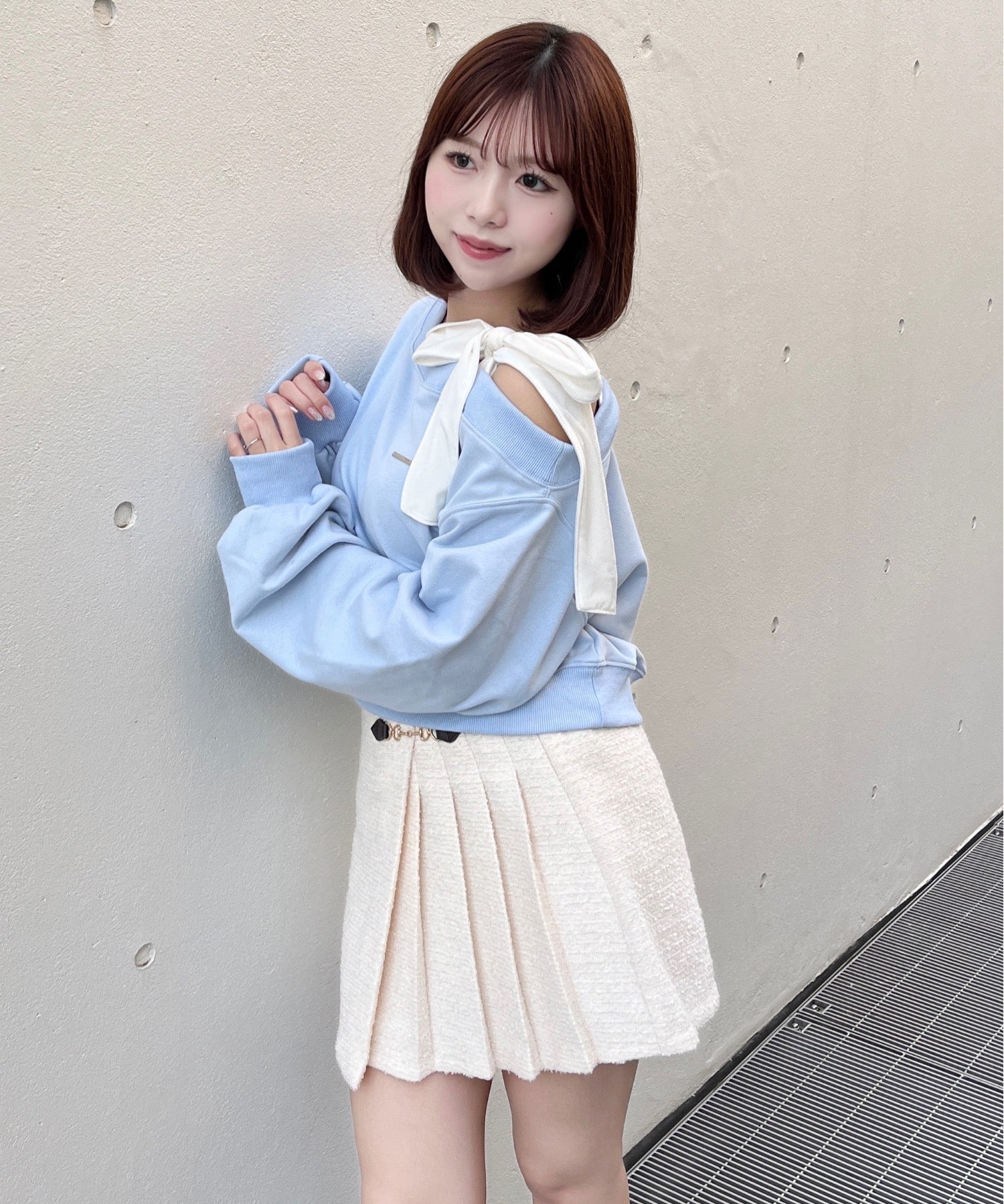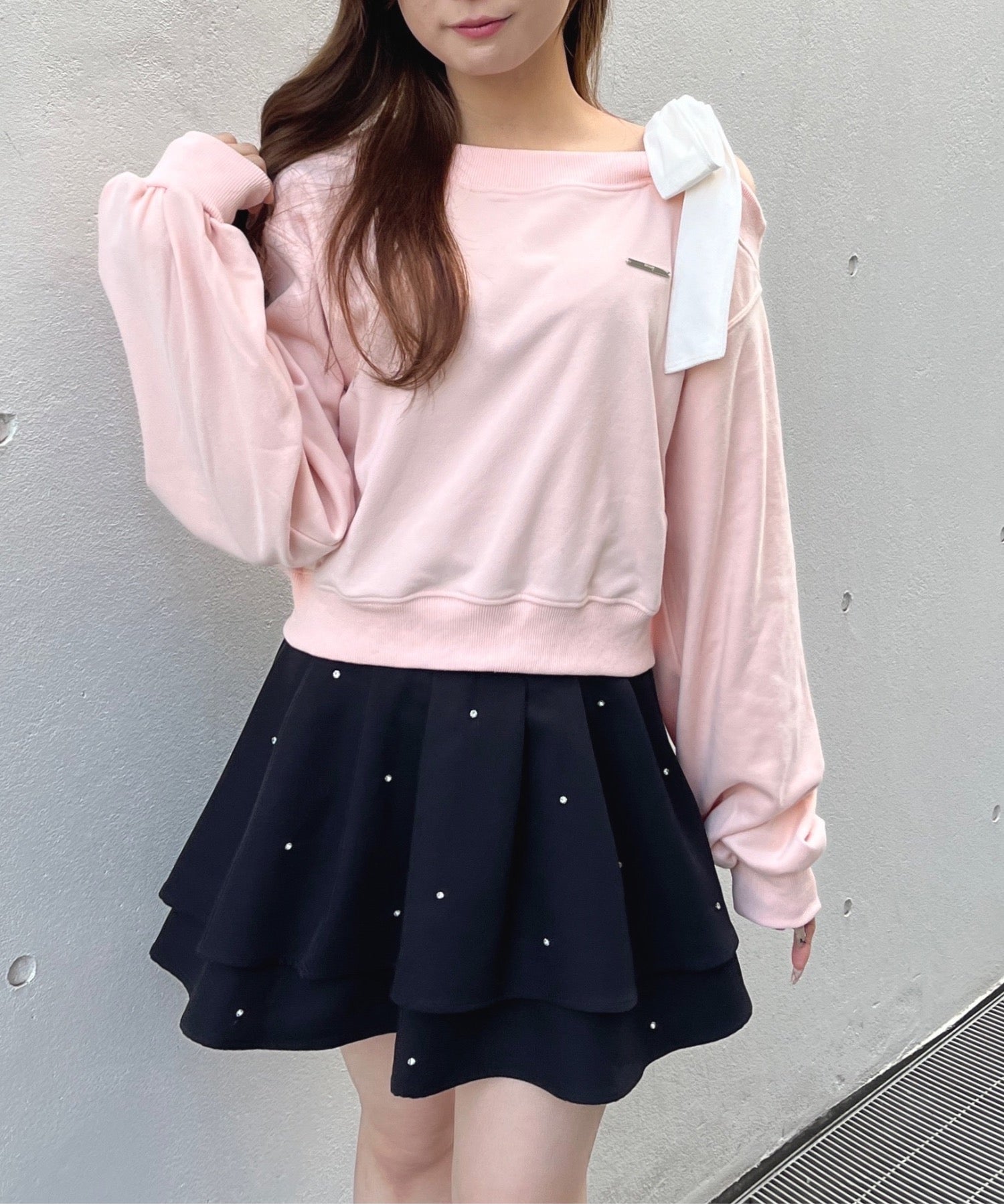 ・カジュアルなトレーナーもワンショルとリボンで一気に女性らしい印象に♡