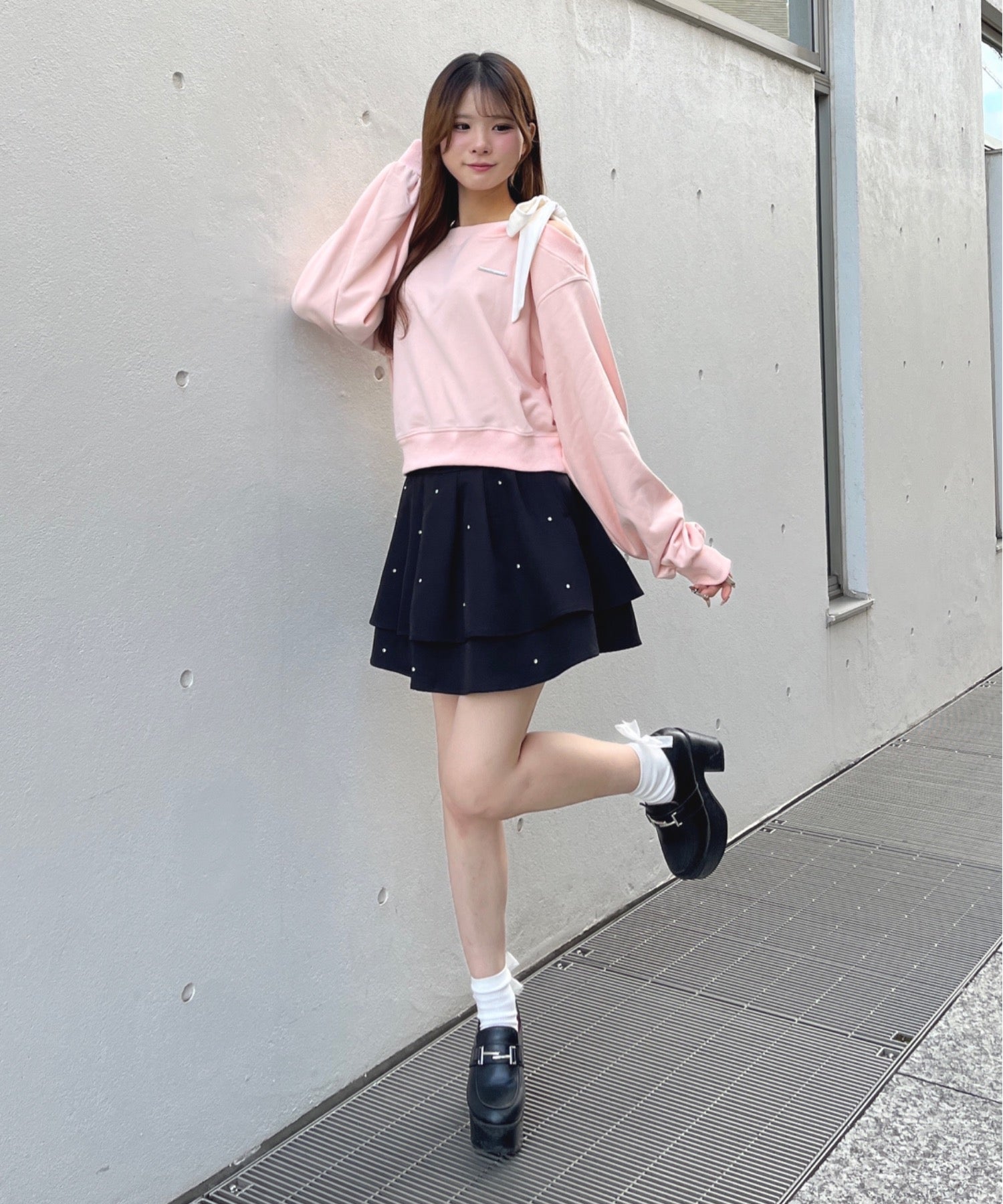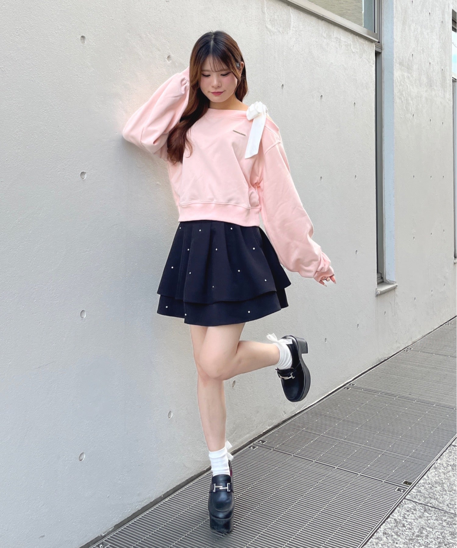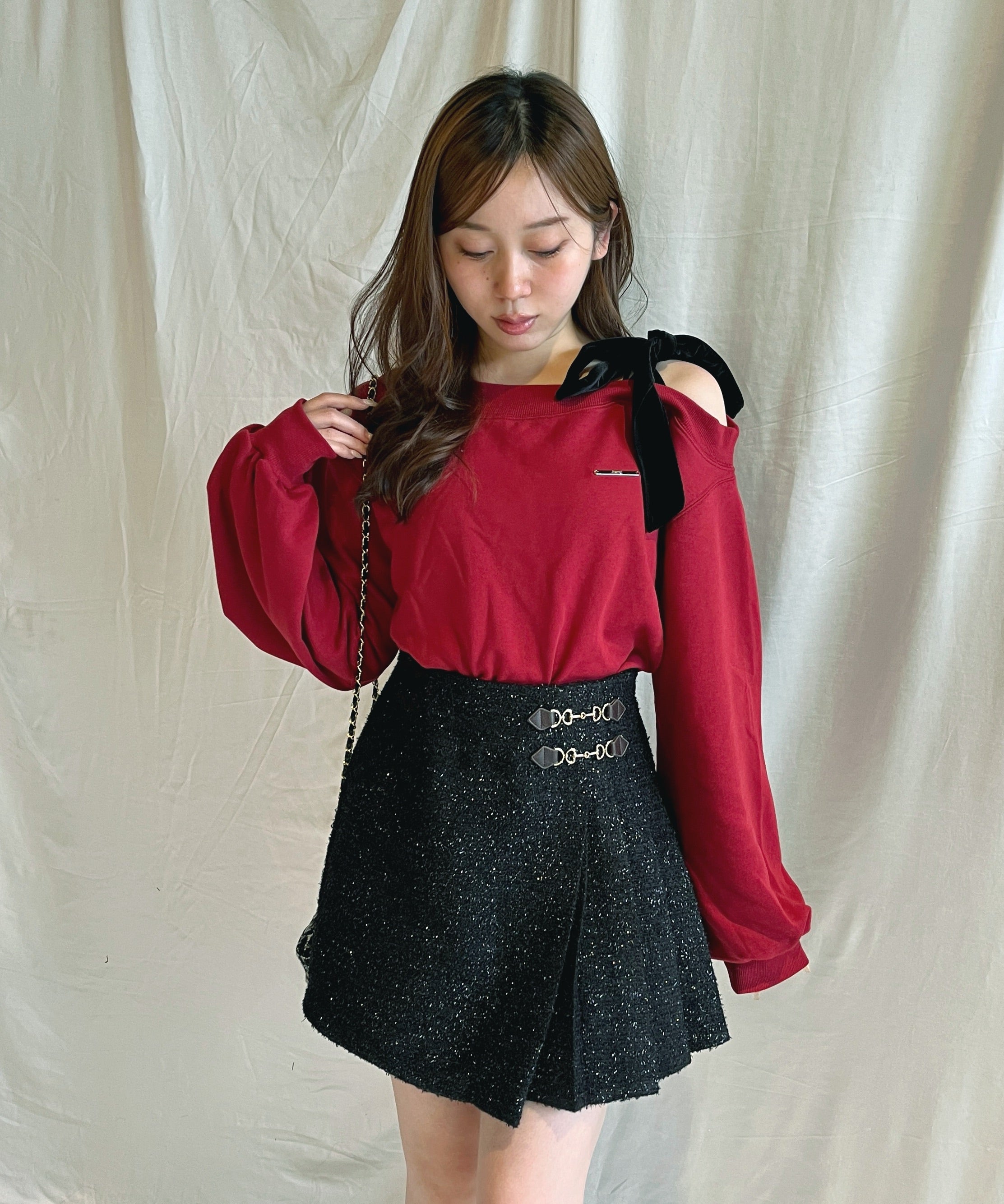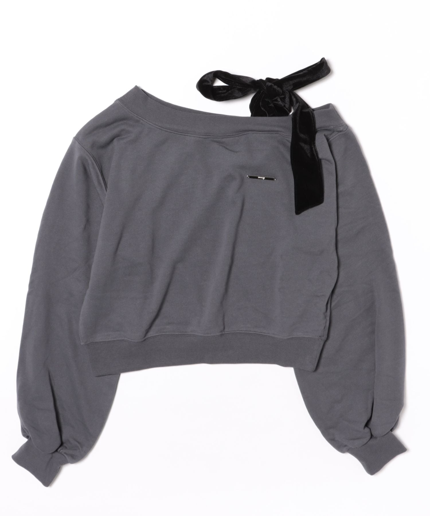 ・カジュアルなトレーナーもワンショルとリボンで一気に女性らしい印象に♡