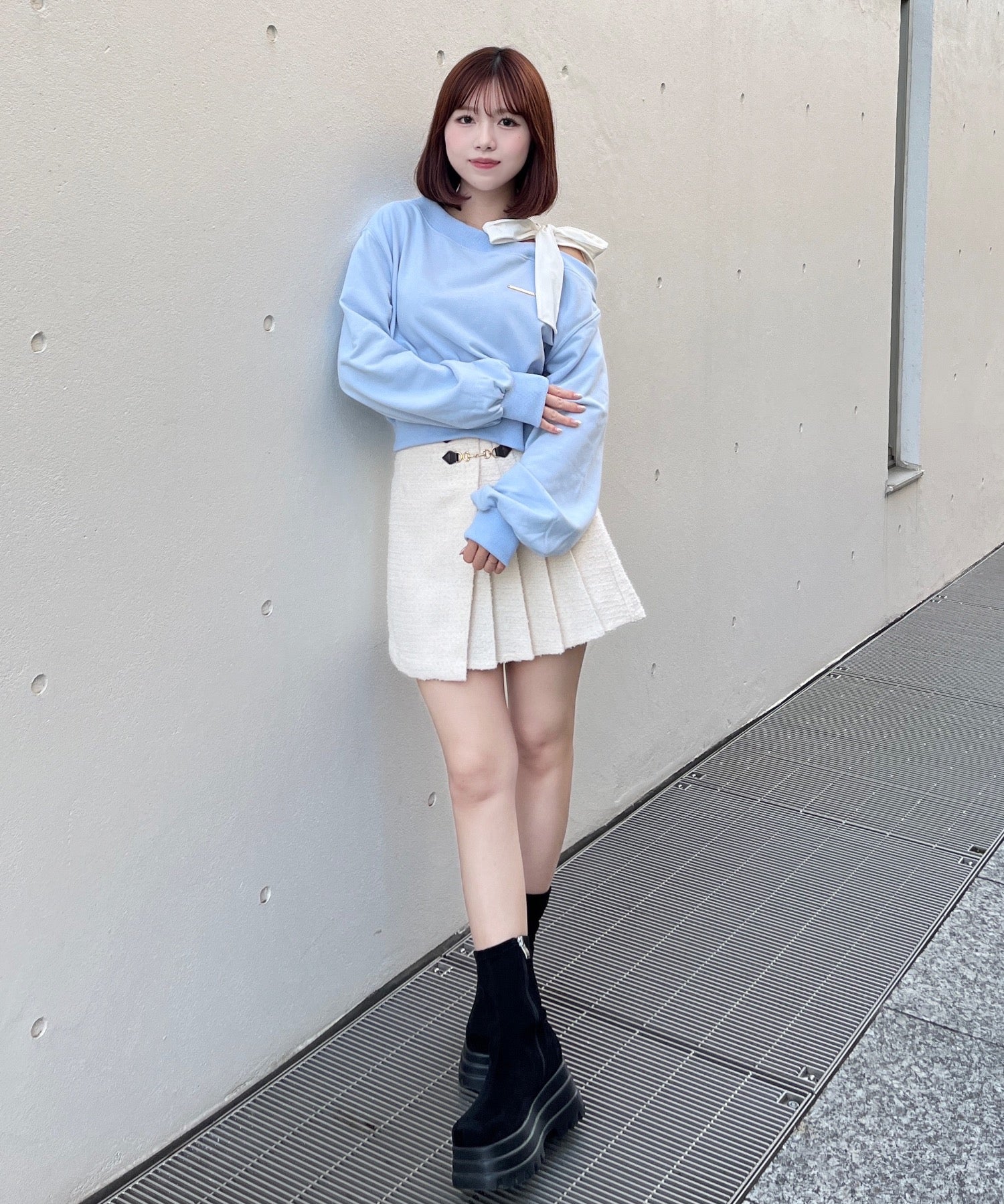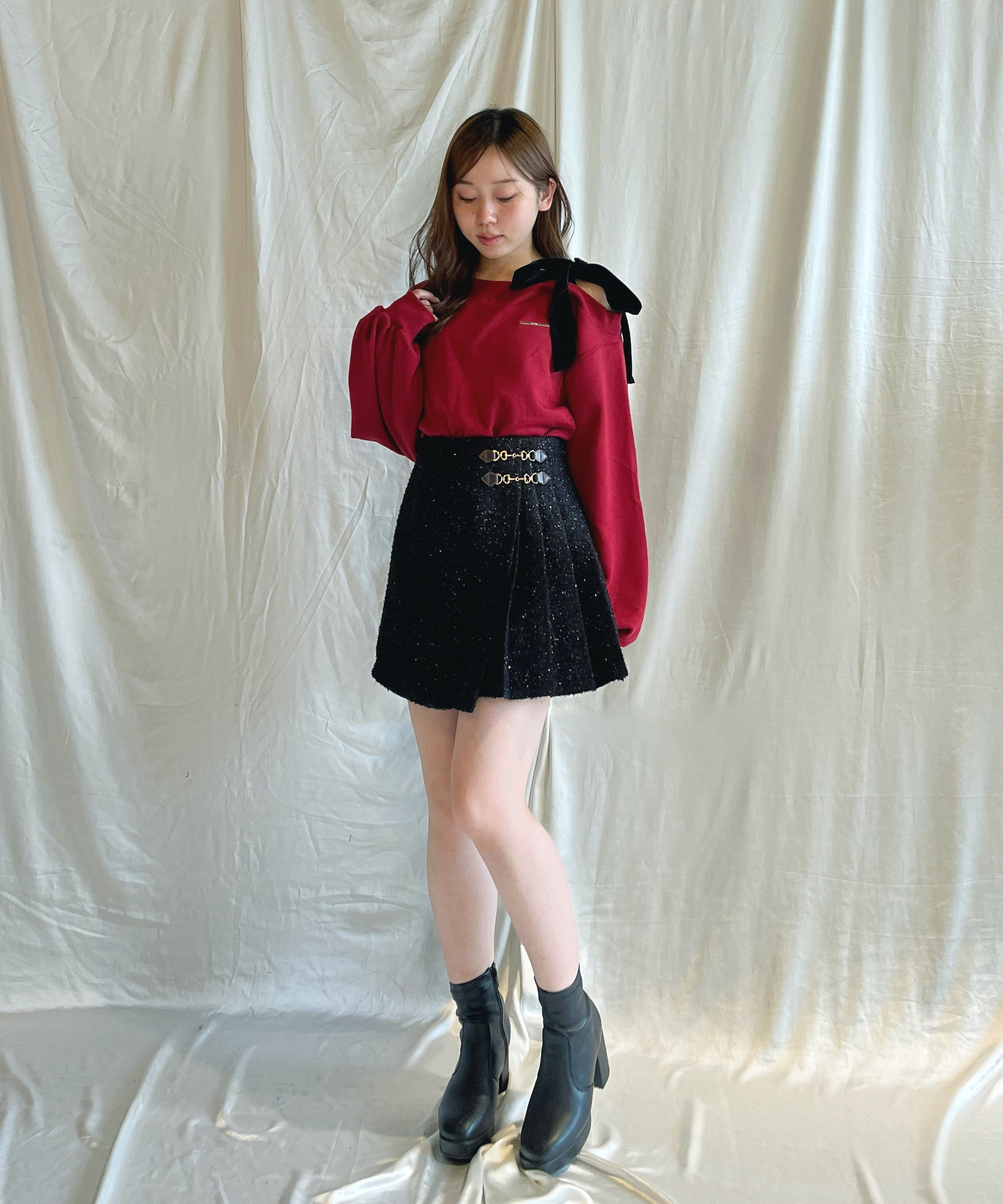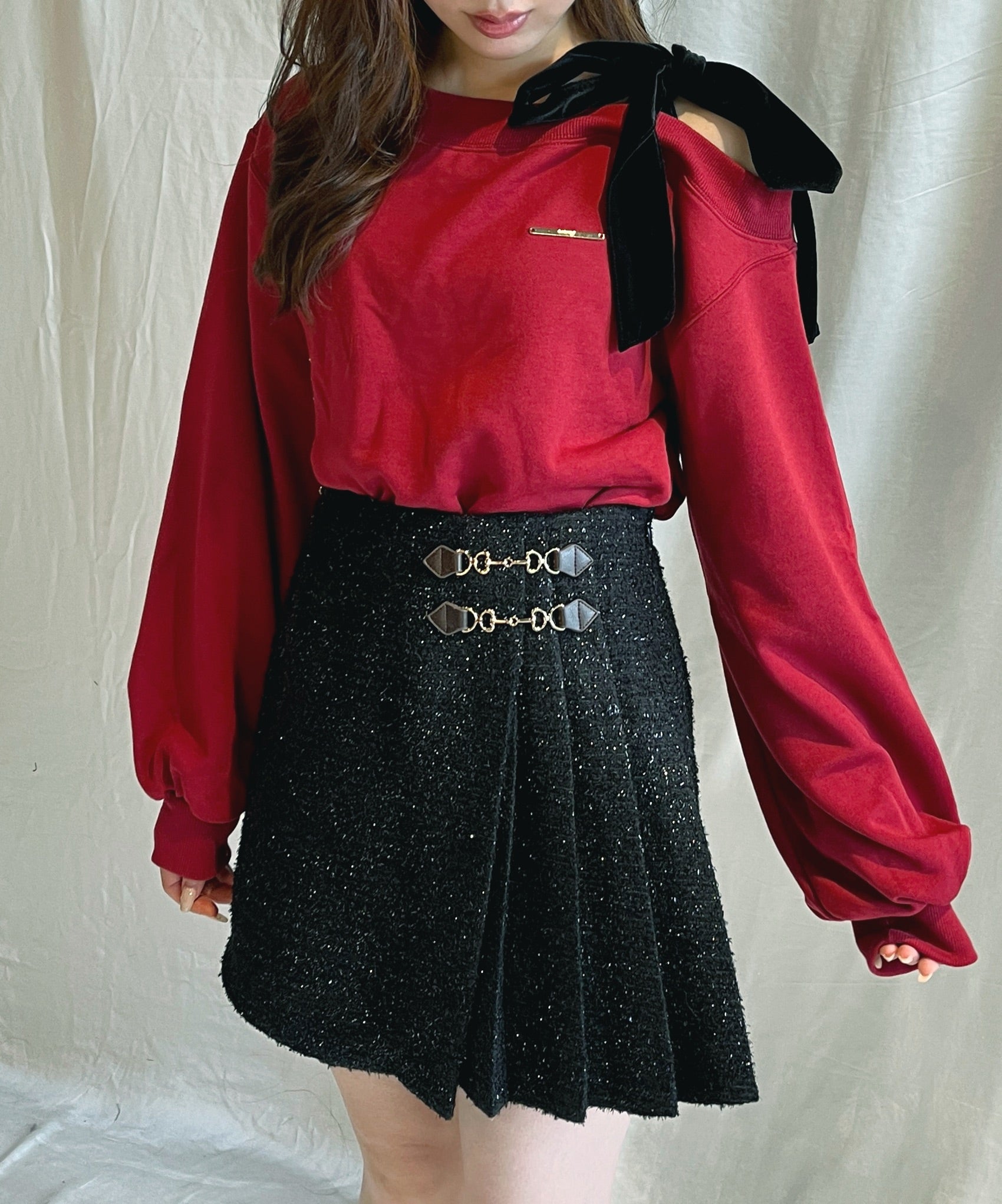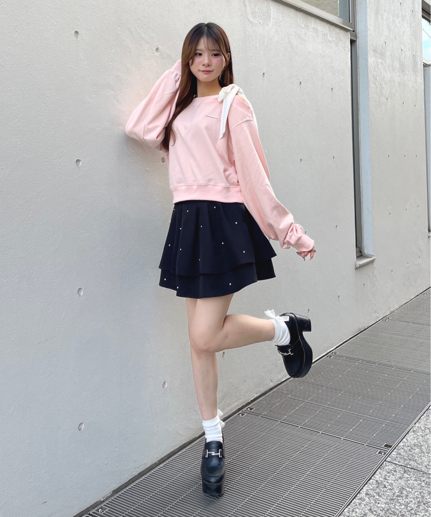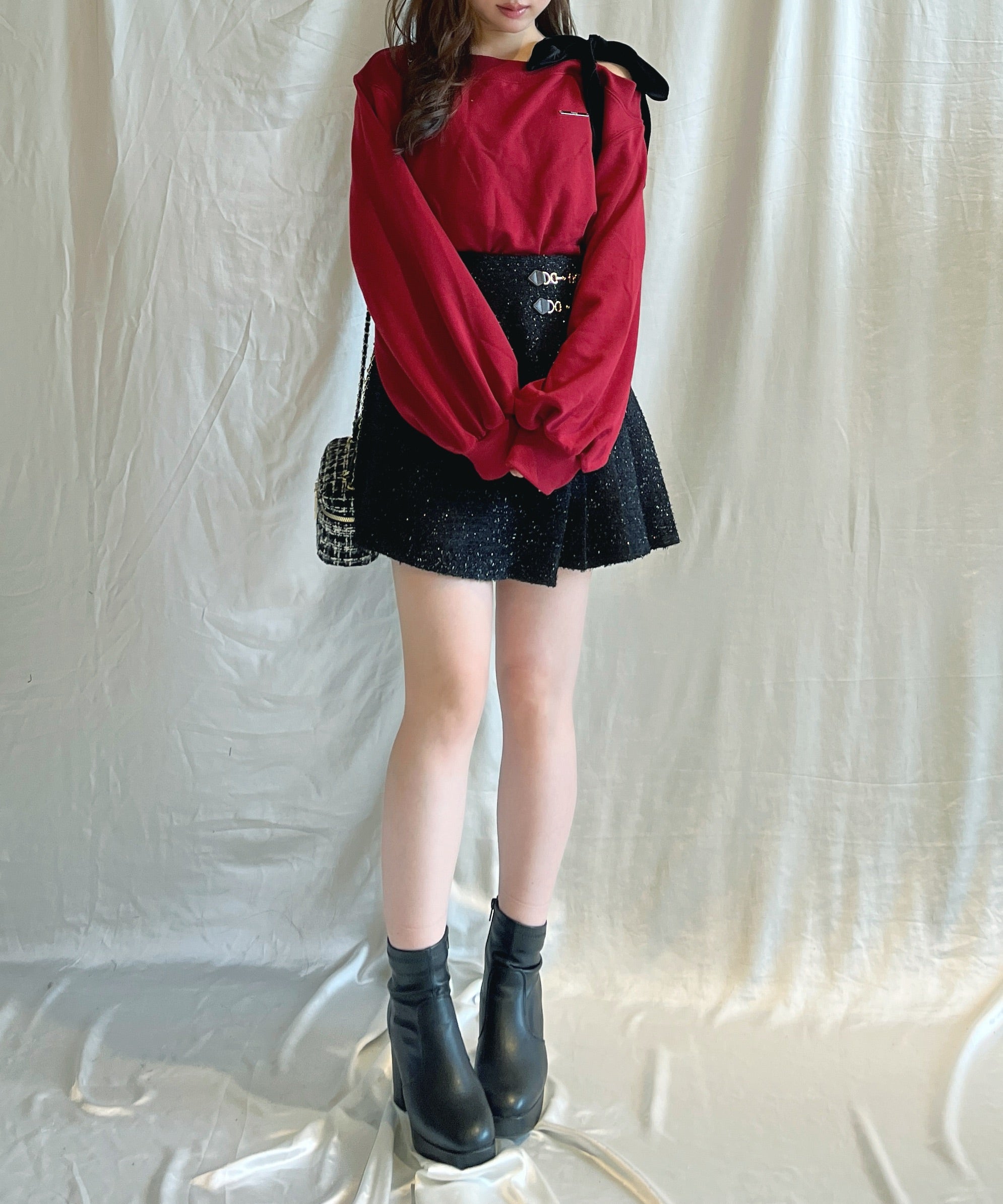 ・カジュアルなトレーナーもワンショルとリボンで一気に女性らしい印象に♡