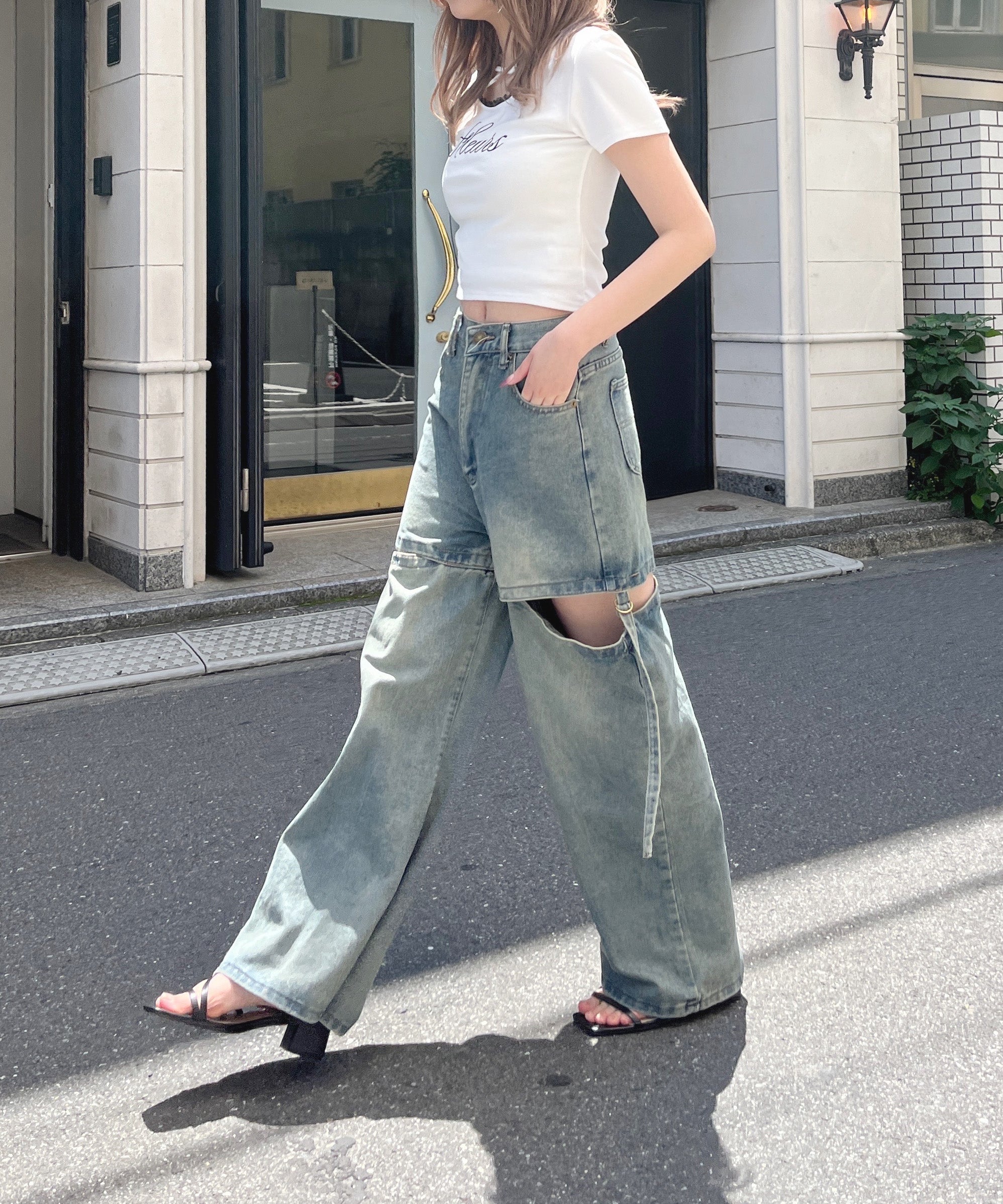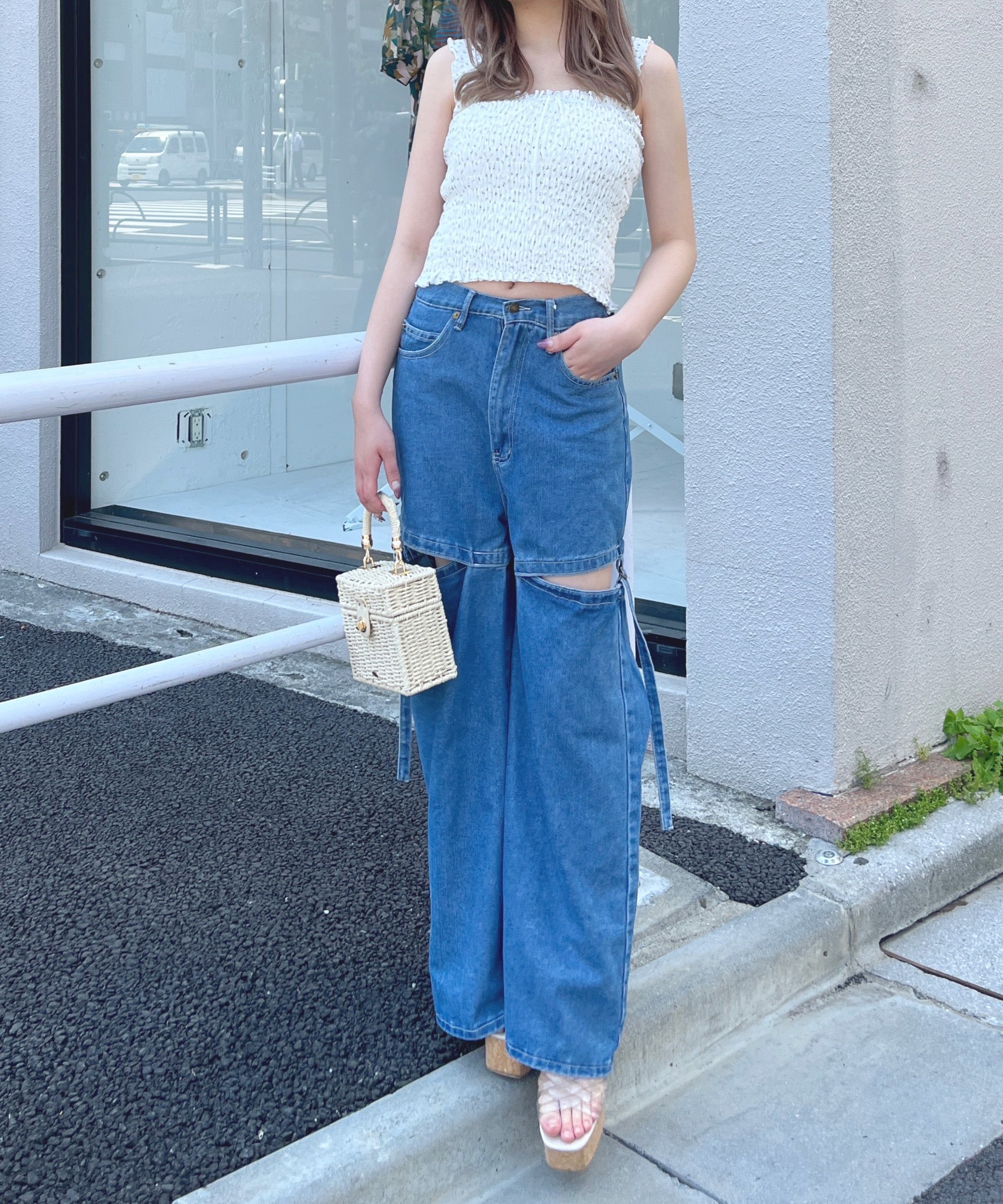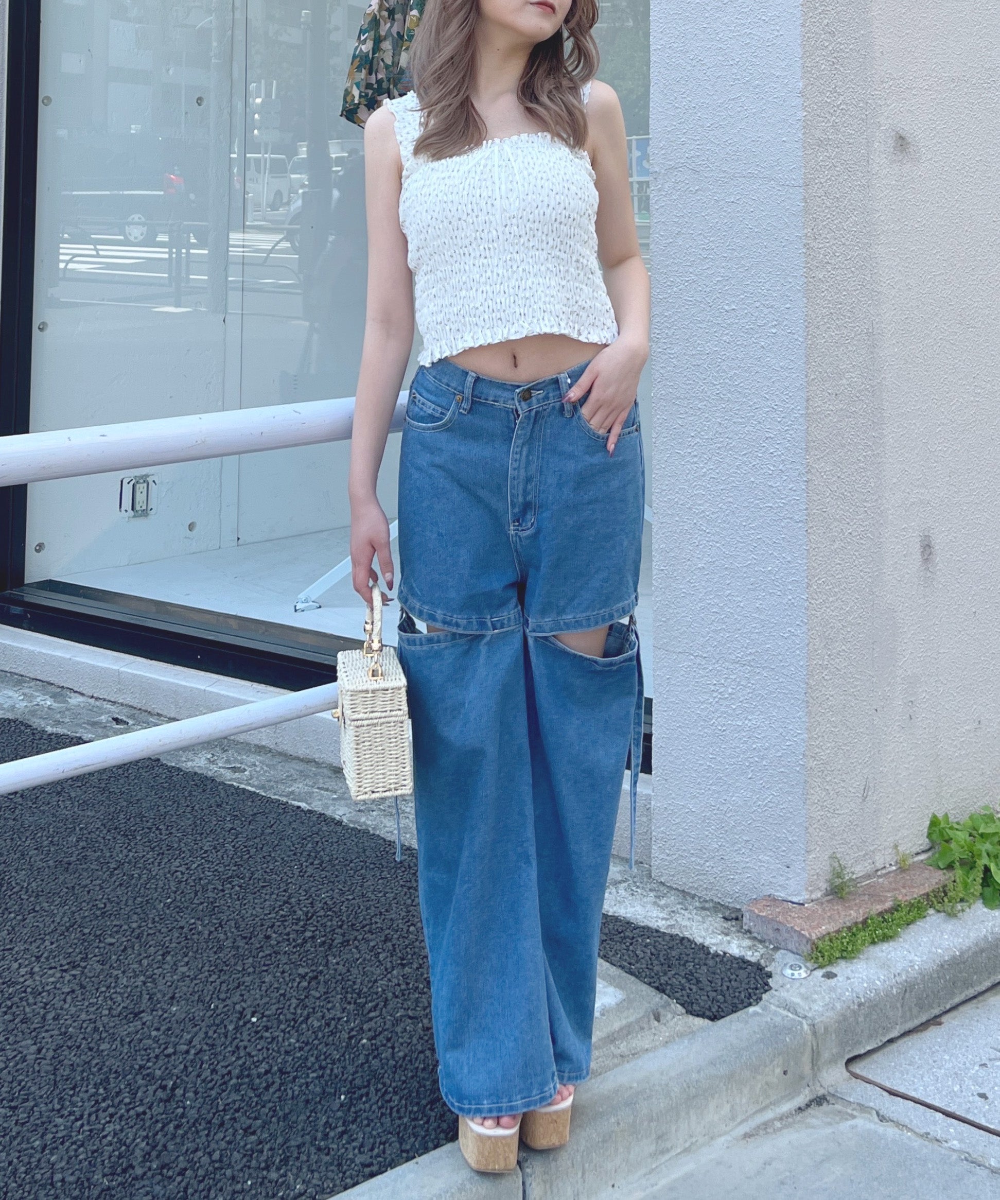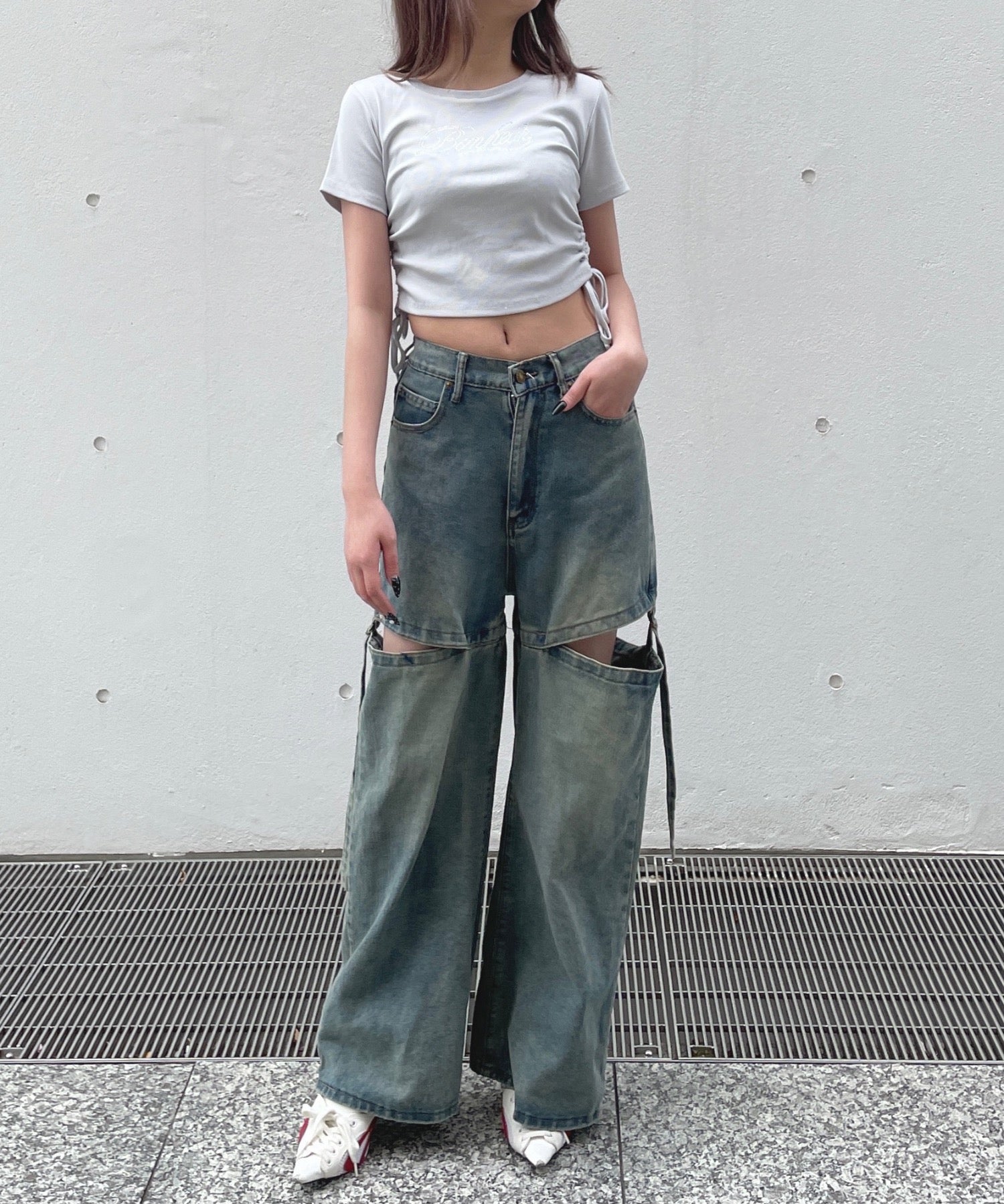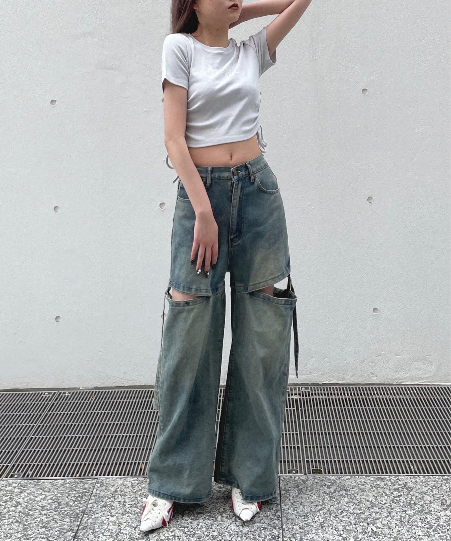 ・さりげない肌見せがさわやかなデニムワイドパンツ♡
