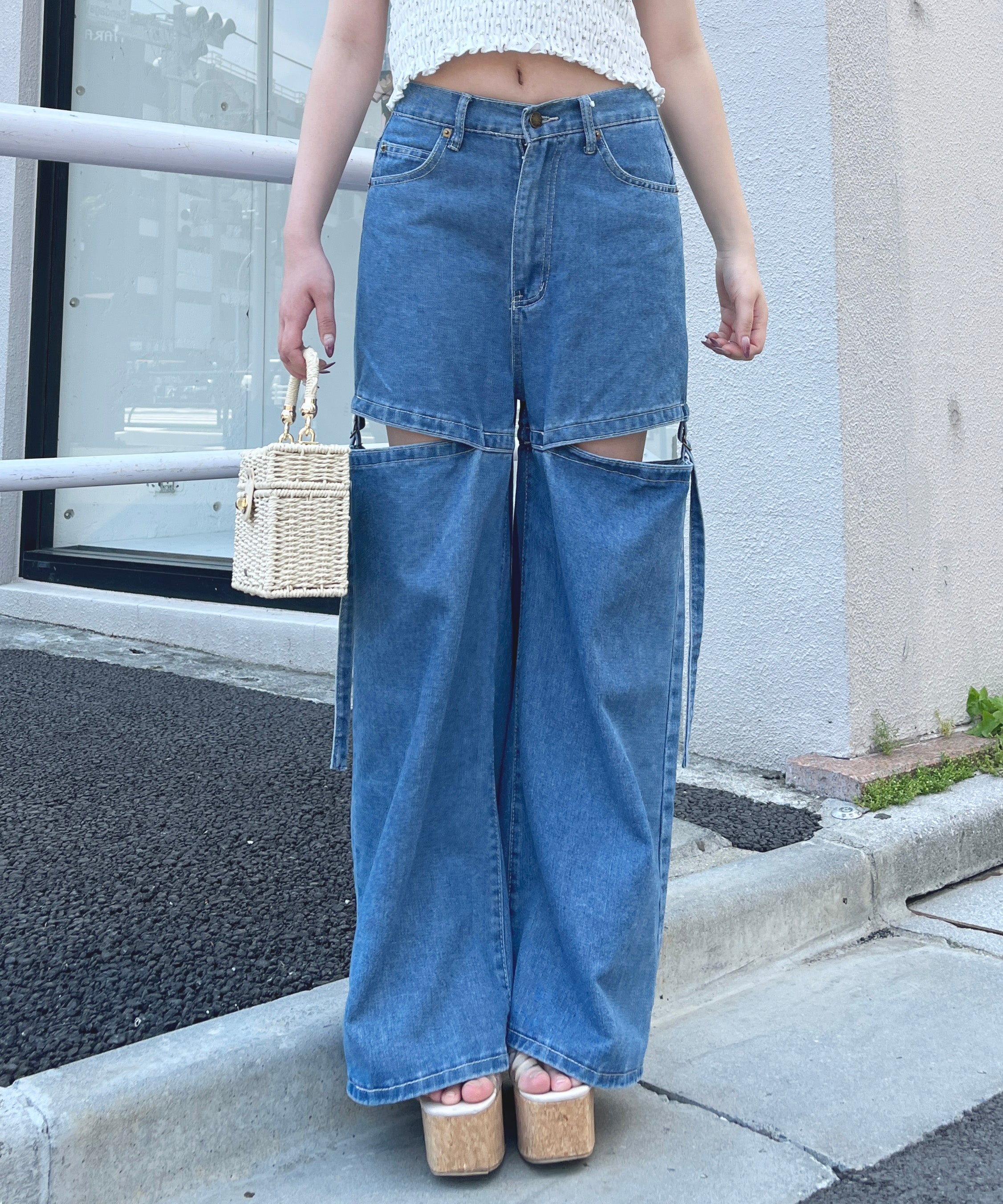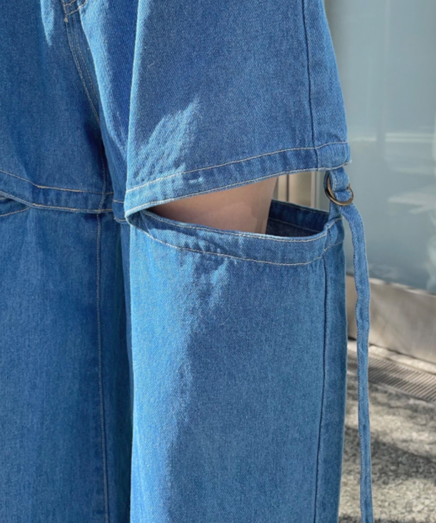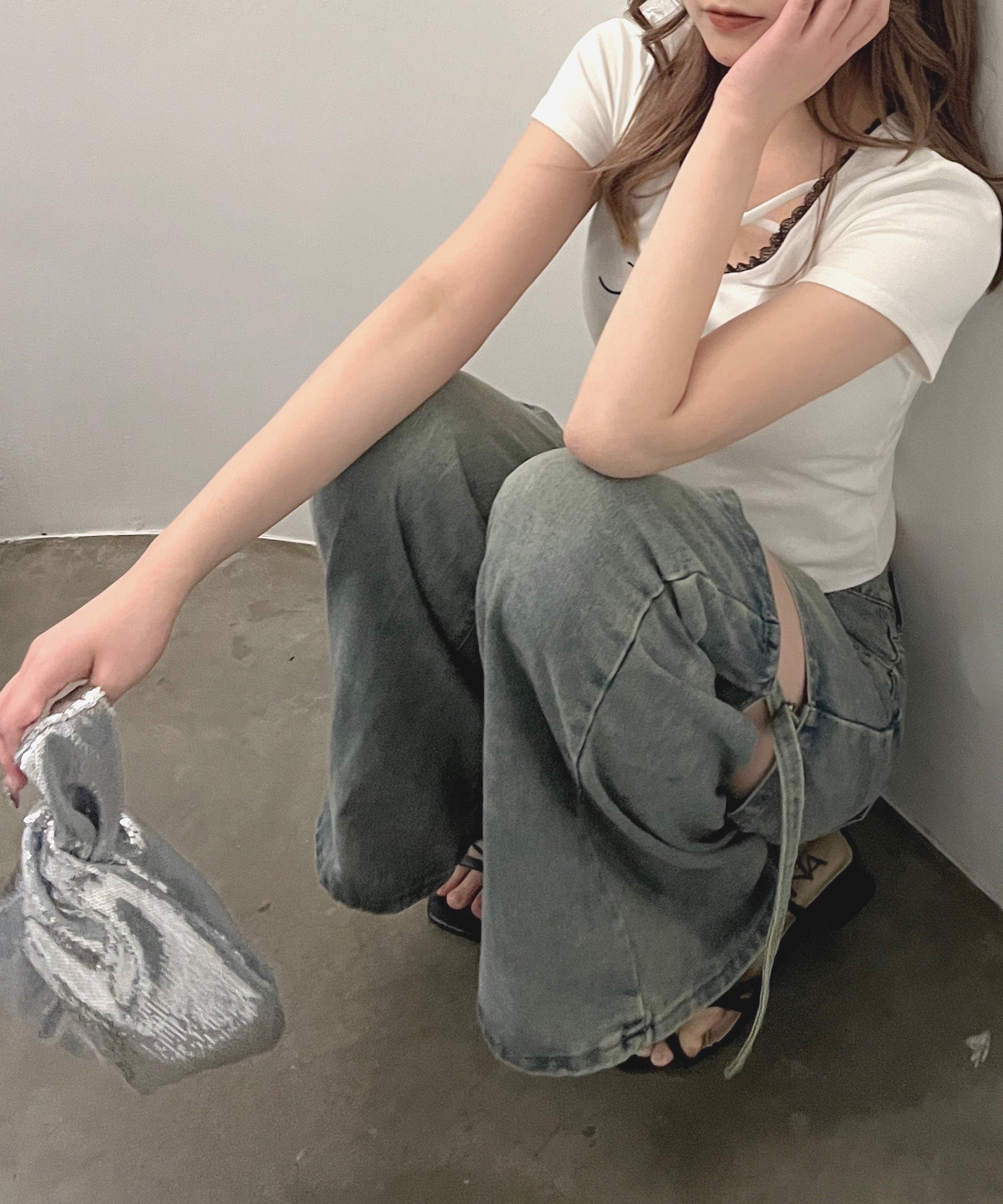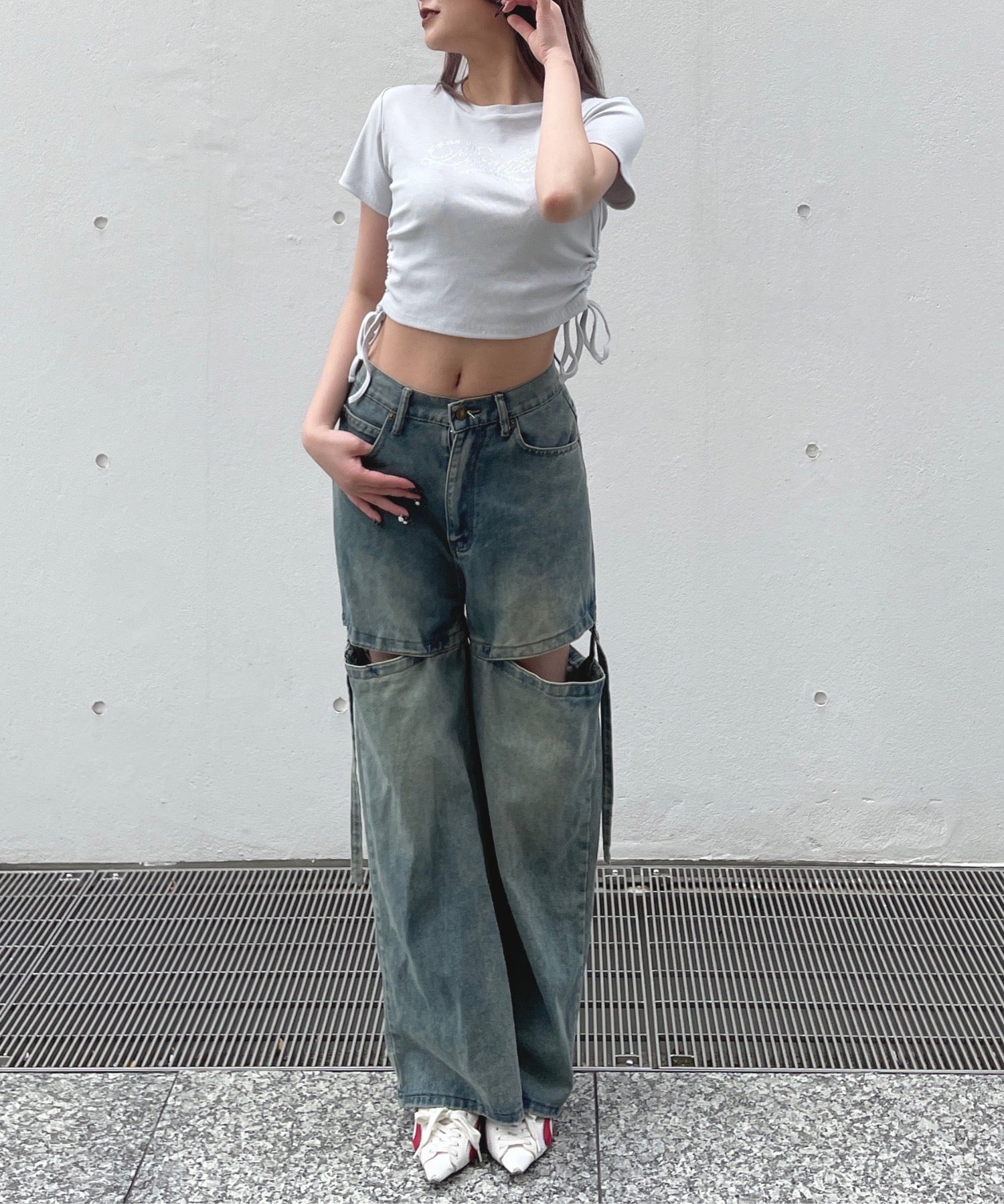 ・さりげない肌見せがさわやかなデニムワイドパンツ♡