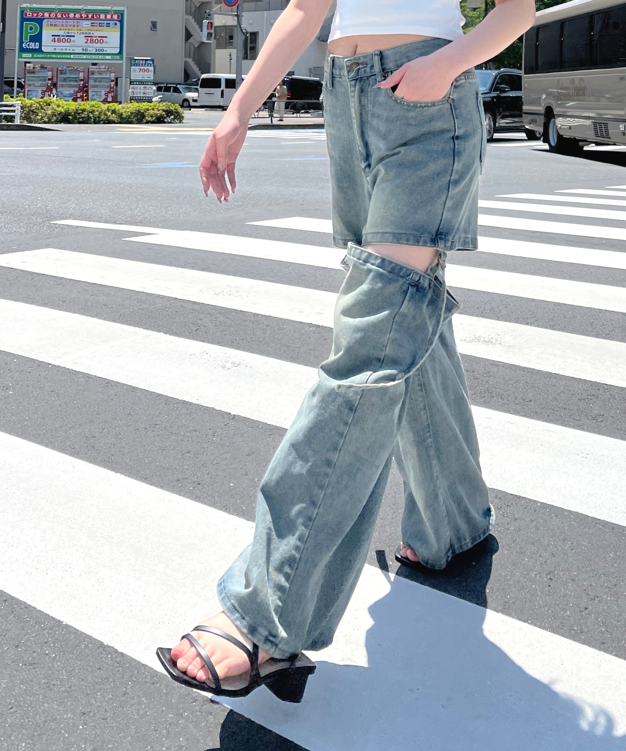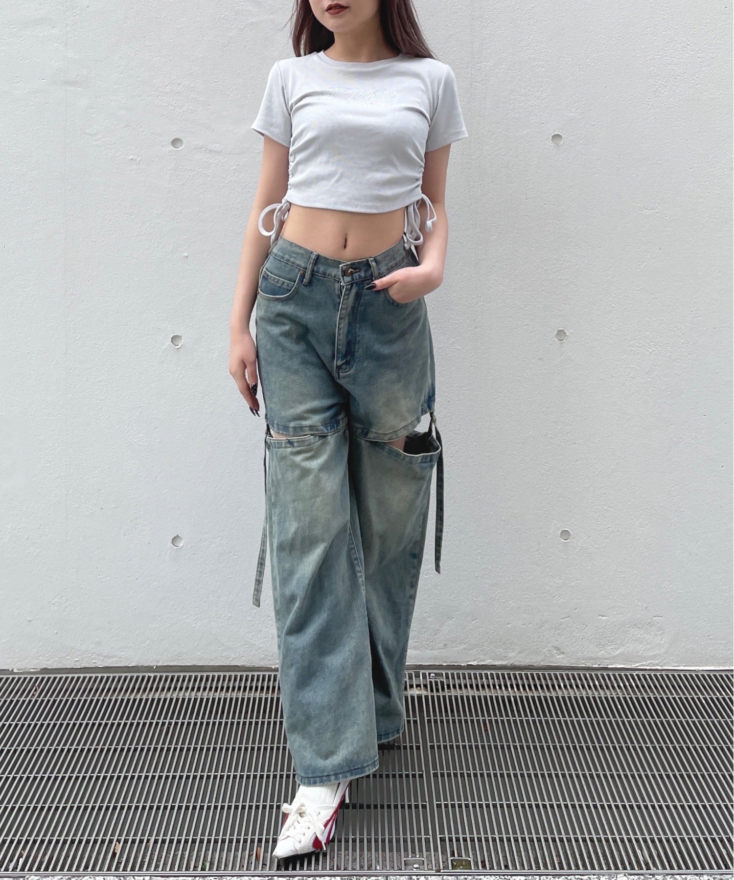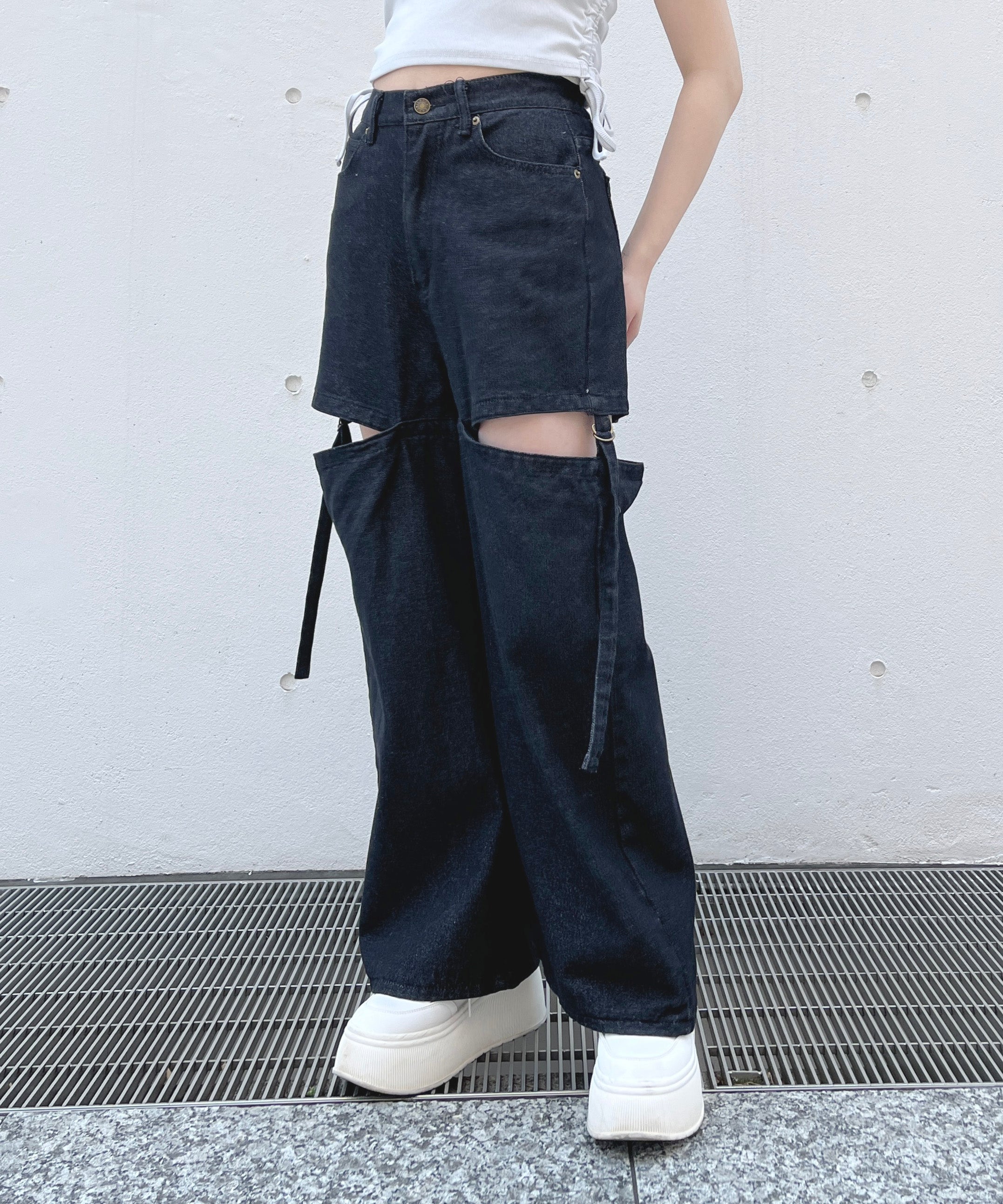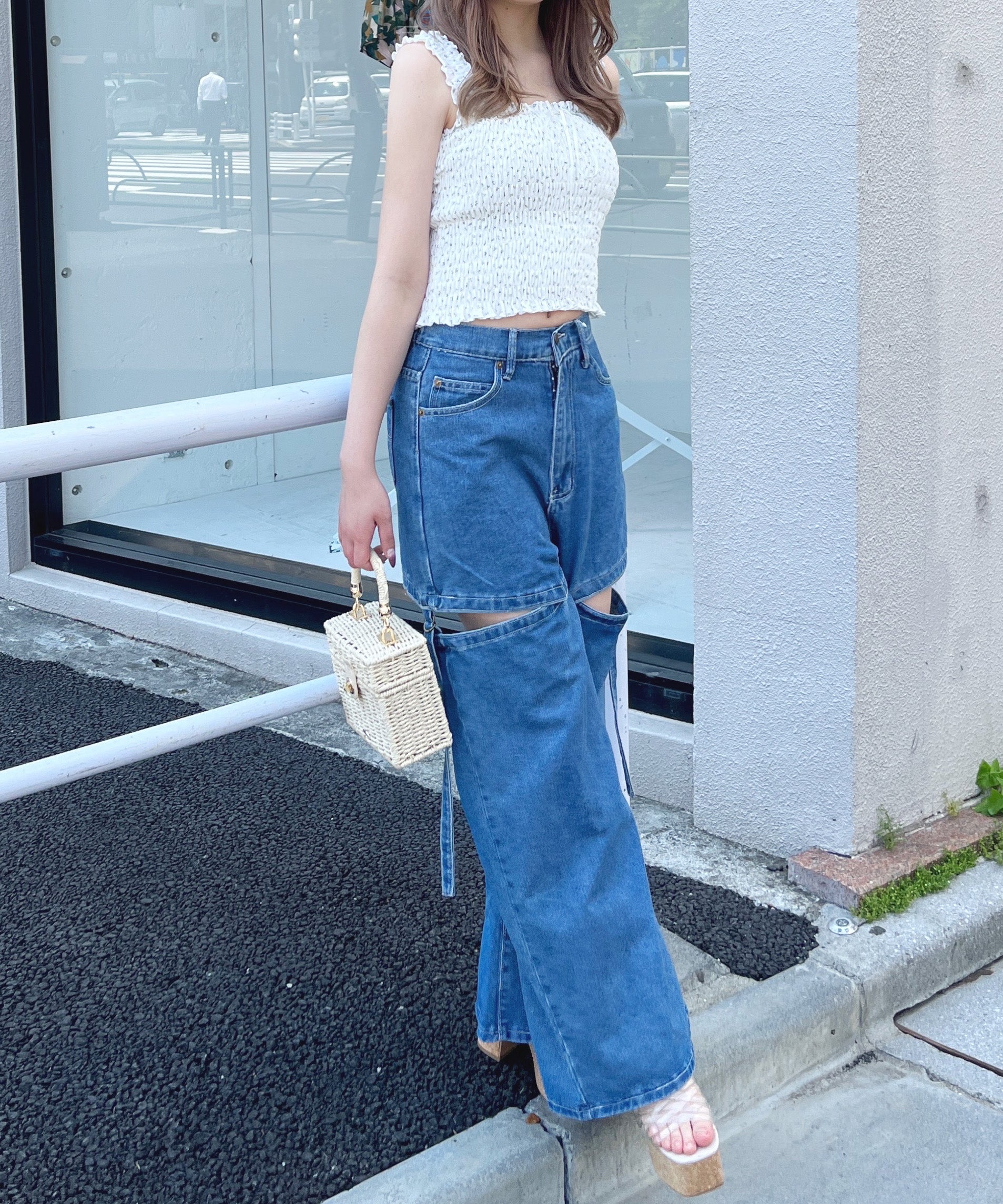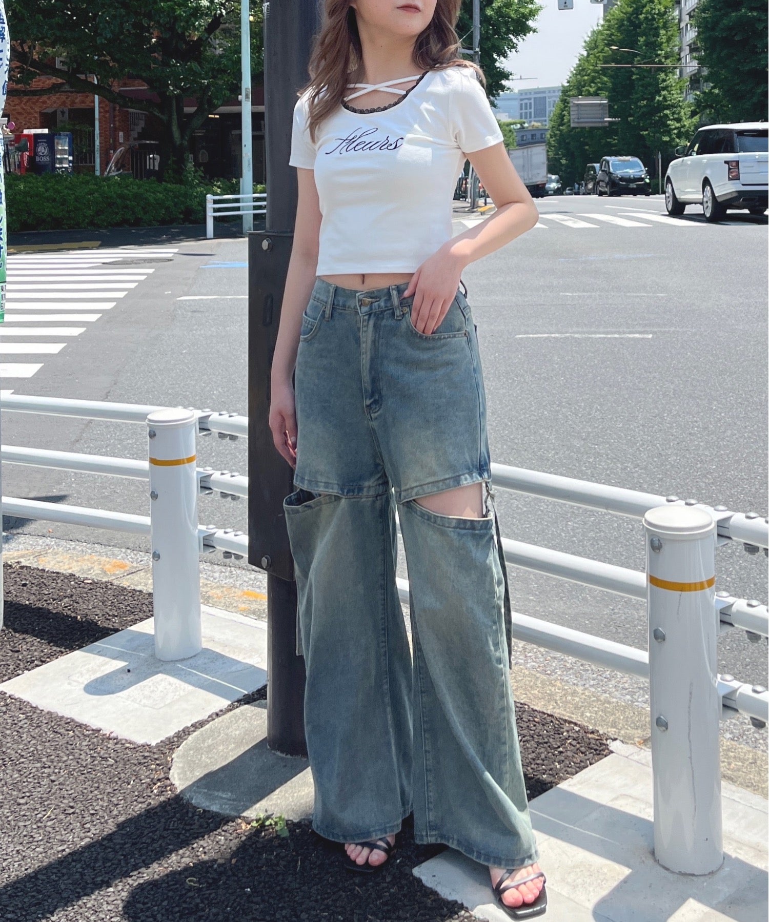 ・さりげない肌見せがさわやかなデニムワイドパンツ♡
