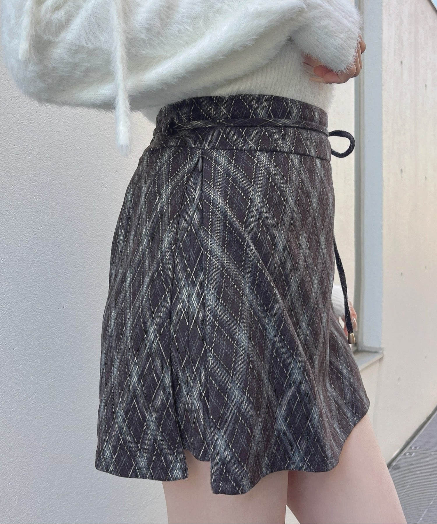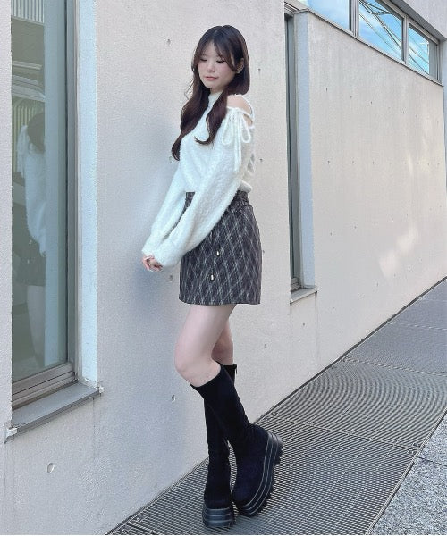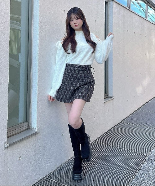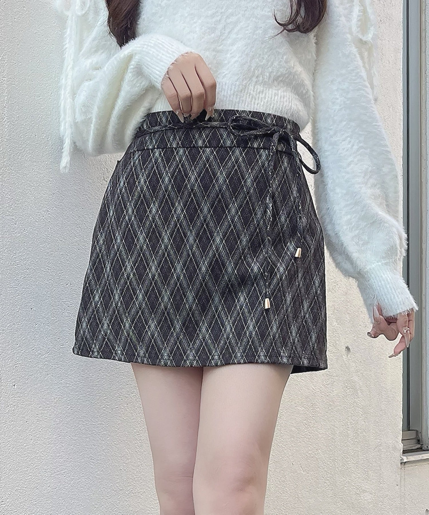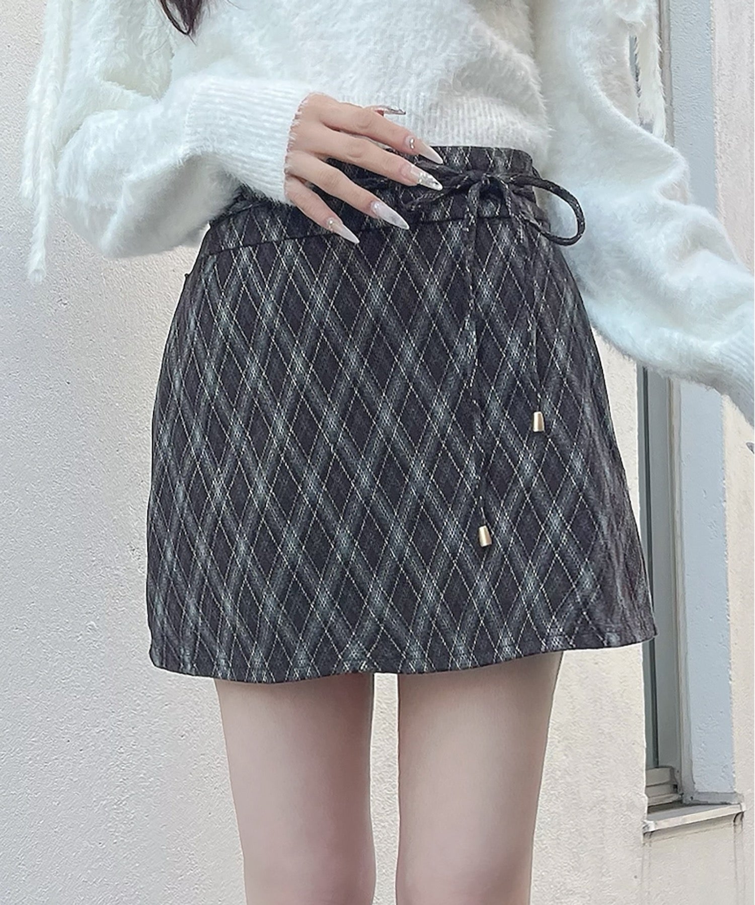 ・スカートのチェック柄が冬らしく、足元にタイツやブーツを合わせるのがおすすめ◎