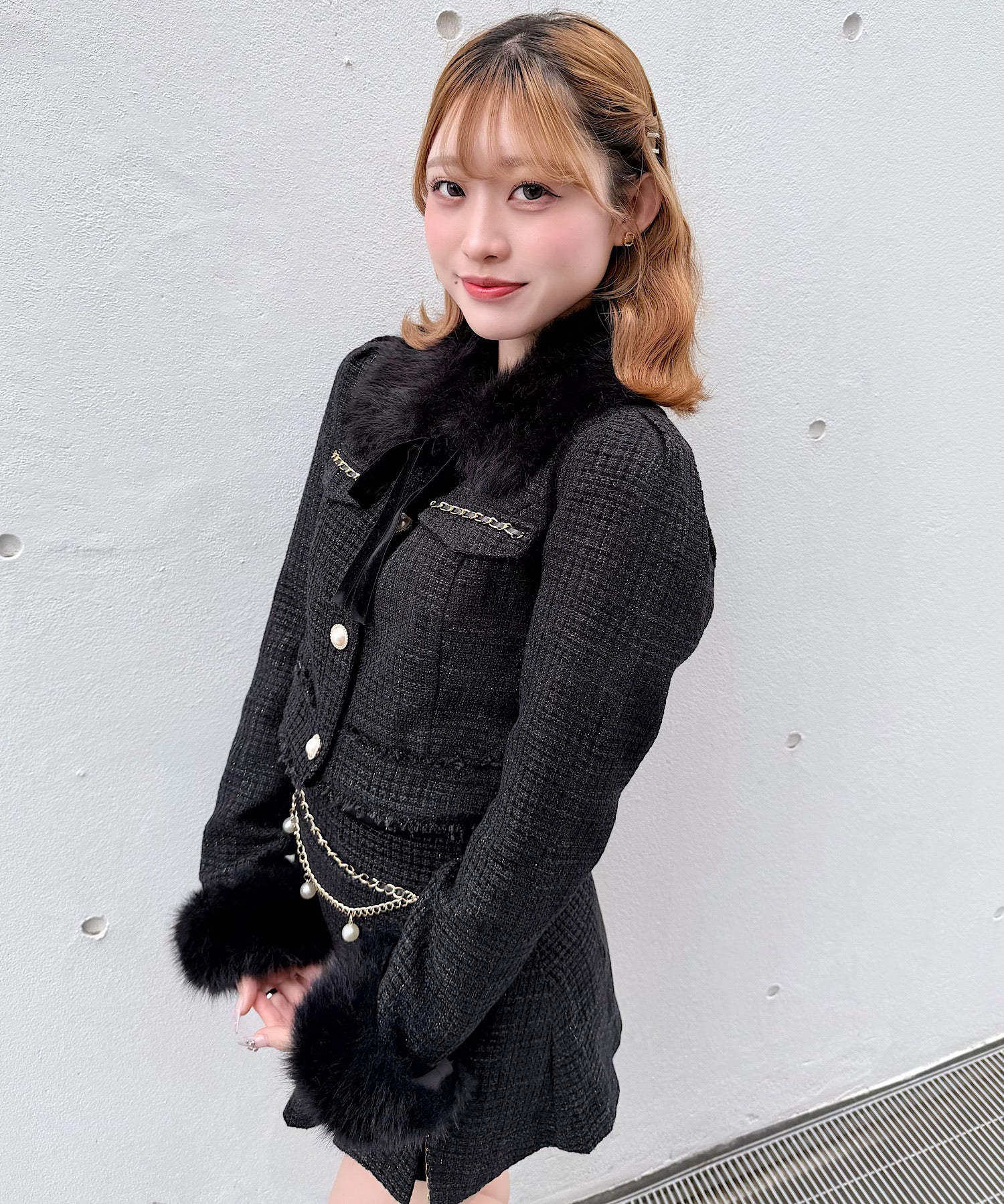 ・胸元のフェイクポケットのゴールドチェーンがオシャレなポイント!