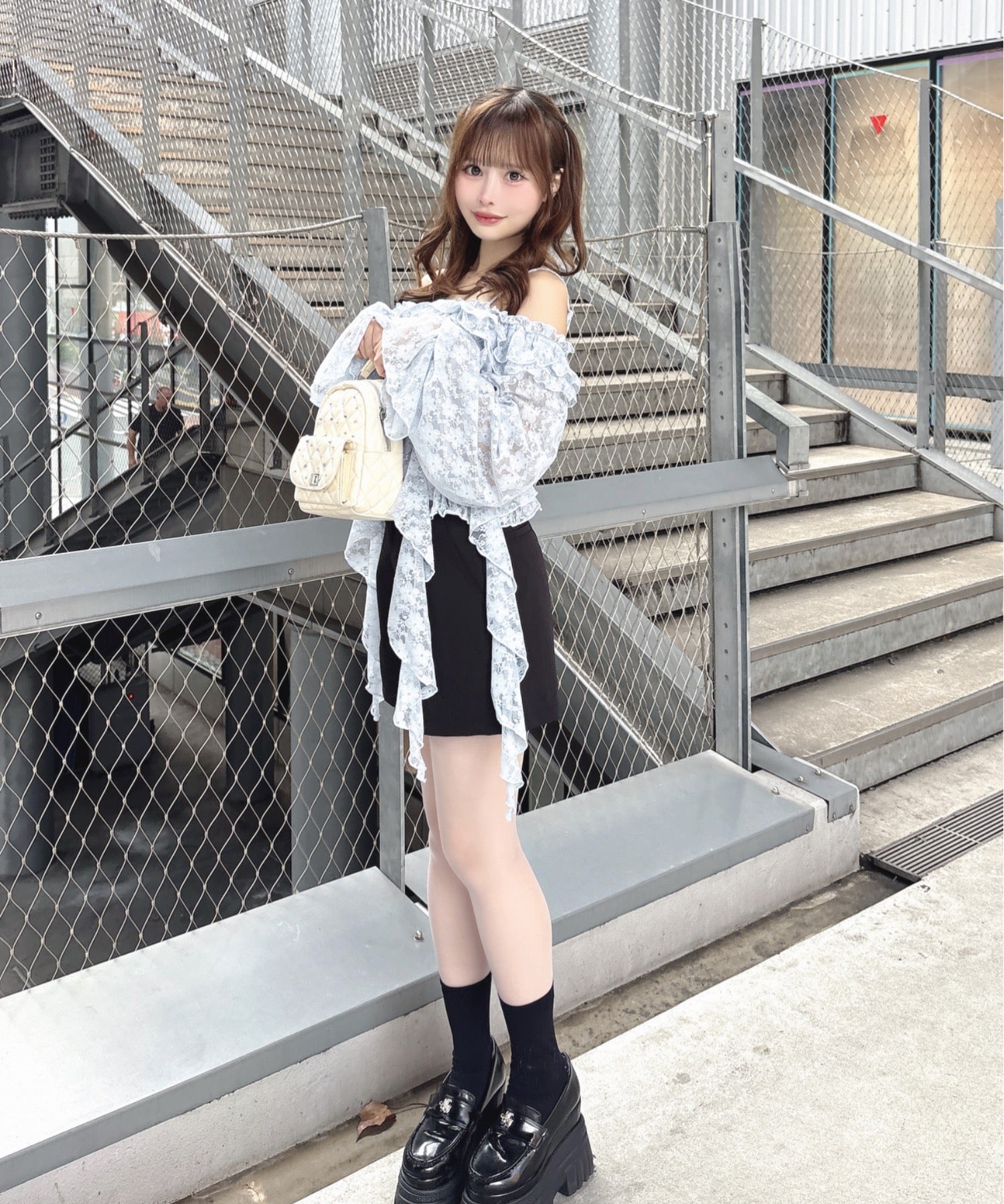 ・肌寒い日は上からアウターを羽織って裾のフリルを見せるのもおすすめ♩