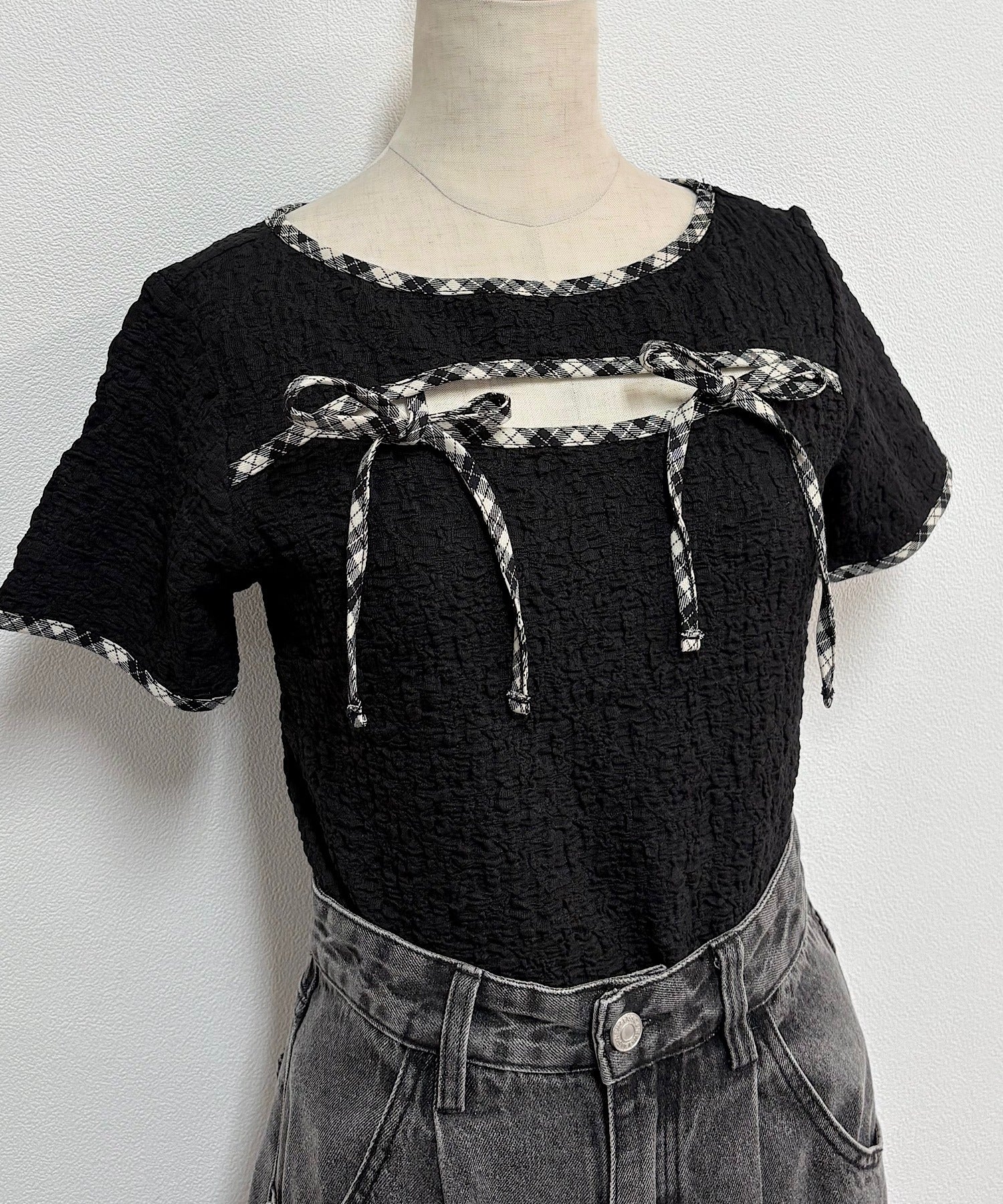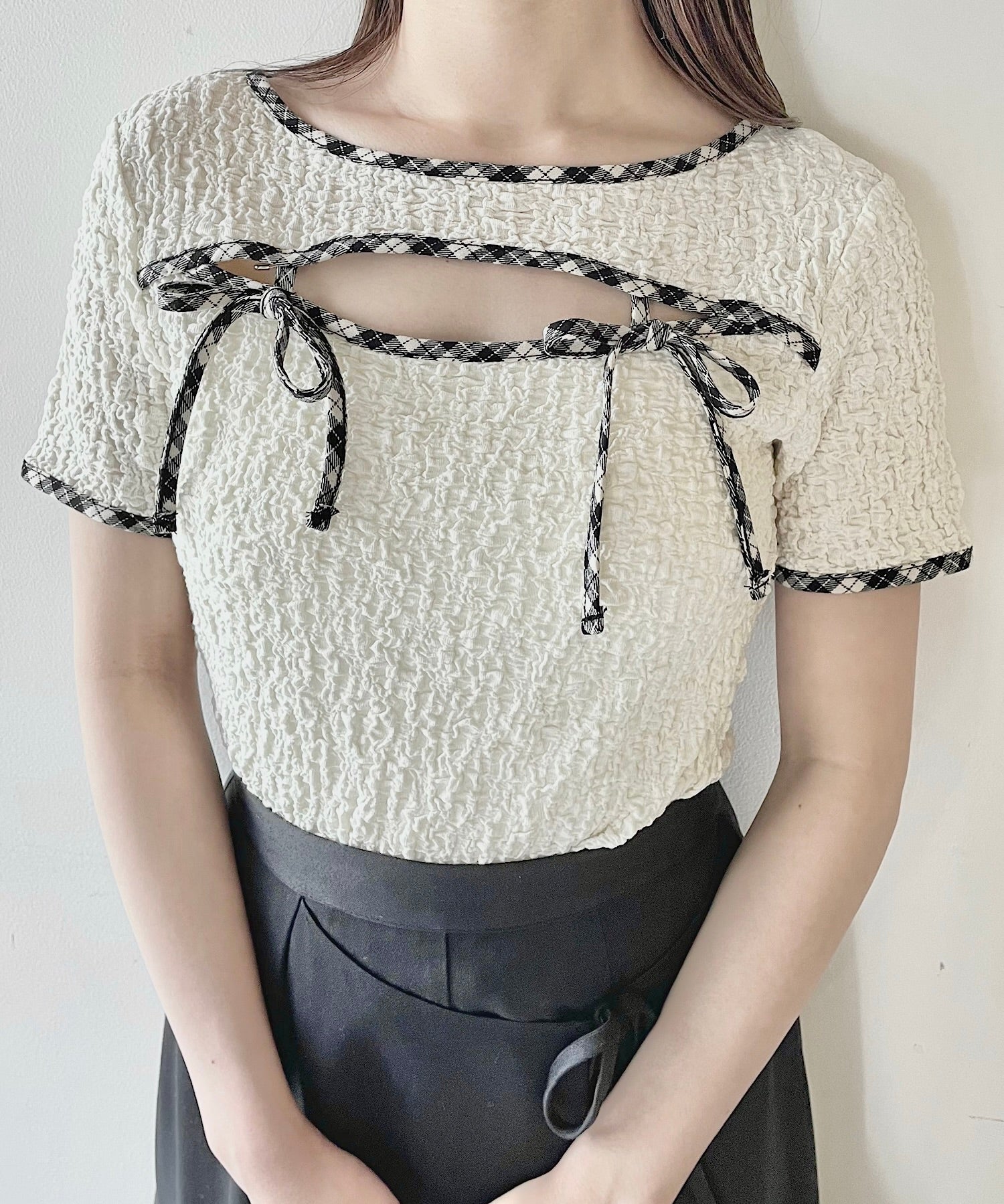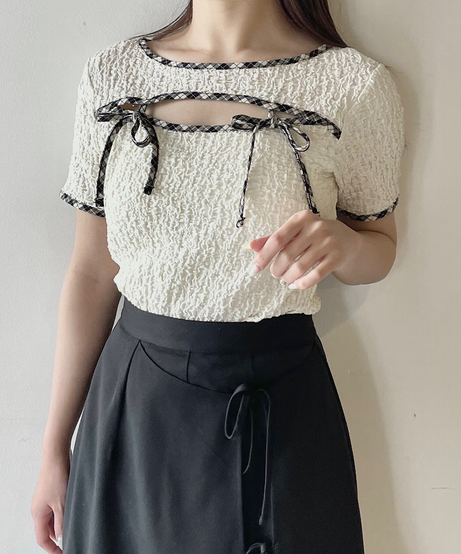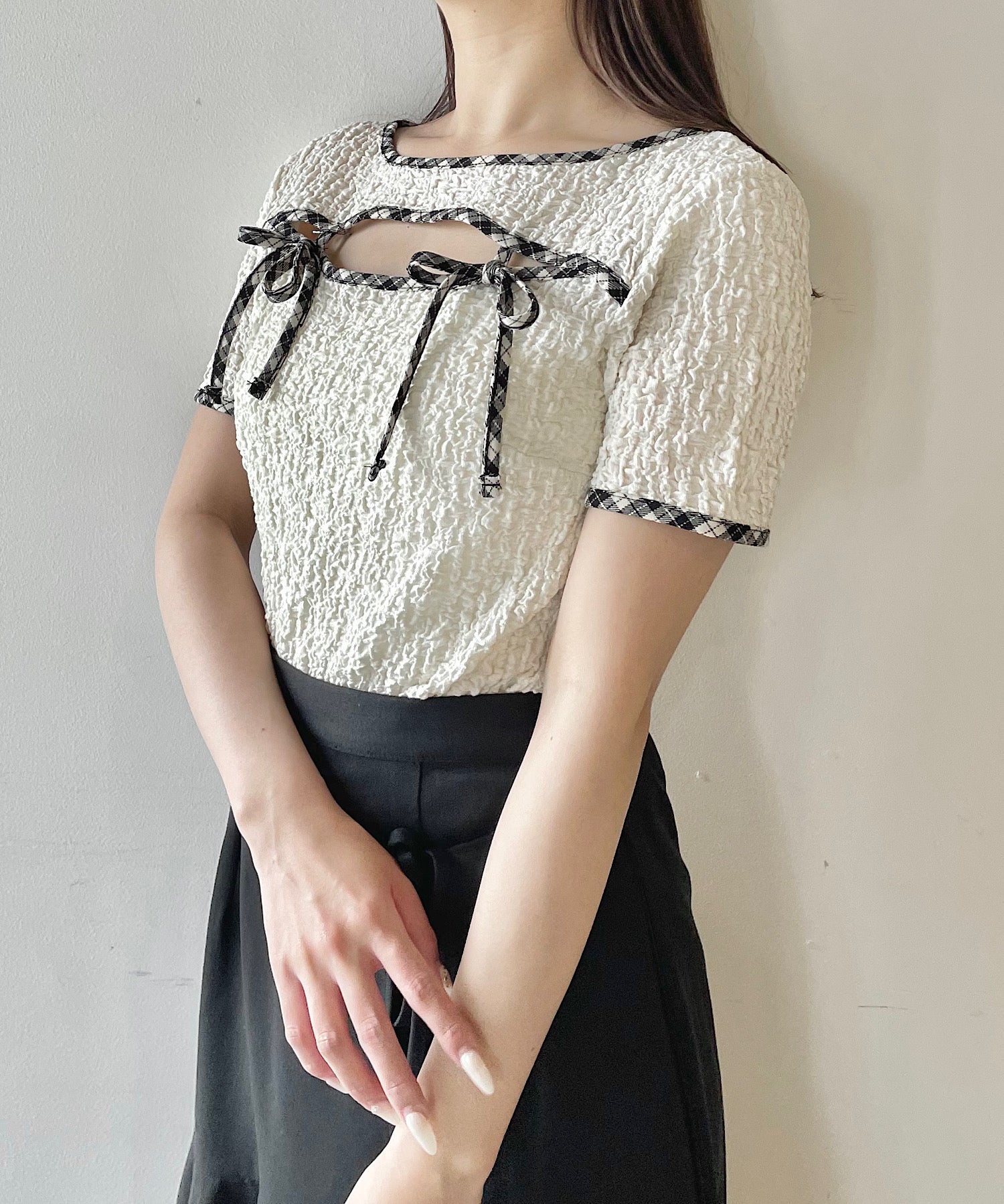 ・デコルテ開き×リボンデザインが大人かわいい半袖トップス。
