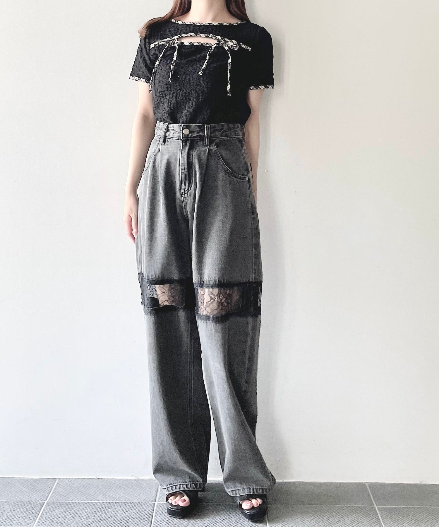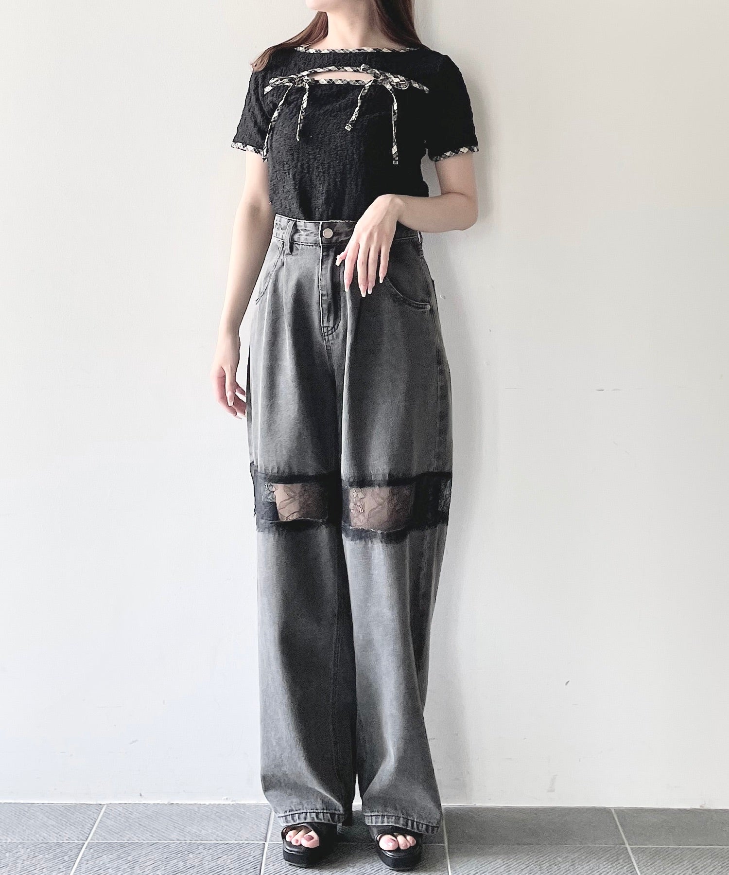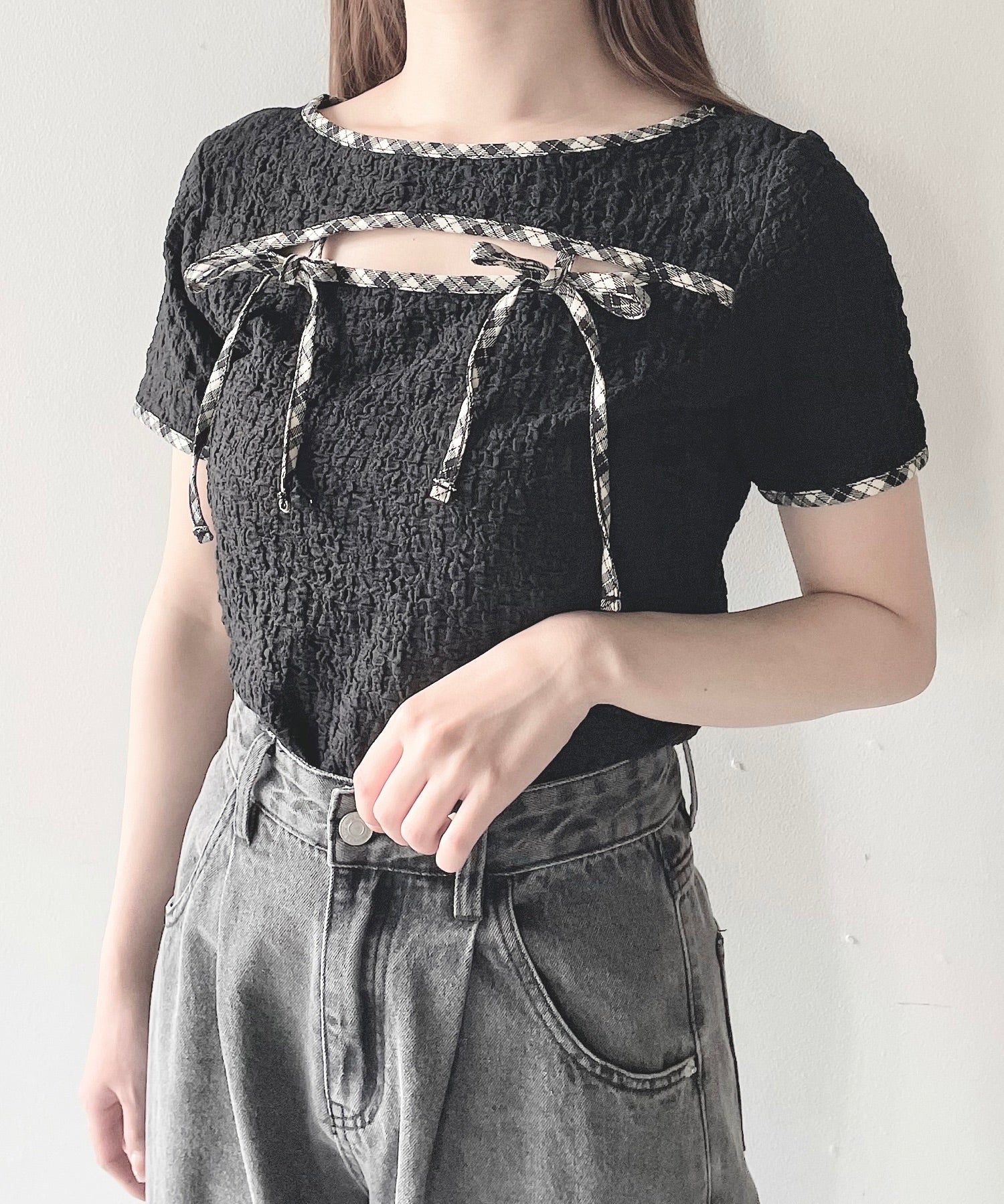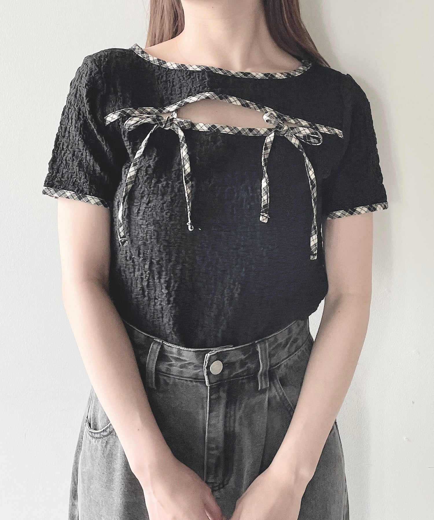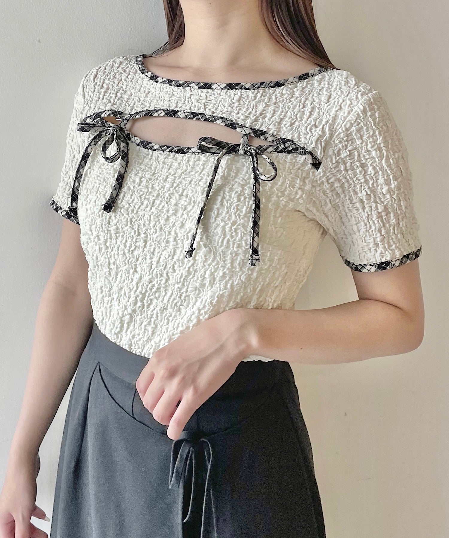・デコルテ開き×リボンデザインが大人かわいい半袖トップス。