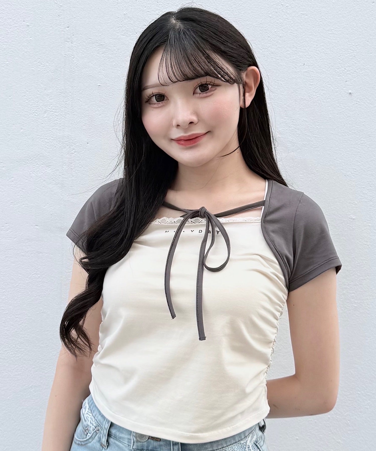 ・スクエアネックにレースとリボンをあしらった、ガーリーなディテールが魅力のトップス♡