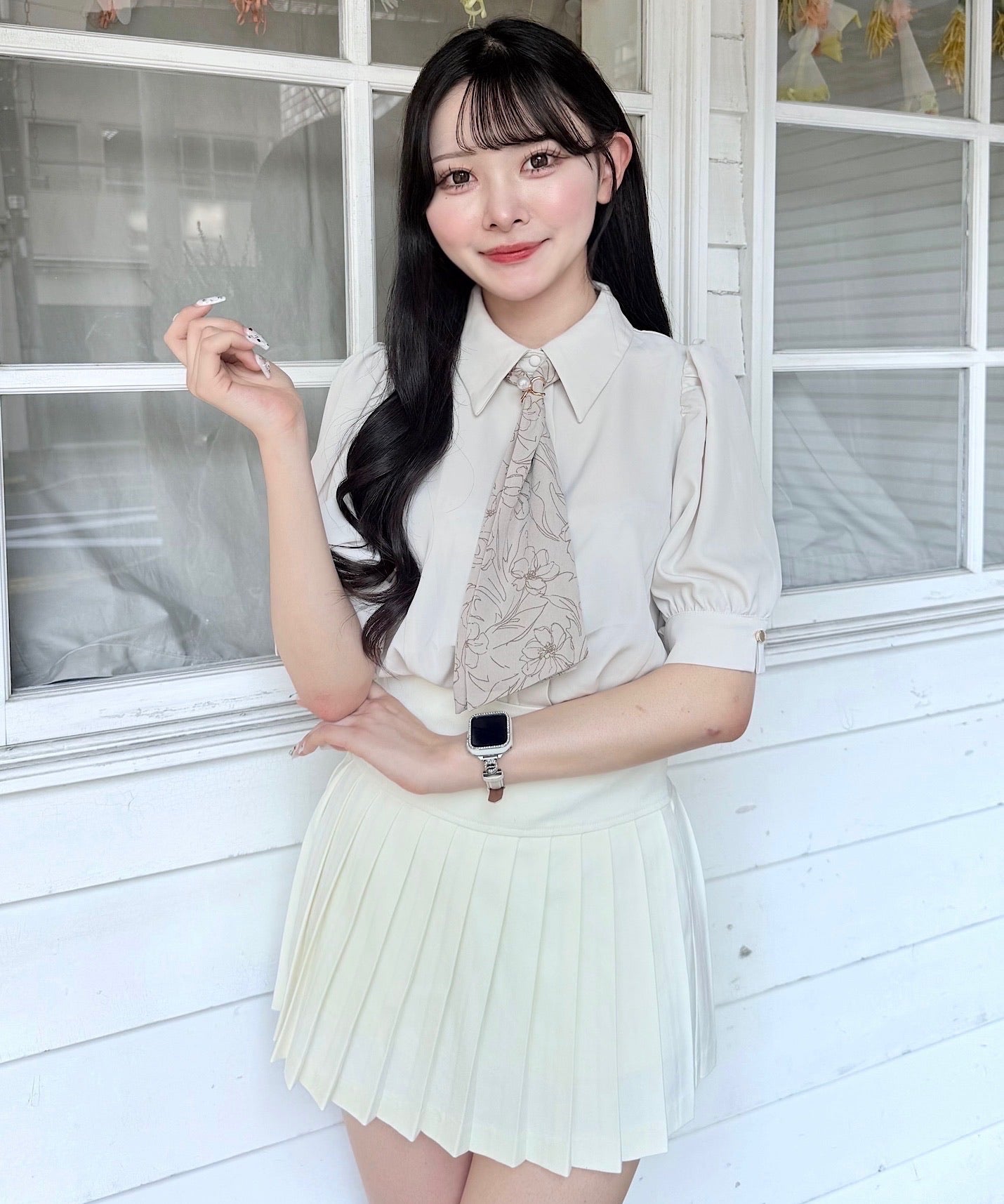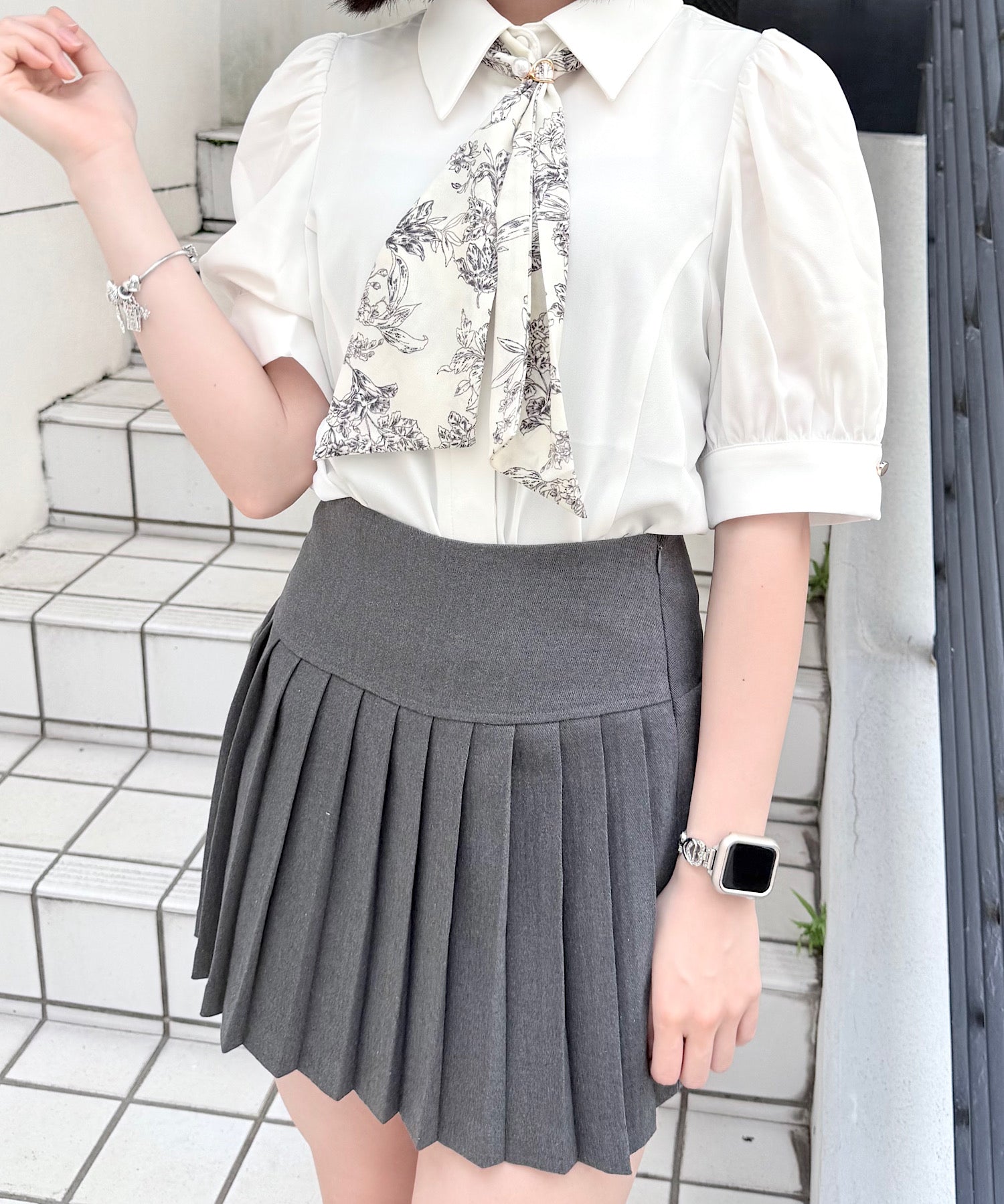 ・スカーフの留め具にはゴールド×パールをあしらい、上品で華やかなアクセントをプラス♡