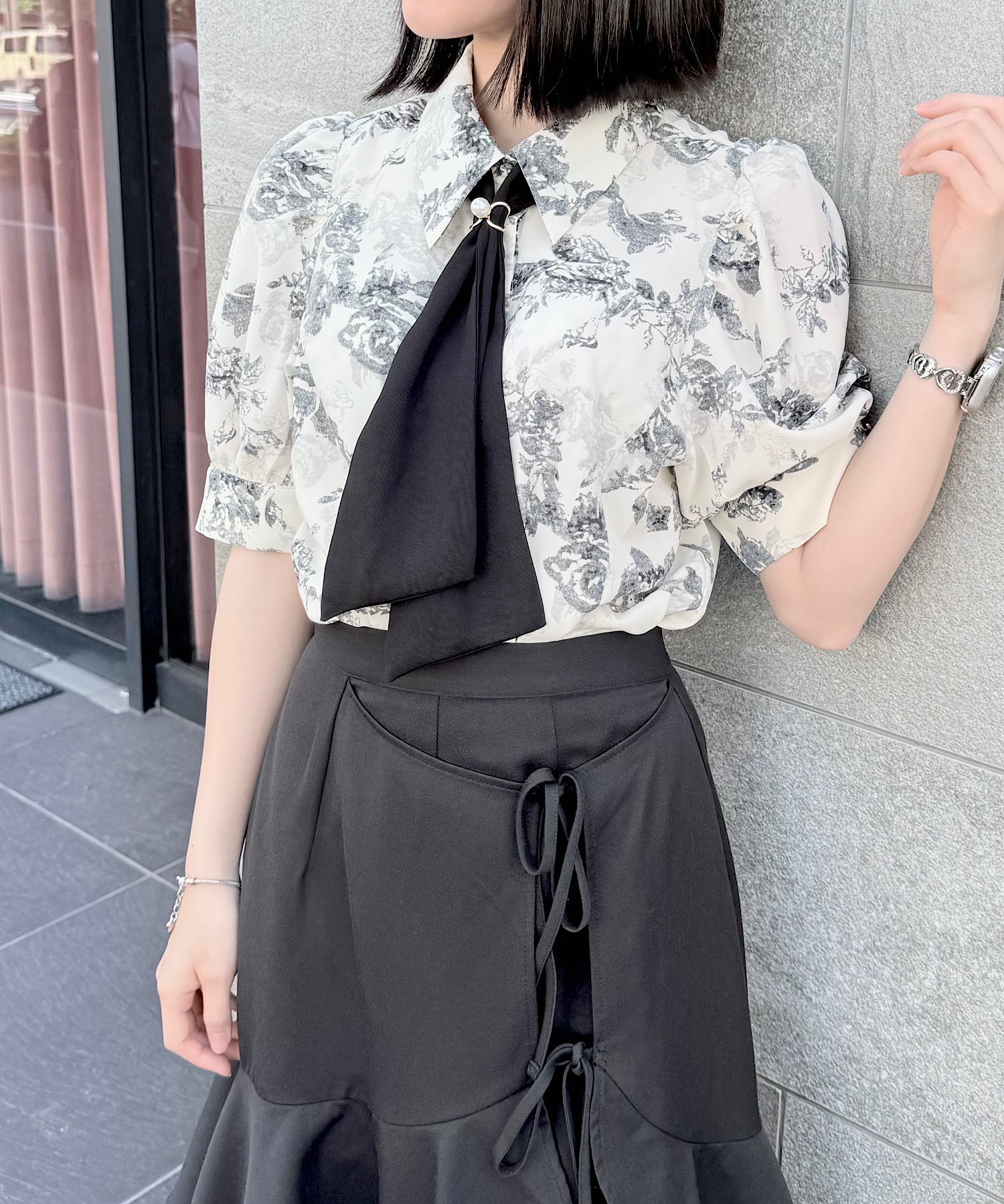 【ブラック花柄】ブラウス:ポリエステル100% スカーフ:ポリエステル100%