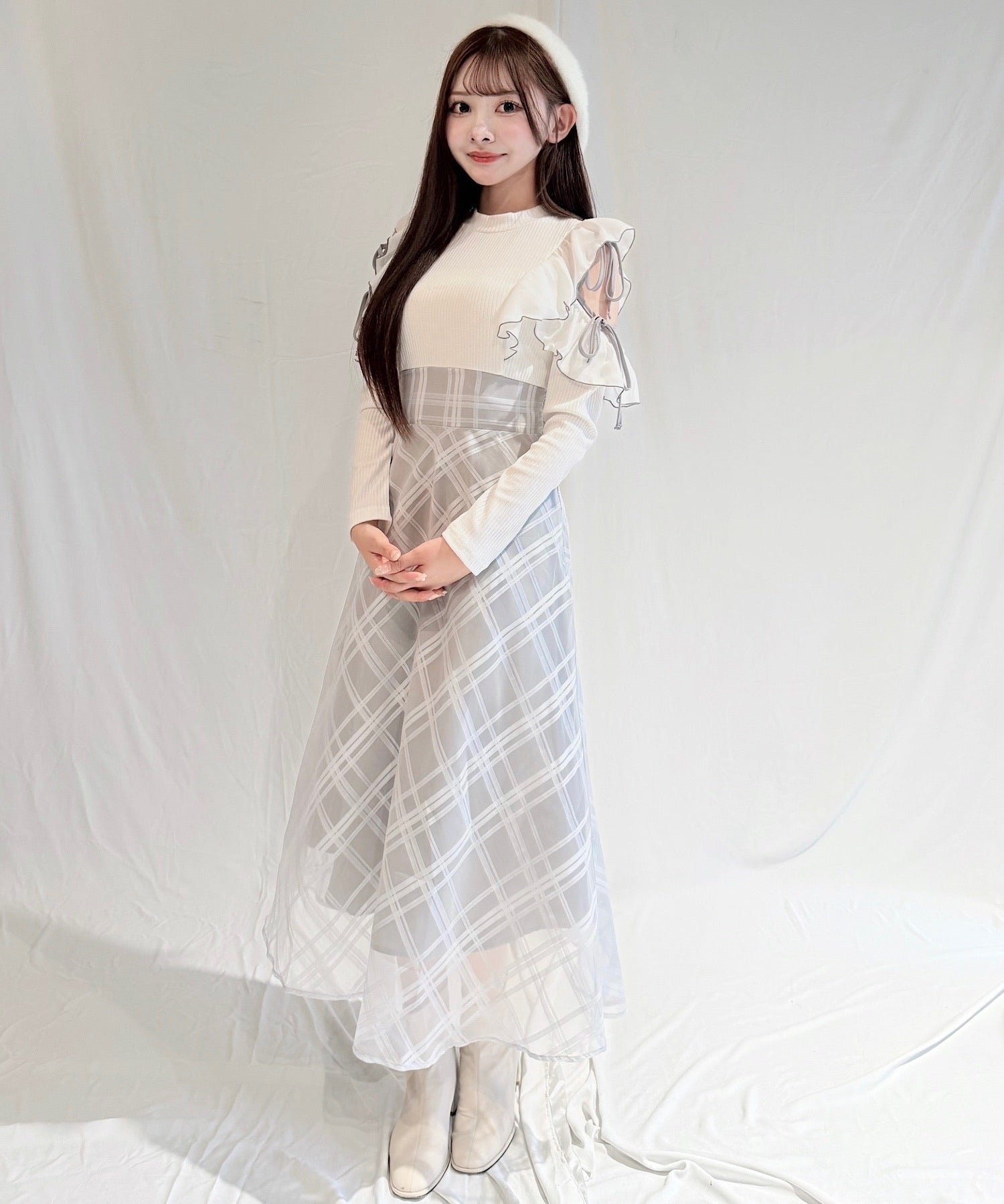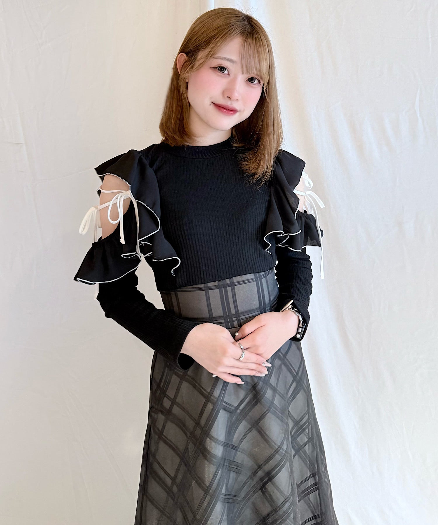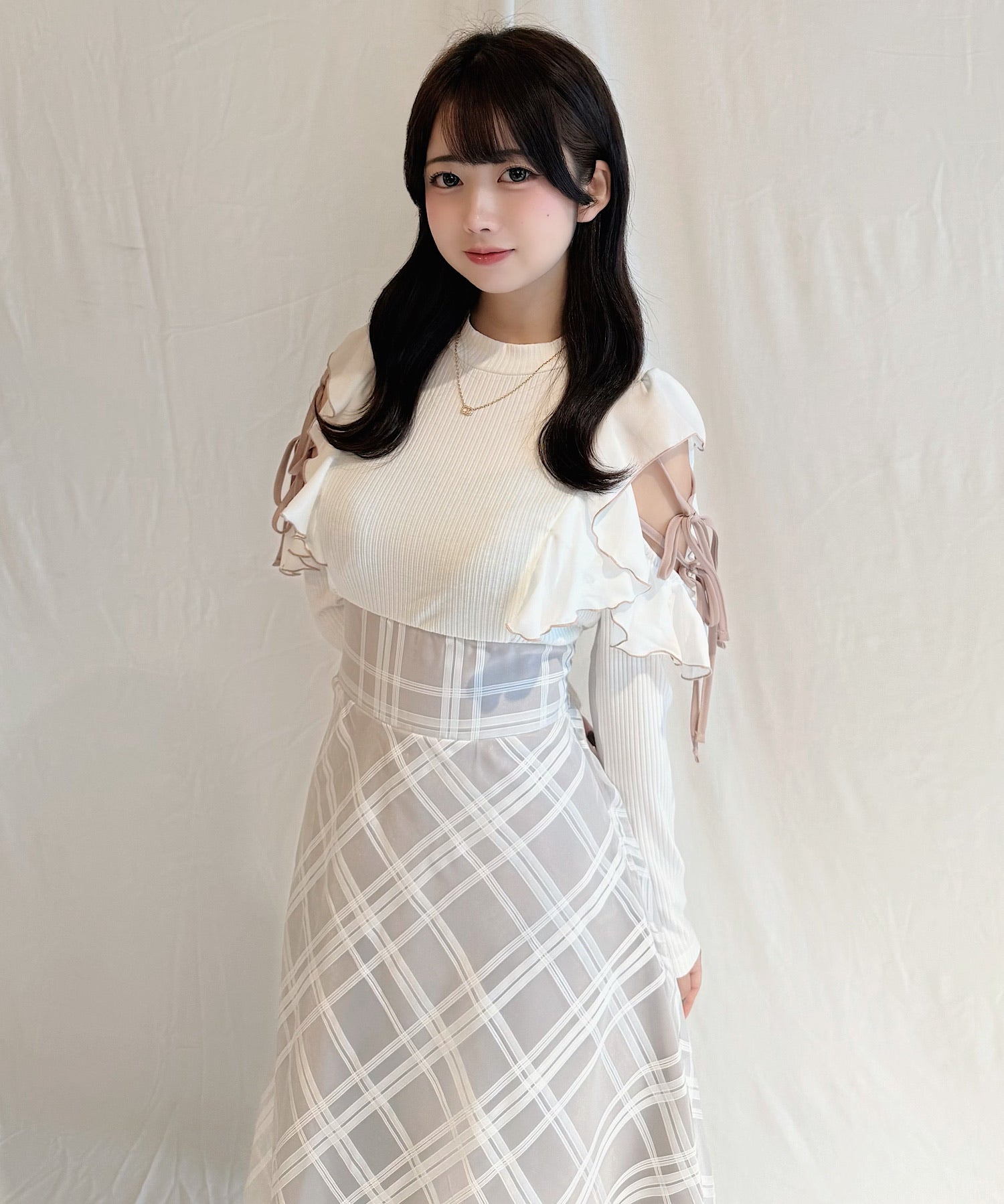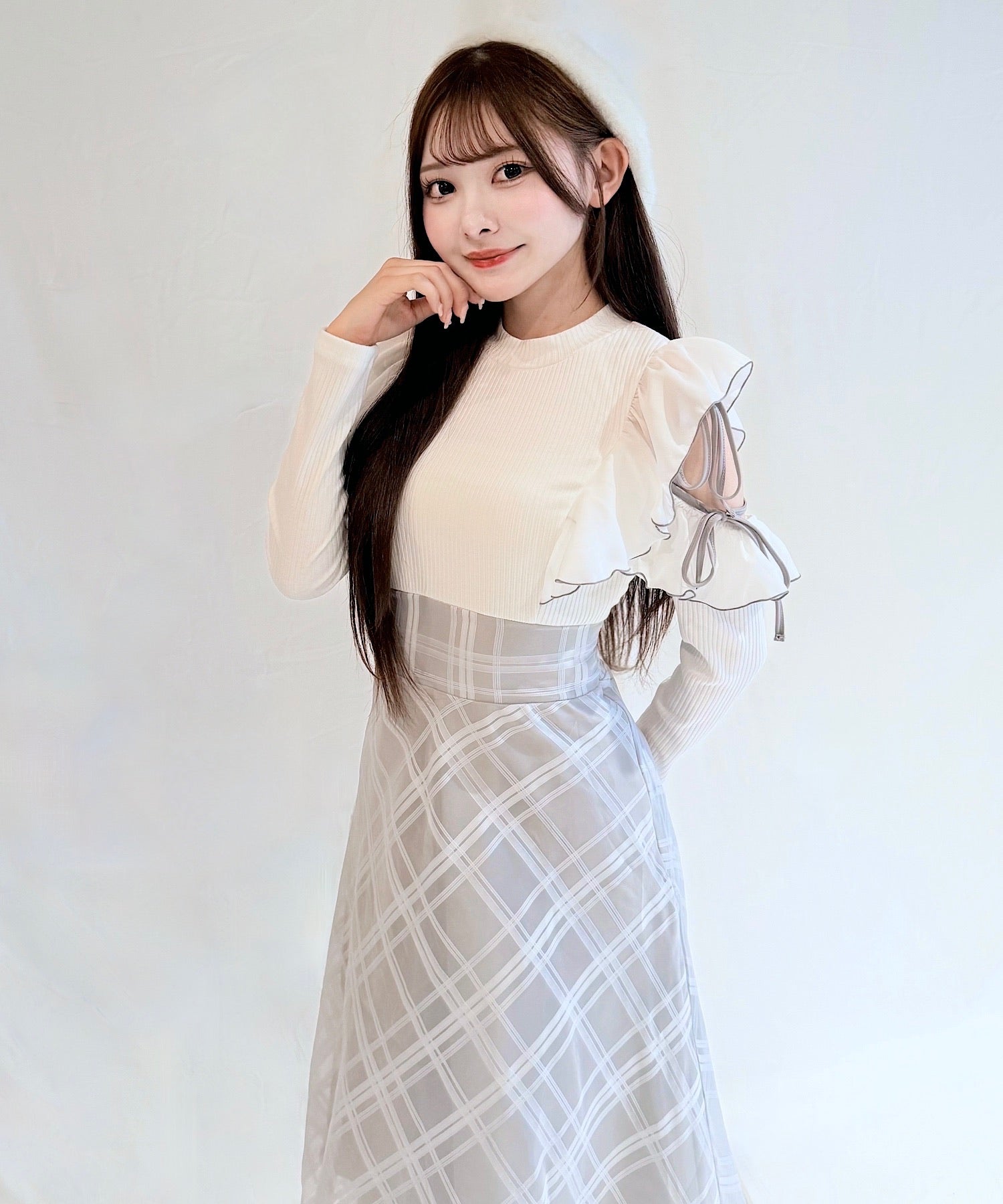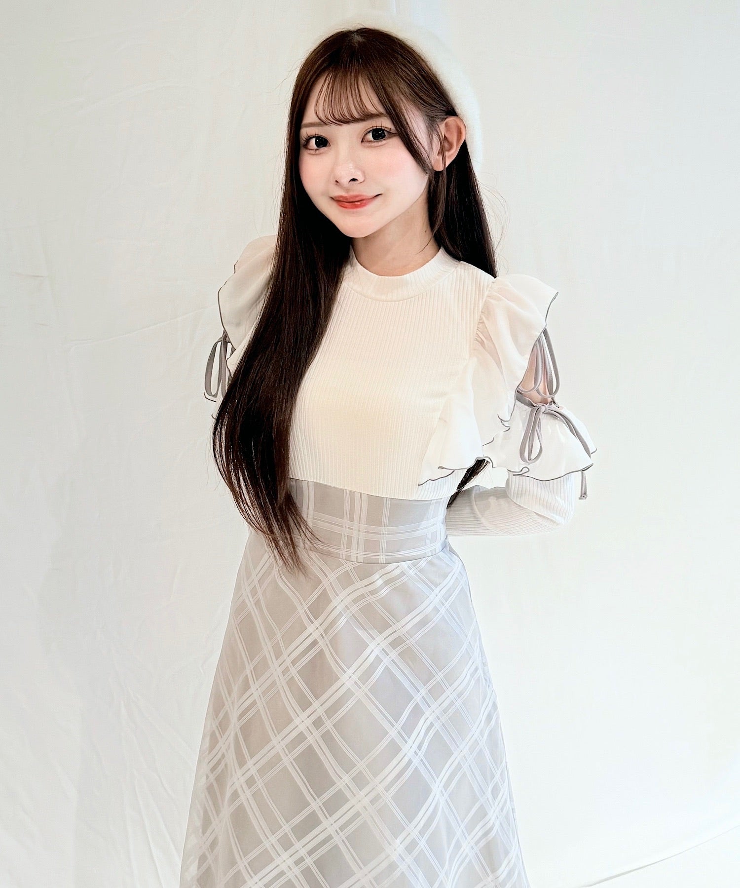 ・肩のフリルデザインとリボンが二の腕周りをさりげなくカバーし、華奢見えを叶えることができるワンピースです。