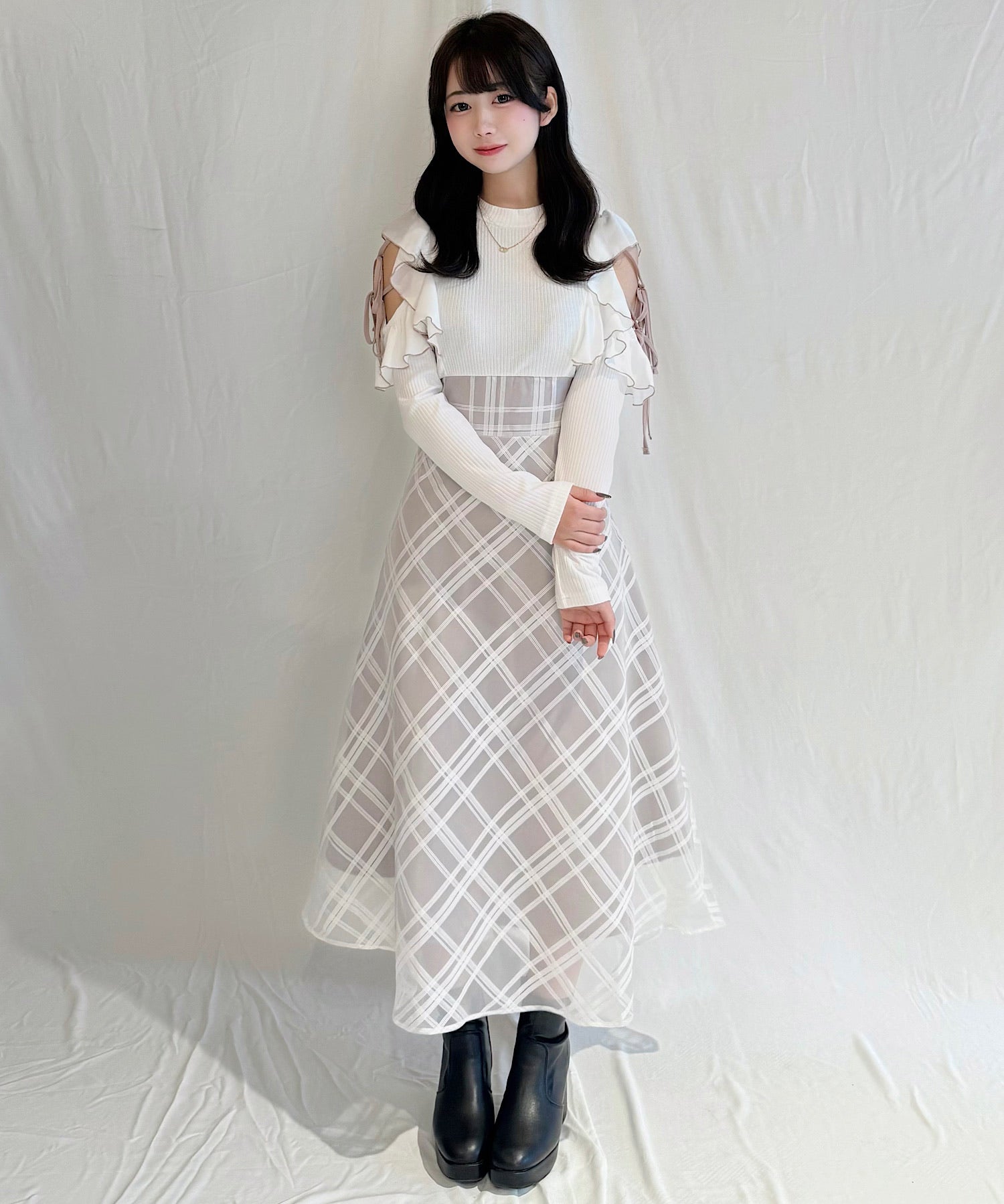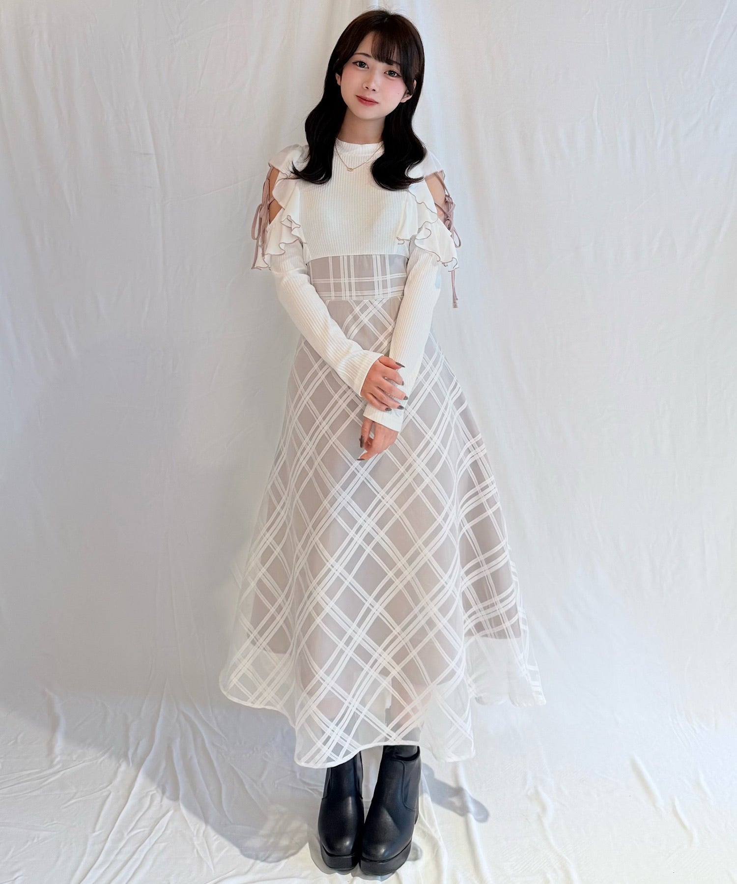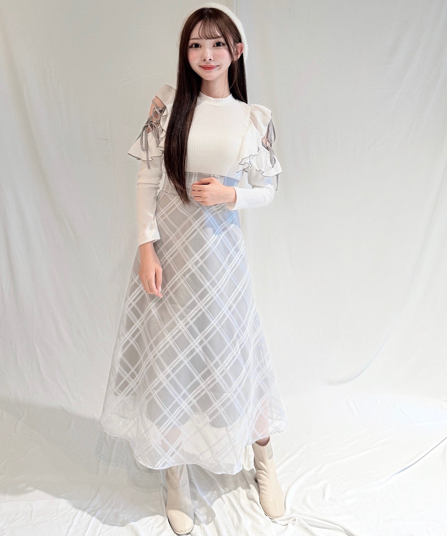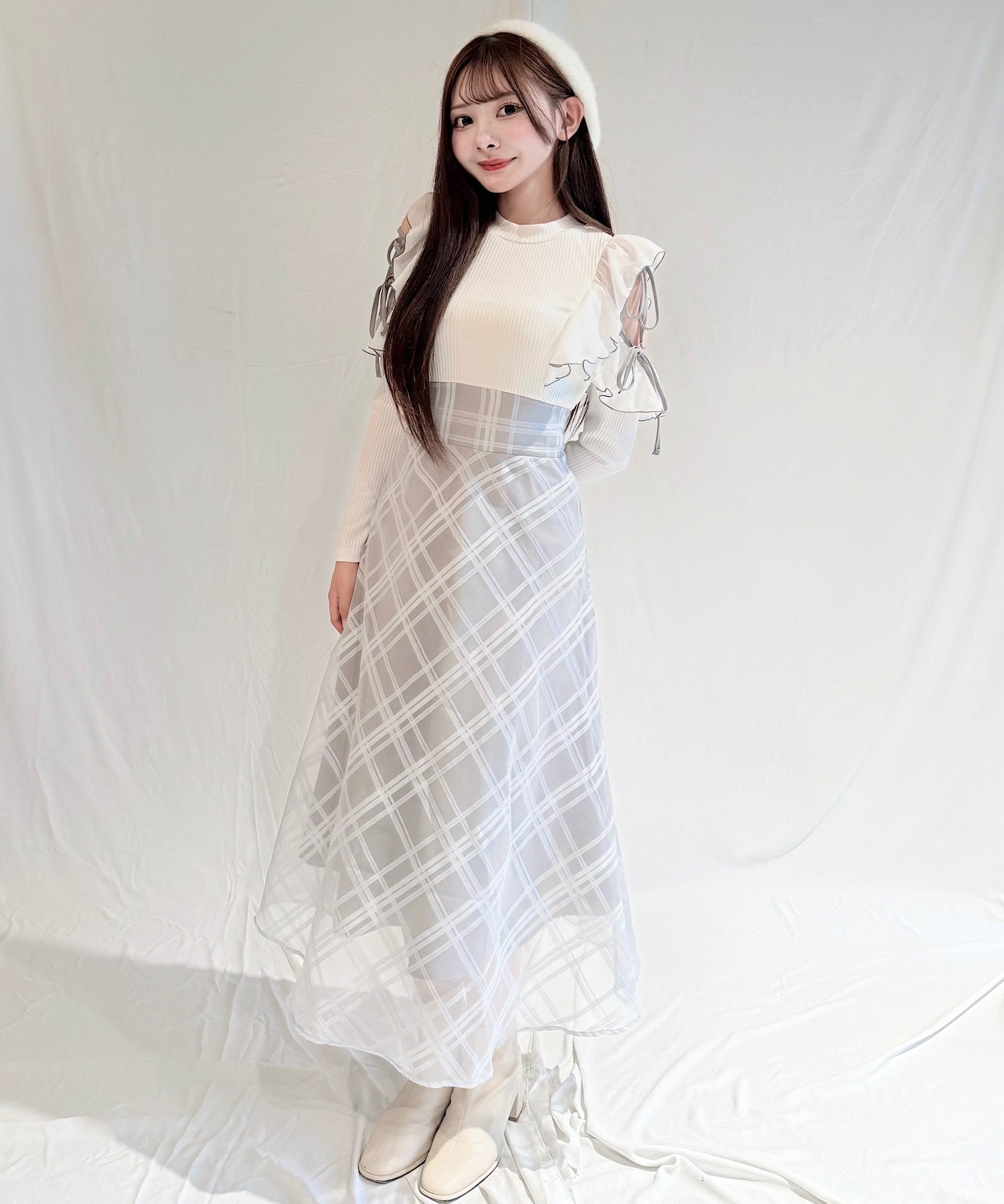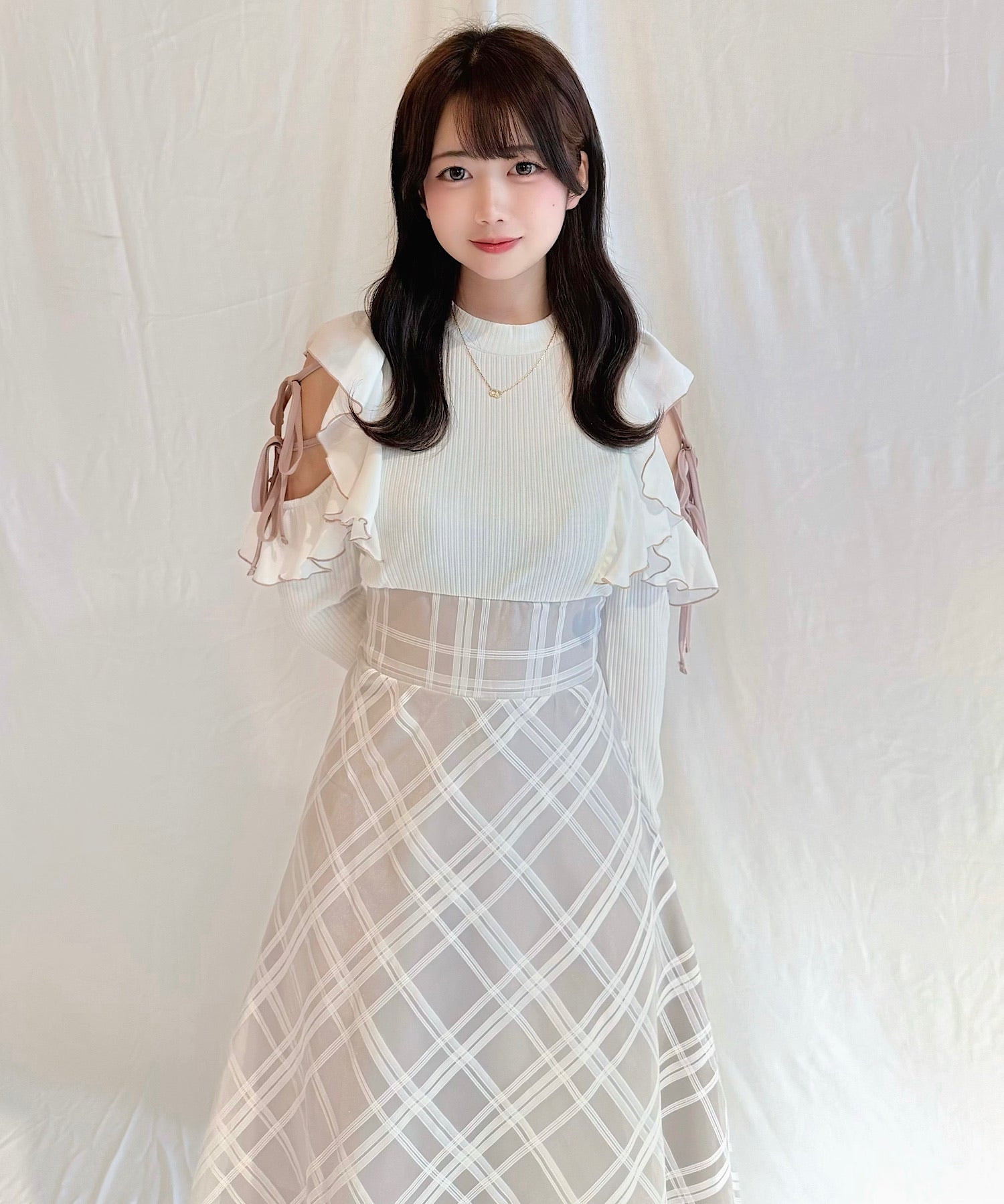 ・肩のフリルデザインとリボンが二の腕周りをさりげなくカバーし、華奢見えを叶えることができるワンピースです。