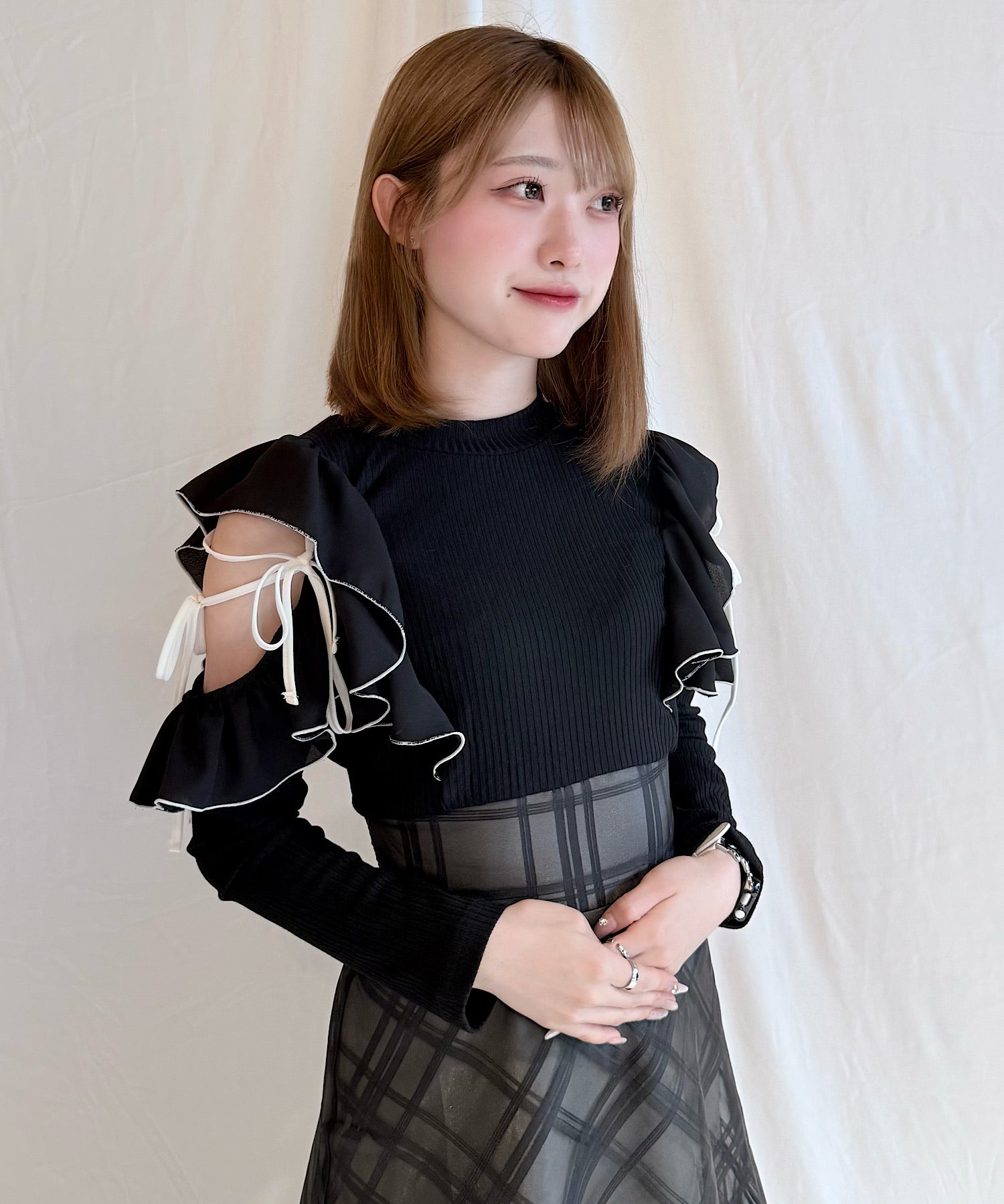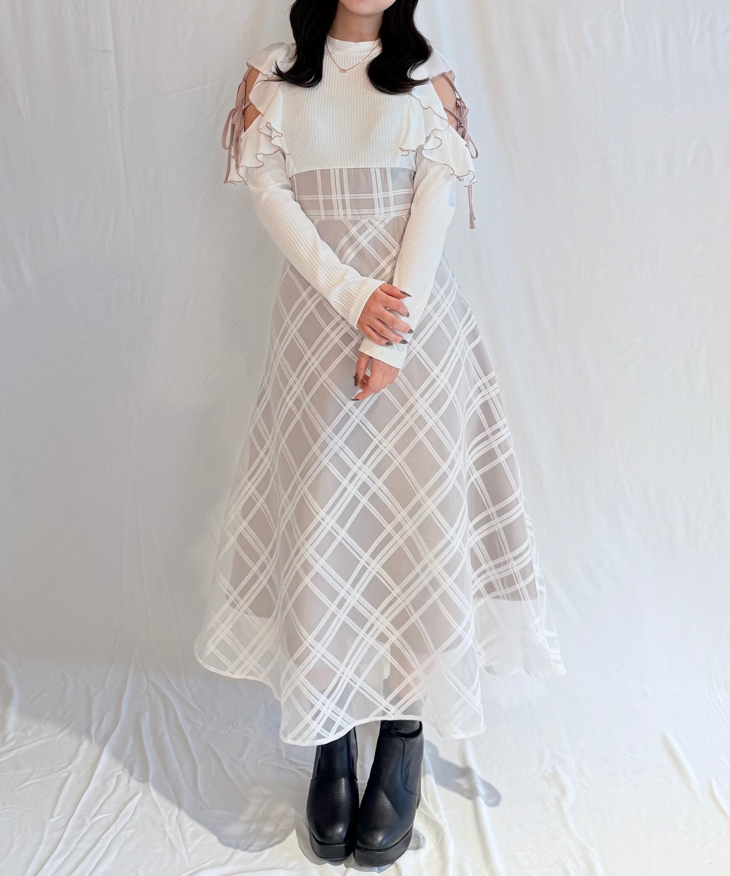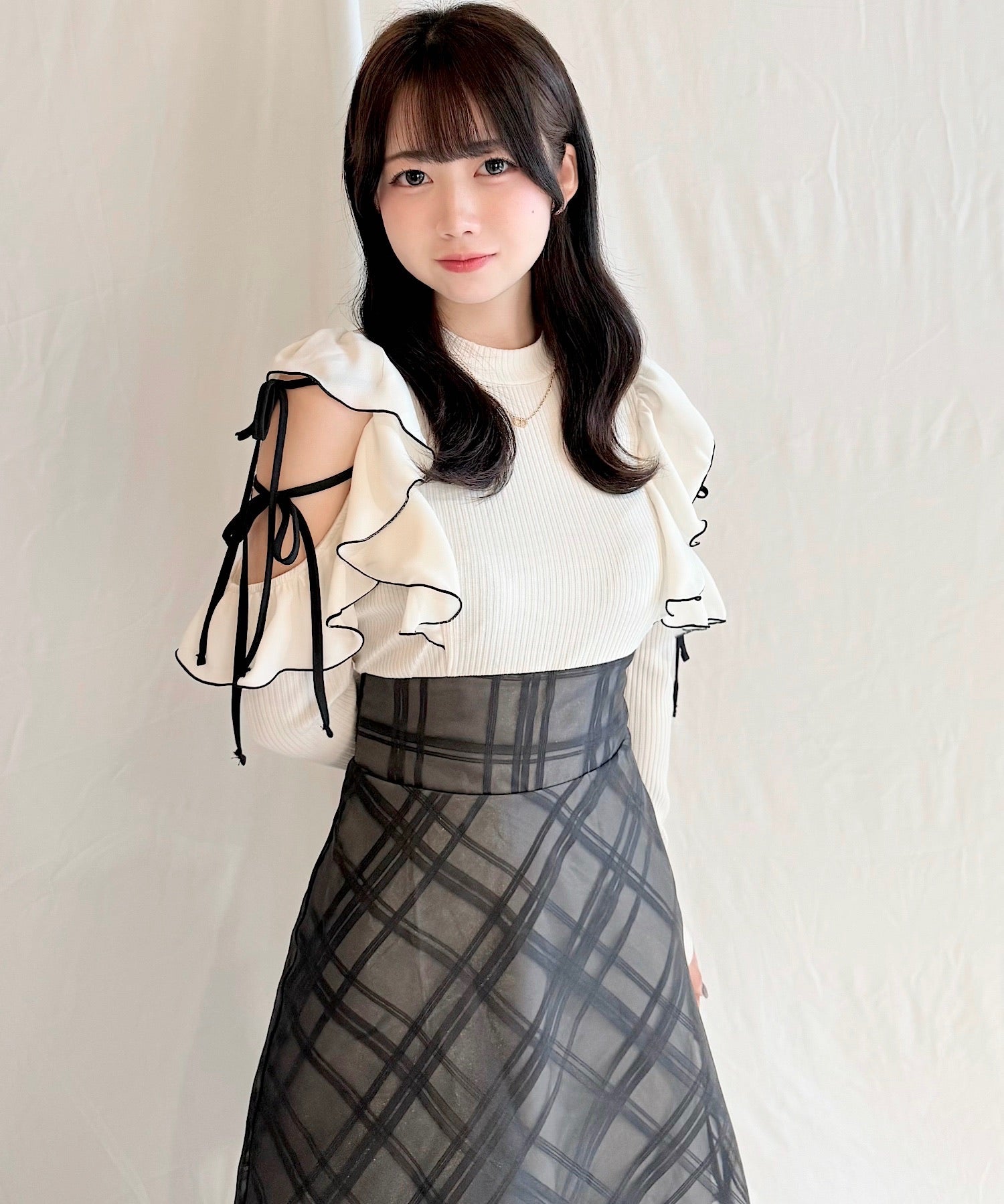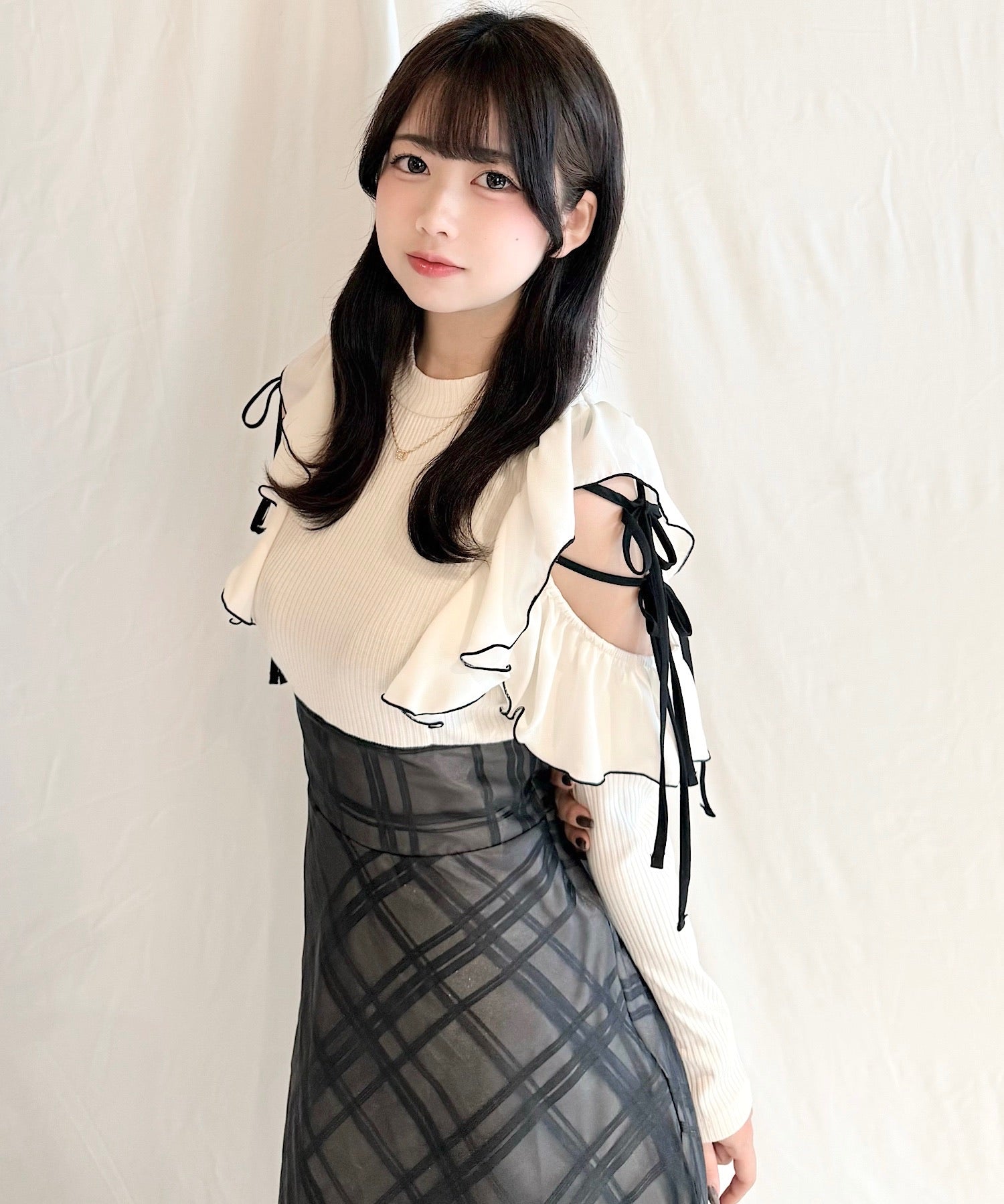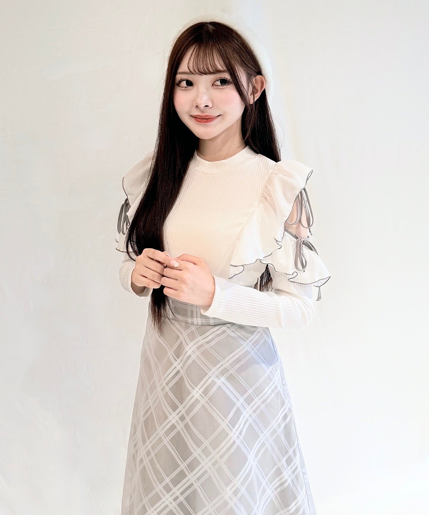 ・肩のフリルデザインとリボンが二の腕周りをさりげなくカバーし、華奢見えを叶えることができるワンピースです。
