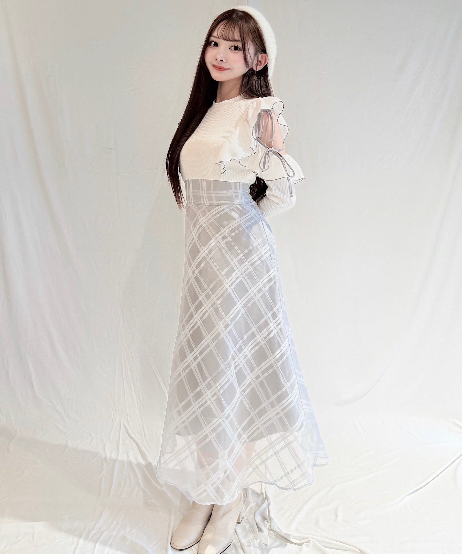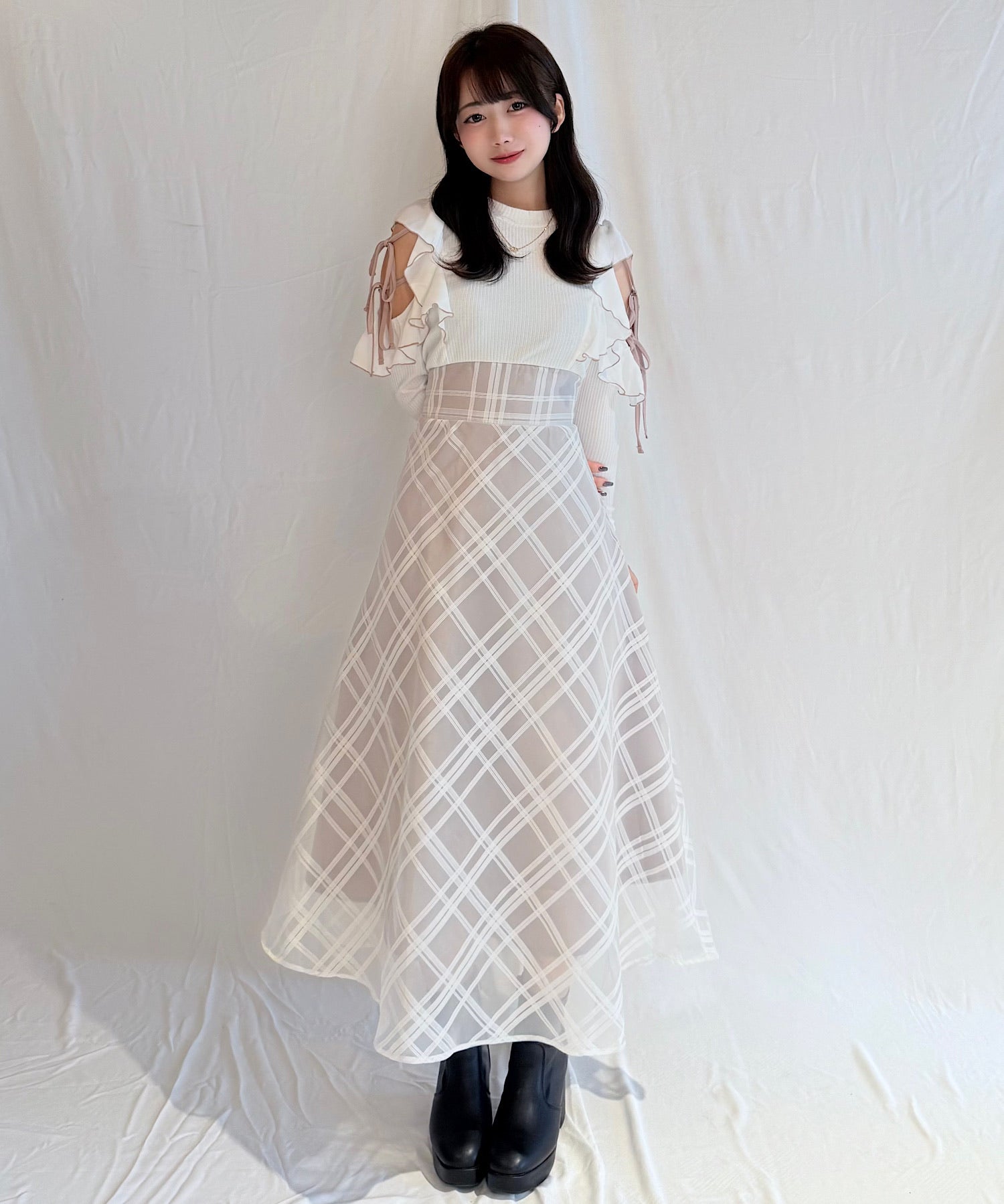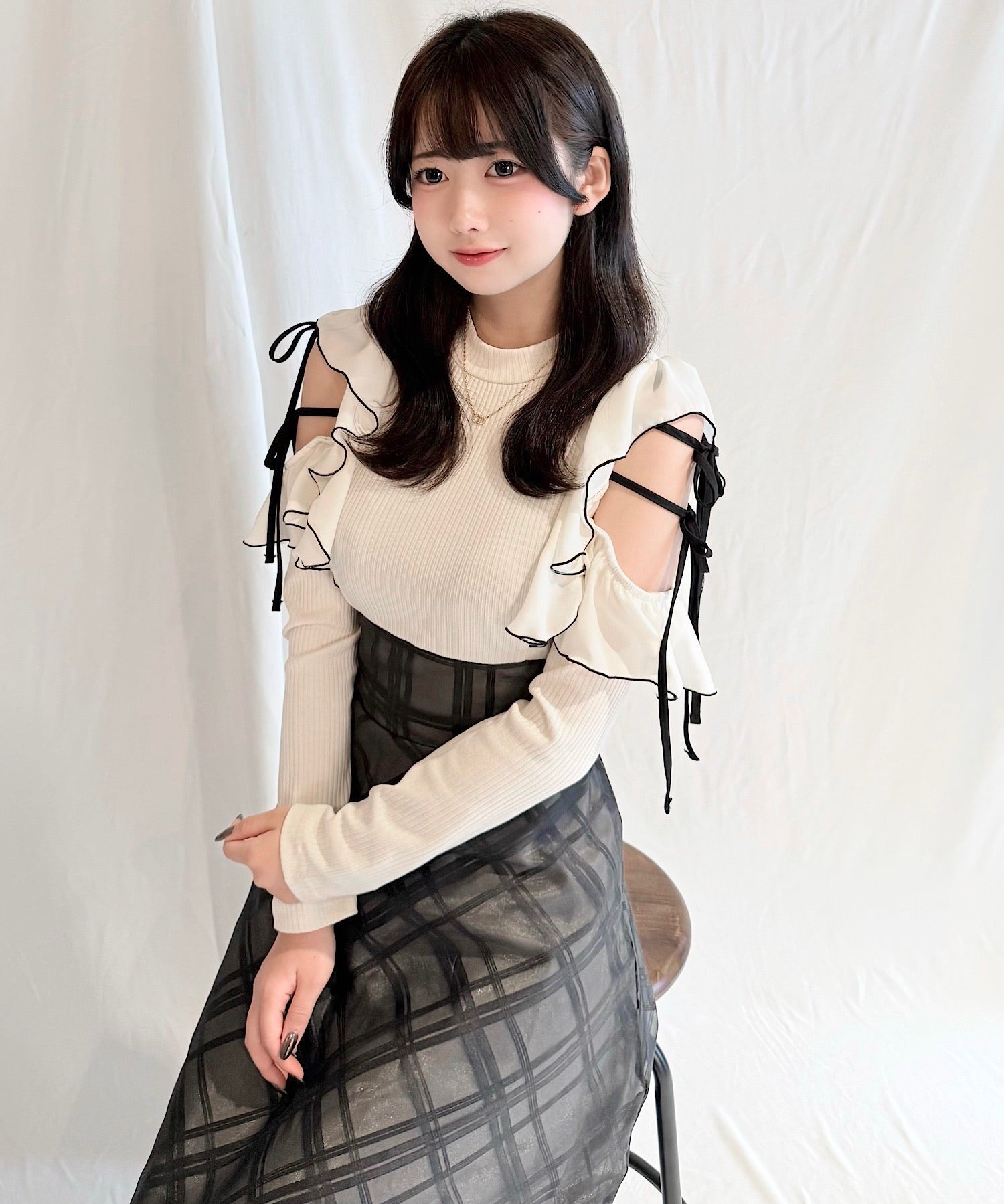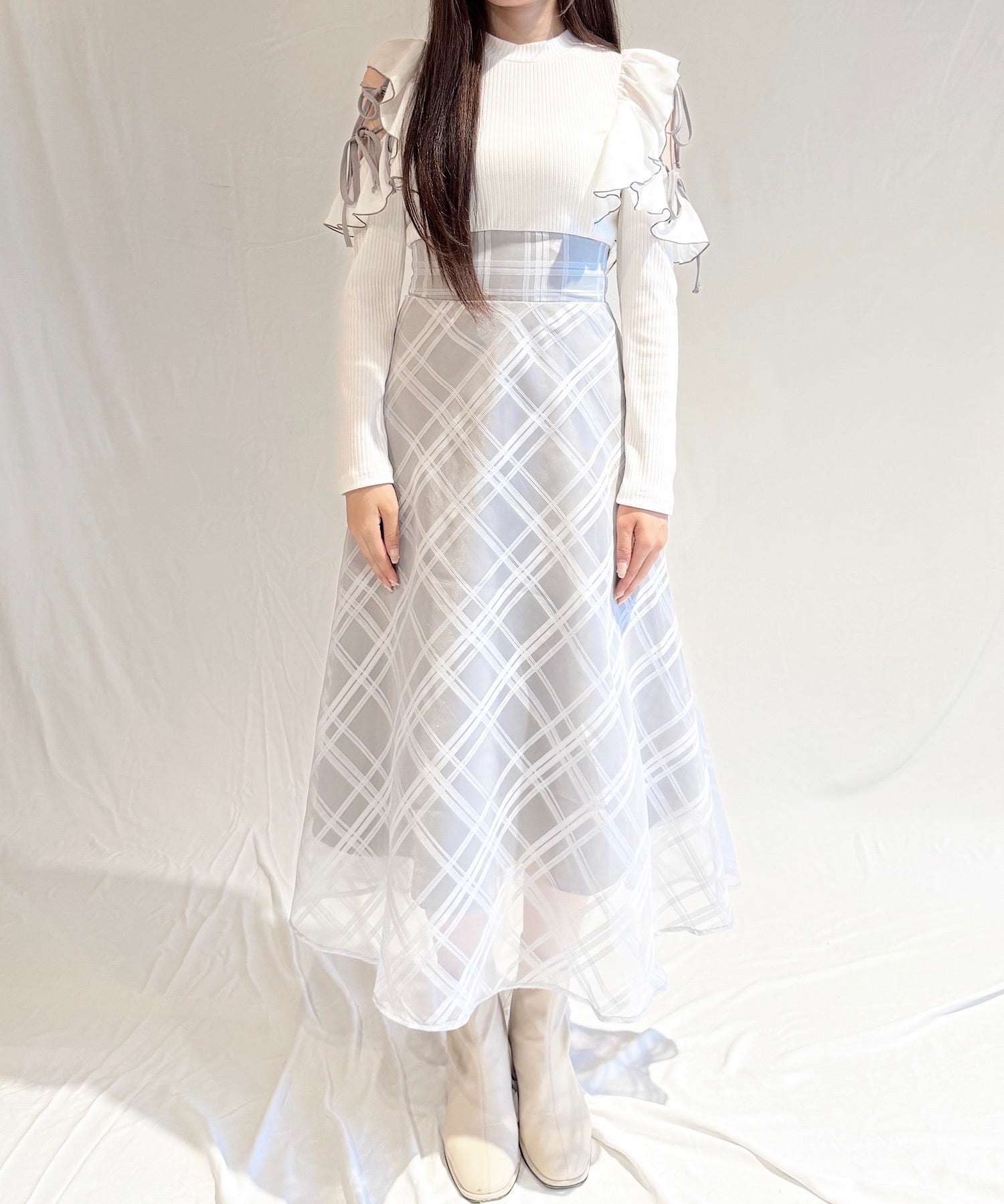 ・肩のフリルデザインとリボンが二の腕周りをさりげなくカバーし、華奢見えを叶えることができるワンピースです。