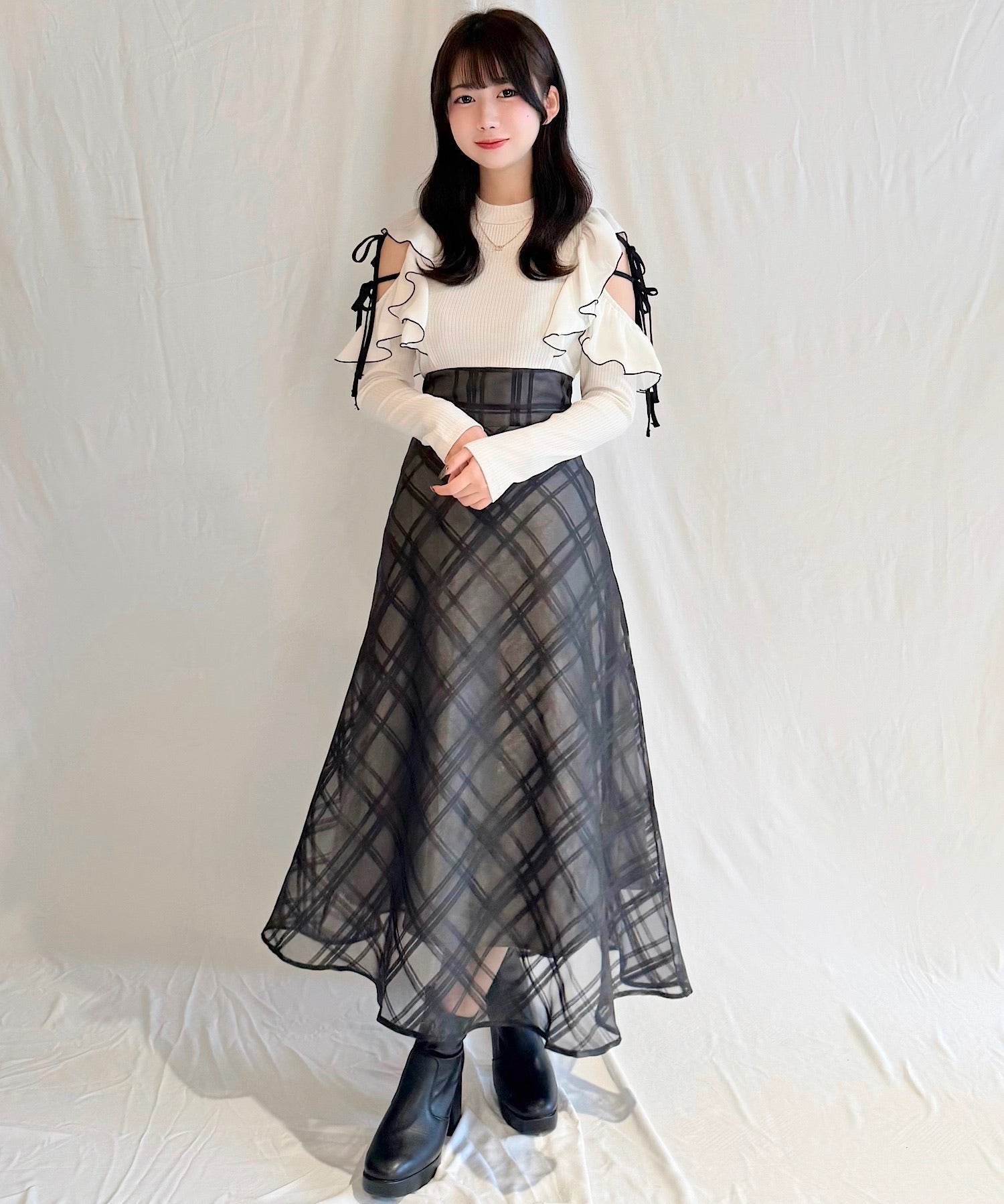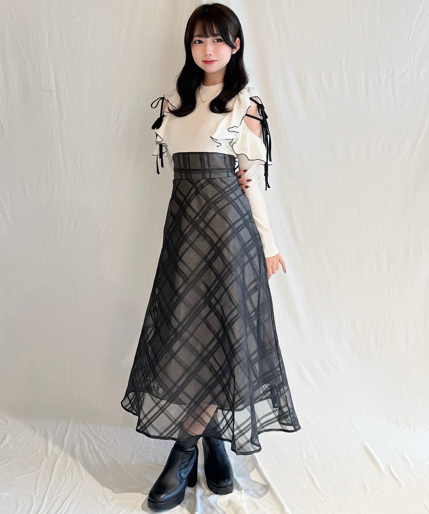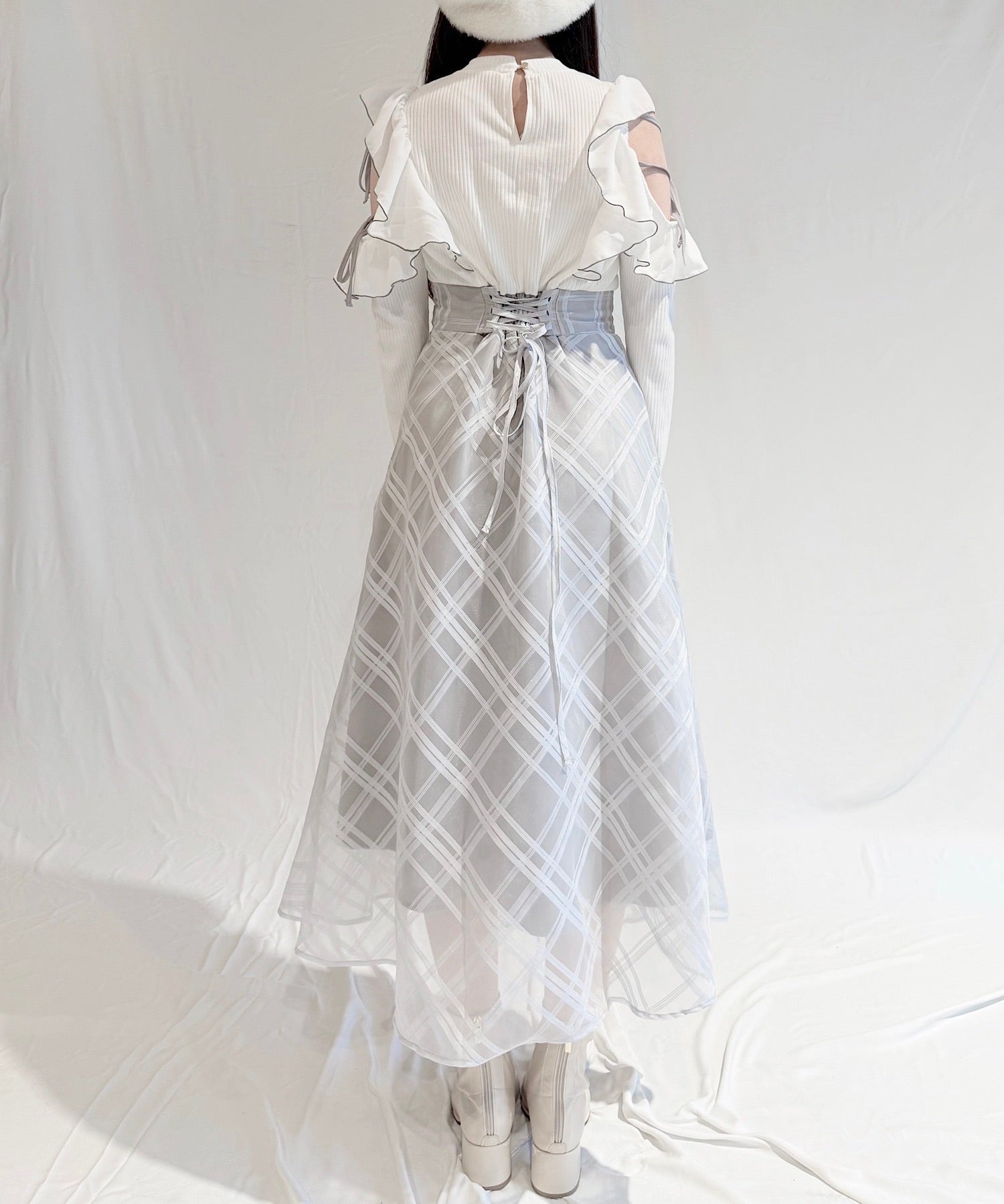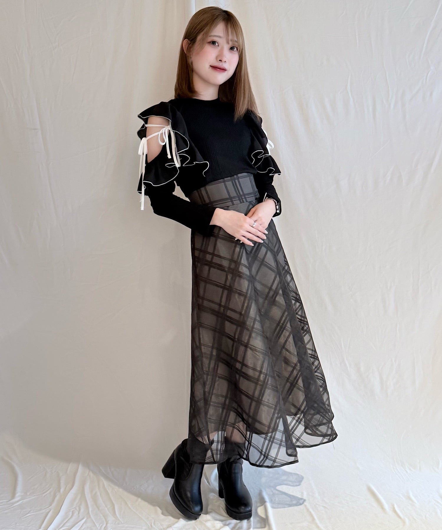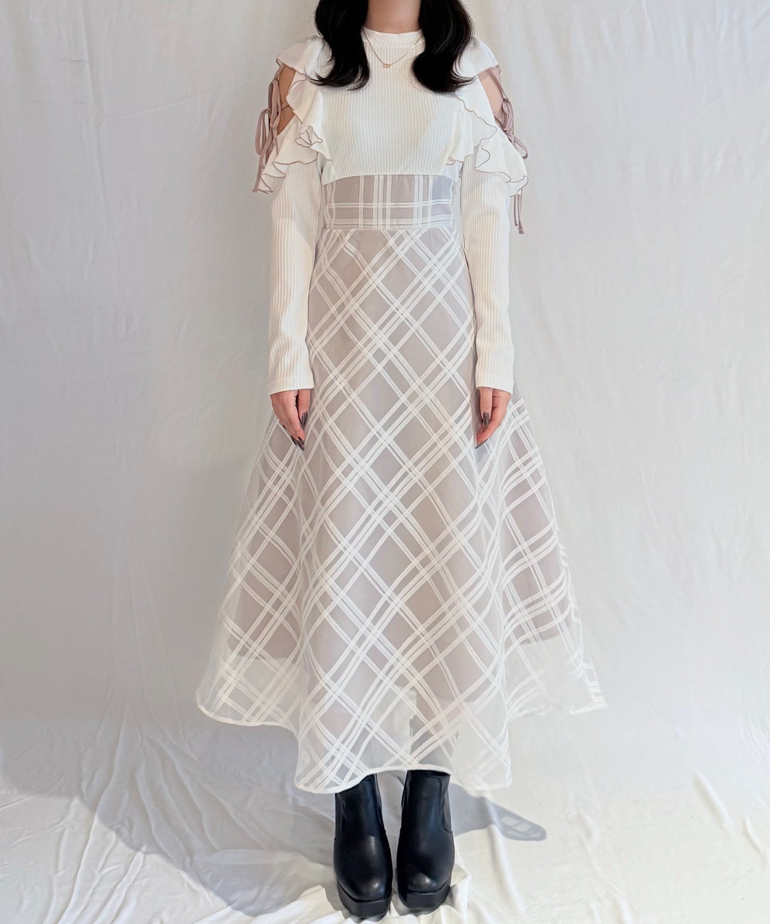 ・肩のフリルデザインとリボンが二の腕周りをさりげなくカバーし、華奢見えを叶えることができるワンピースです。