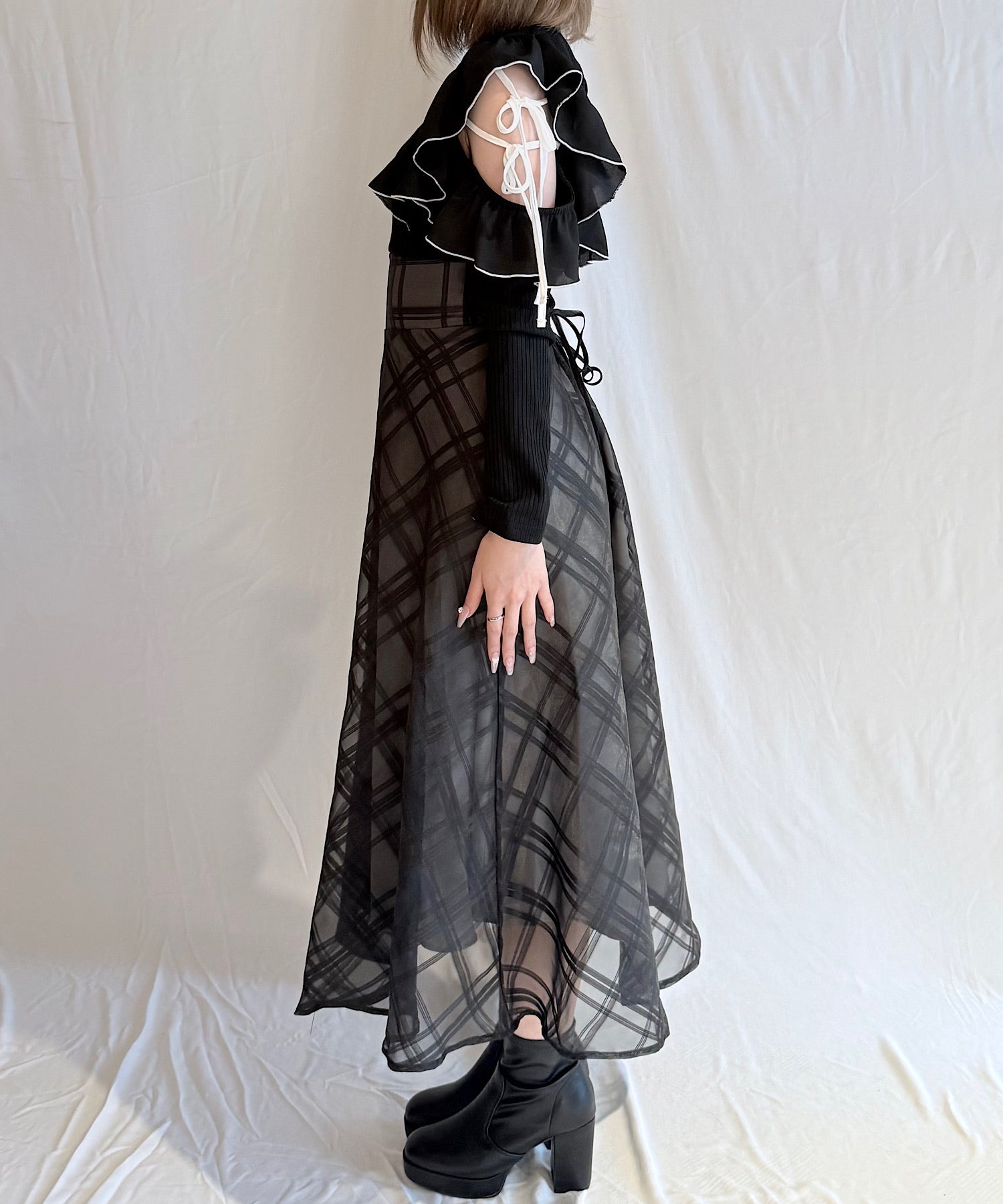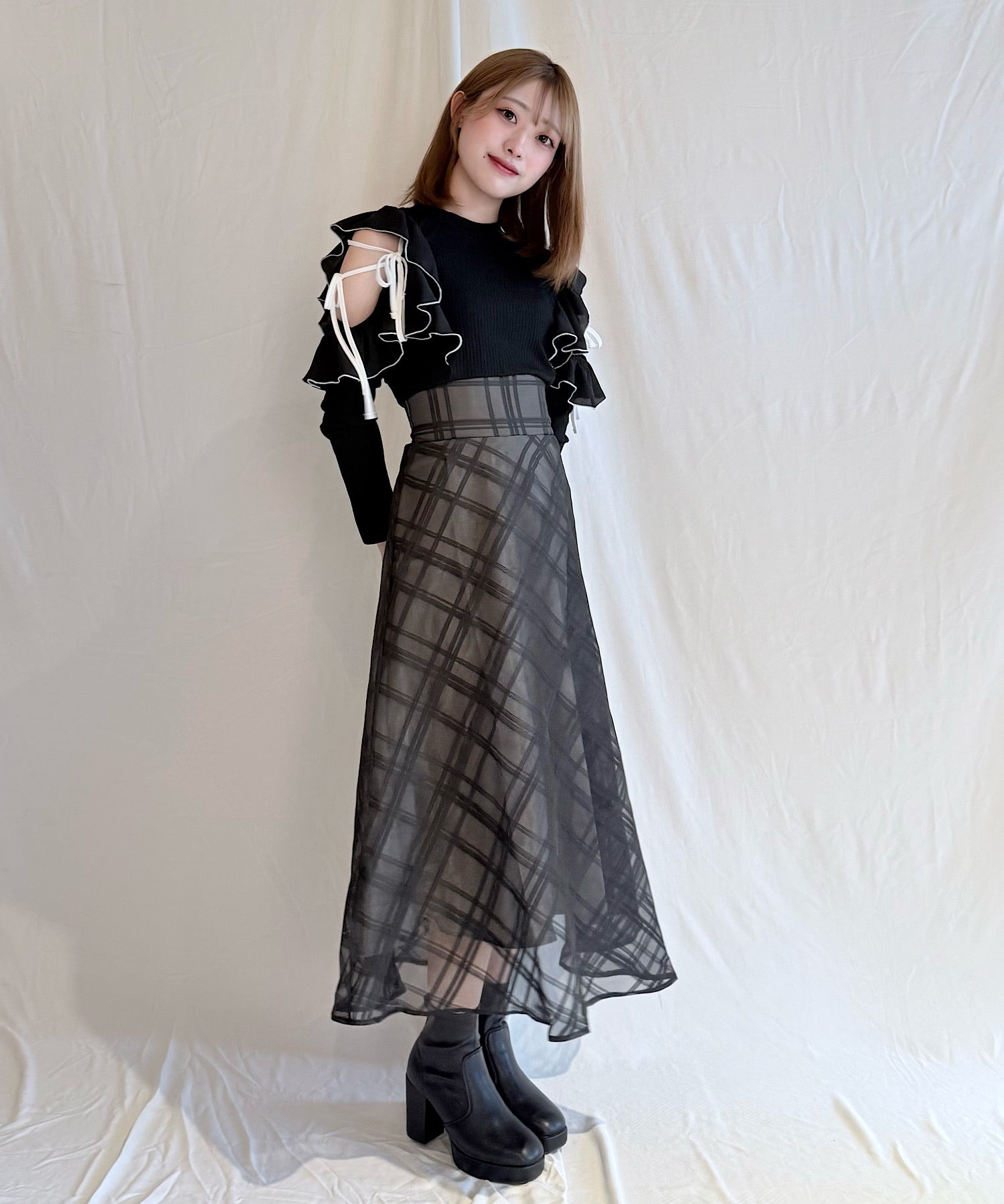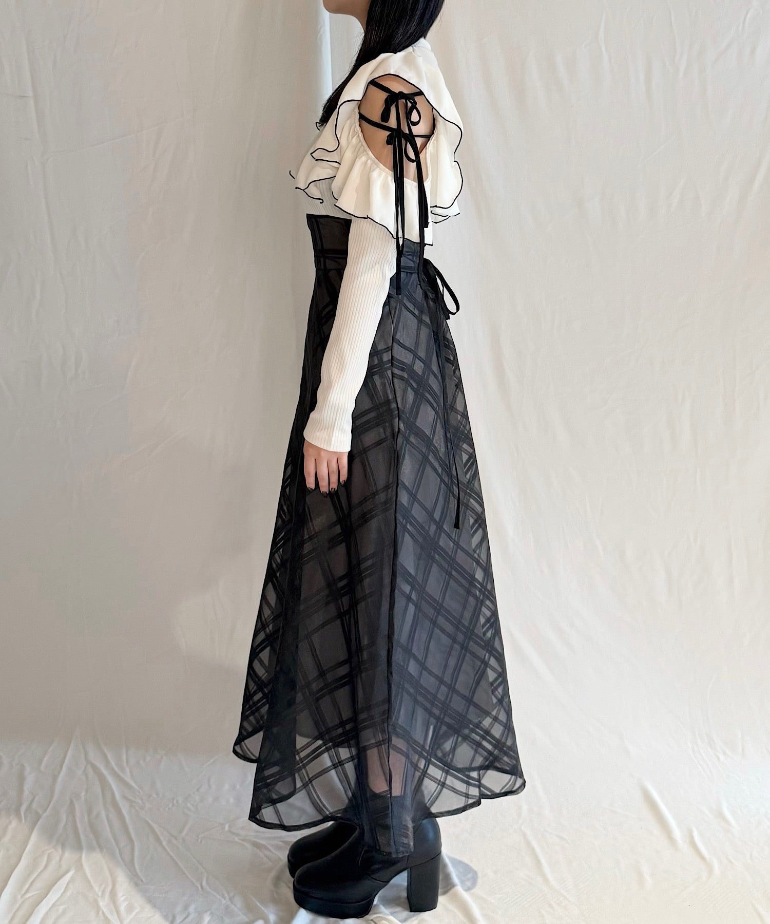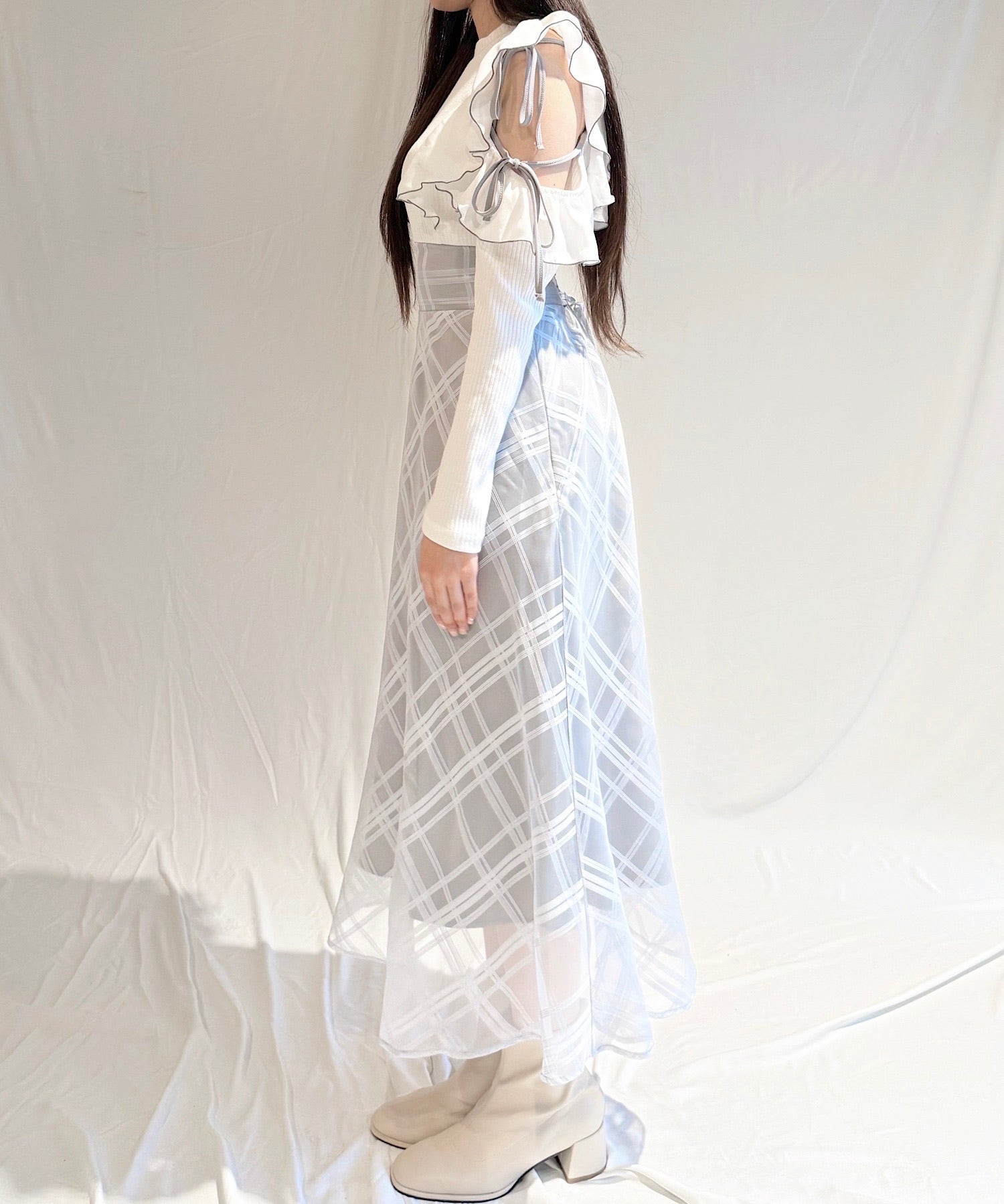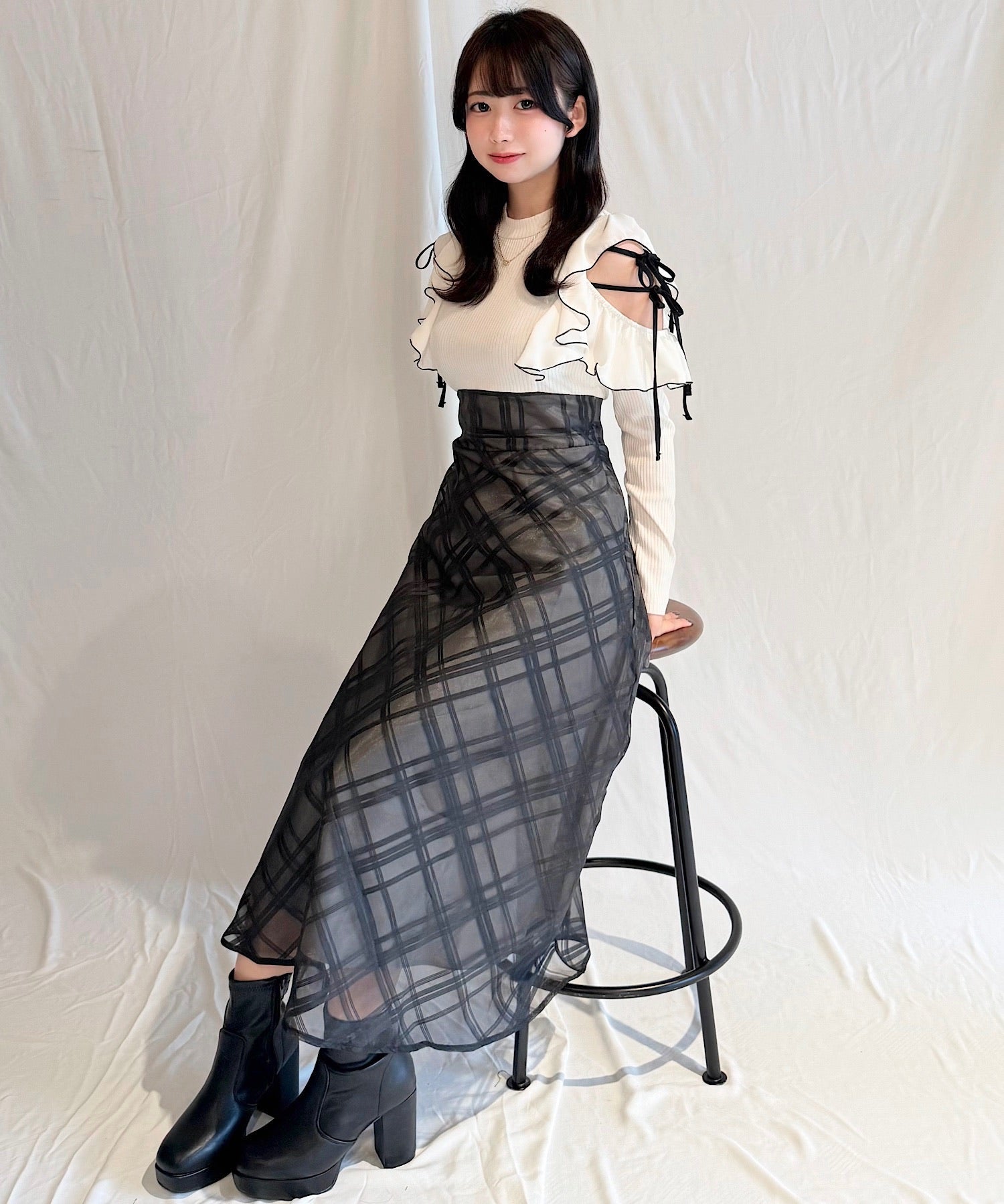 ・肩のフリルデザインとリボンが二の腕周りをさりげなくカバーし、華奢見えを叶えることができるワンピースです。