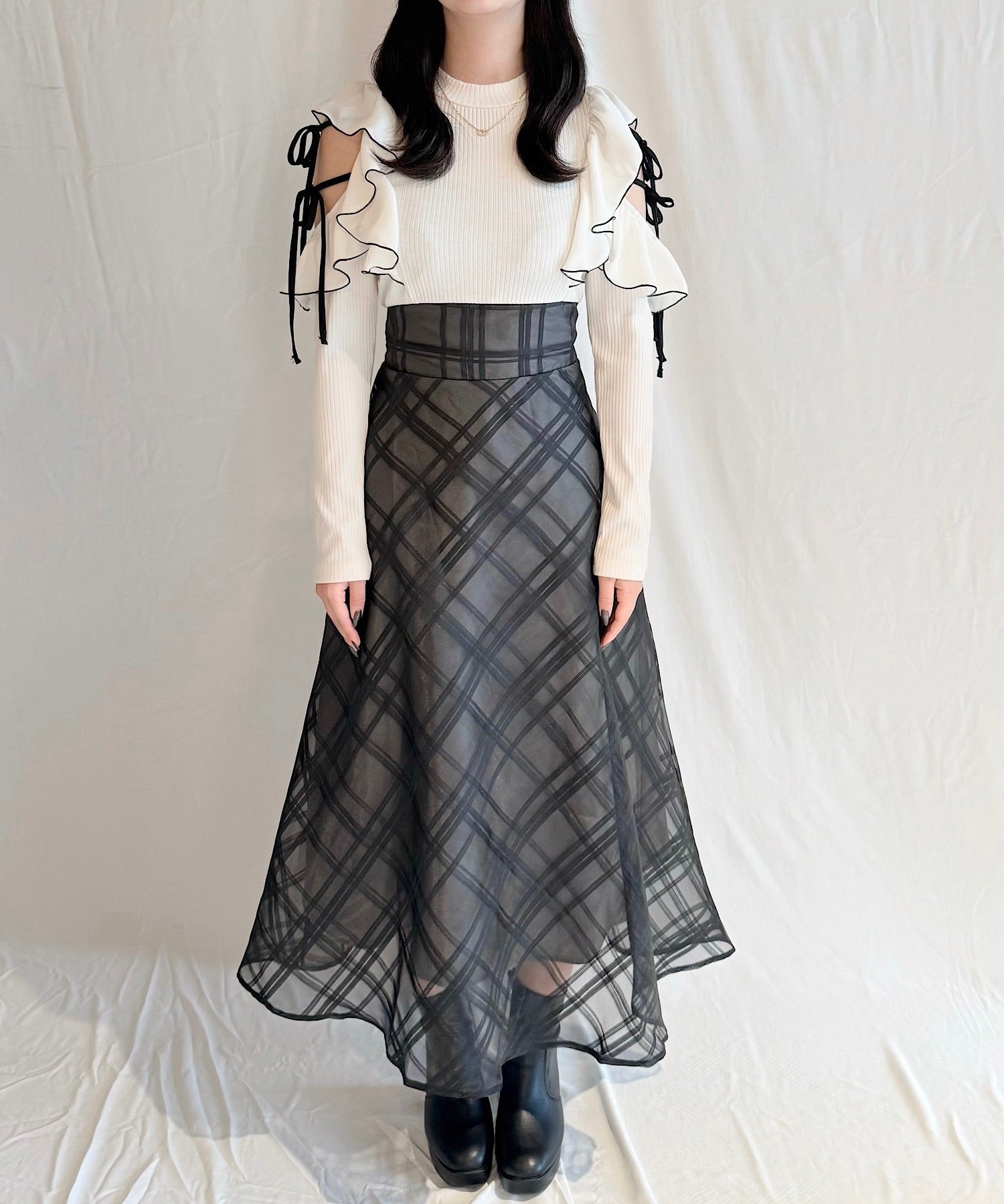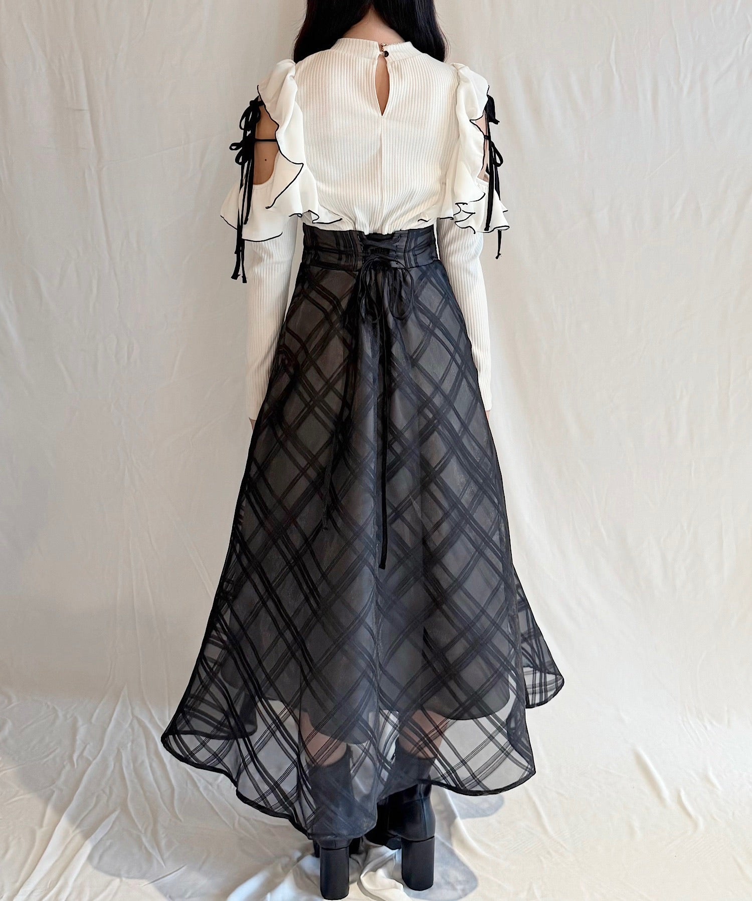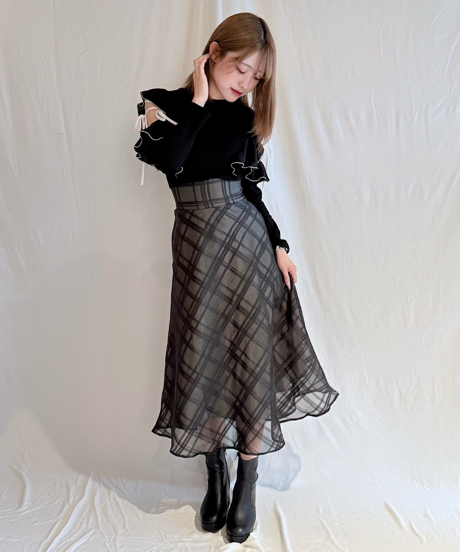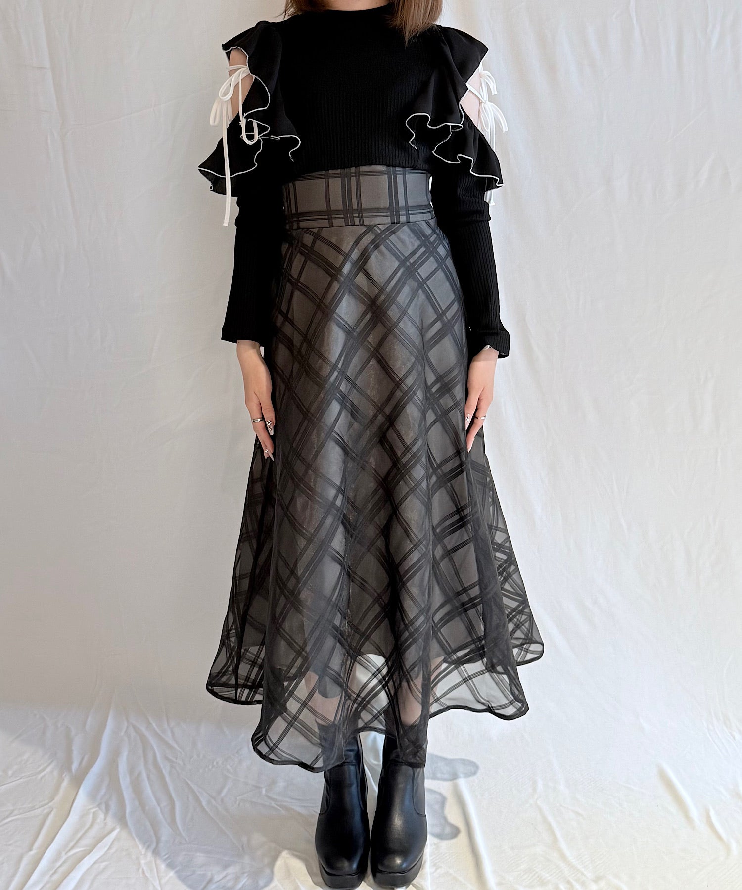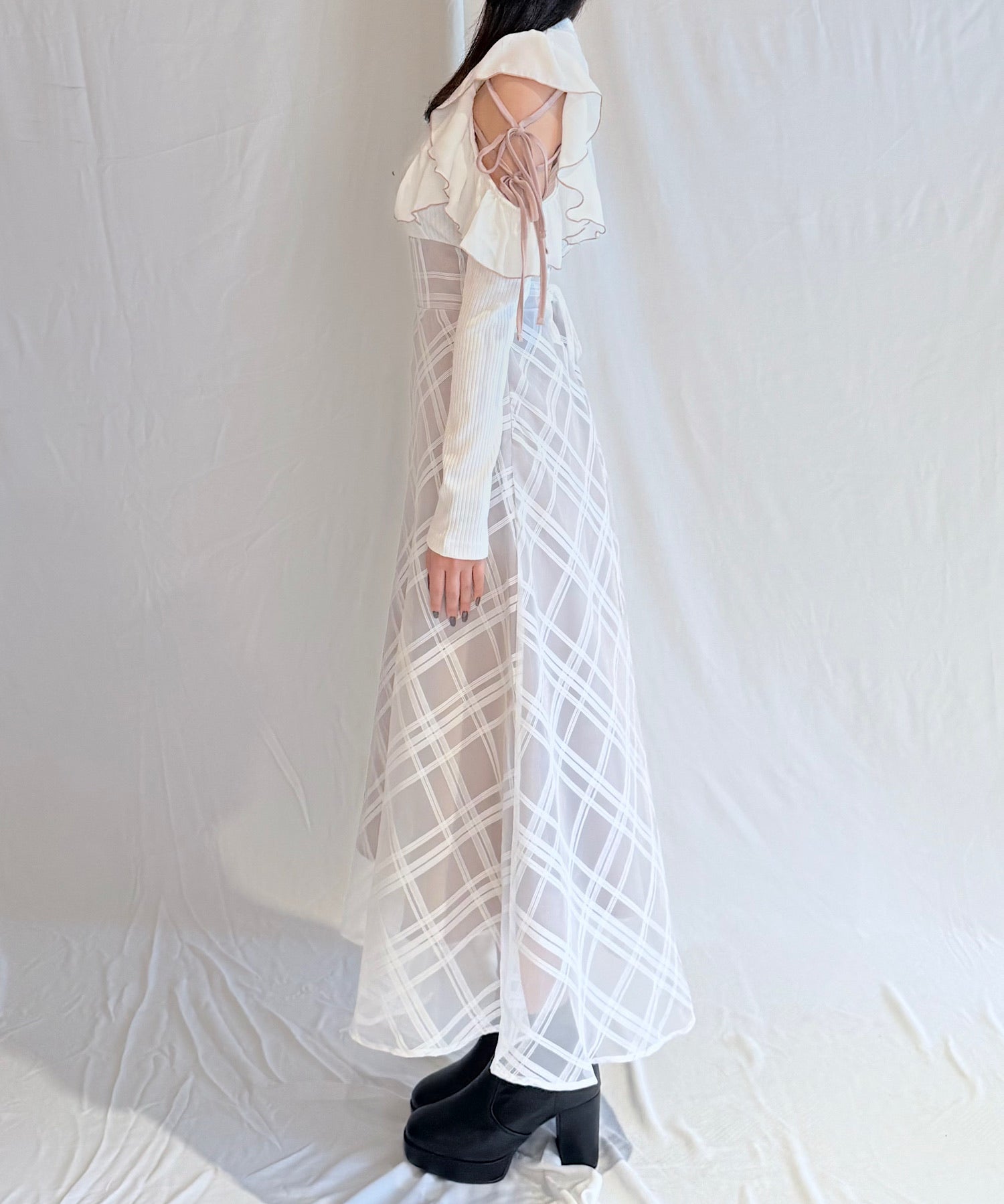 ・肩のフリルデザインとリボンが二の腕周りをさりげなくカバーし、華奢見えを叶えることができるワンピースです。