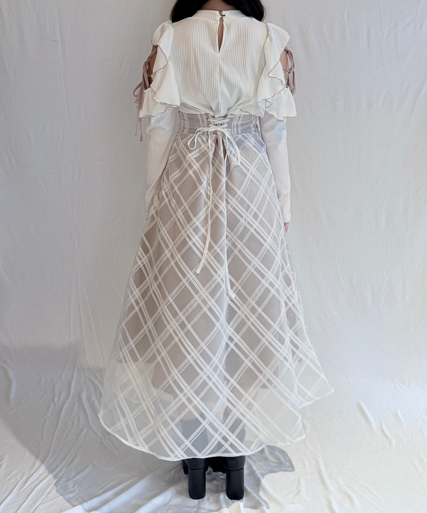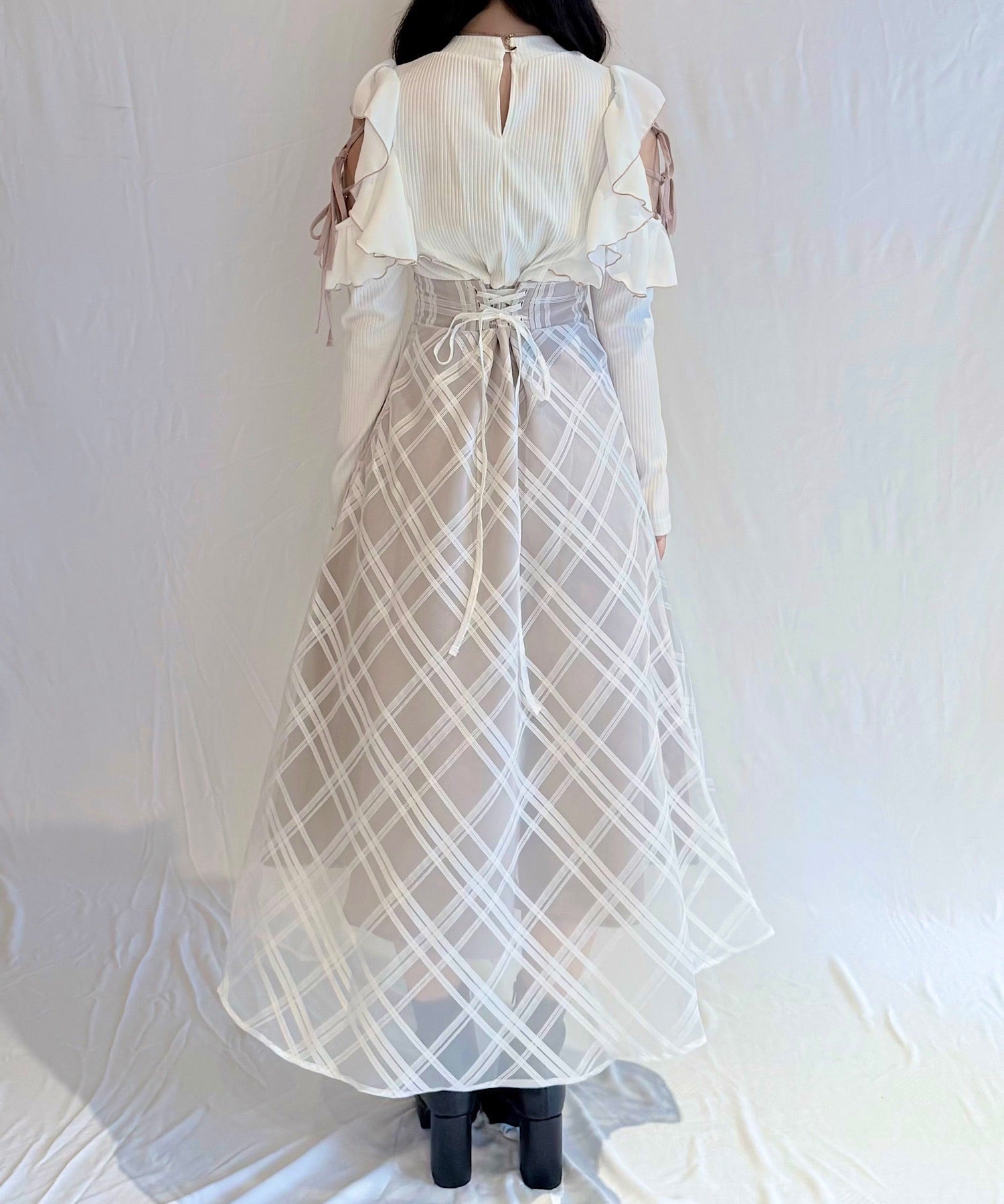 ・ウエストの後ろにはリボンが付いて、ウエストラインをきれいに見せられます。