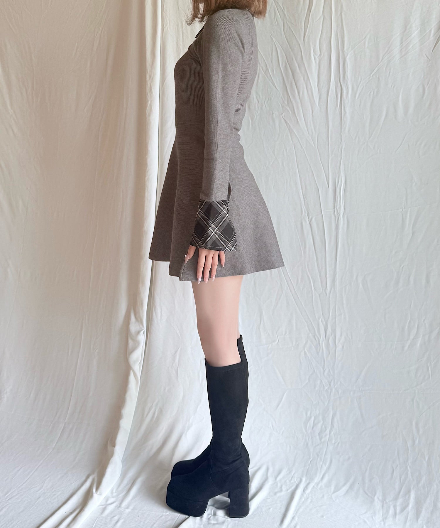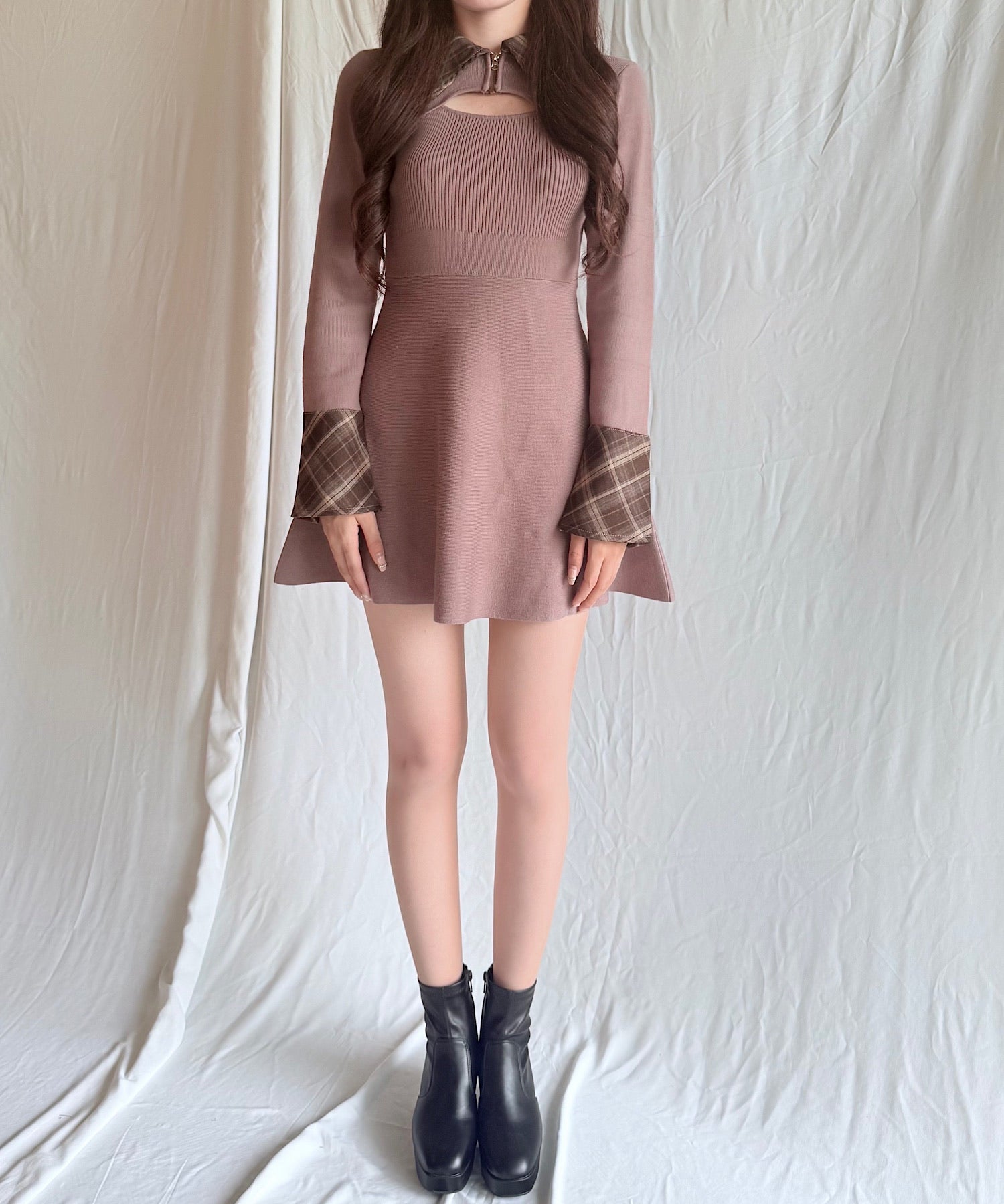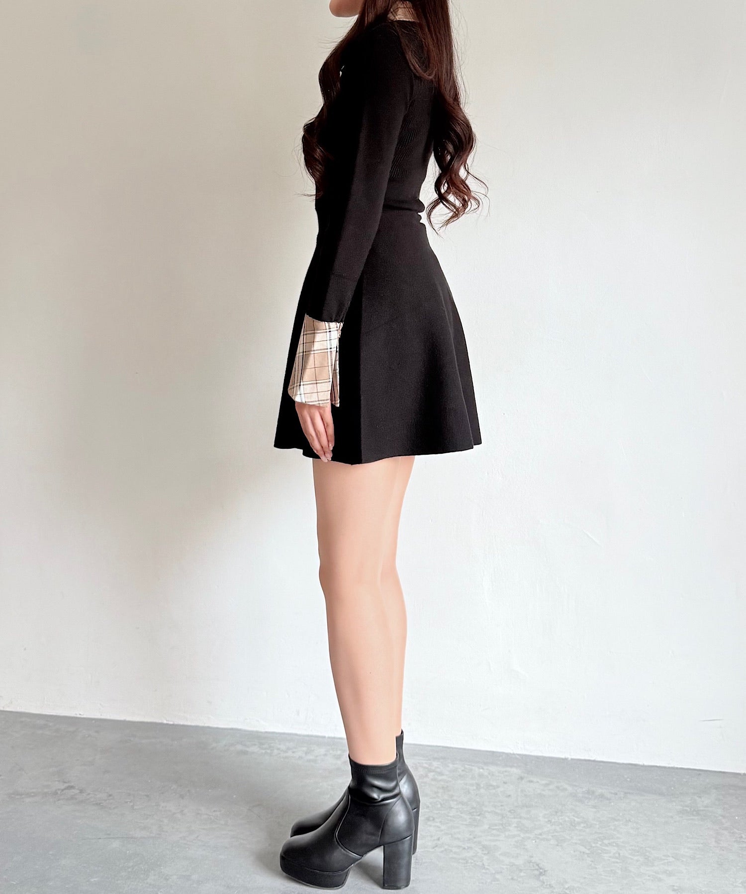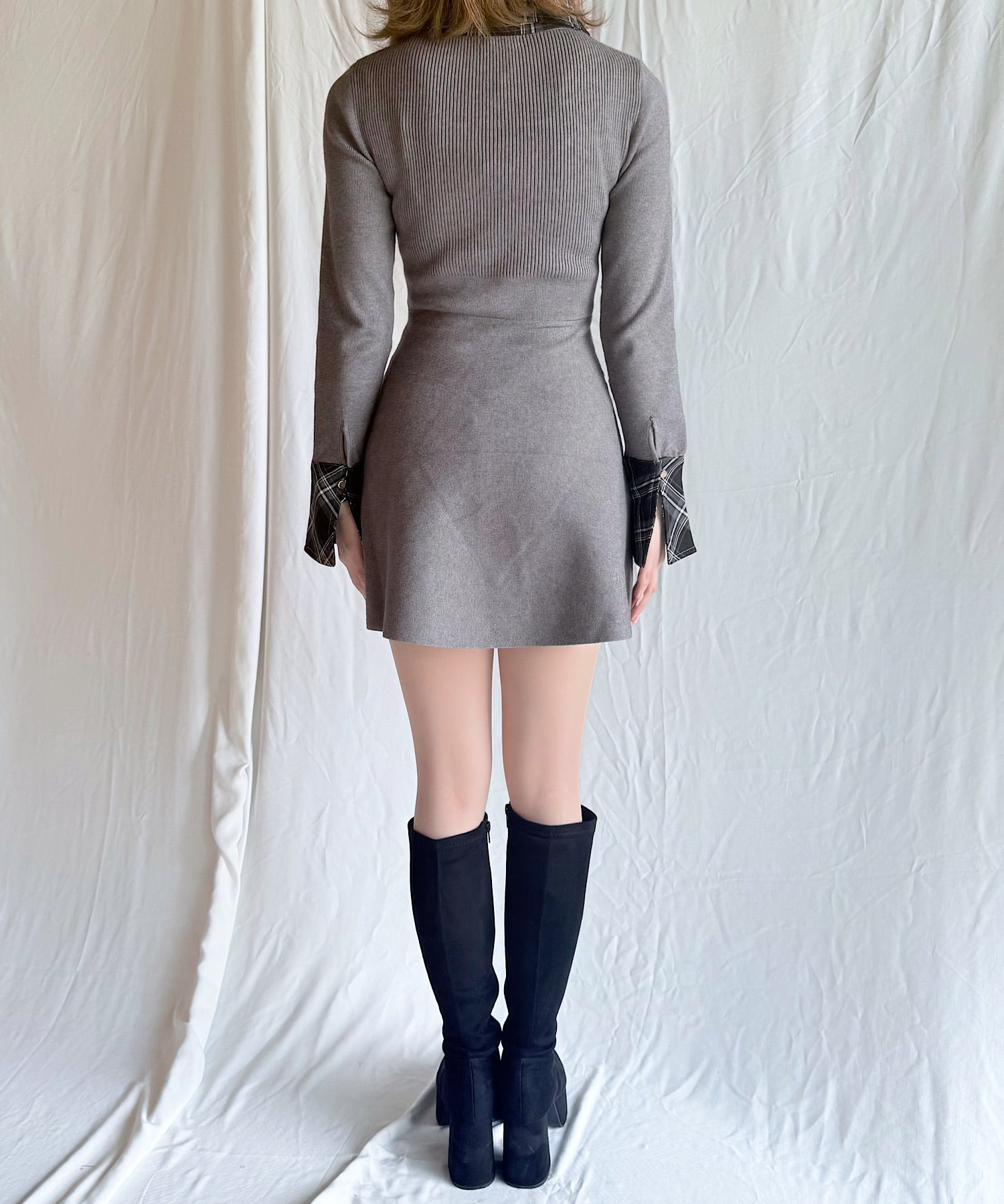 ・衿と袖のチェックがポイントのミニニットワンピース♪