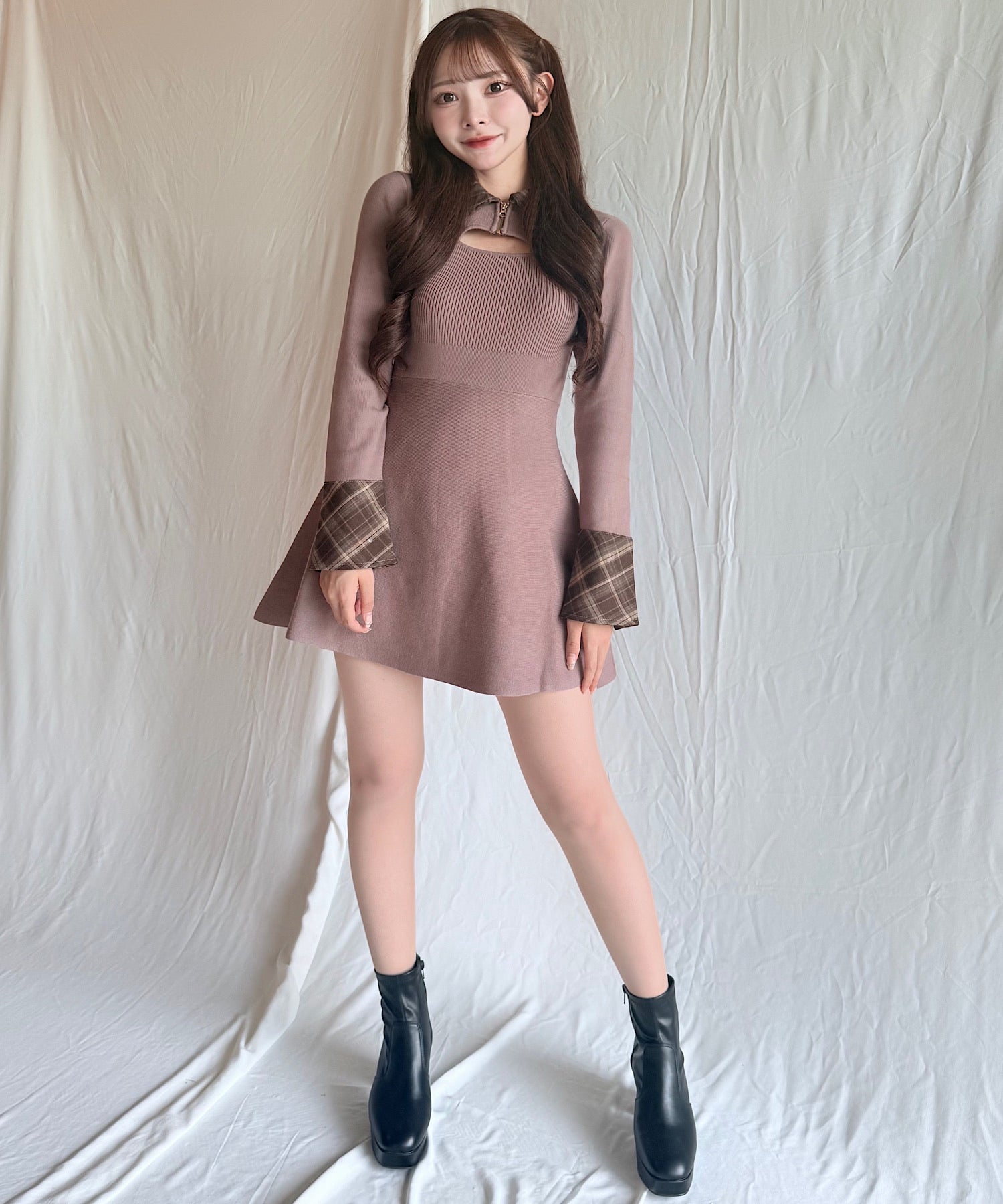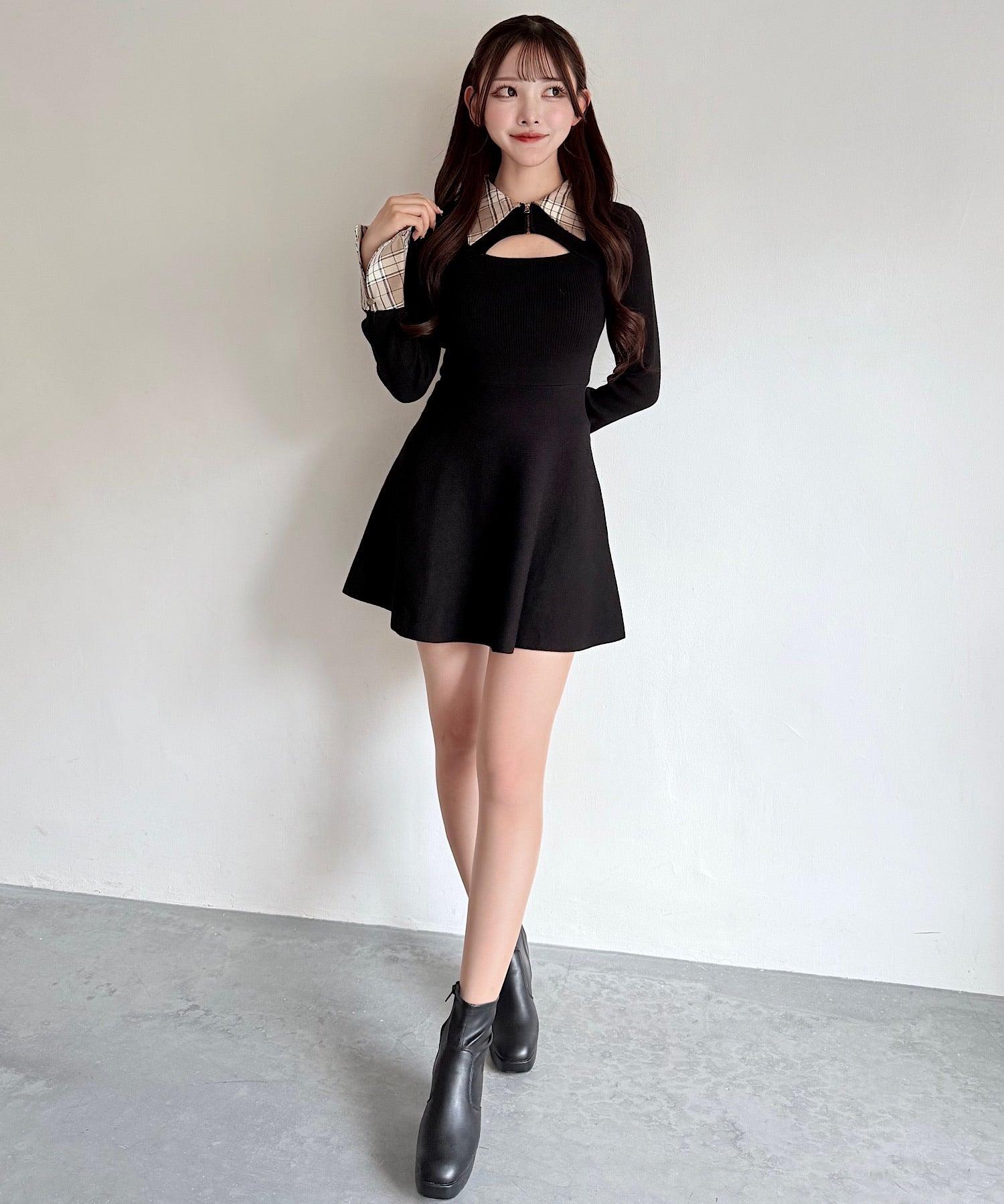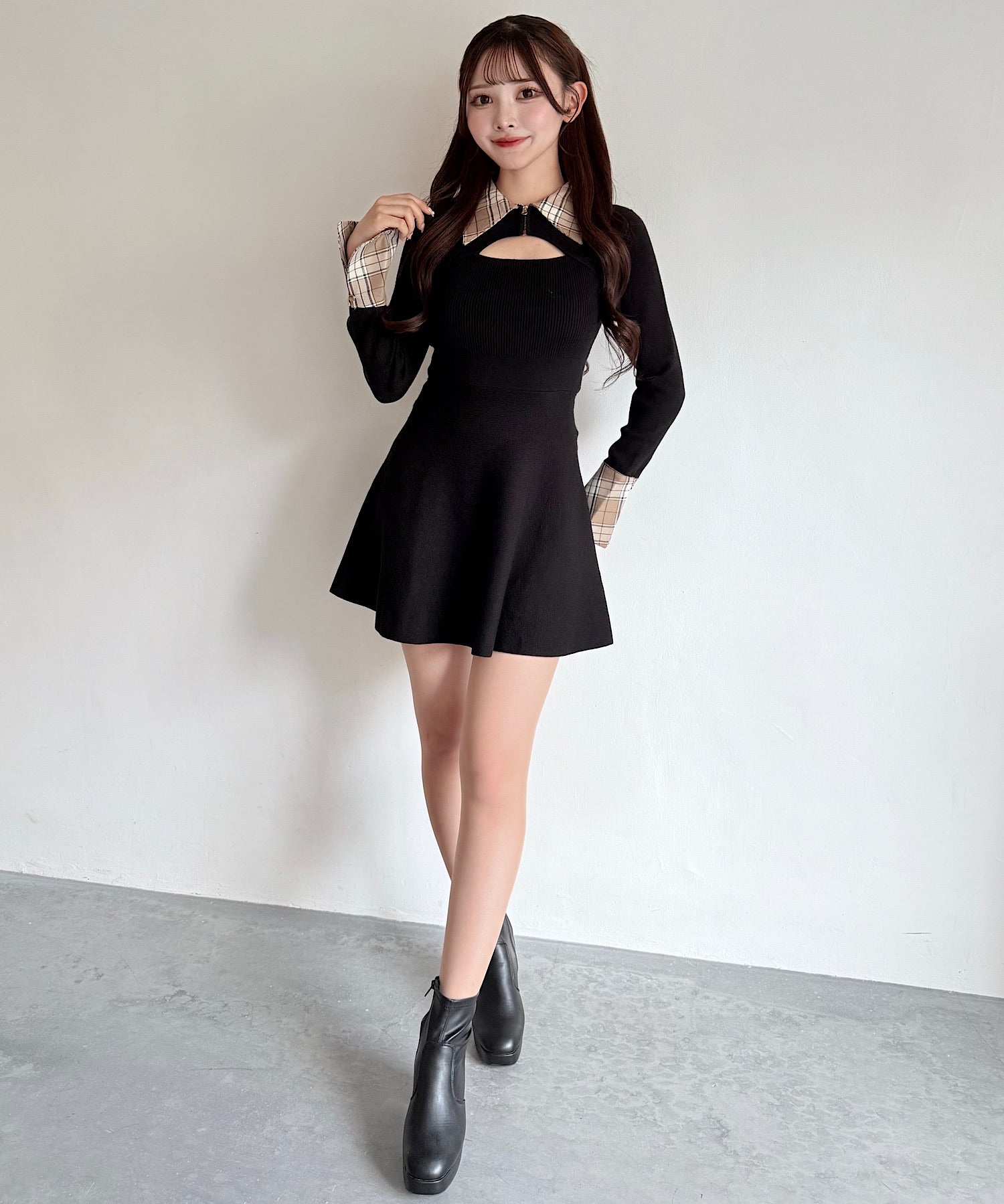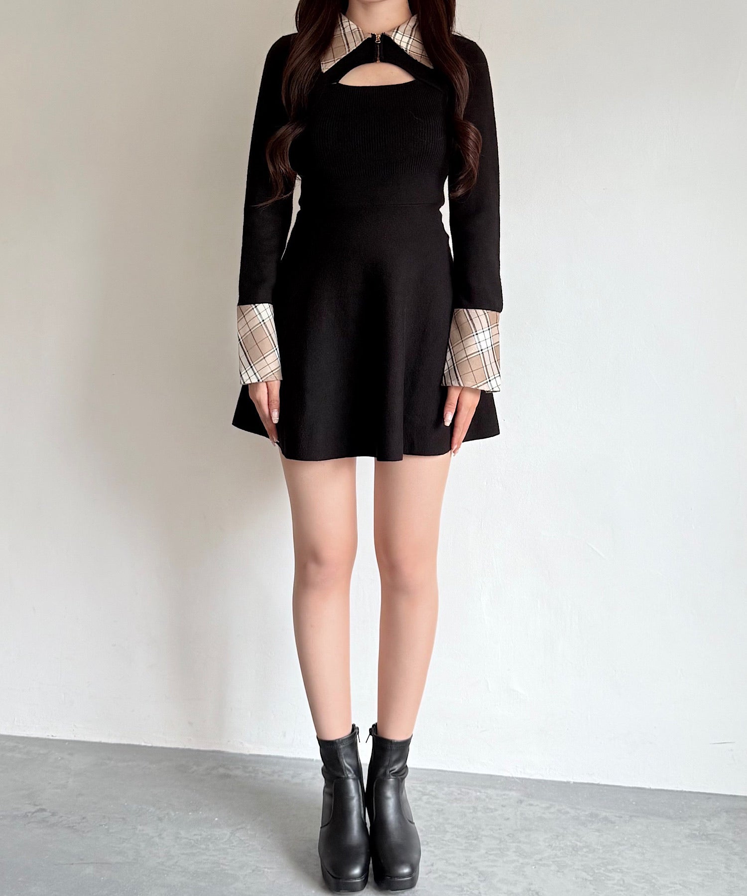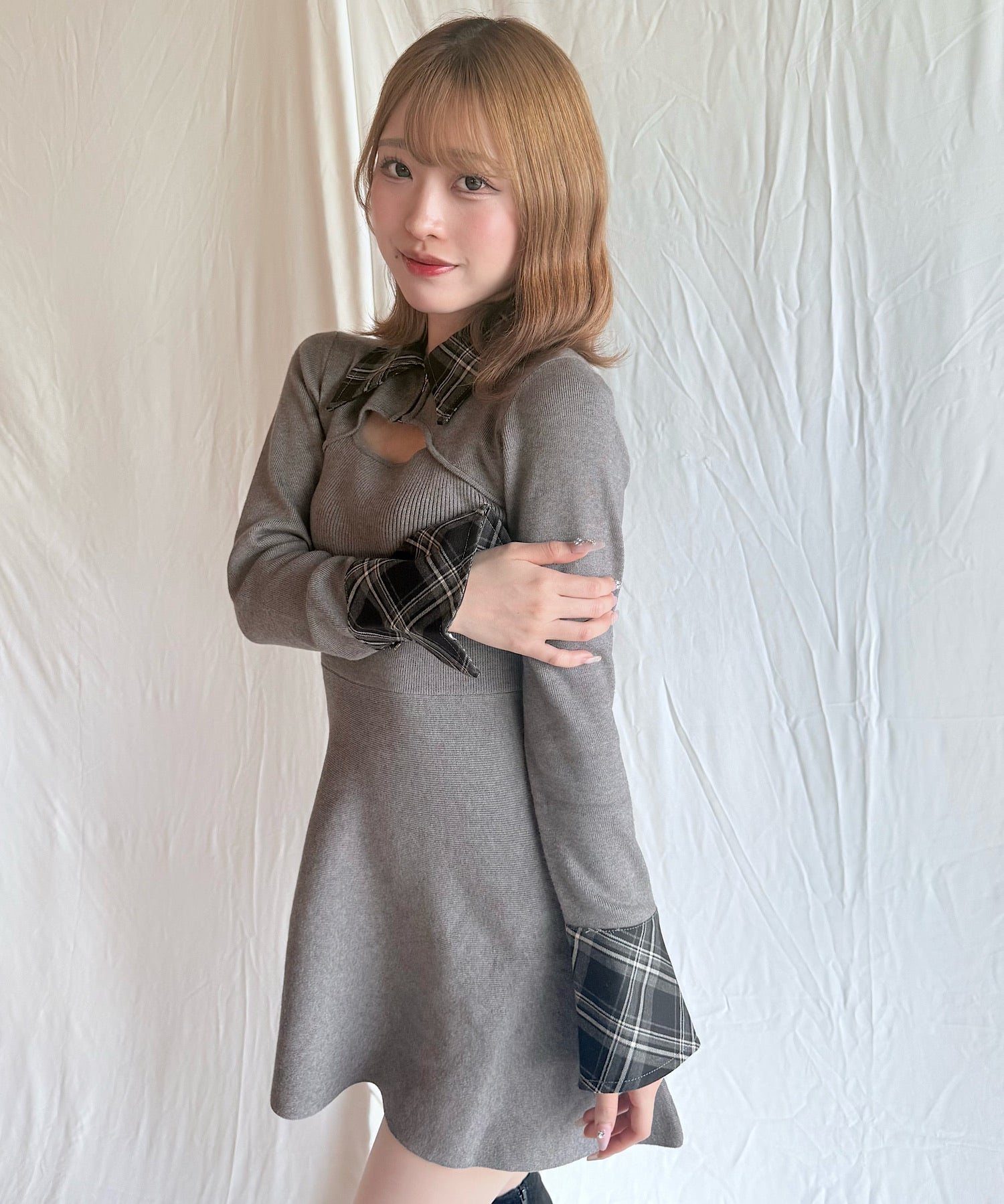 ・衿と袖のチェックがポイントのミニニットワンピース♪
