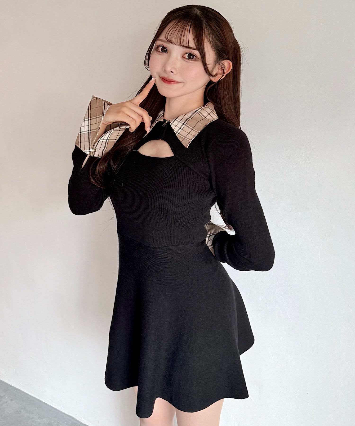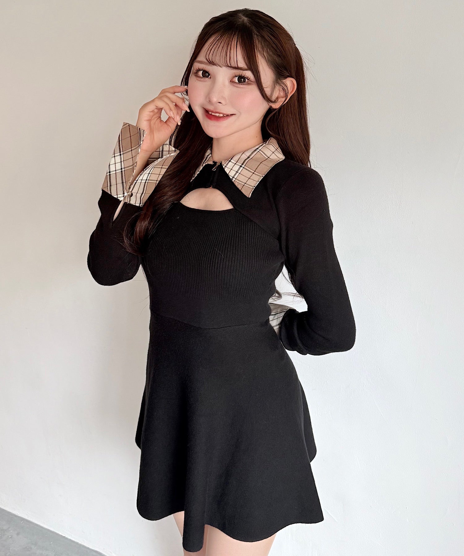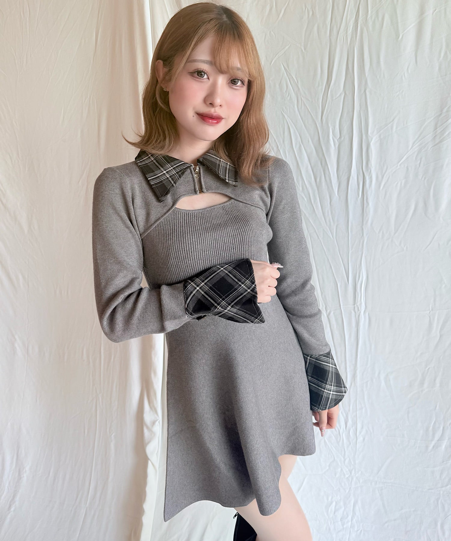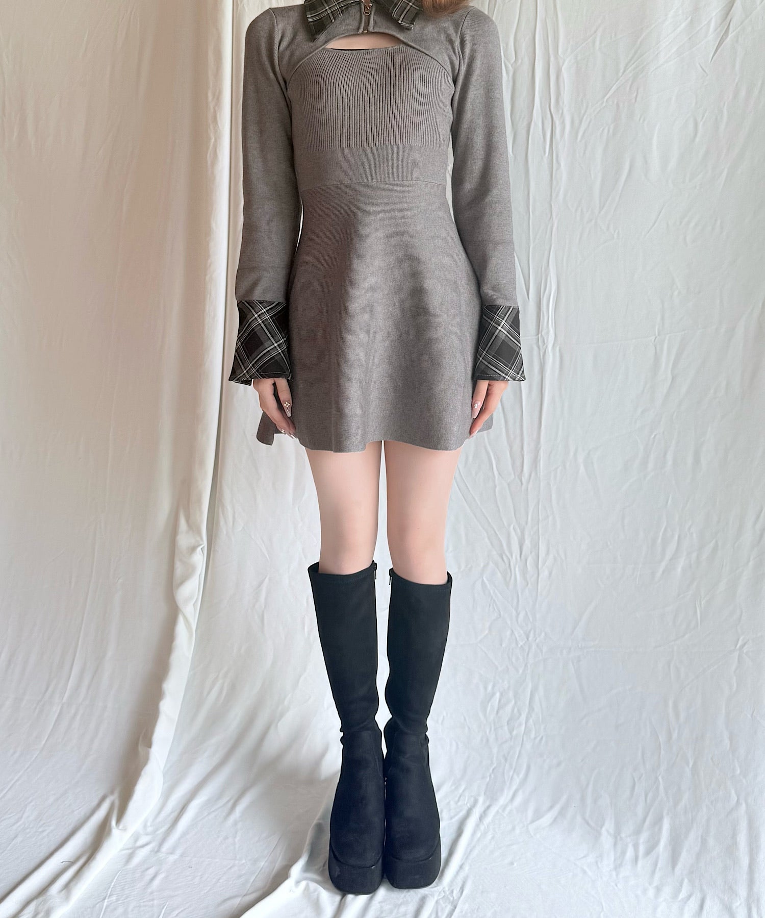 ・衿と袖のチェックがポイントのミニニットワンピース♪