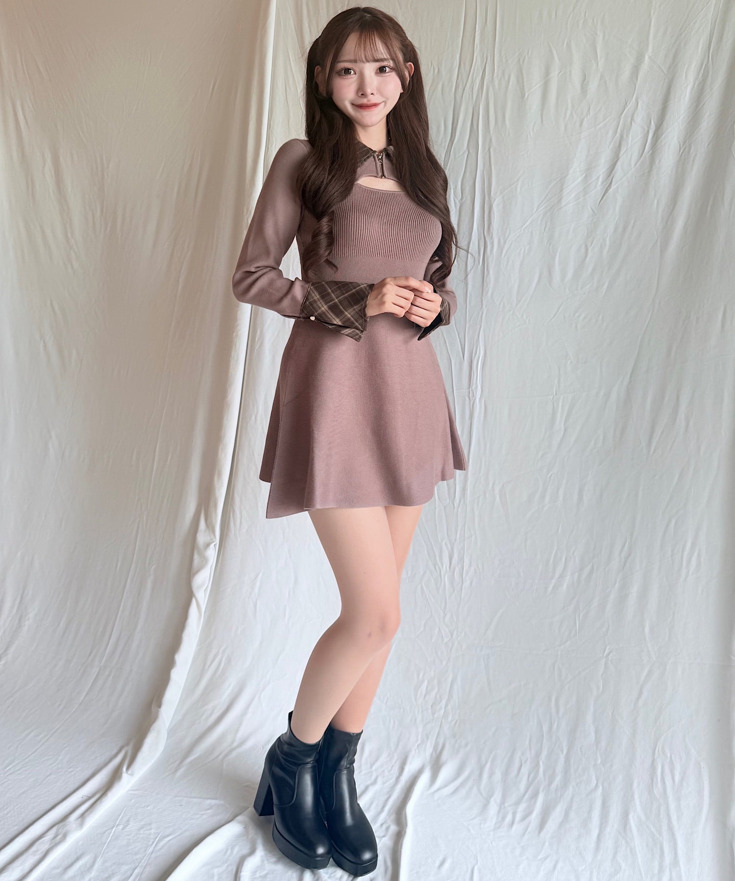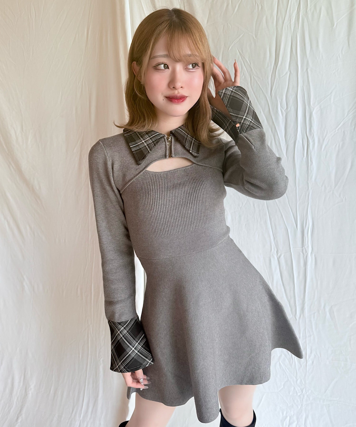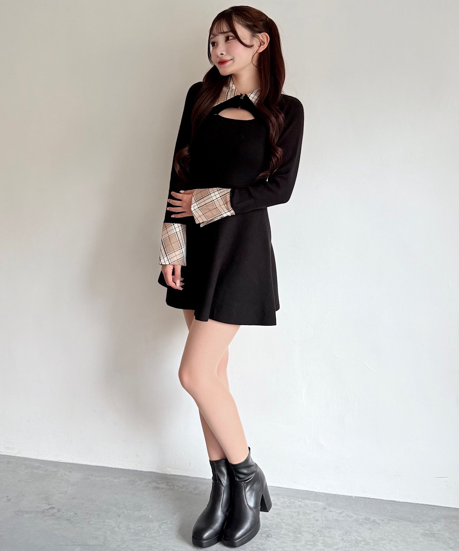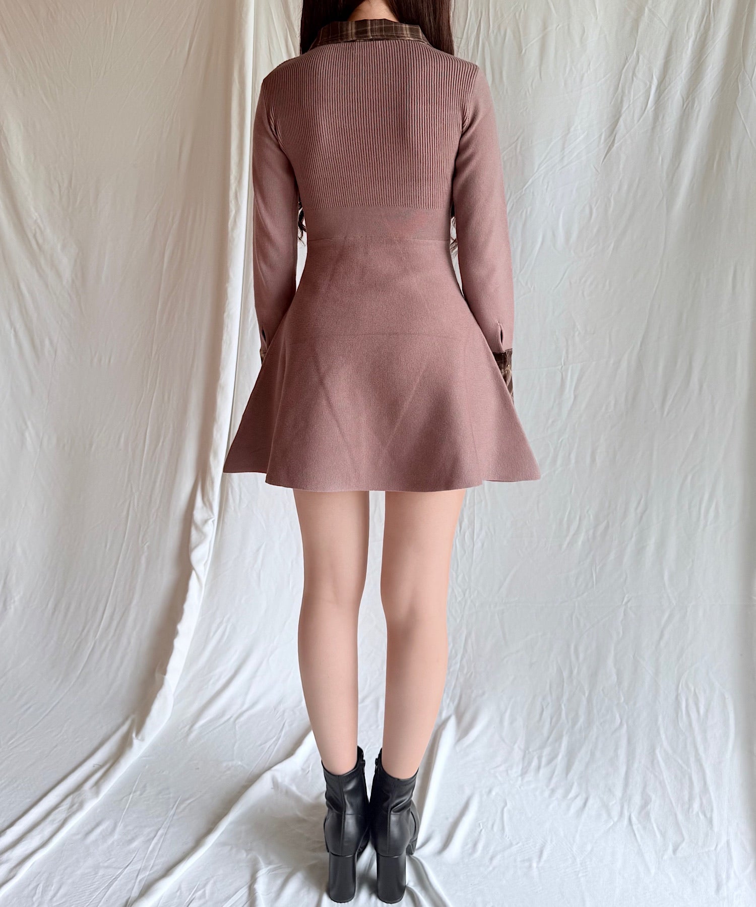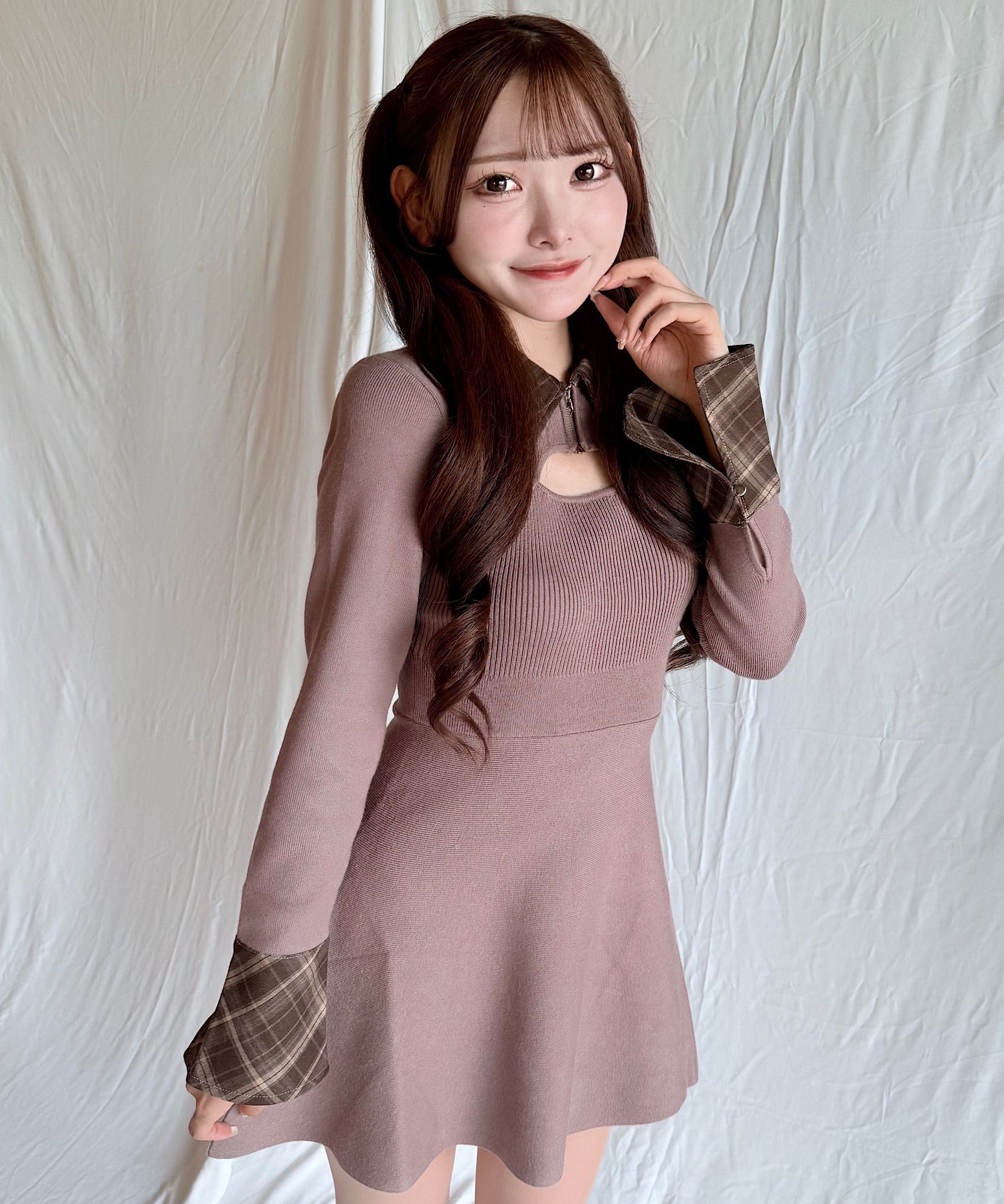 ・衿と袖のチェックがポイントのミニニットワンピース♪