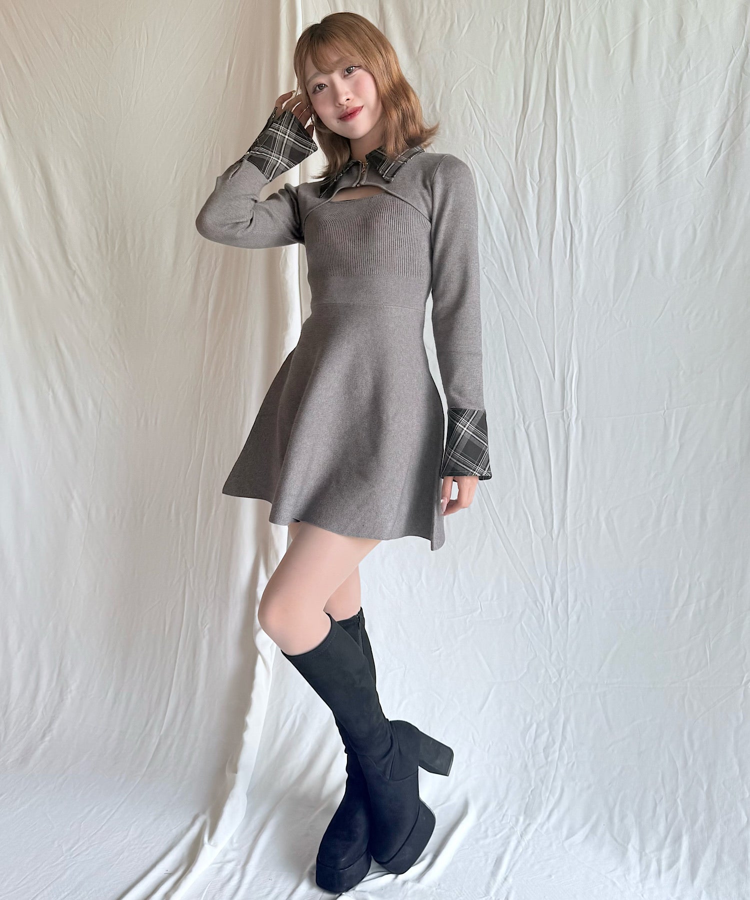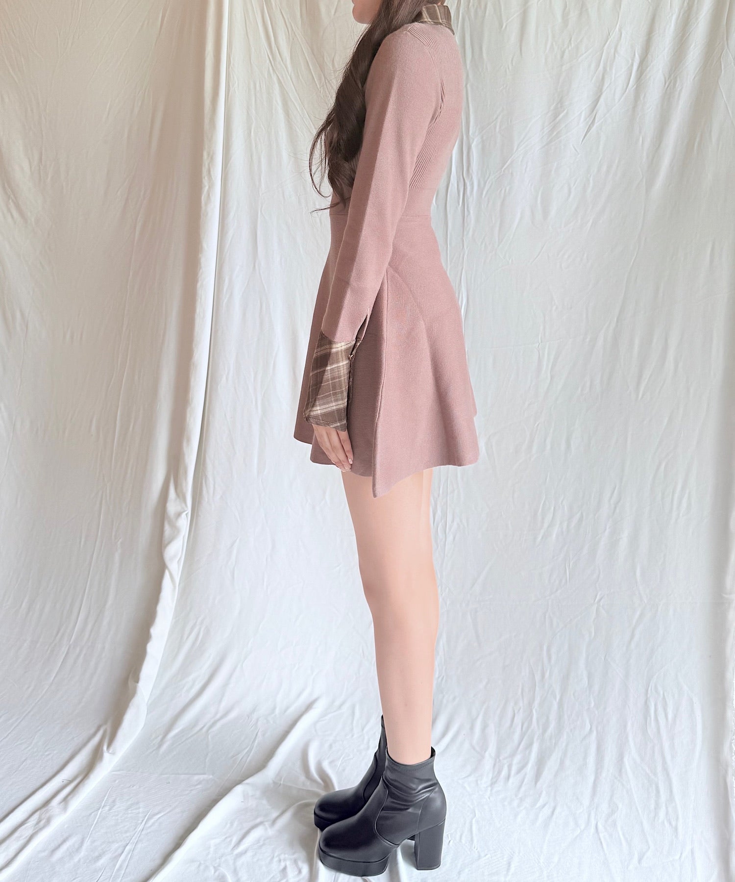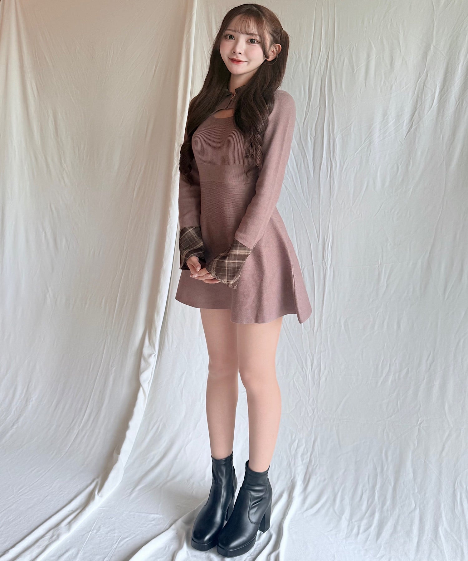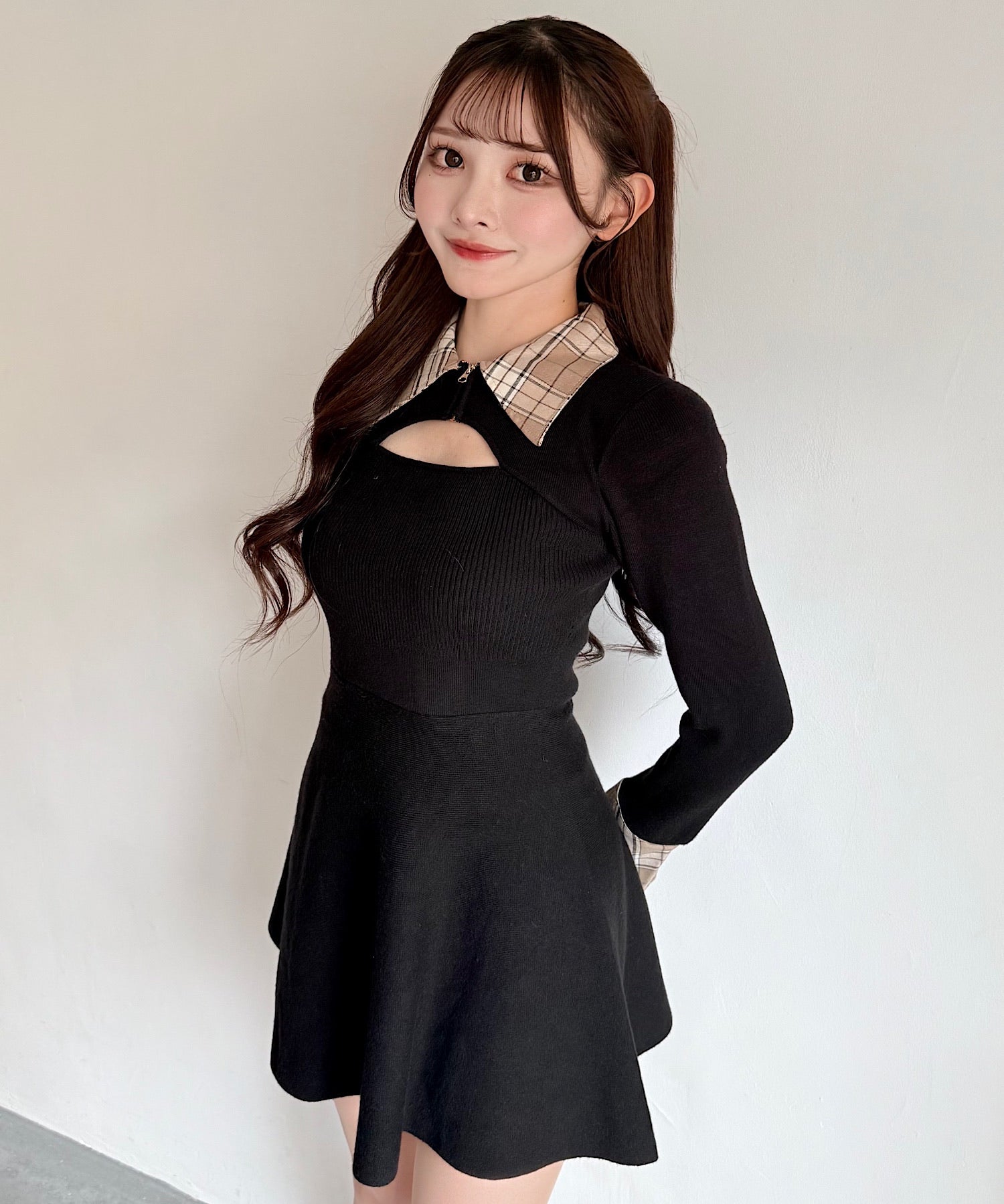 ・衿と袖のチェックがポイントのミニニットワンピース♪