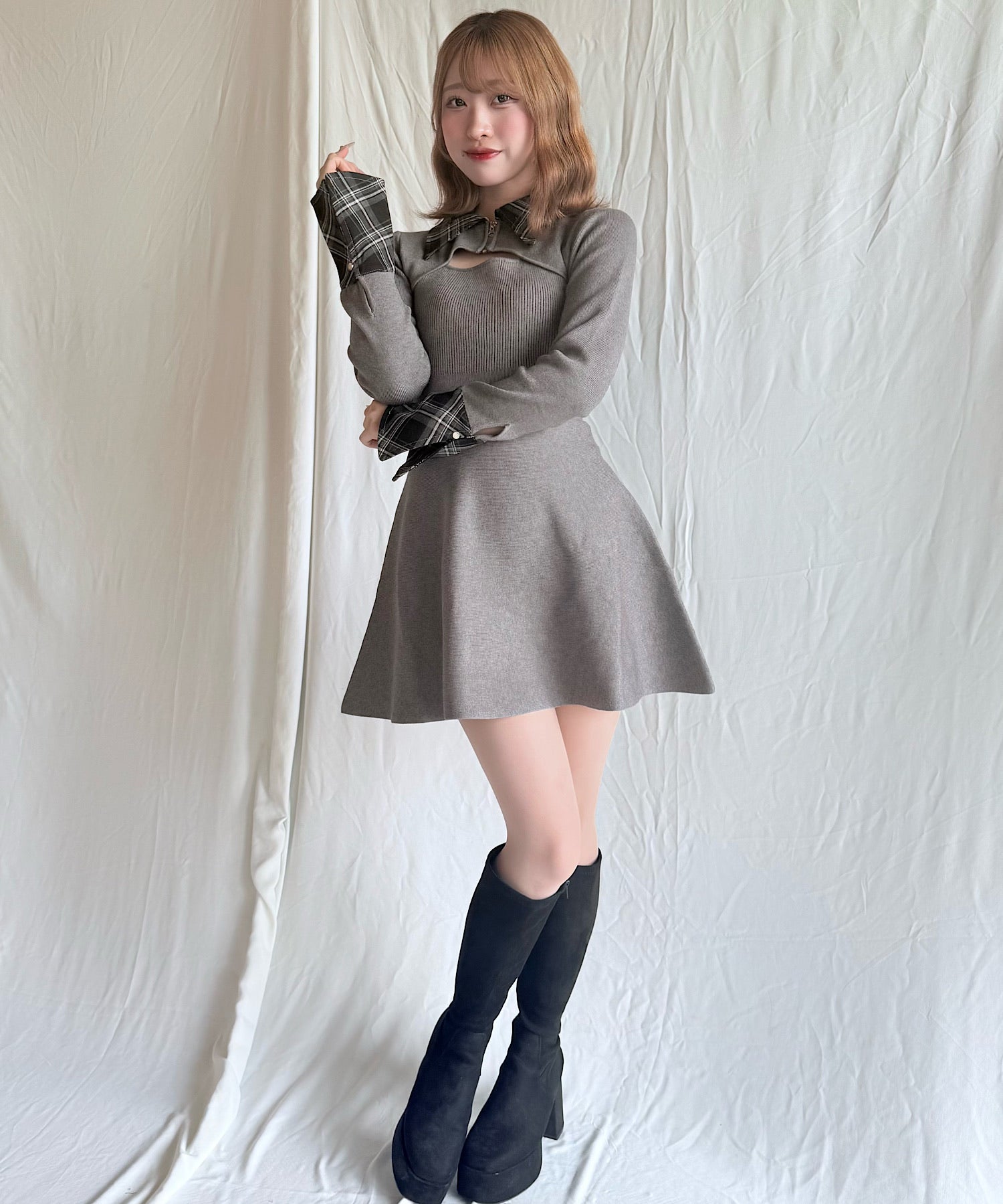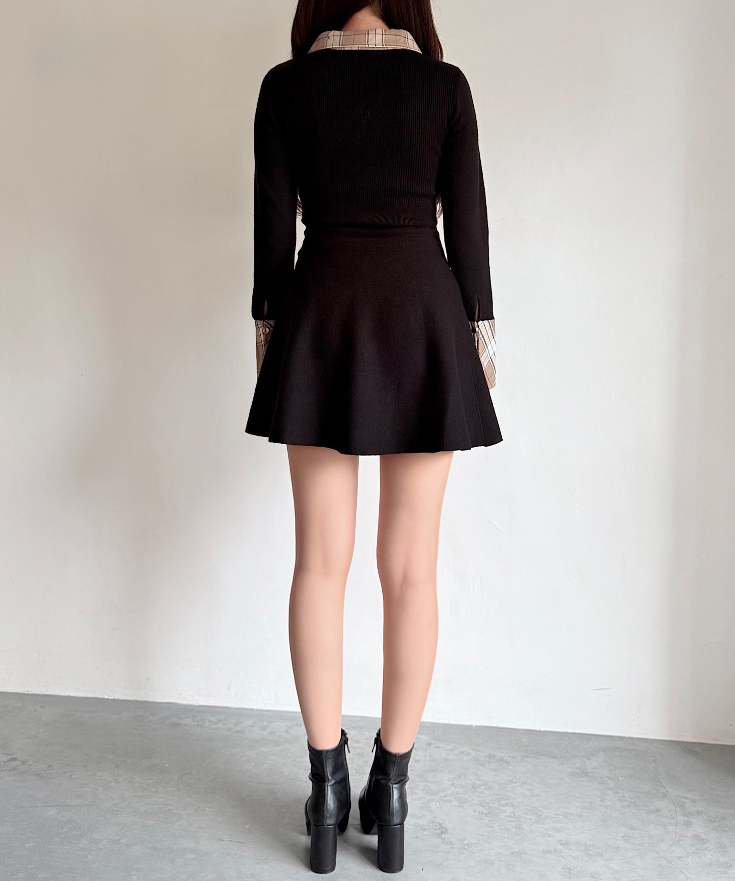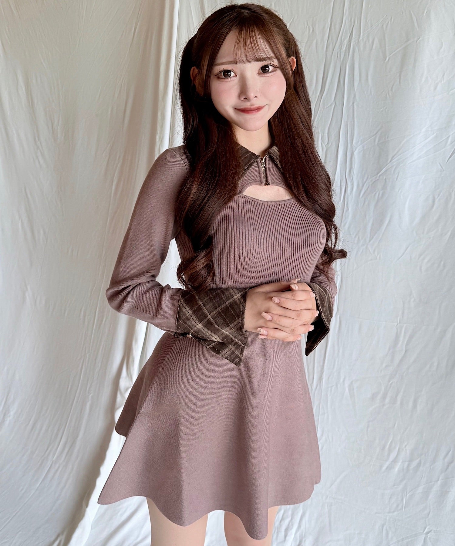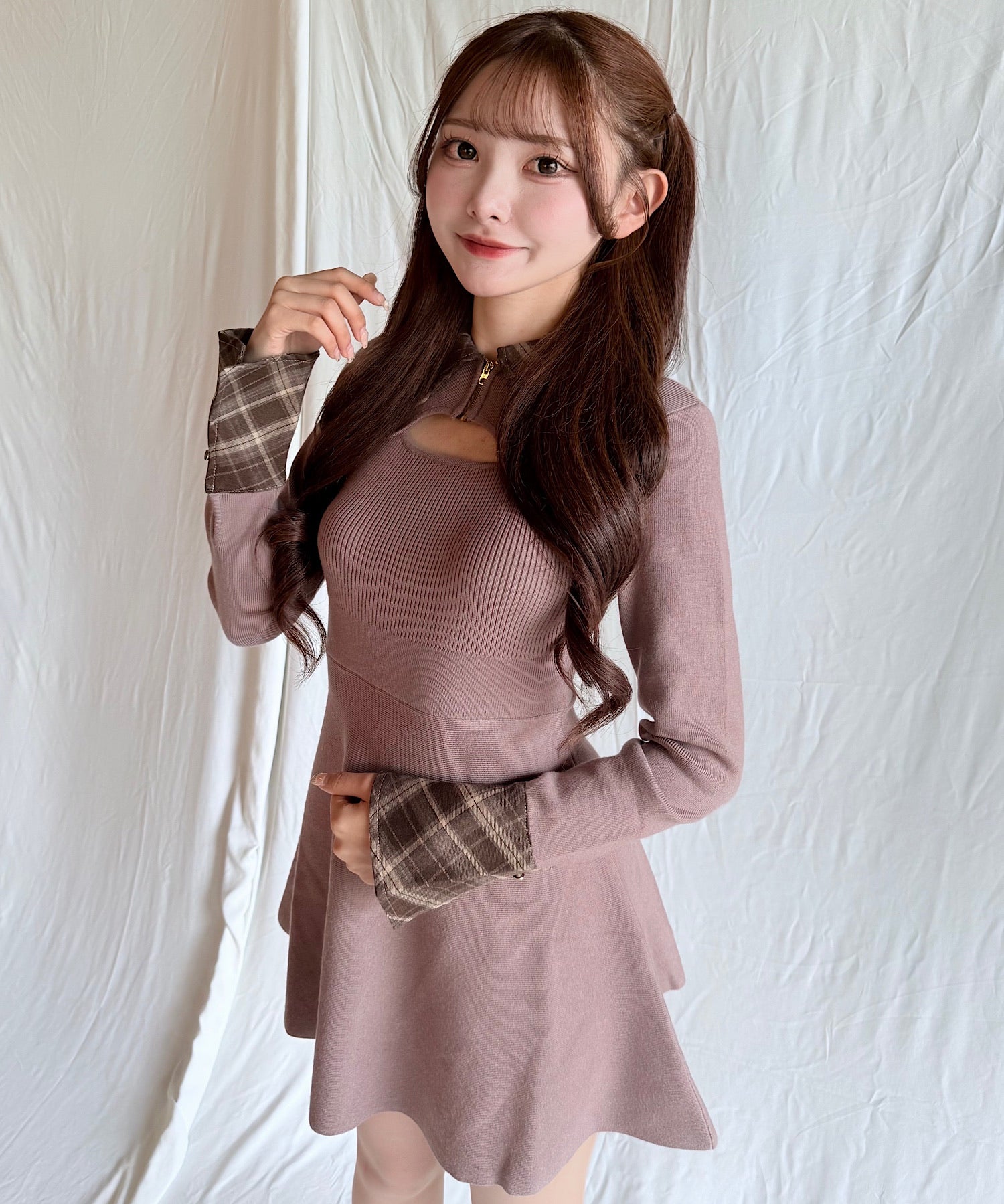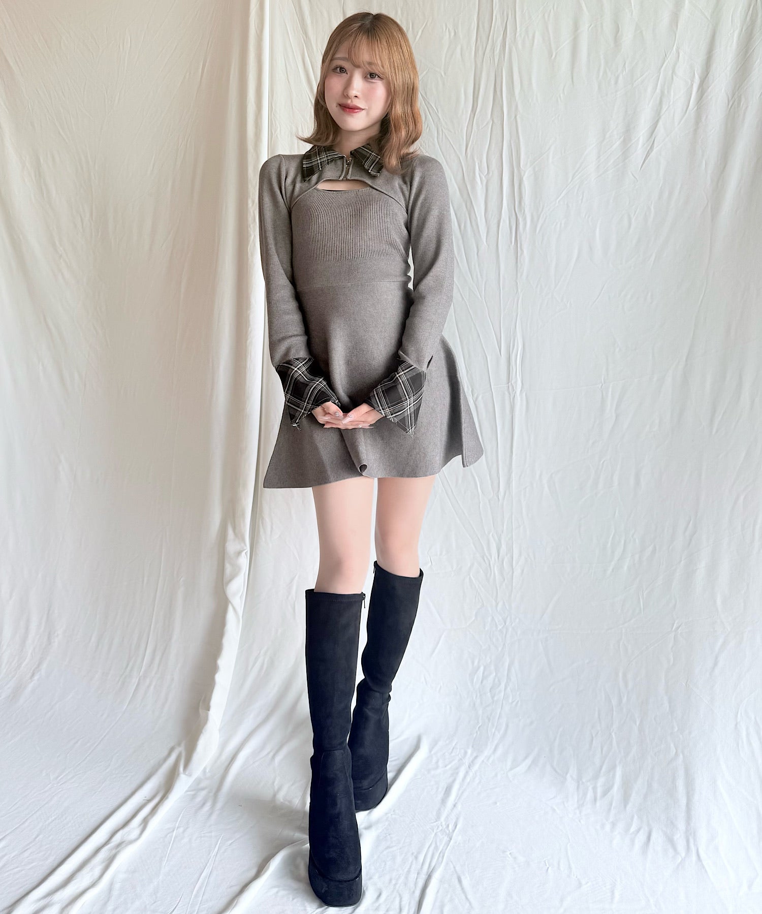・衿と袖のチェックがポイントのミニニットワンピース♪